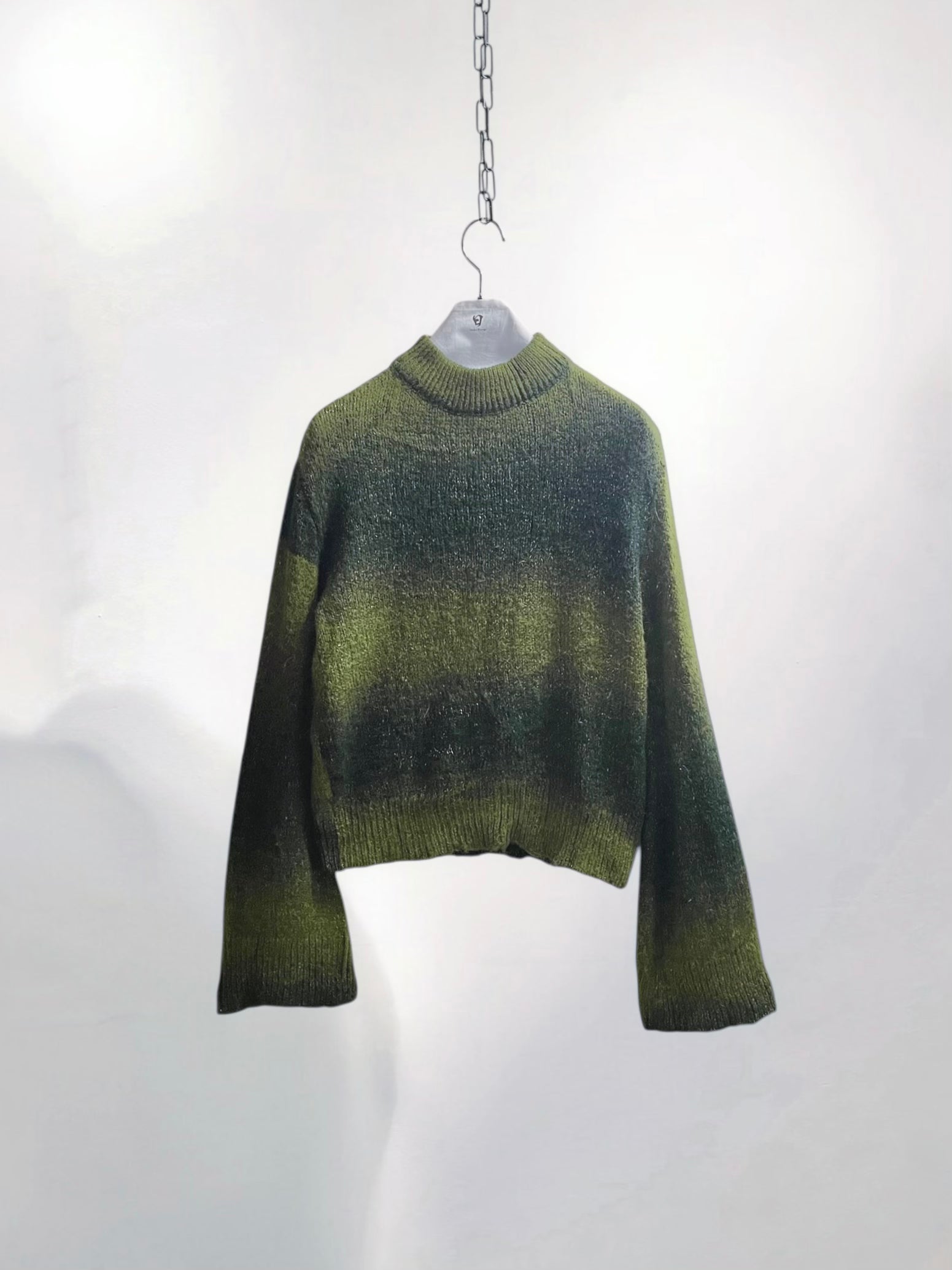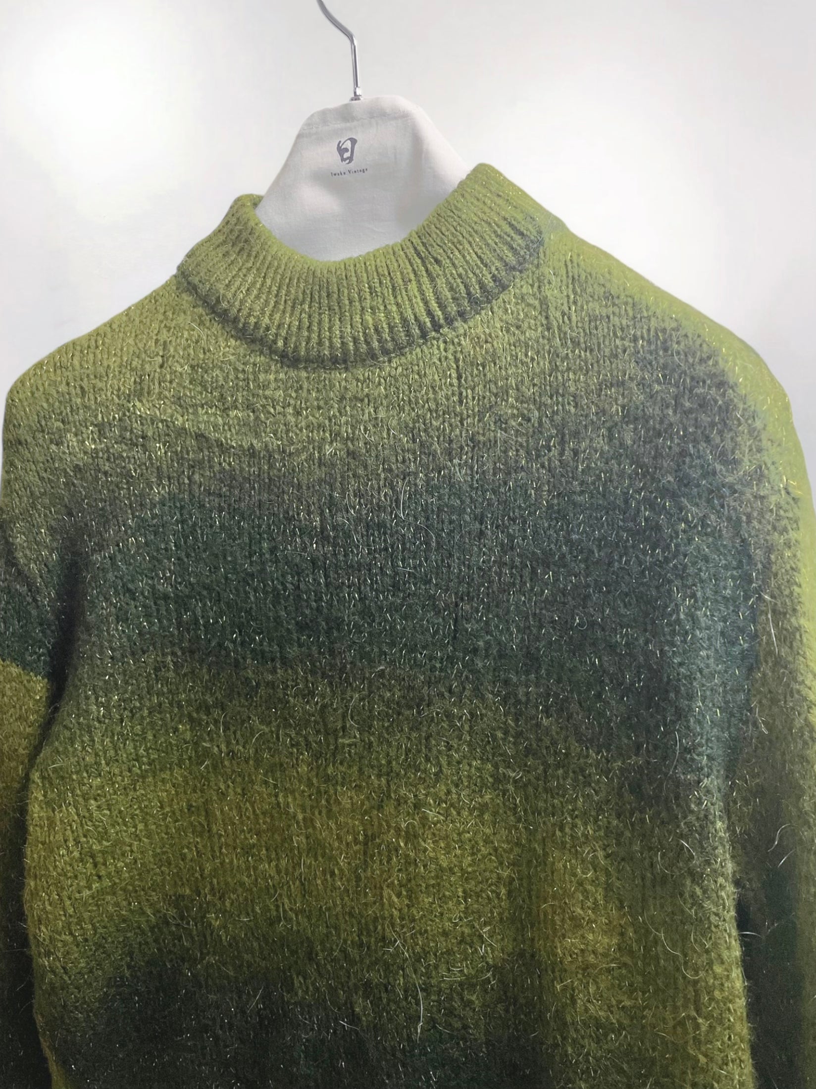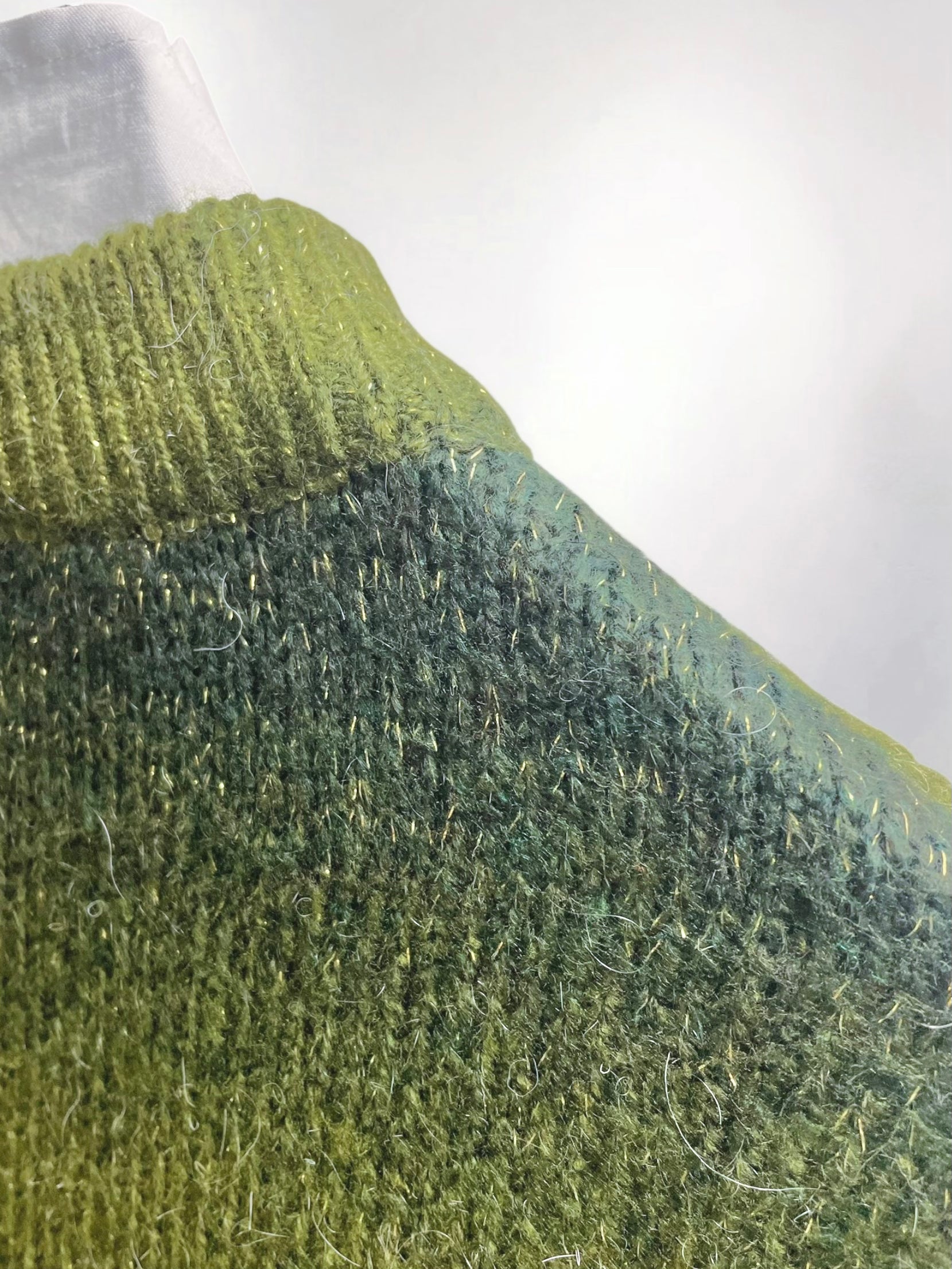 Vintage Olive & Deep Green Mohair-Wool Sweater with Flared Sleeves – Gradient Knit Texture