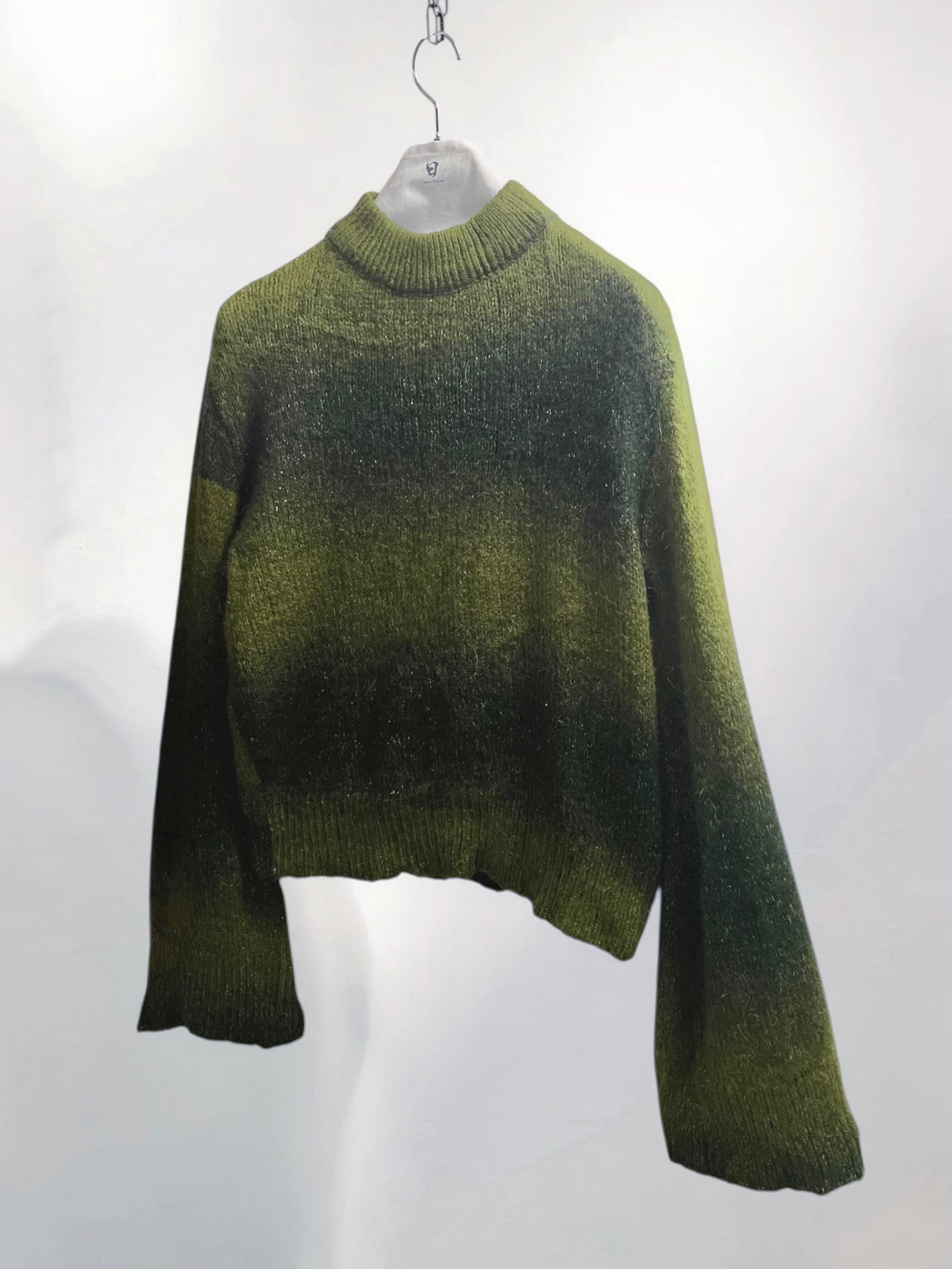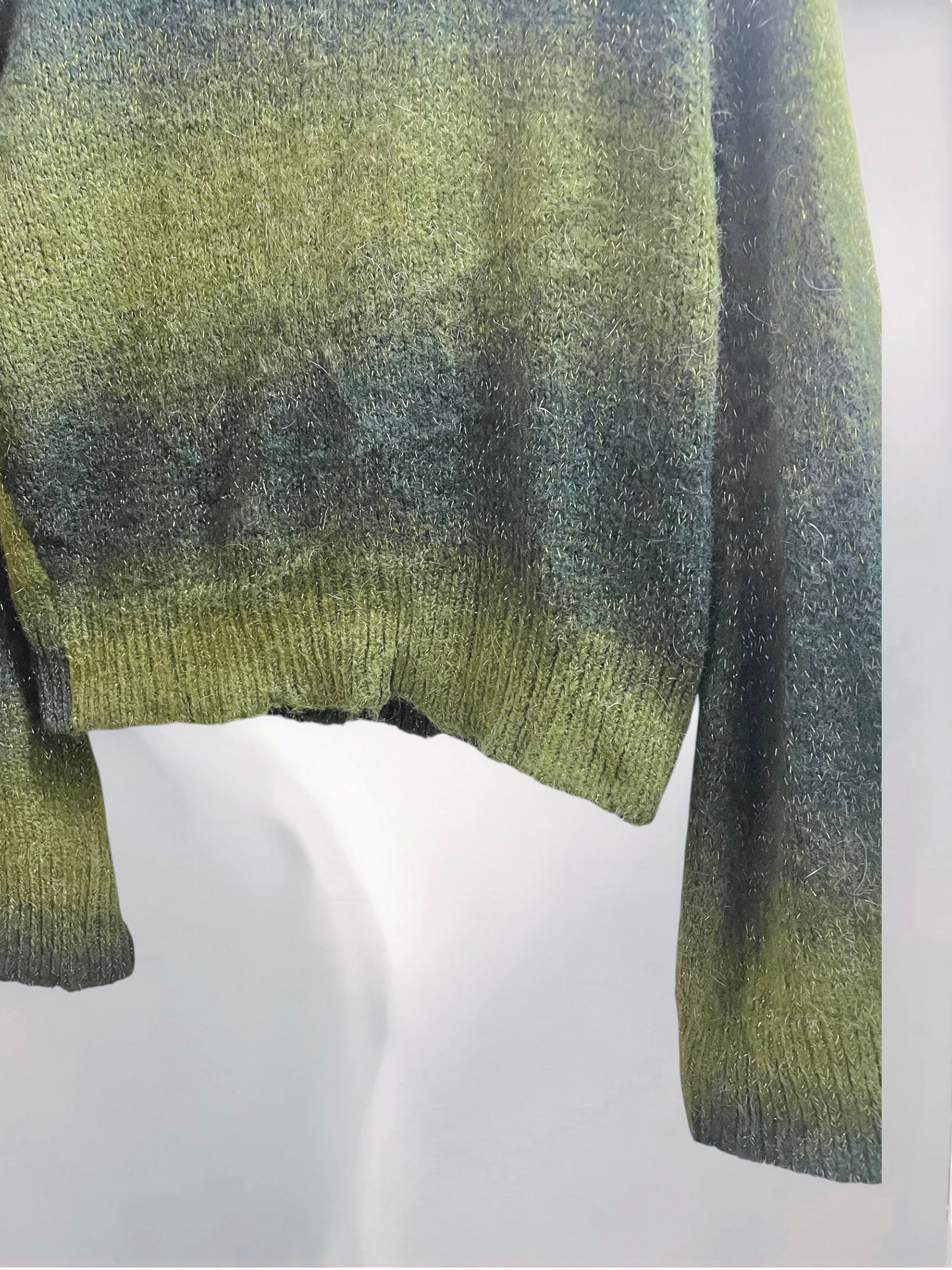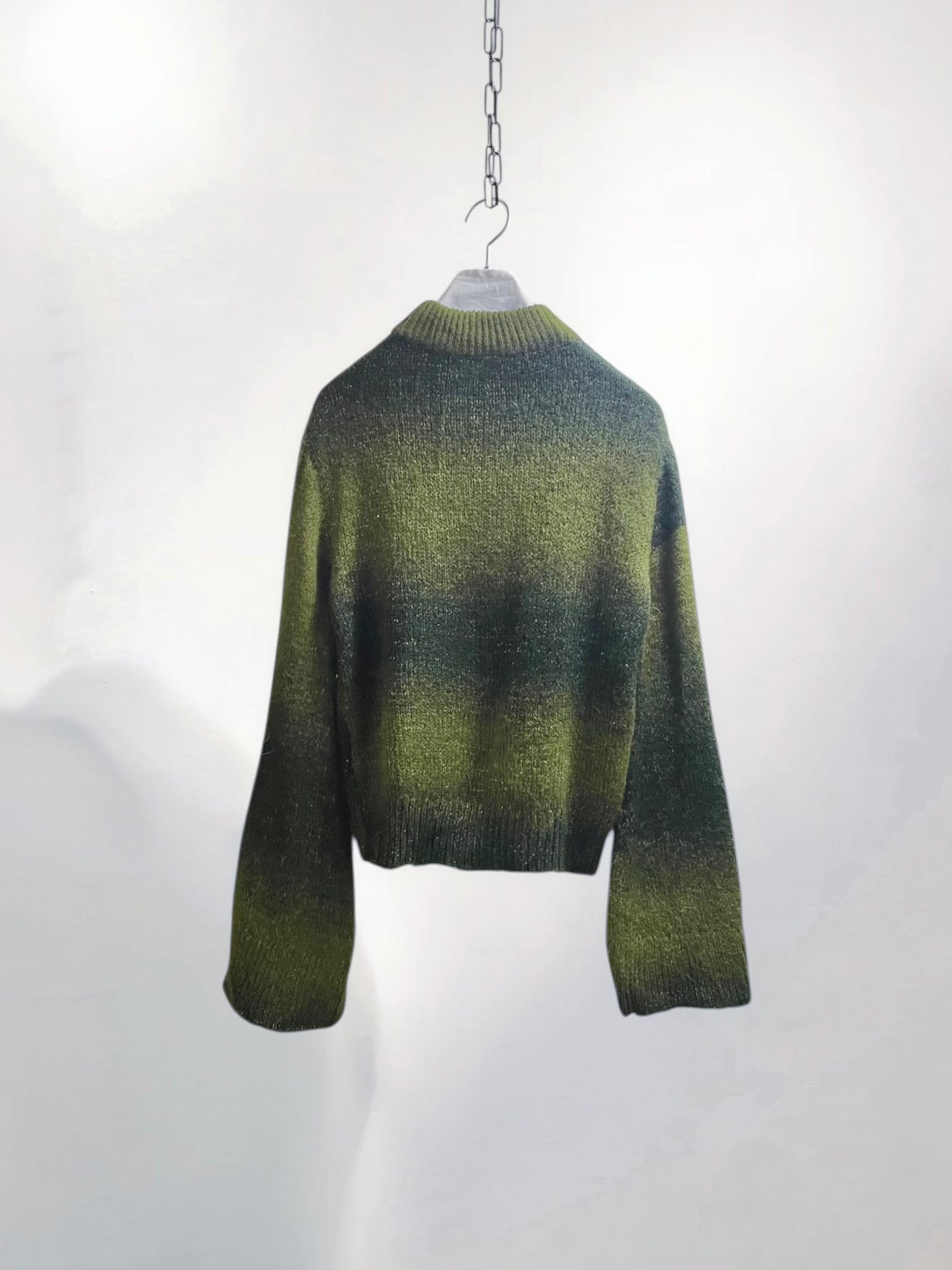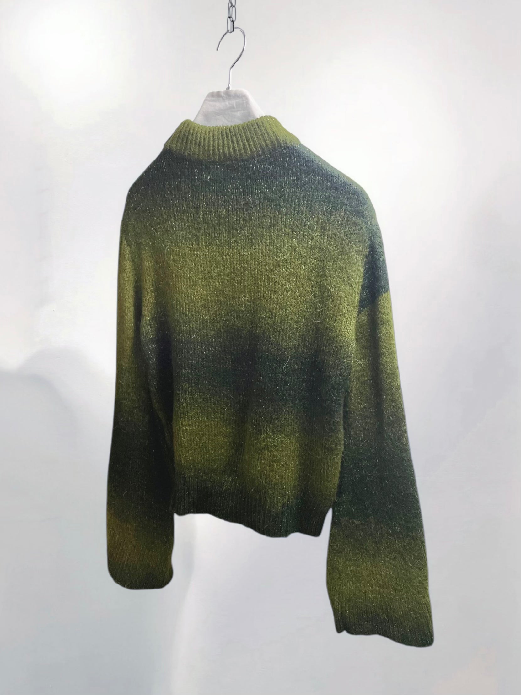 Vintage Olive & Deep Green Mohair-Wool Sweater with Flared Sleeves – Gradient Knit Texture