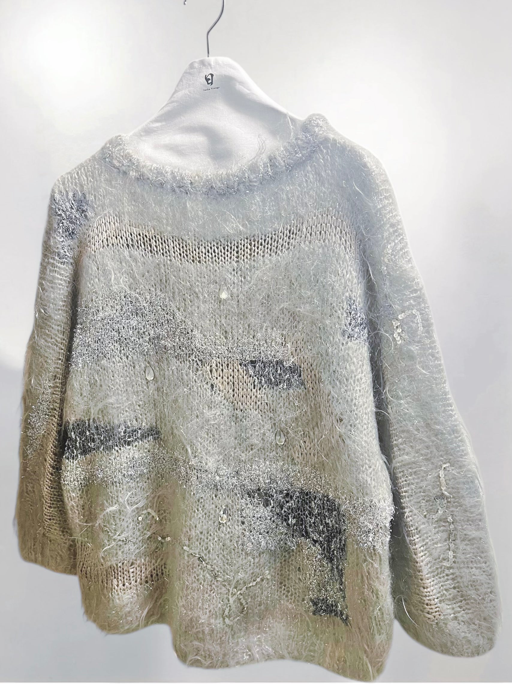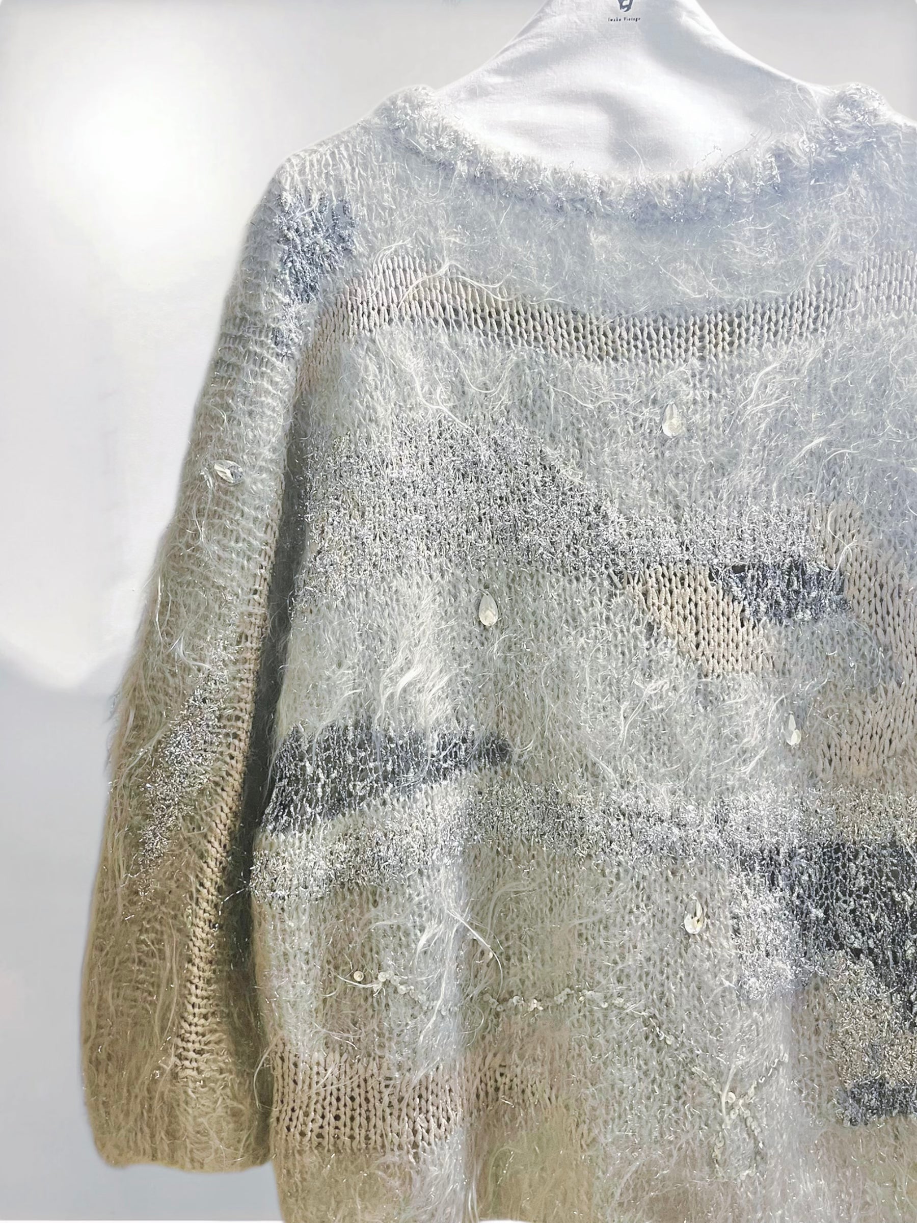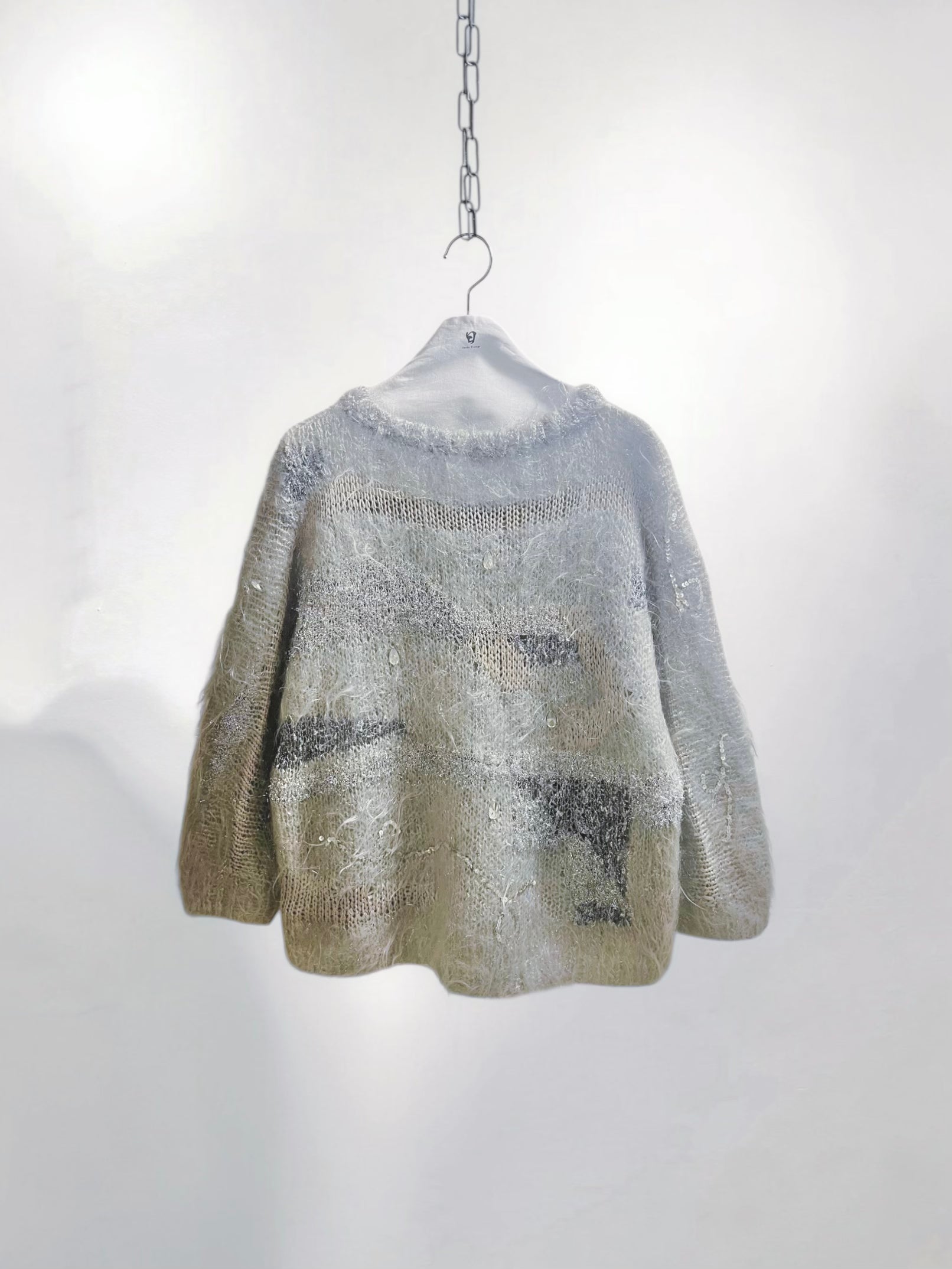 Vintage Ice Grey Mohair Sweater with Sheer Open-Knit and Abstract Brush Pattern – Airy Halo Texture