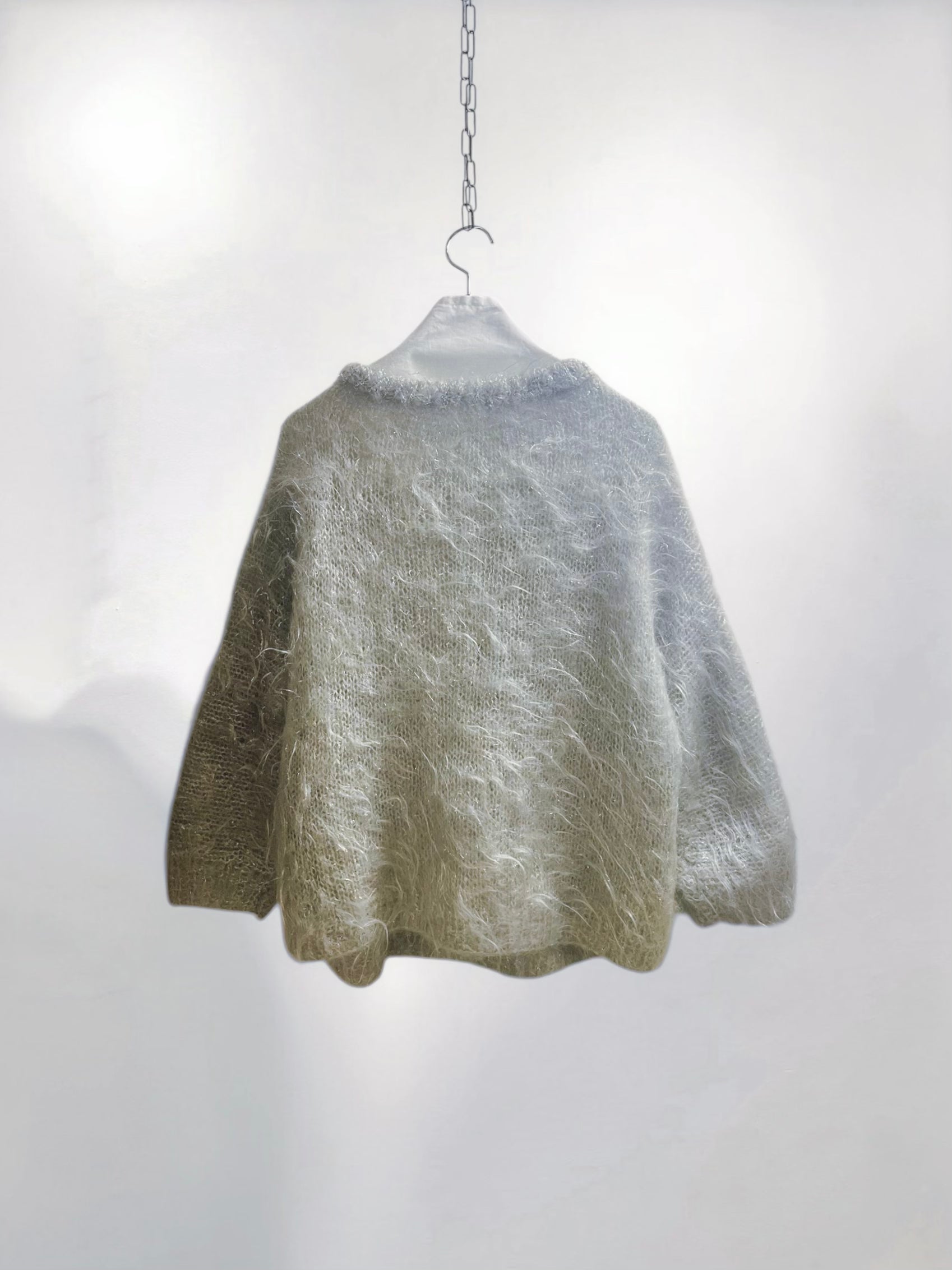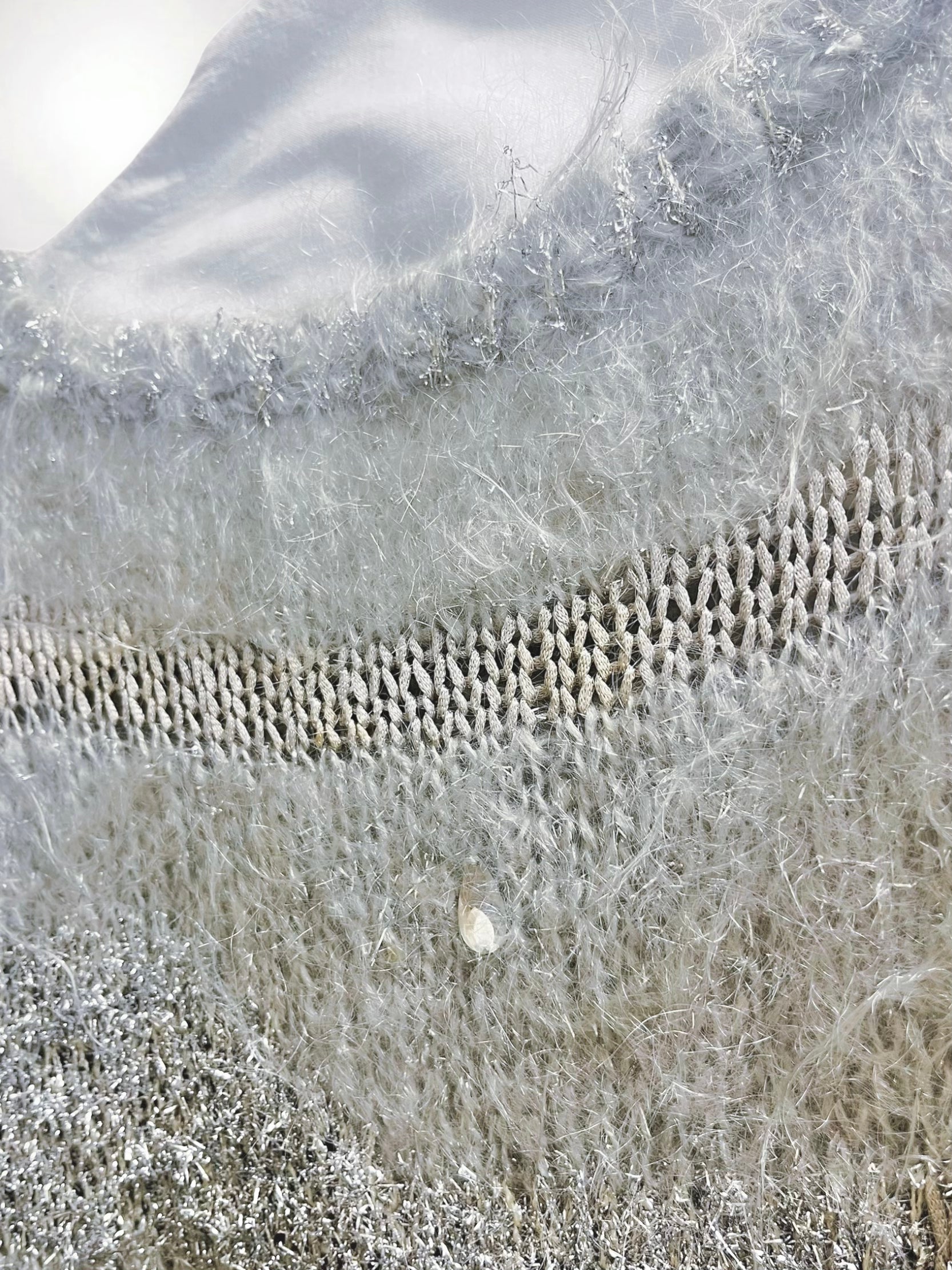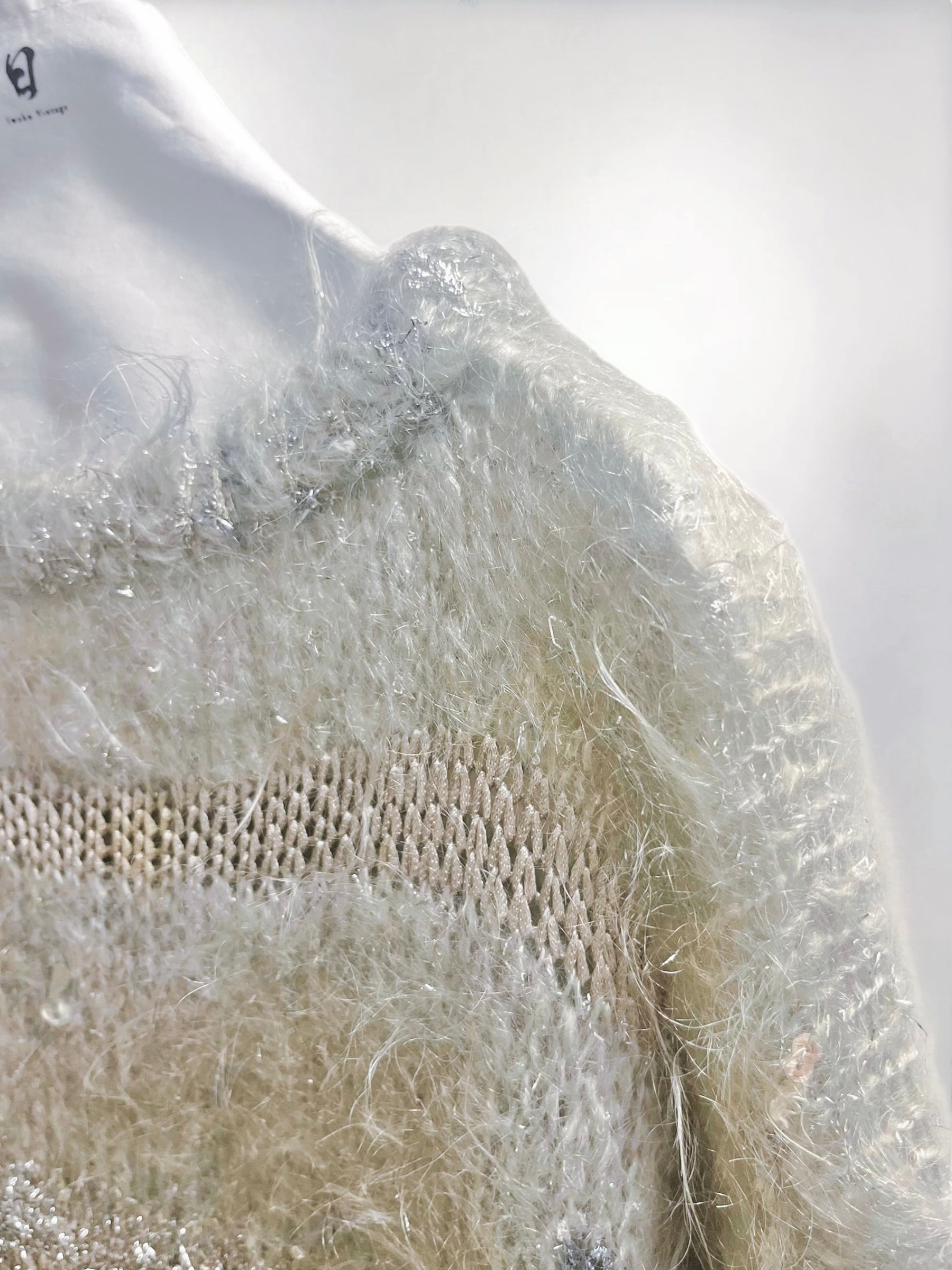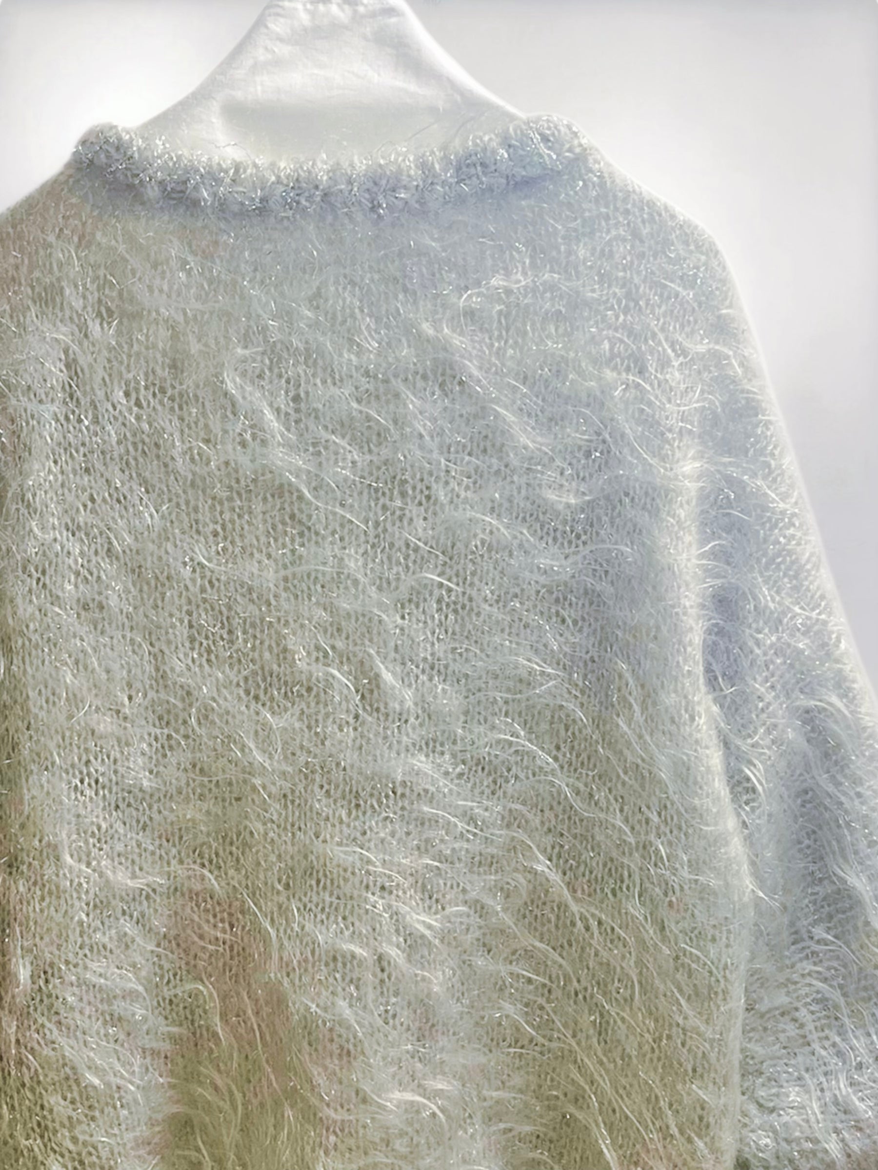 Vintage Ice Grey Mohair Sweater with Sheer Open-Knit and Abstract Brush Pattern – Airy Halo Texture