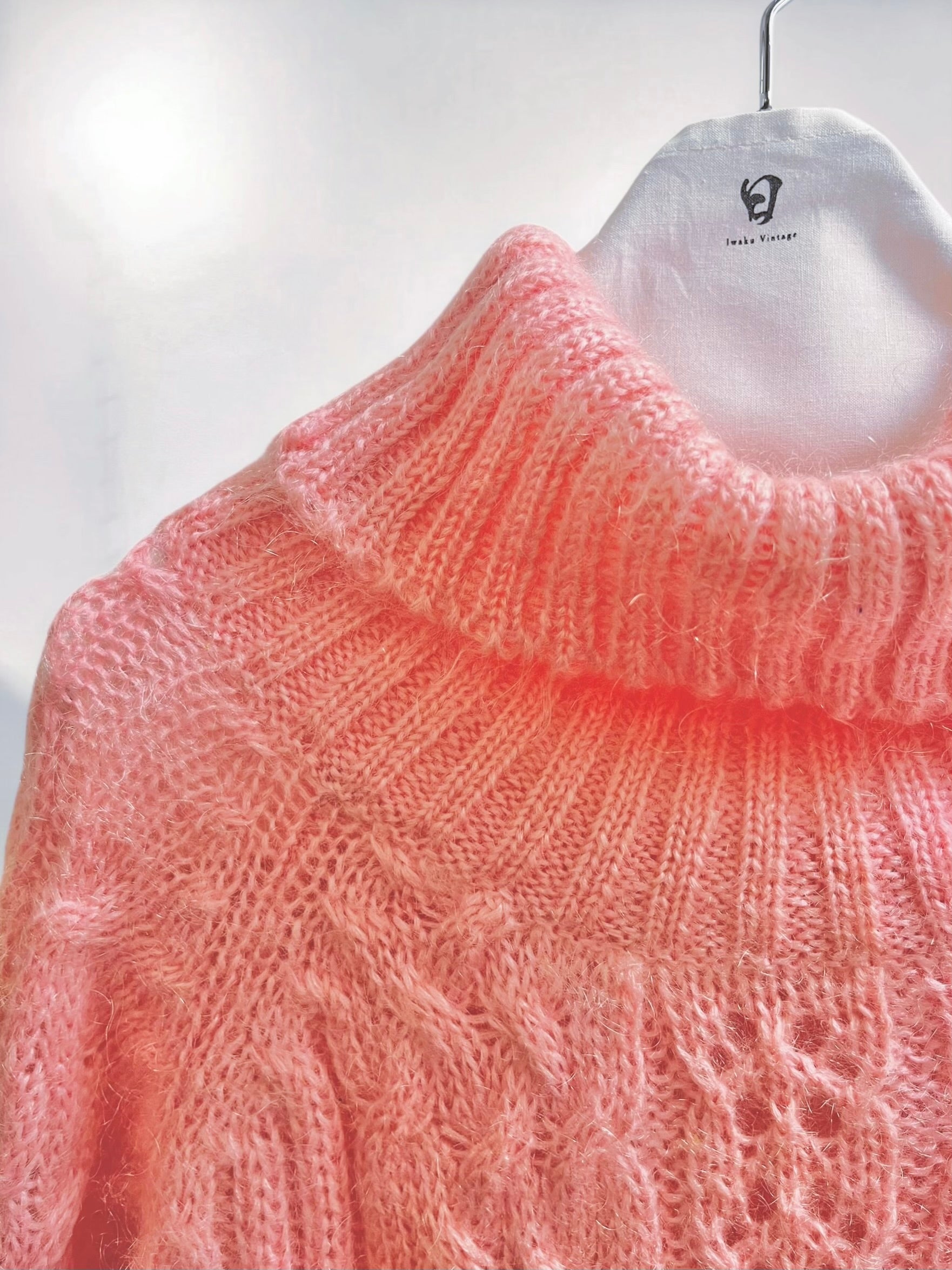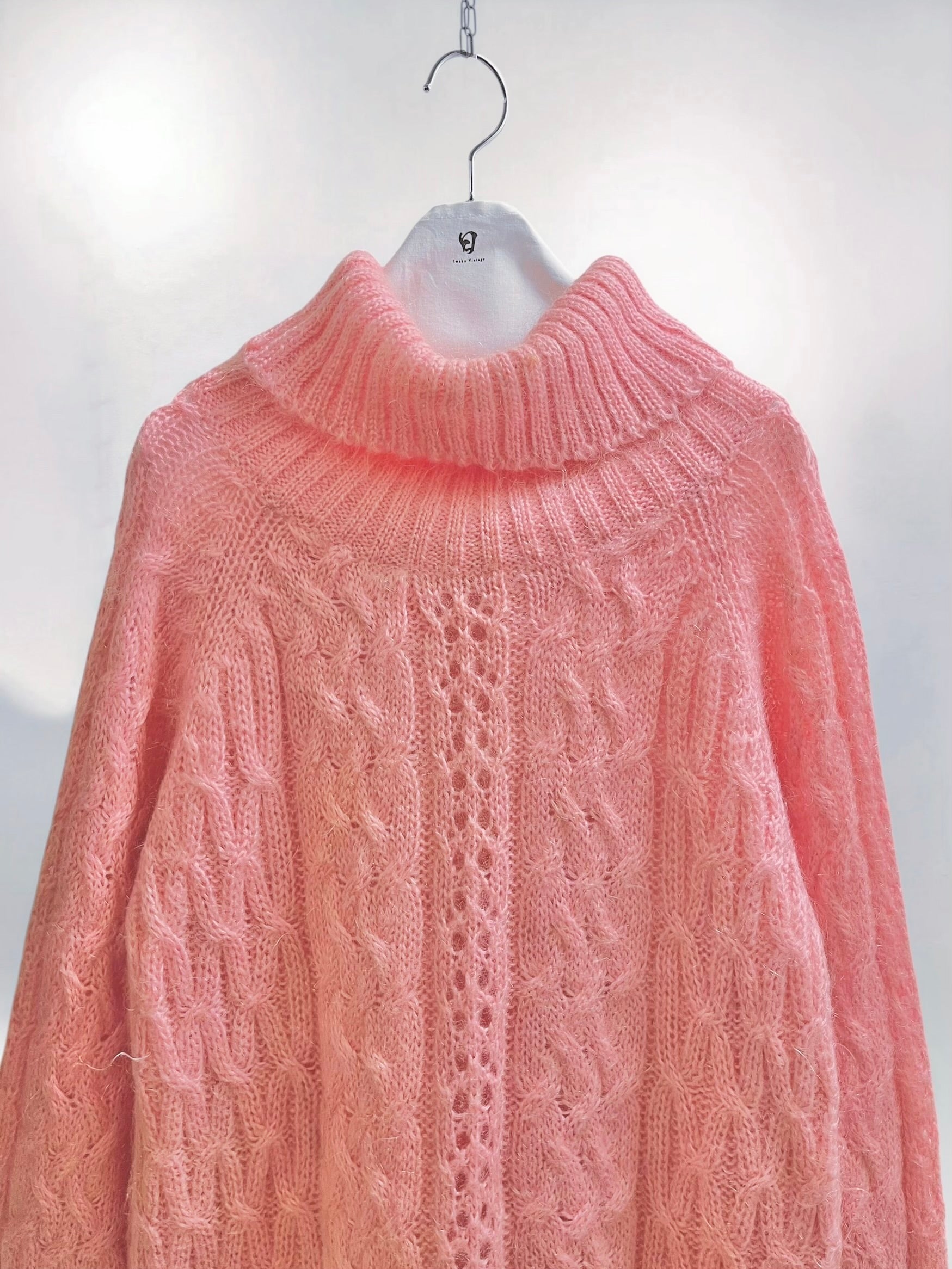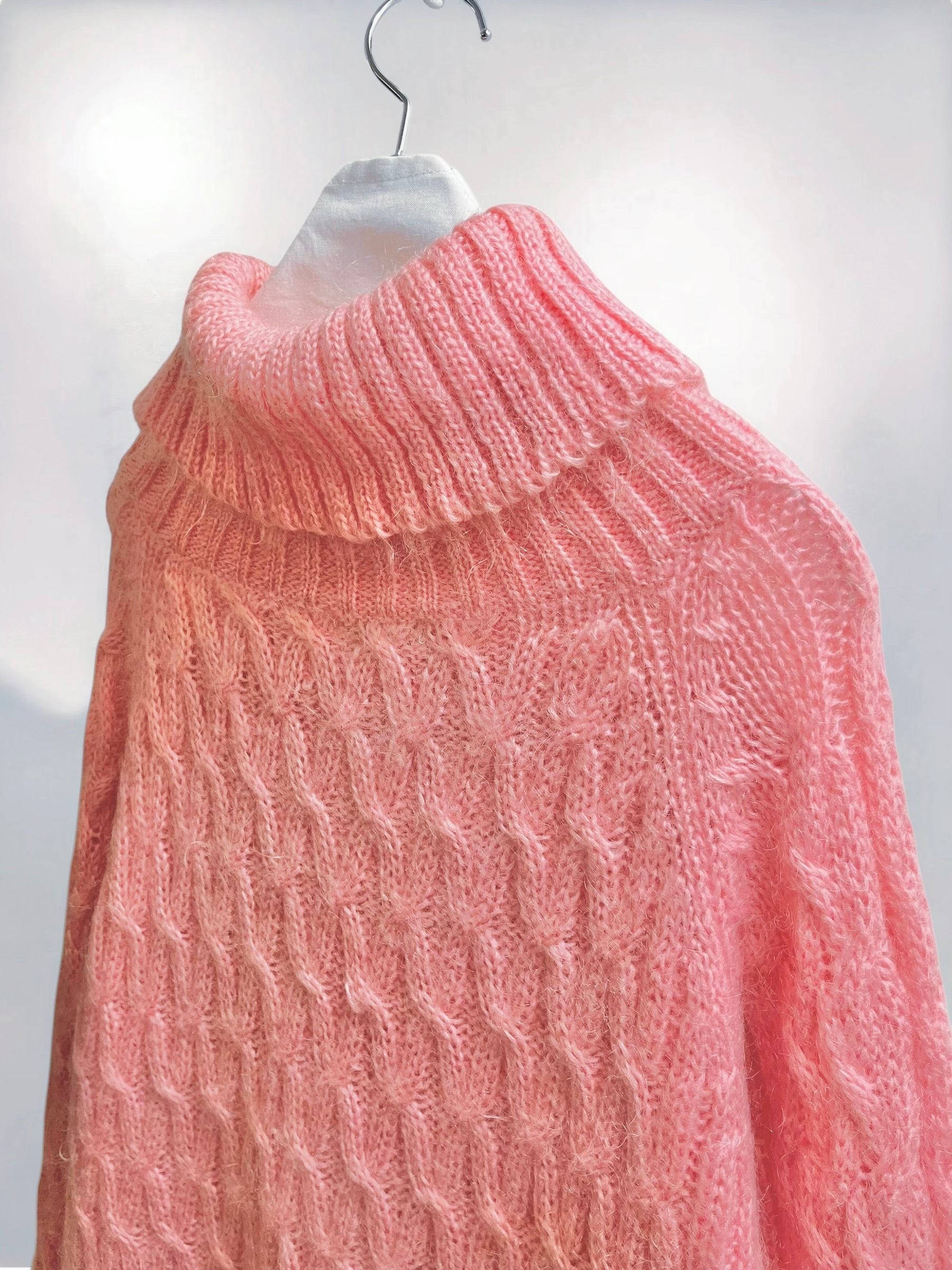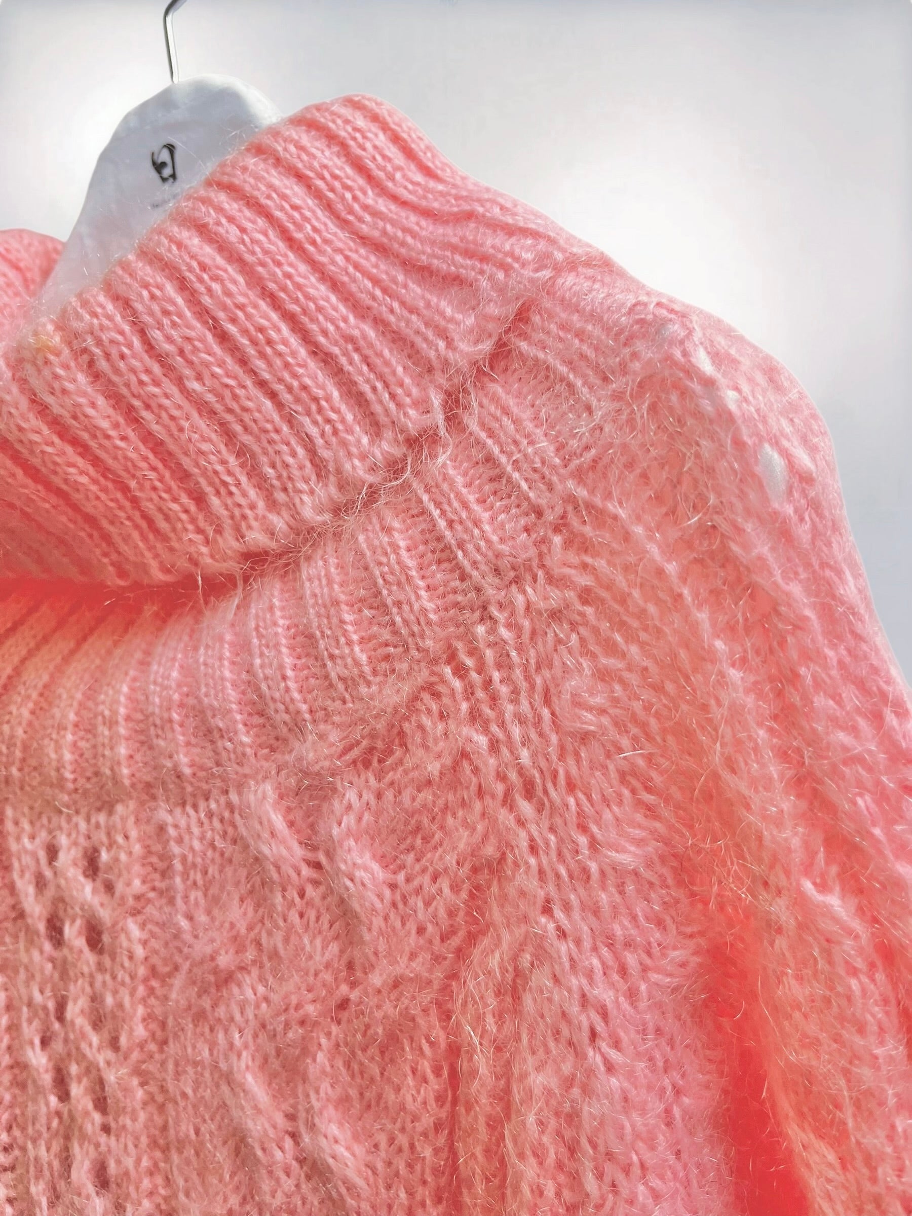 Vintage Pink Mohair Turtleneck Sweater with Cable Knit and Openwork Panel (80s–Early 90s) – Made in British Hong Kong