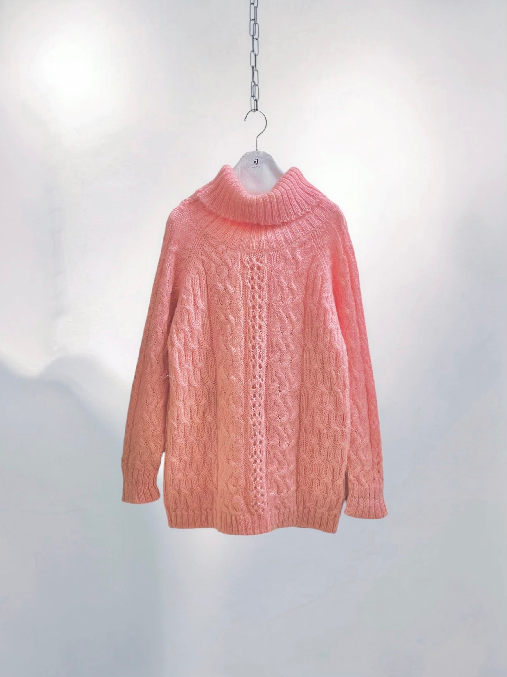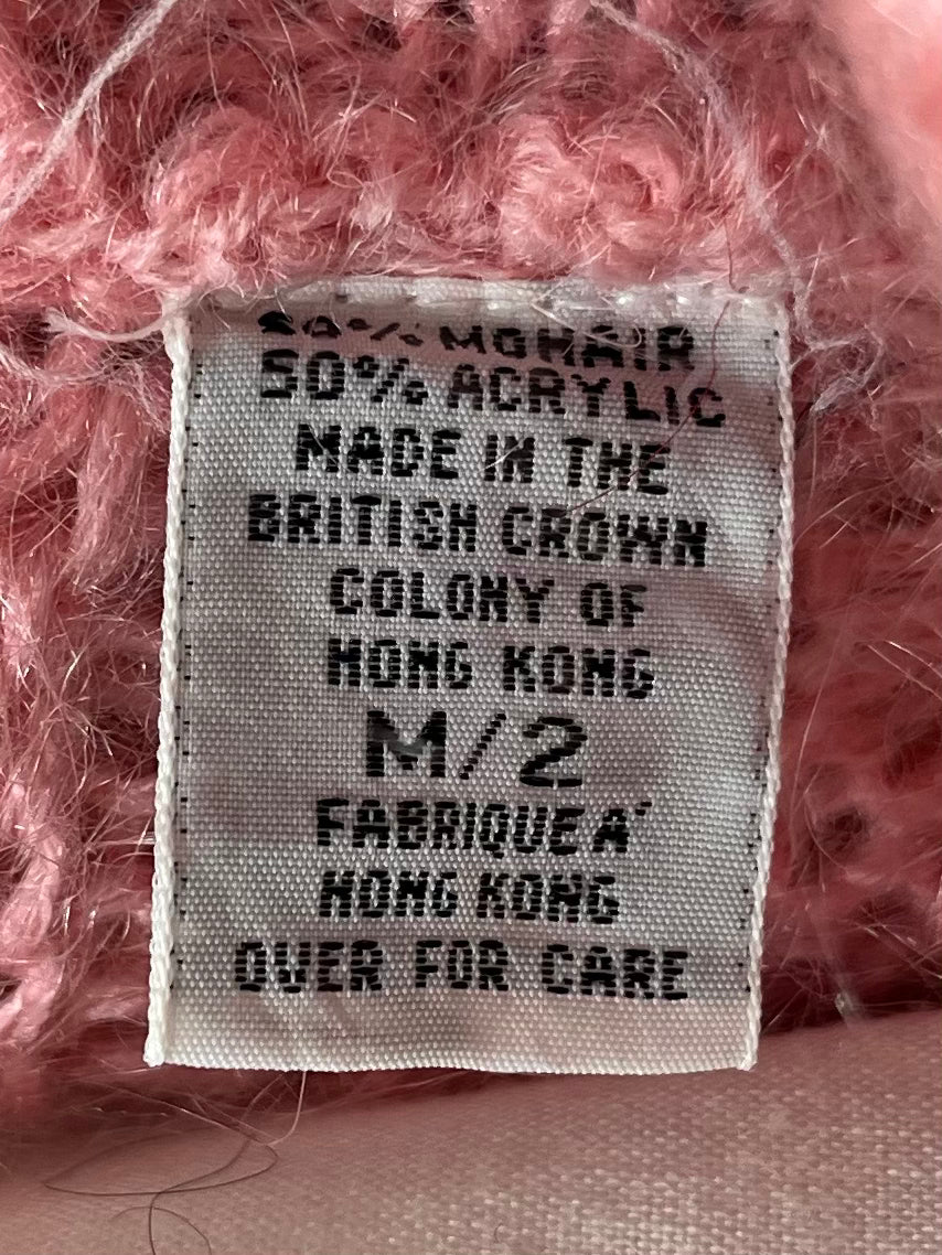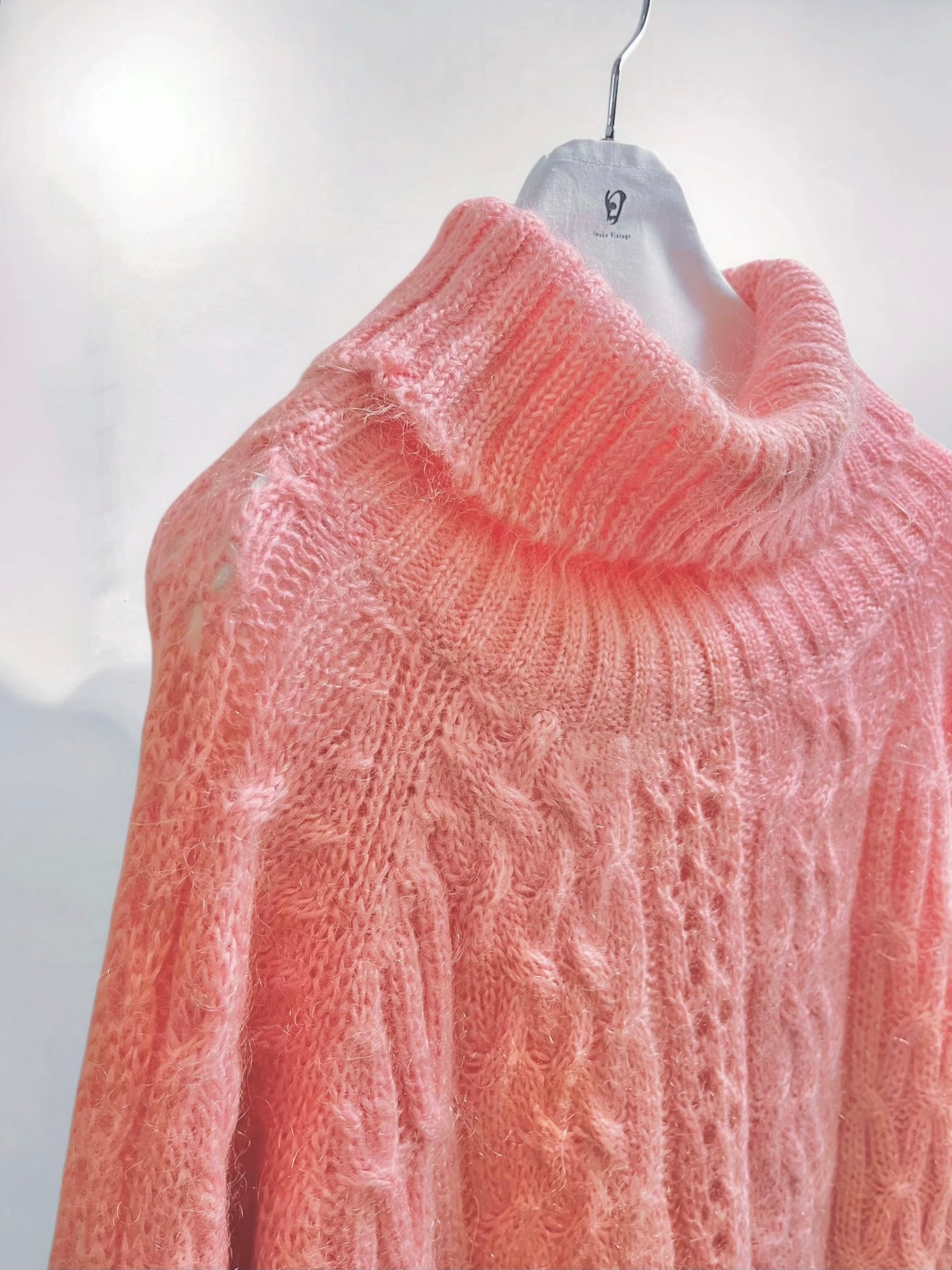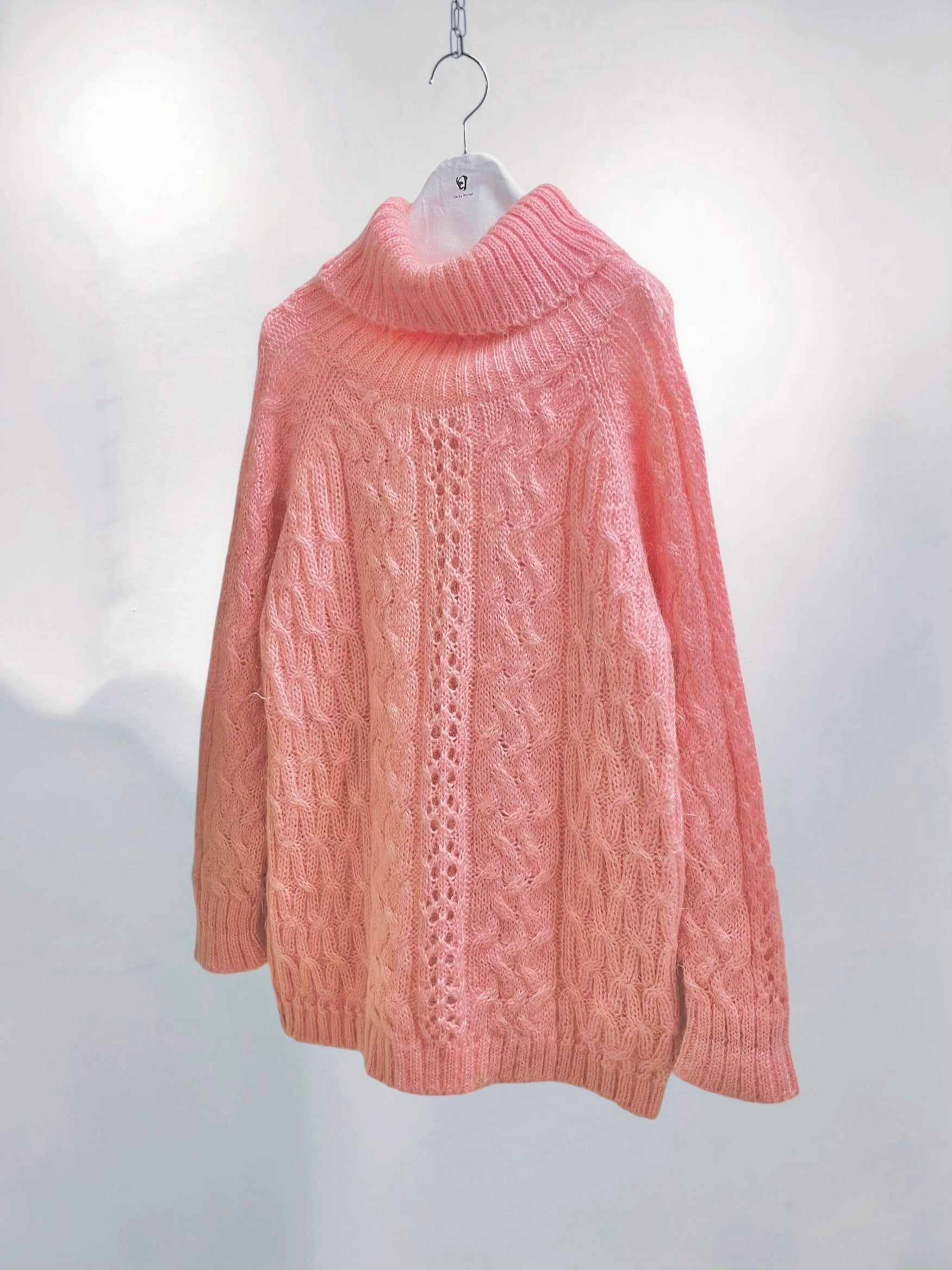 Vintage Pink Mohair Turtleneck Sweater with Cable Knit and Openwork Panel (80s–Early 90s) – Made in British Hong Kong