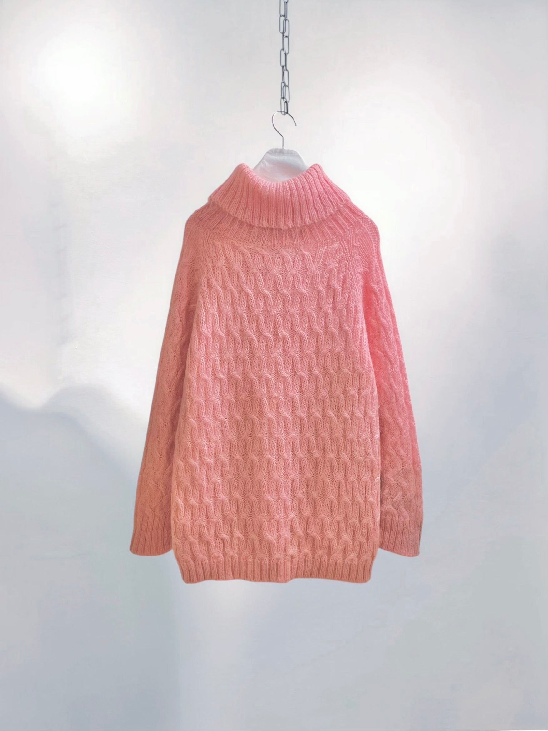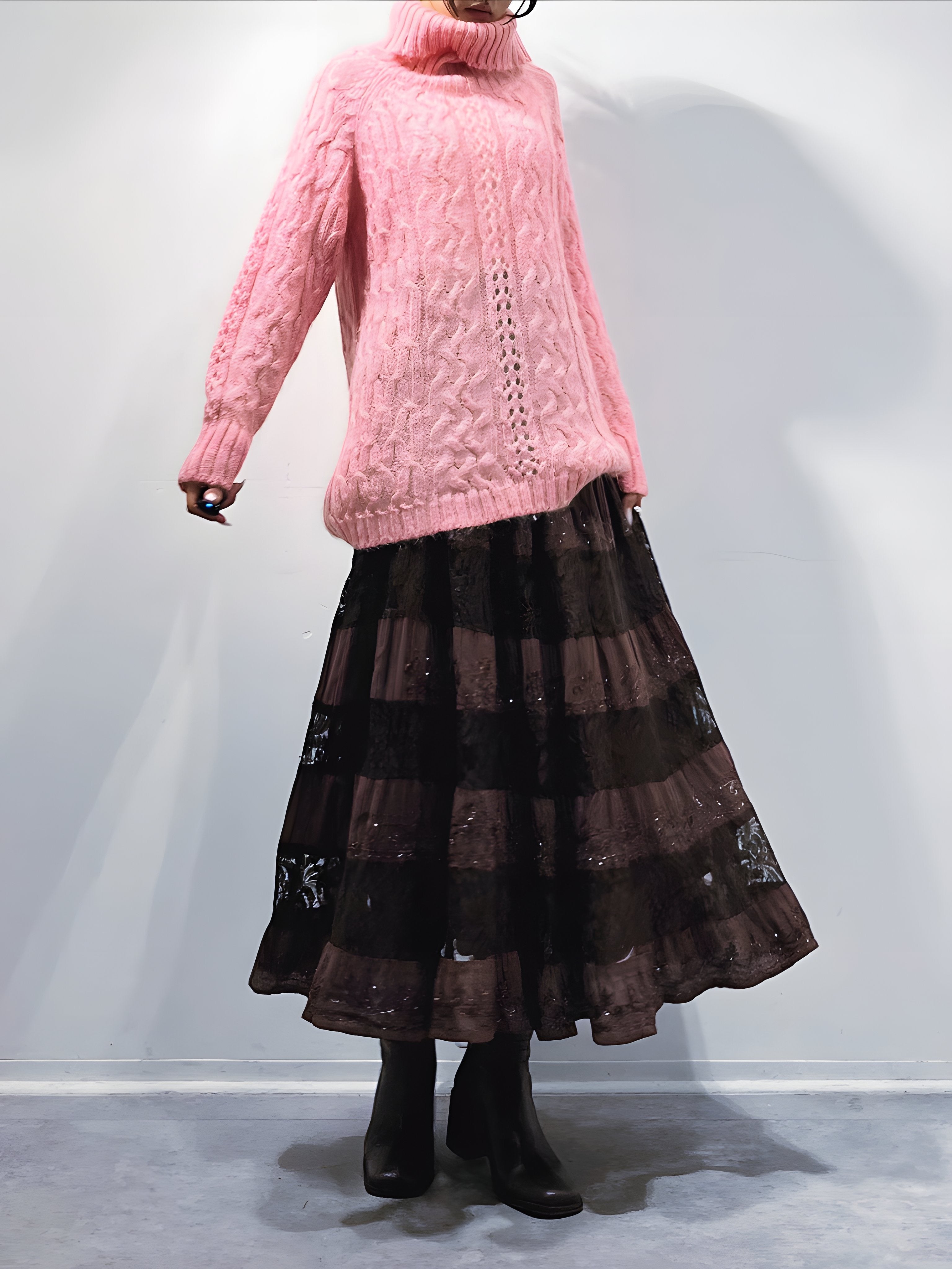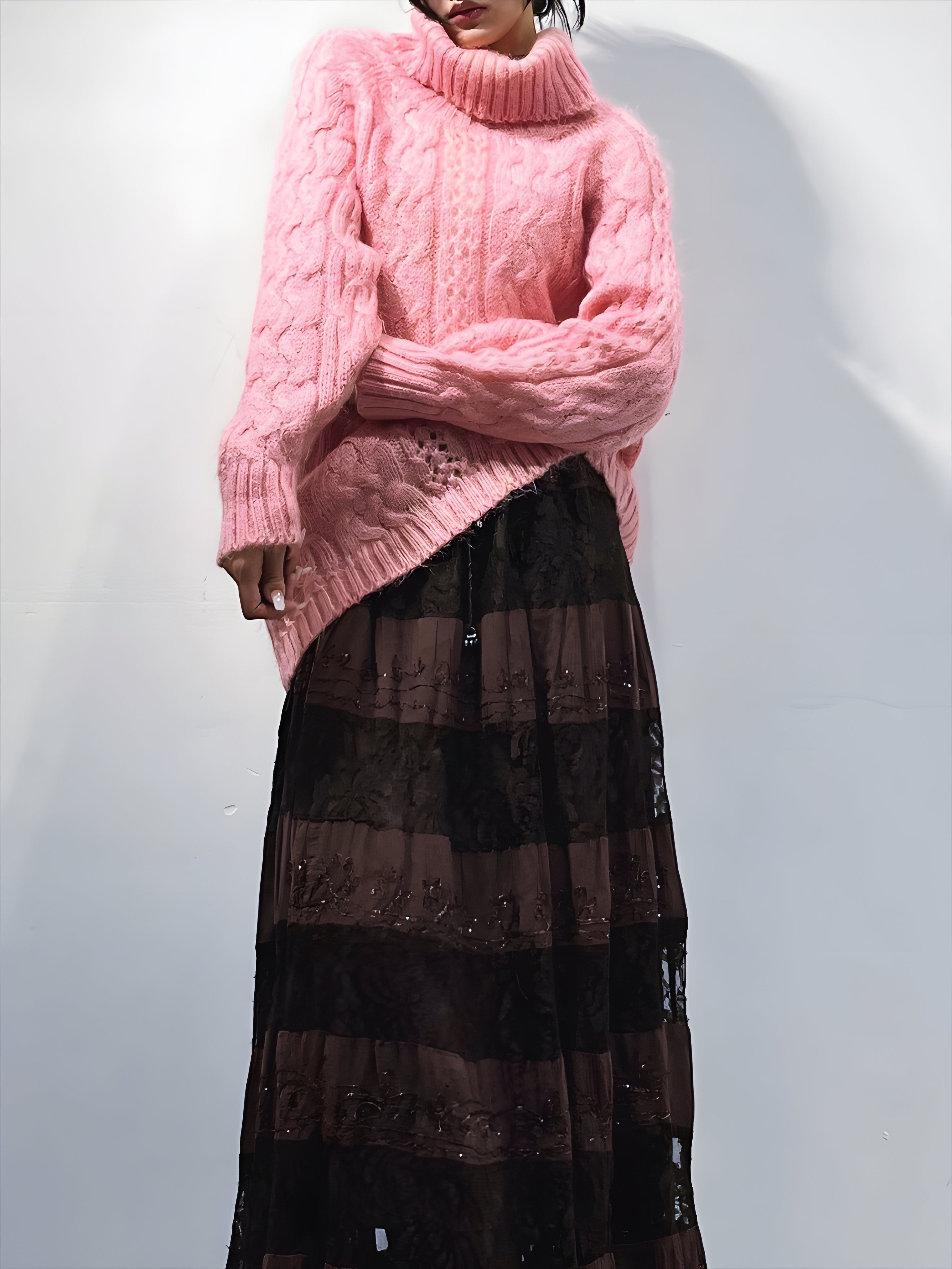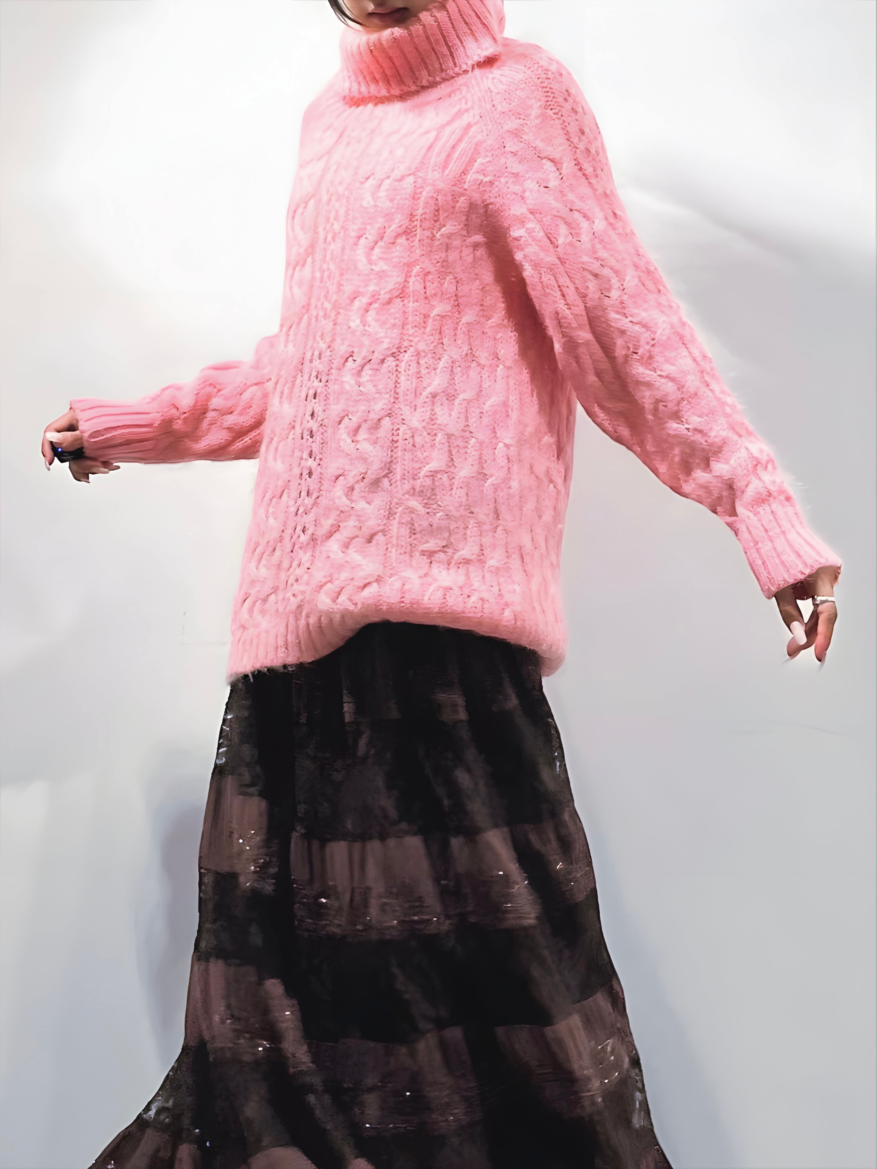 Vintage Pink Mohair Turtleneck Sweater with Cable Knit and Openwork Panel (80s–Early 90s) – Made in British Hong Kong