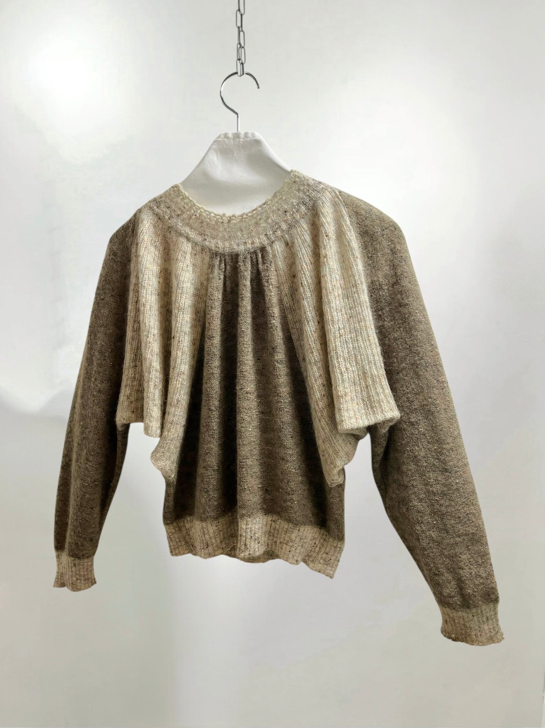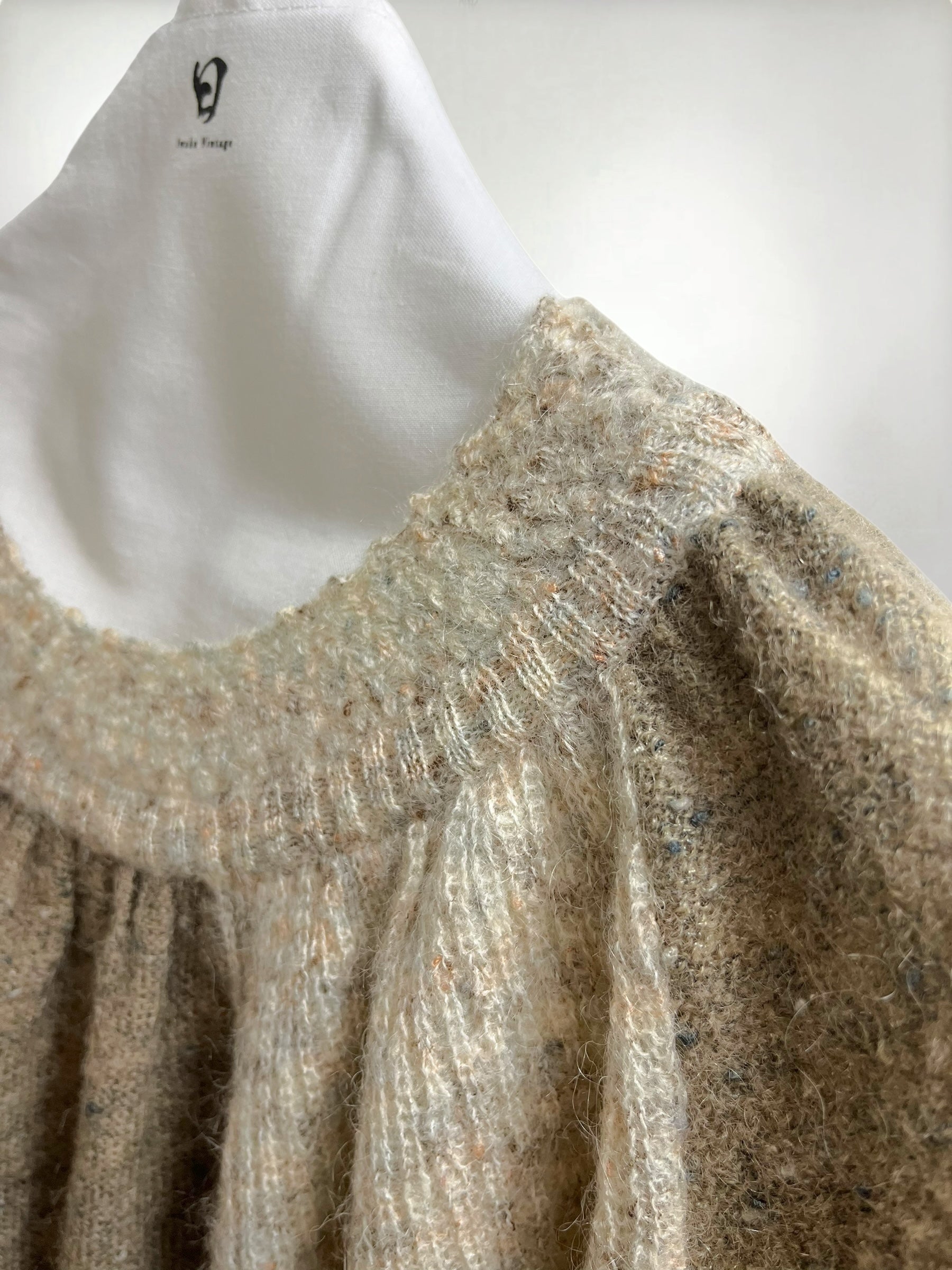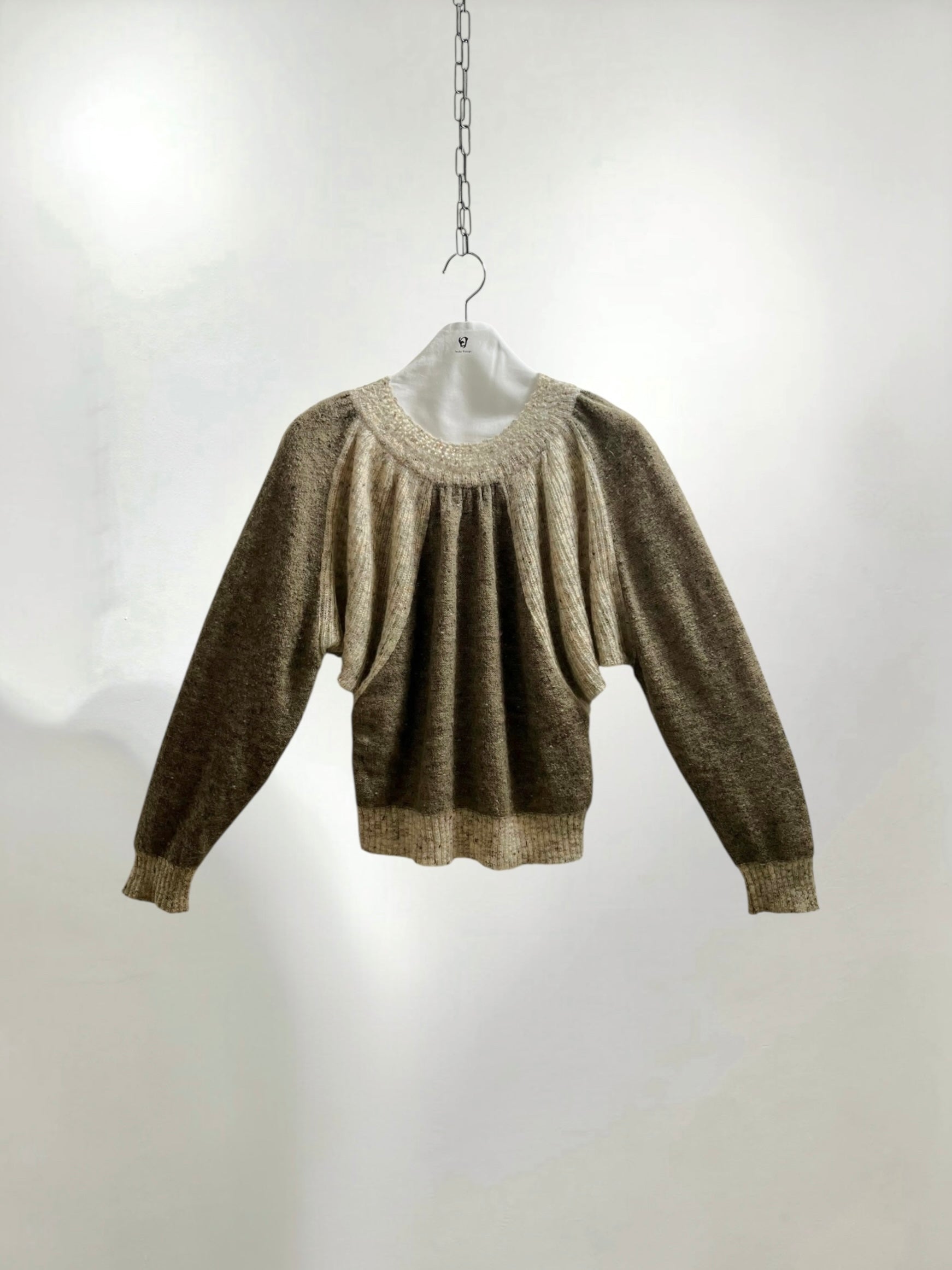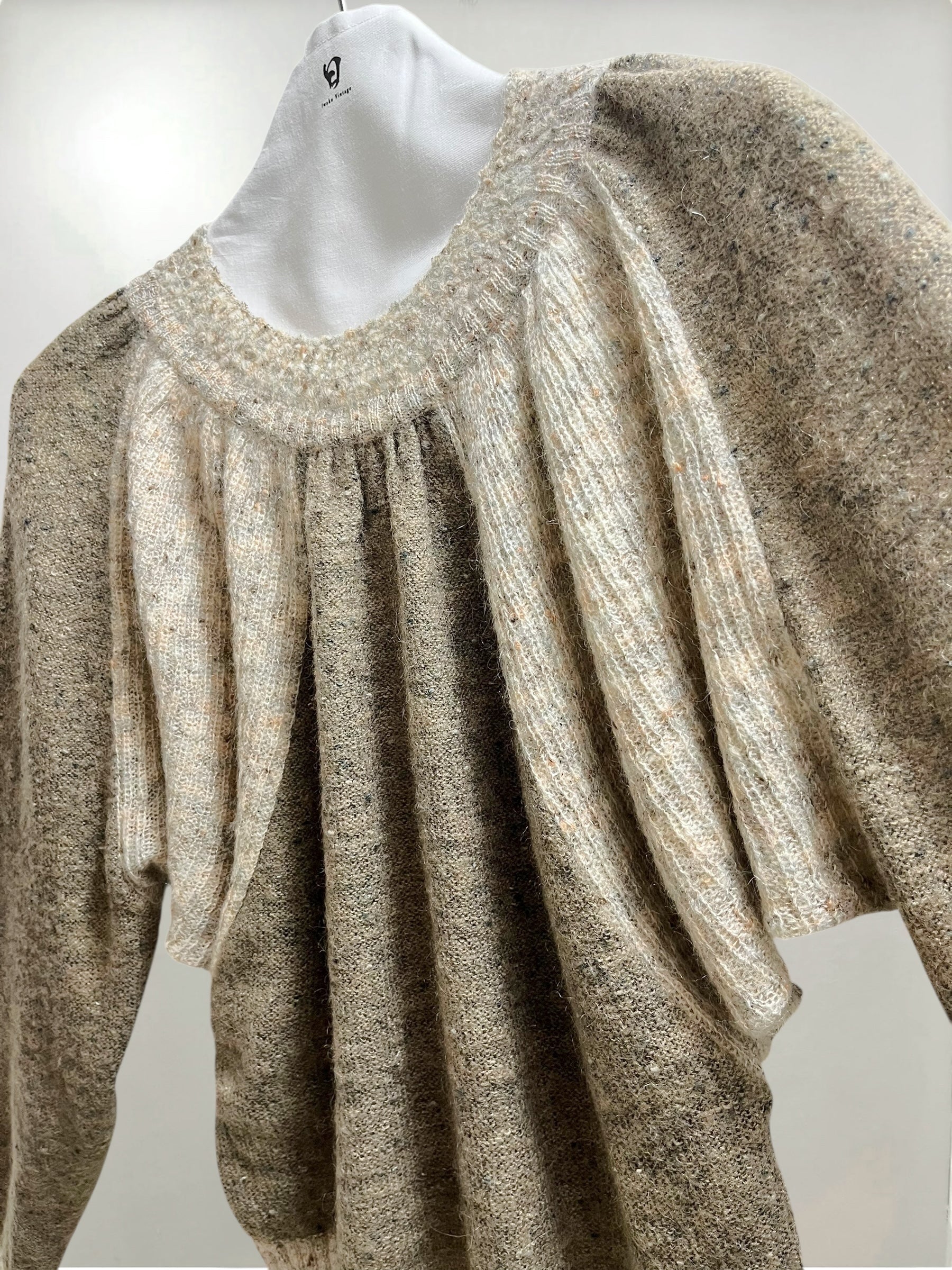 Vintage Taupe Melange Mohair–Wool Blend Sweater with Gathered Yoke (Late 80s–Early 90s) – Sculptural Drape