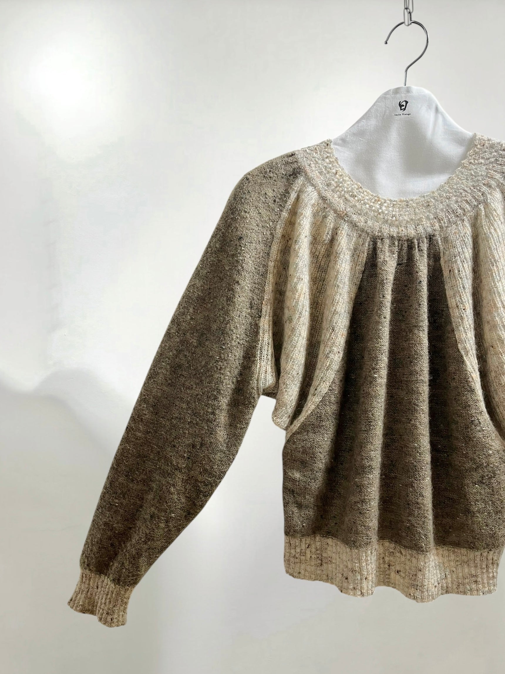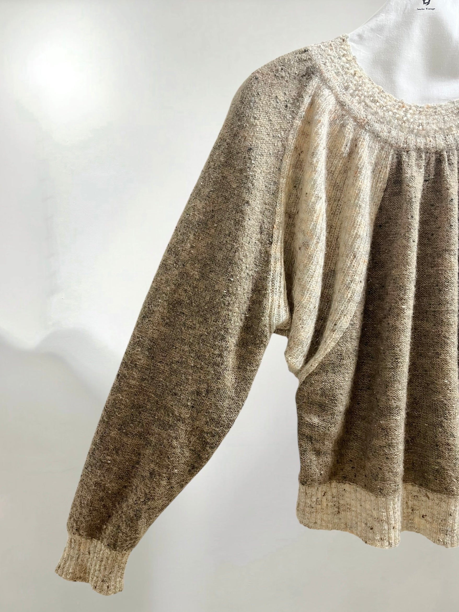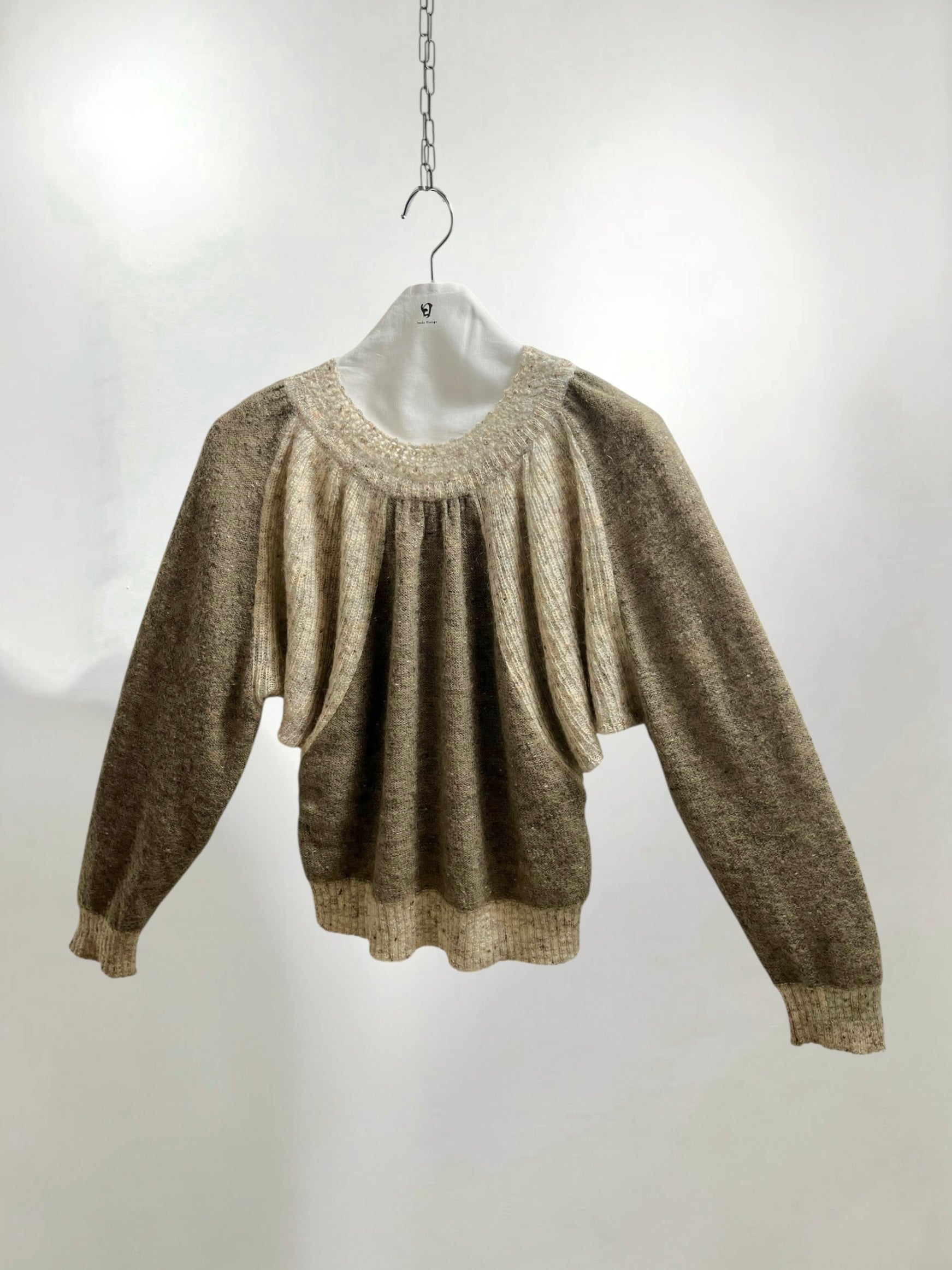 Vintage Taupe Melange Mohair–Wool Blend Sweater with Gathered Yoke (Late 80s–Early 90s) – Sculptural Drape