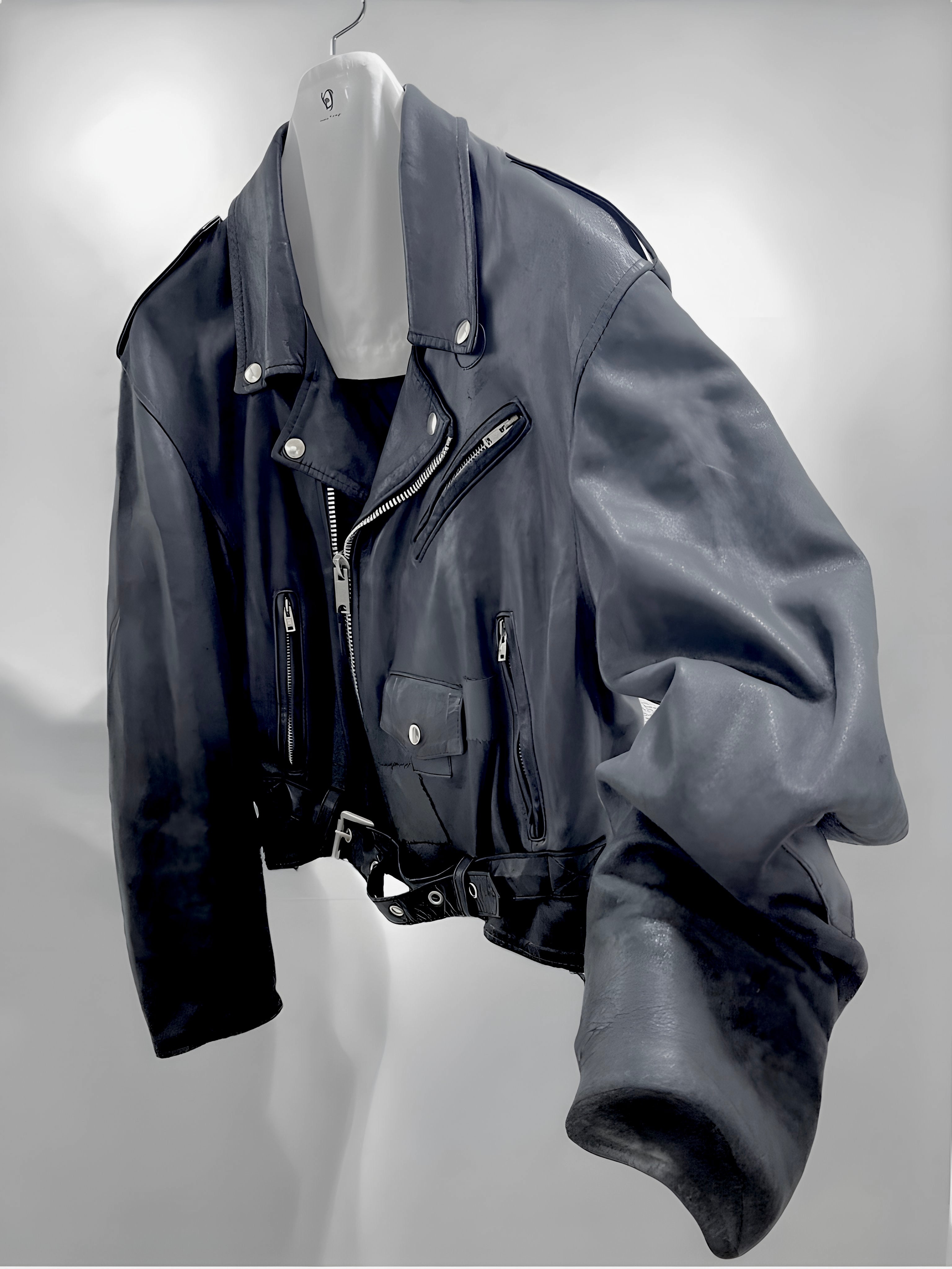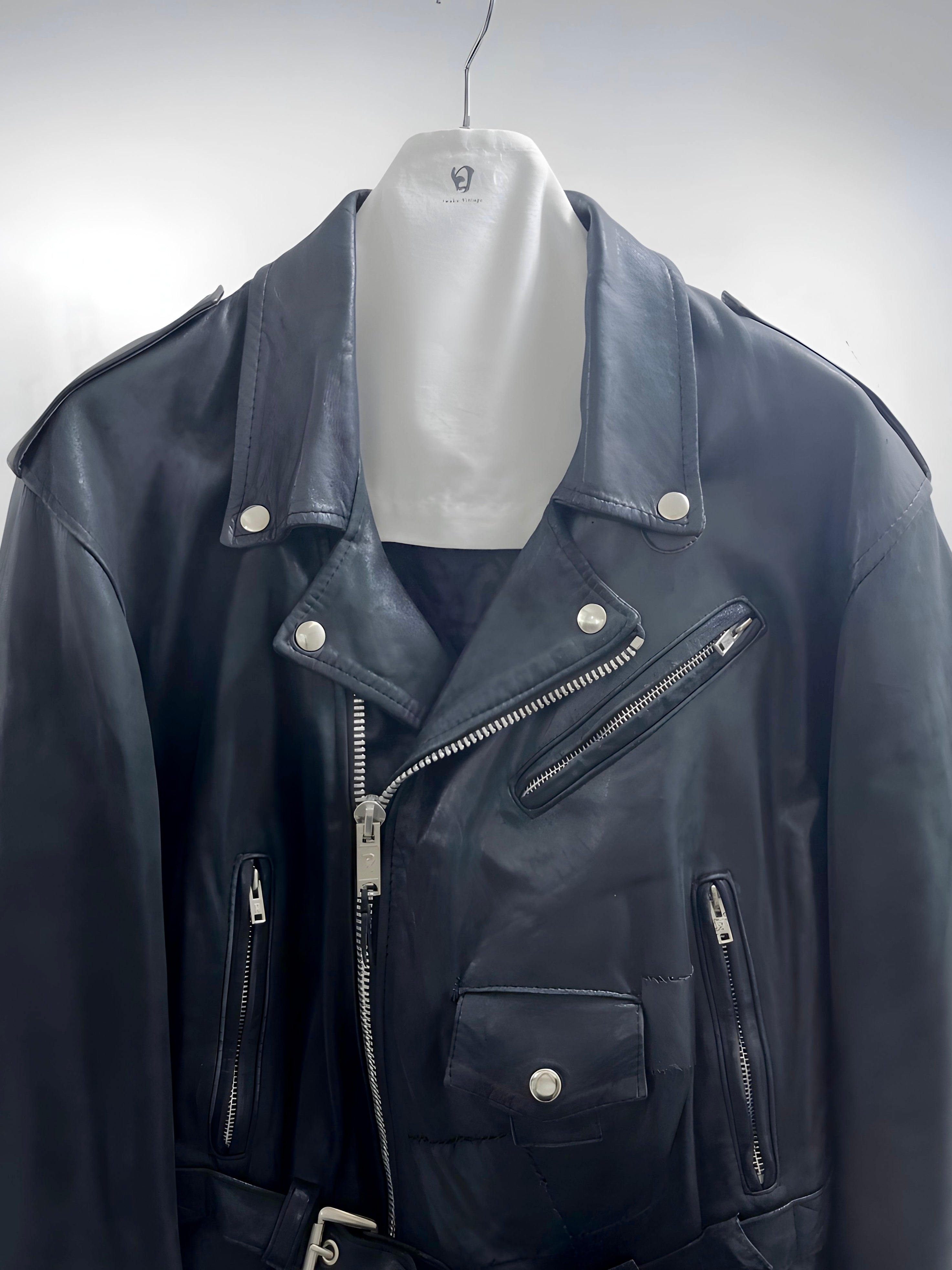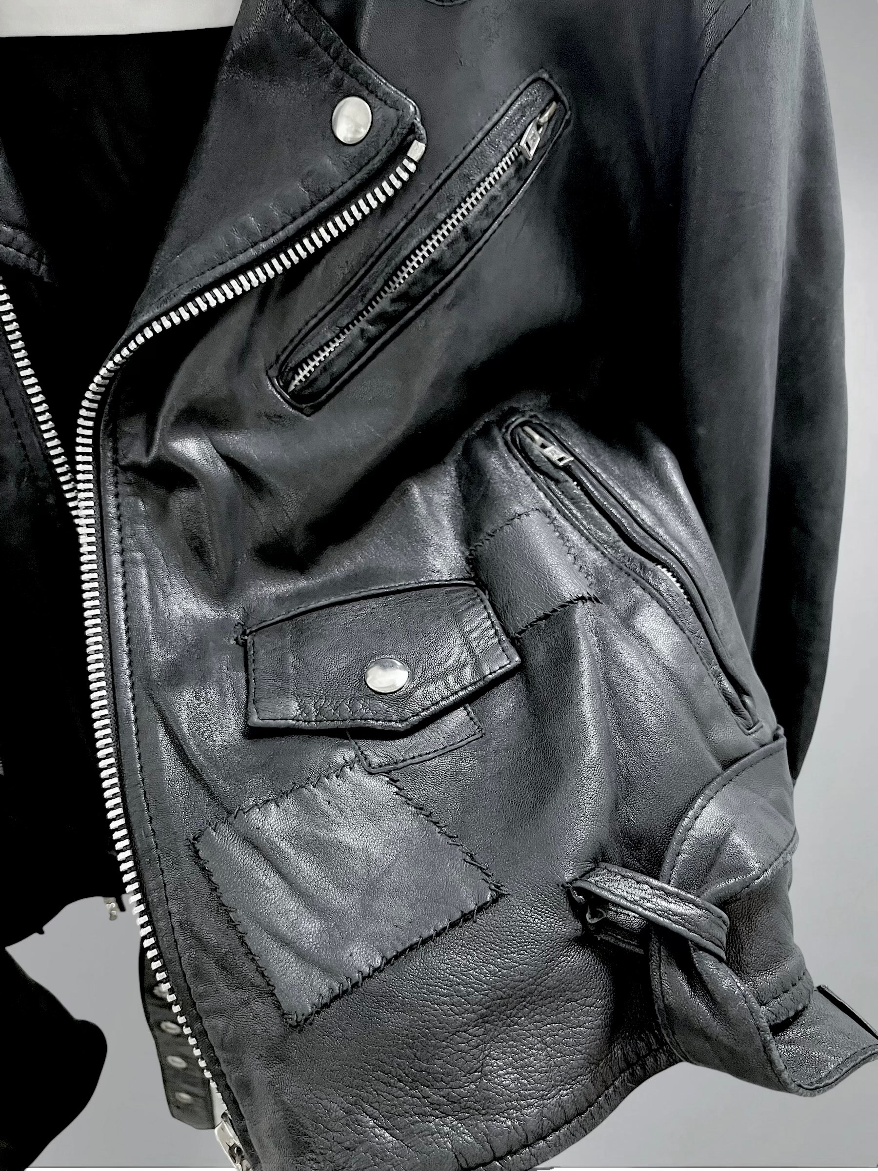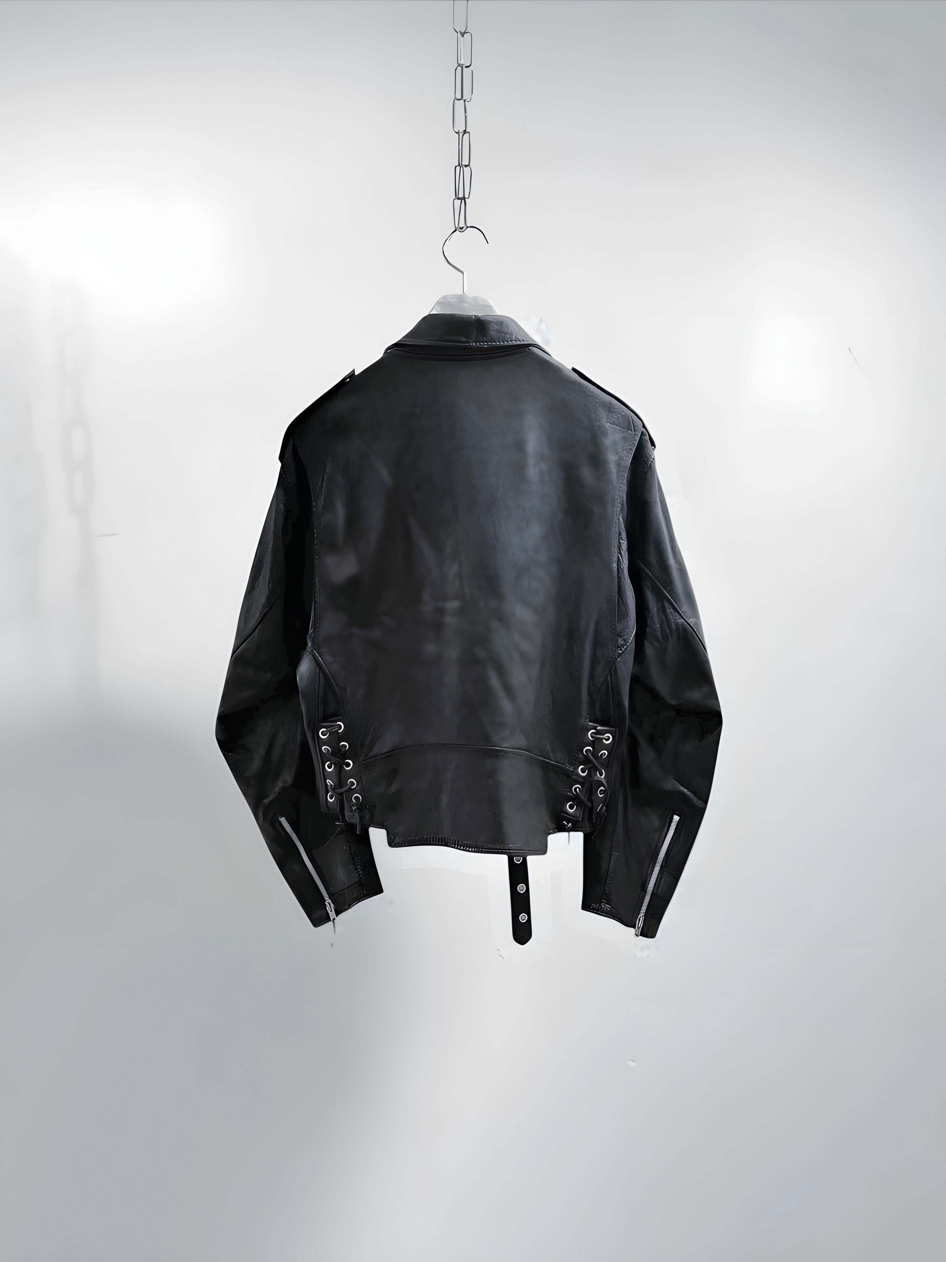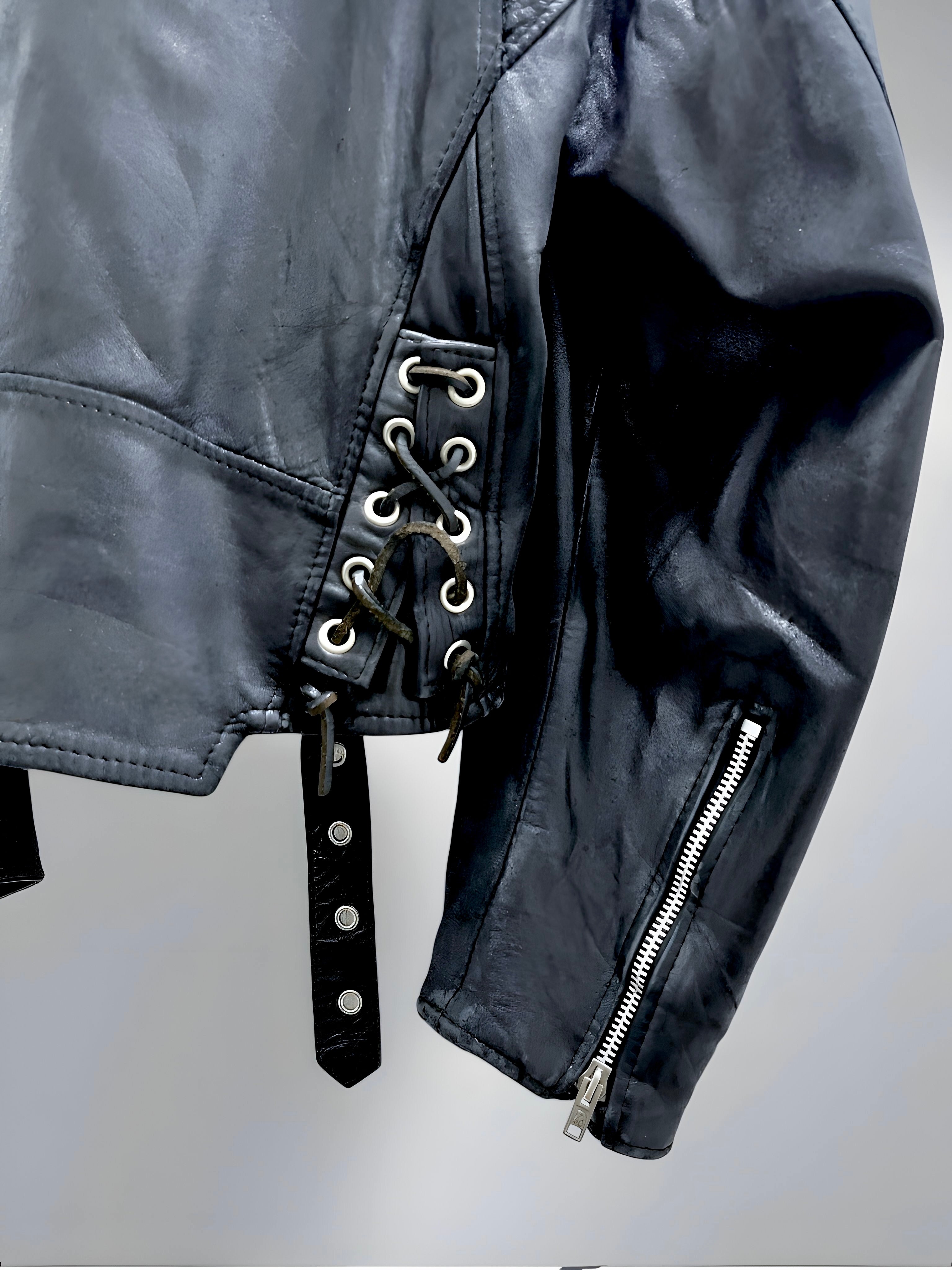 Vintage Black Leather Biker Jacket with Sculptural Silhouette and Lace-Up Details (80s, Europe)