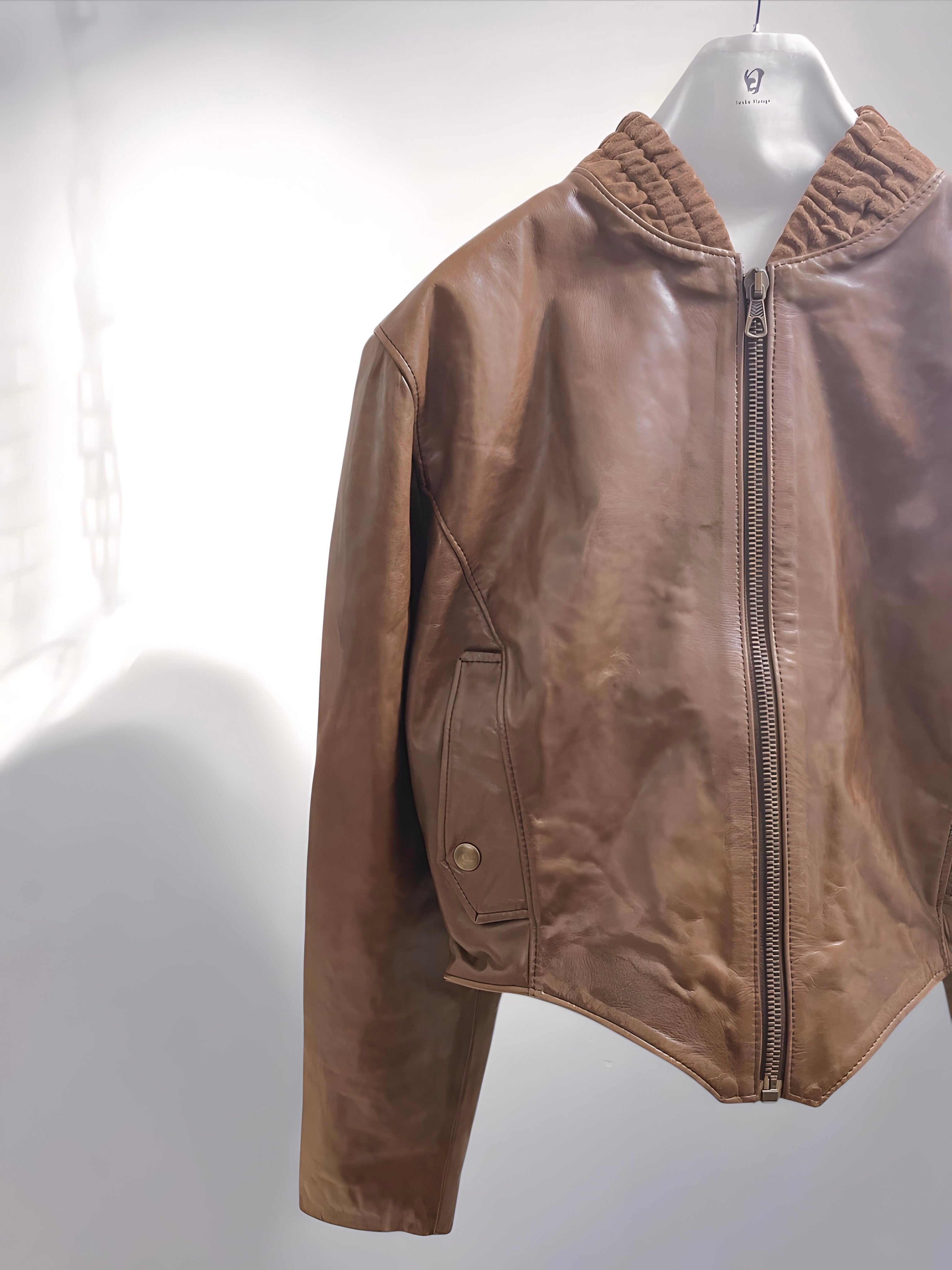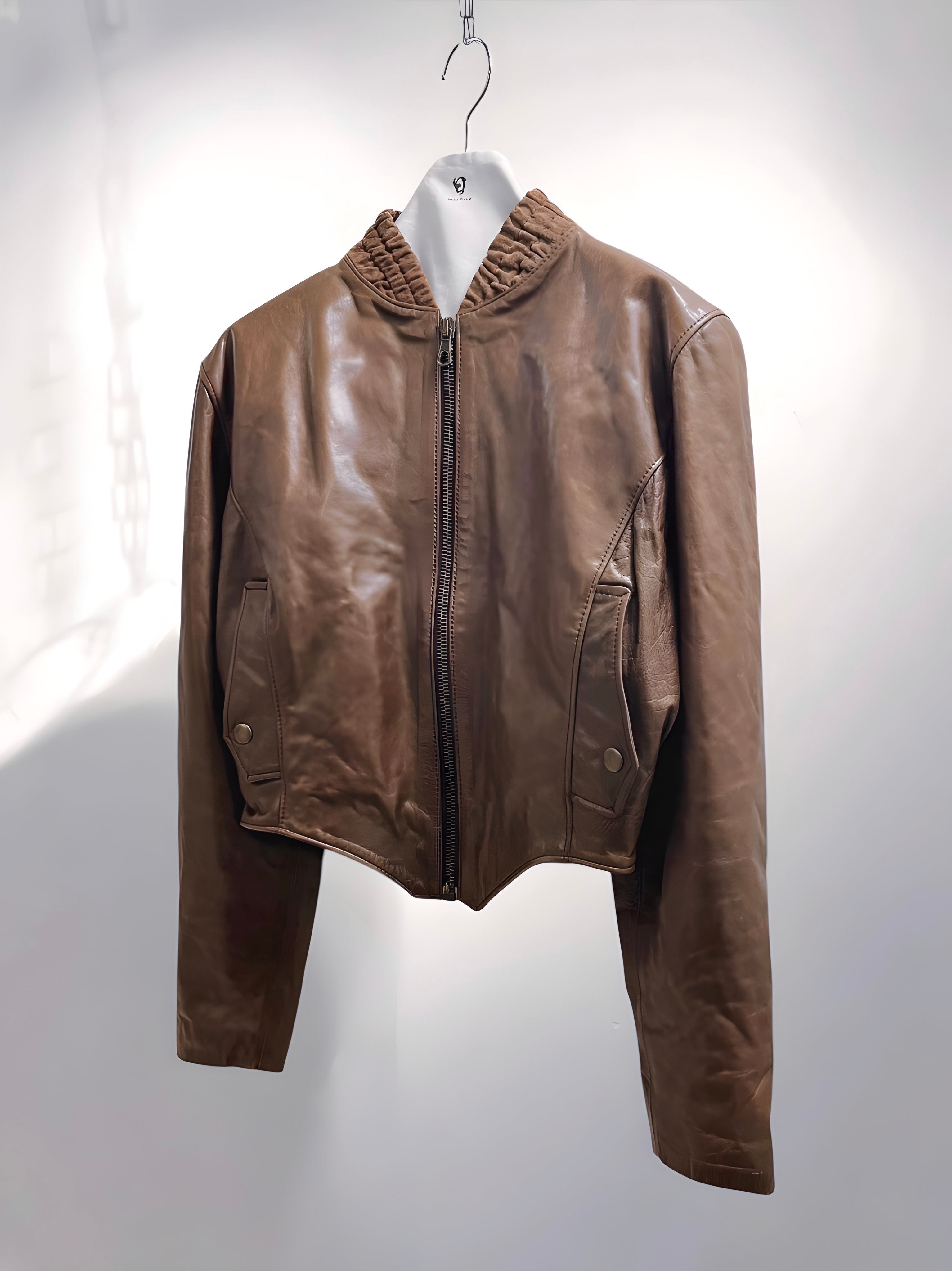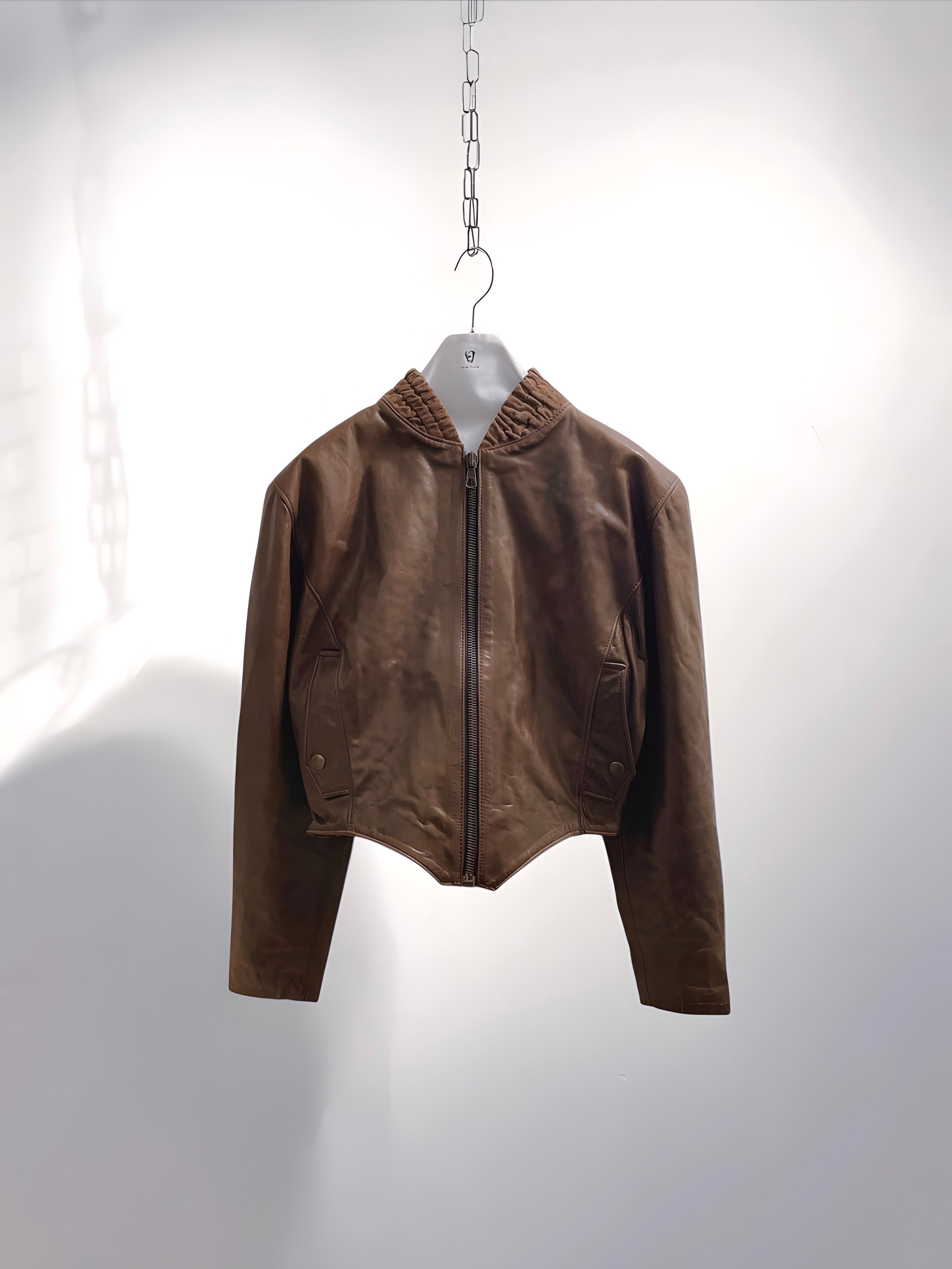 Vintage Brown Bomber Leather Jacket with Ruched Collar and Sculpted Pointed Hem (80s) – Dramatic Silhouette