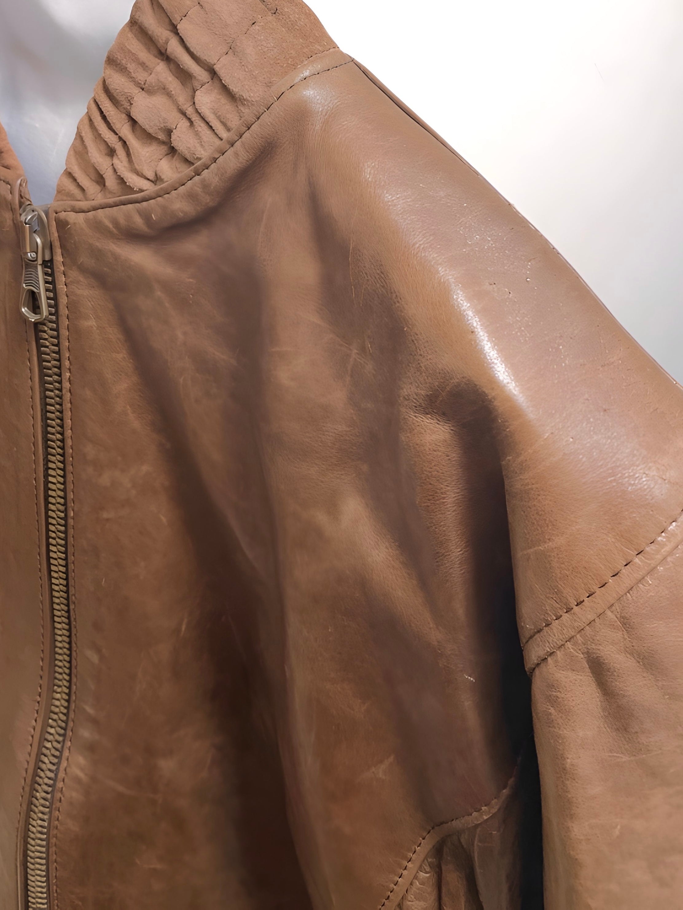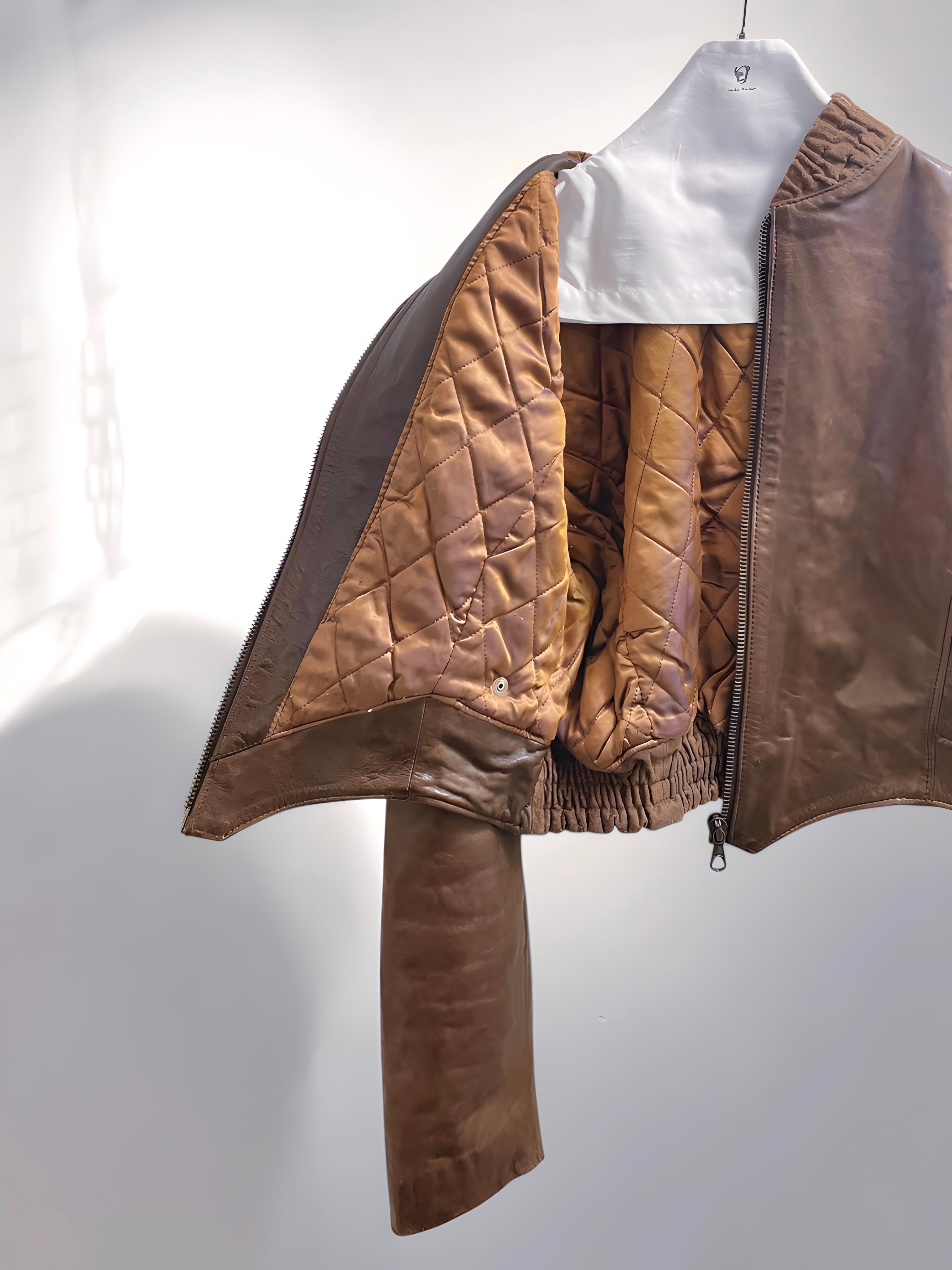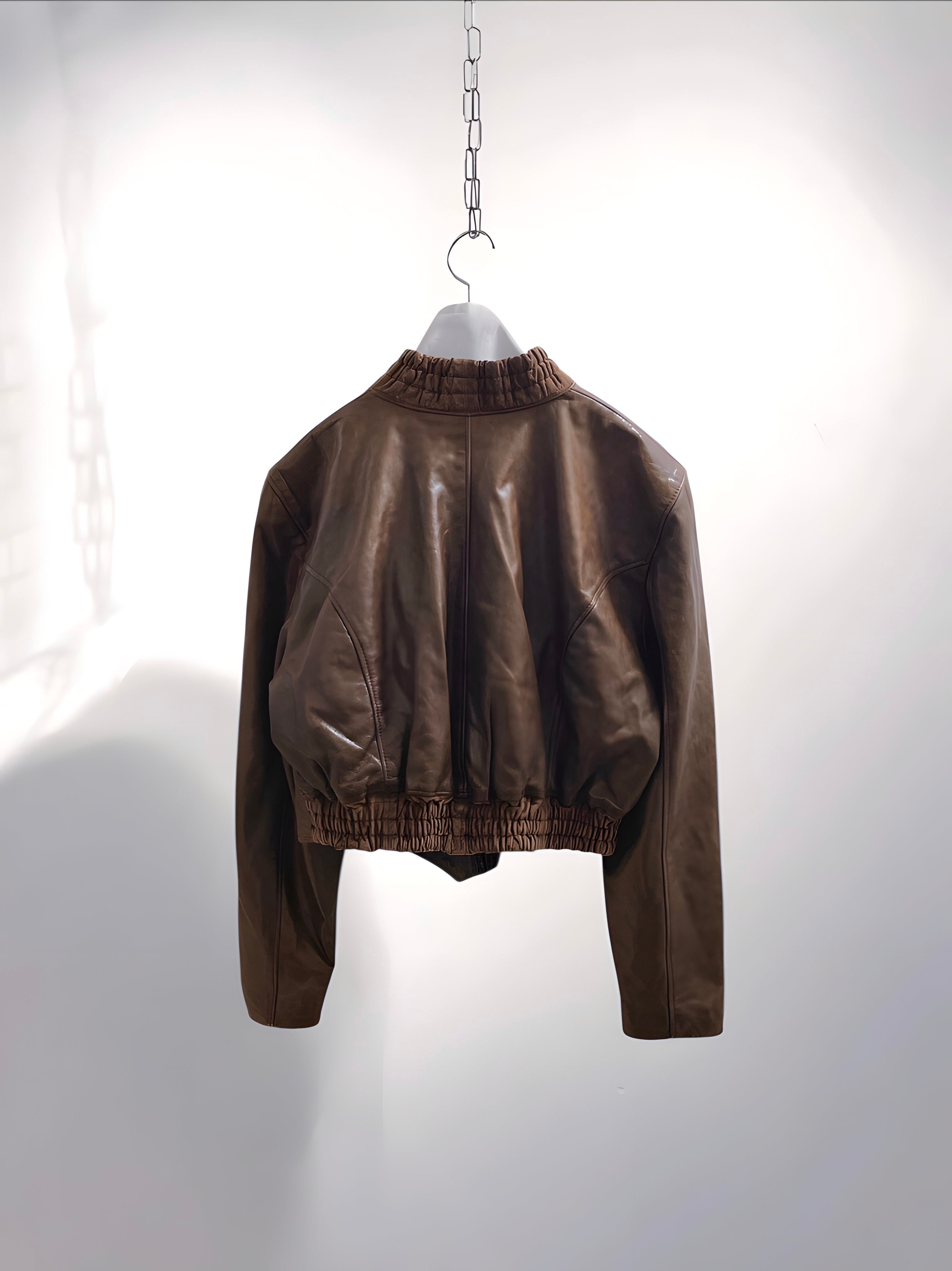 Vintage Brown Bomber Leather Jacket with Ruched Collar and Sculpted Pointed Hem (80s) – Dramatic Silhouette