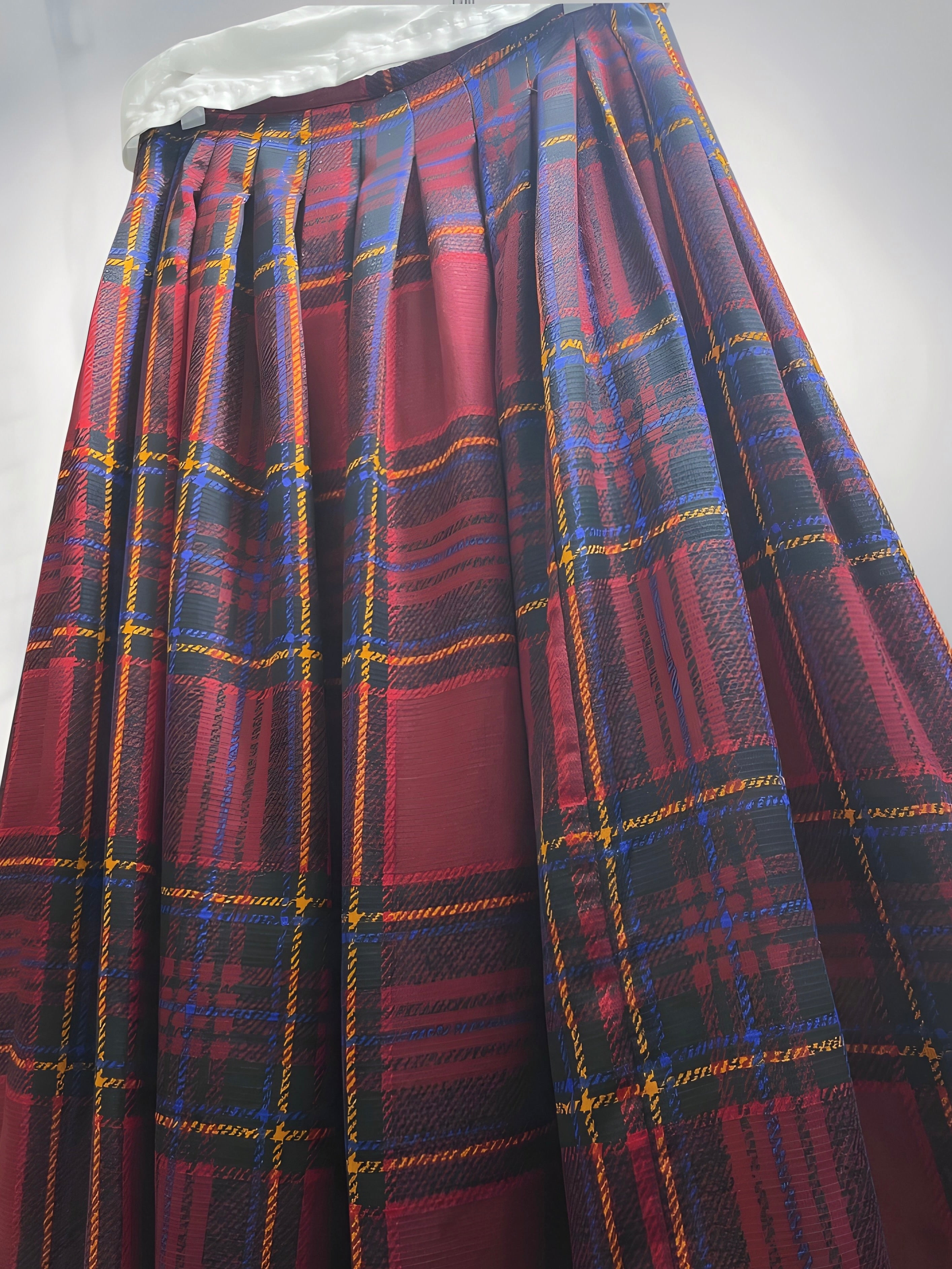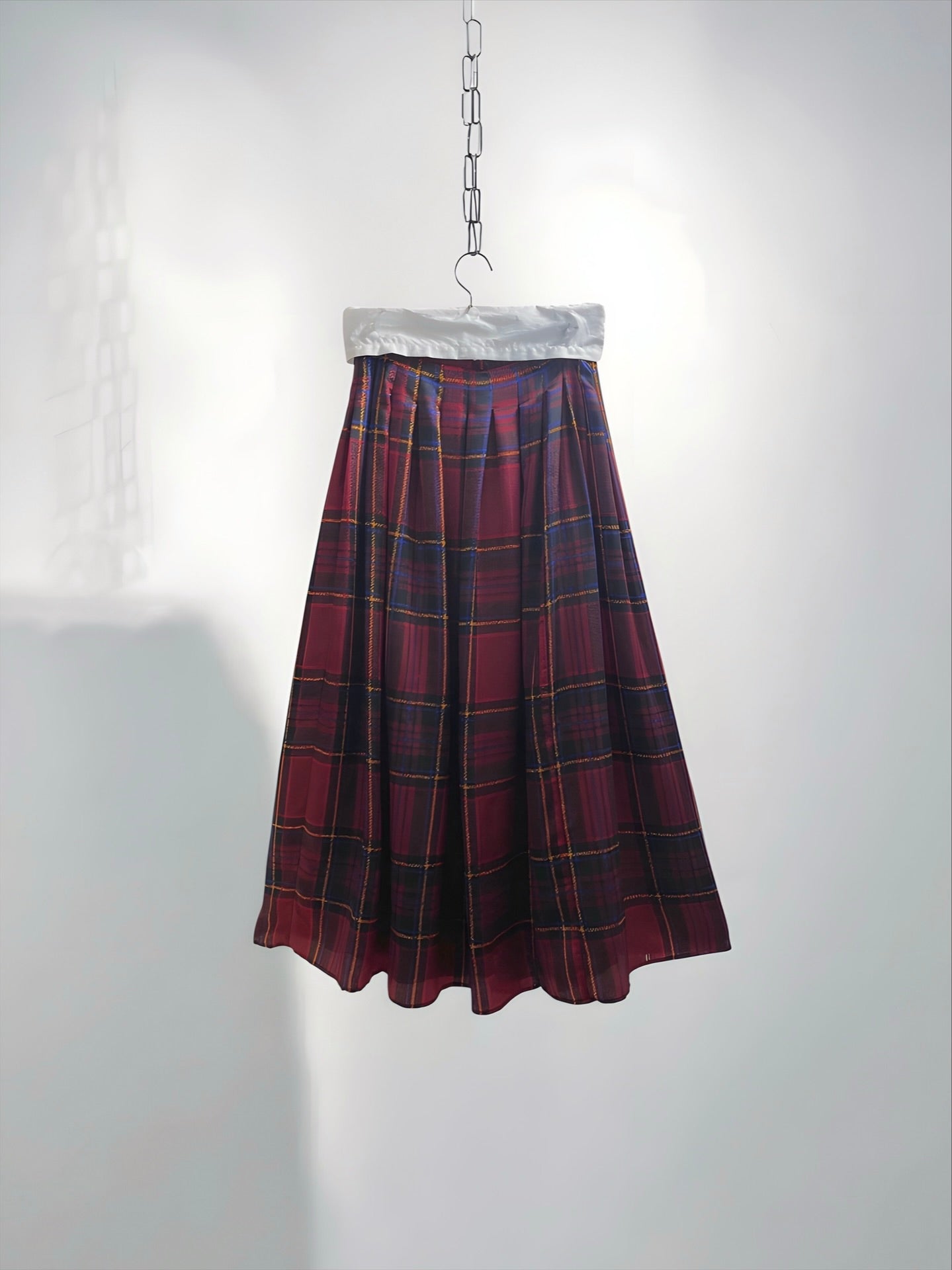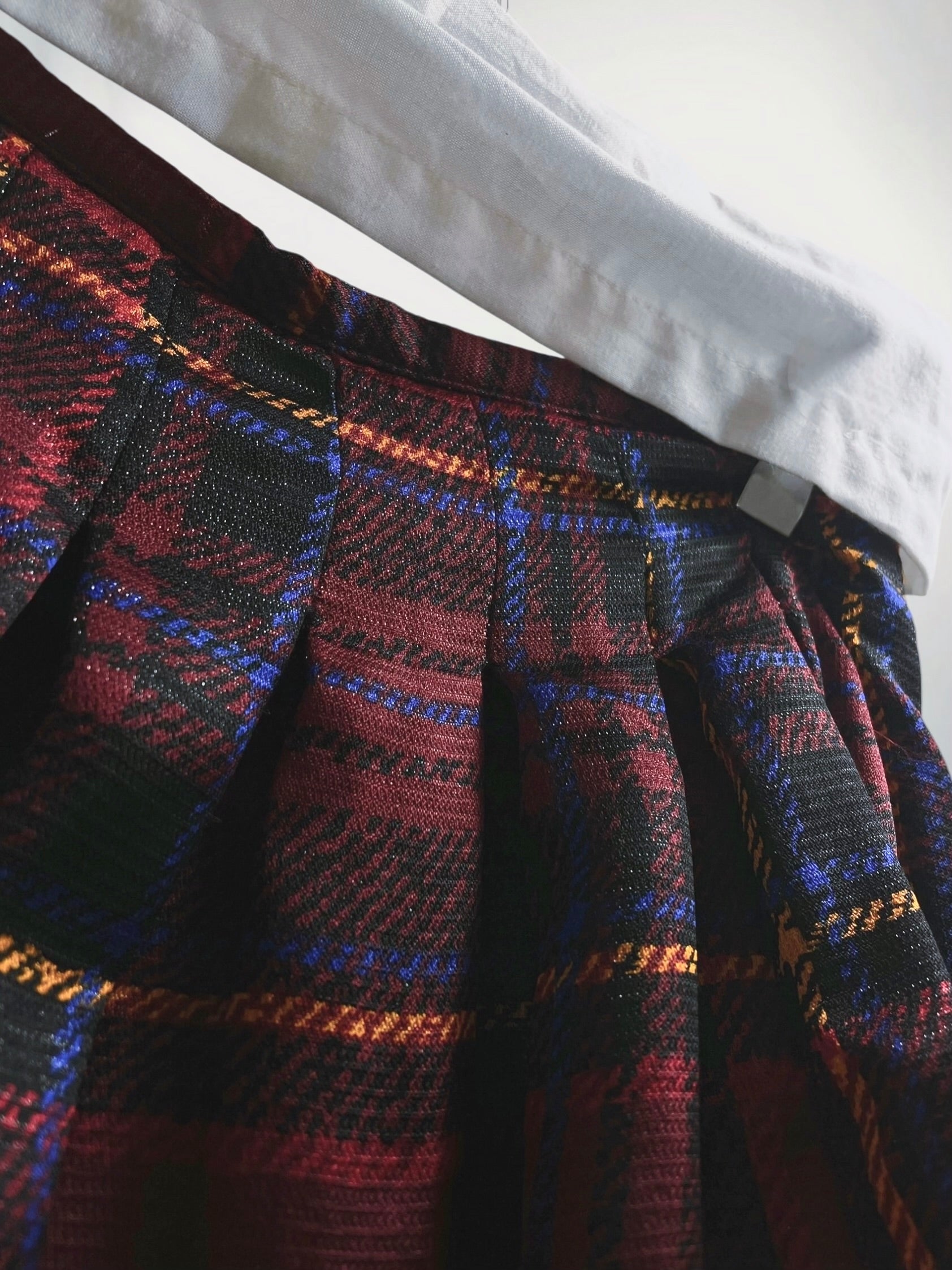 Vintage Burgundy Nylon Blend Glitter Tartan Pleated Skirt with Volume (1990s–Early 2000s)