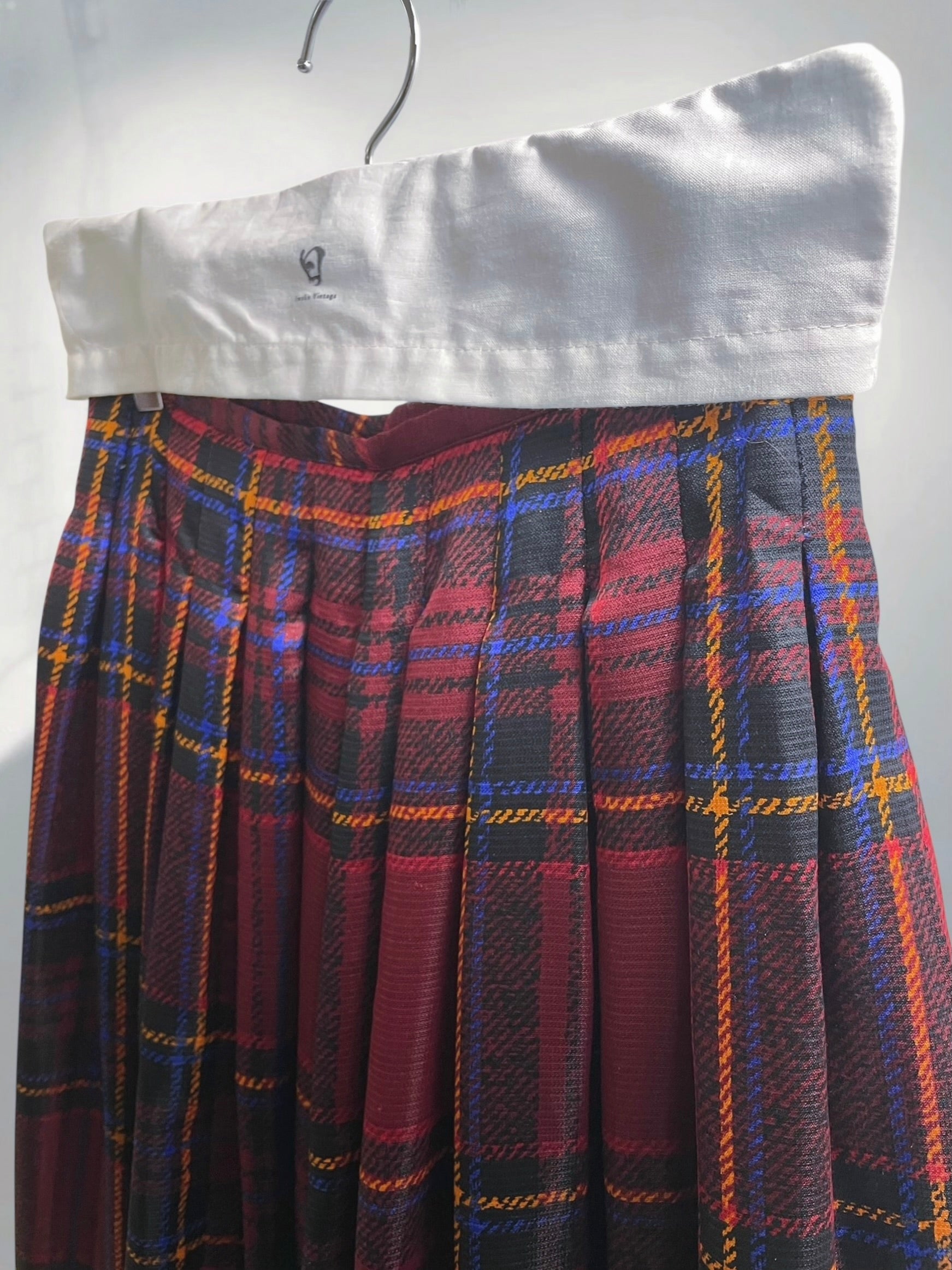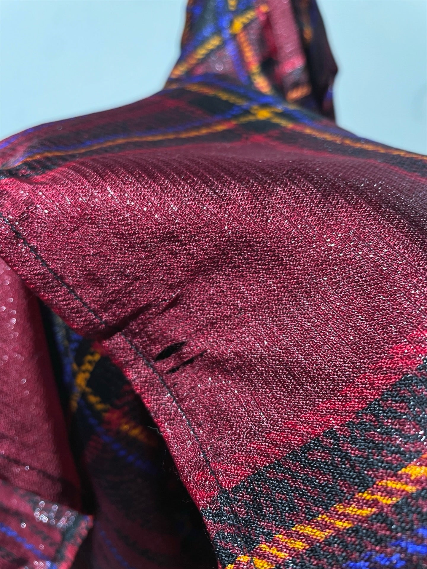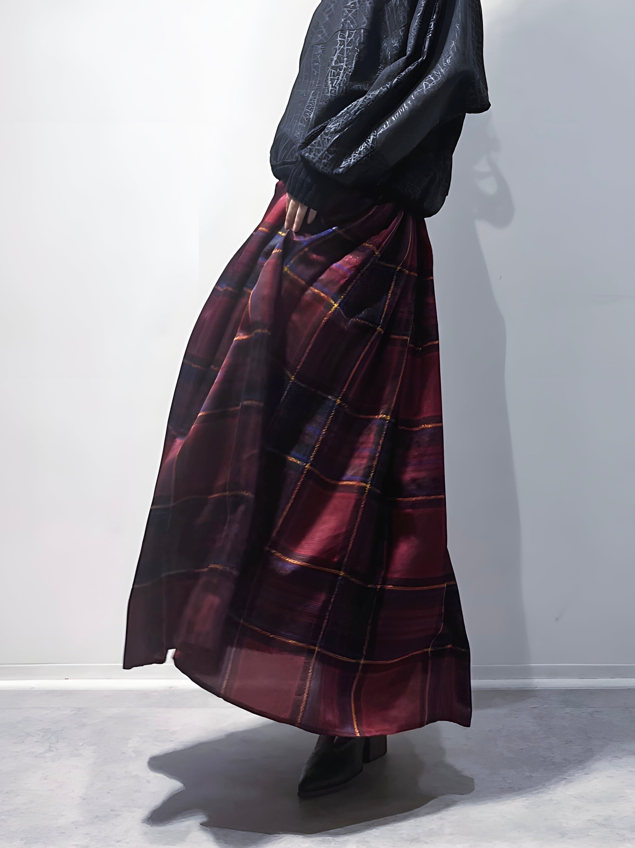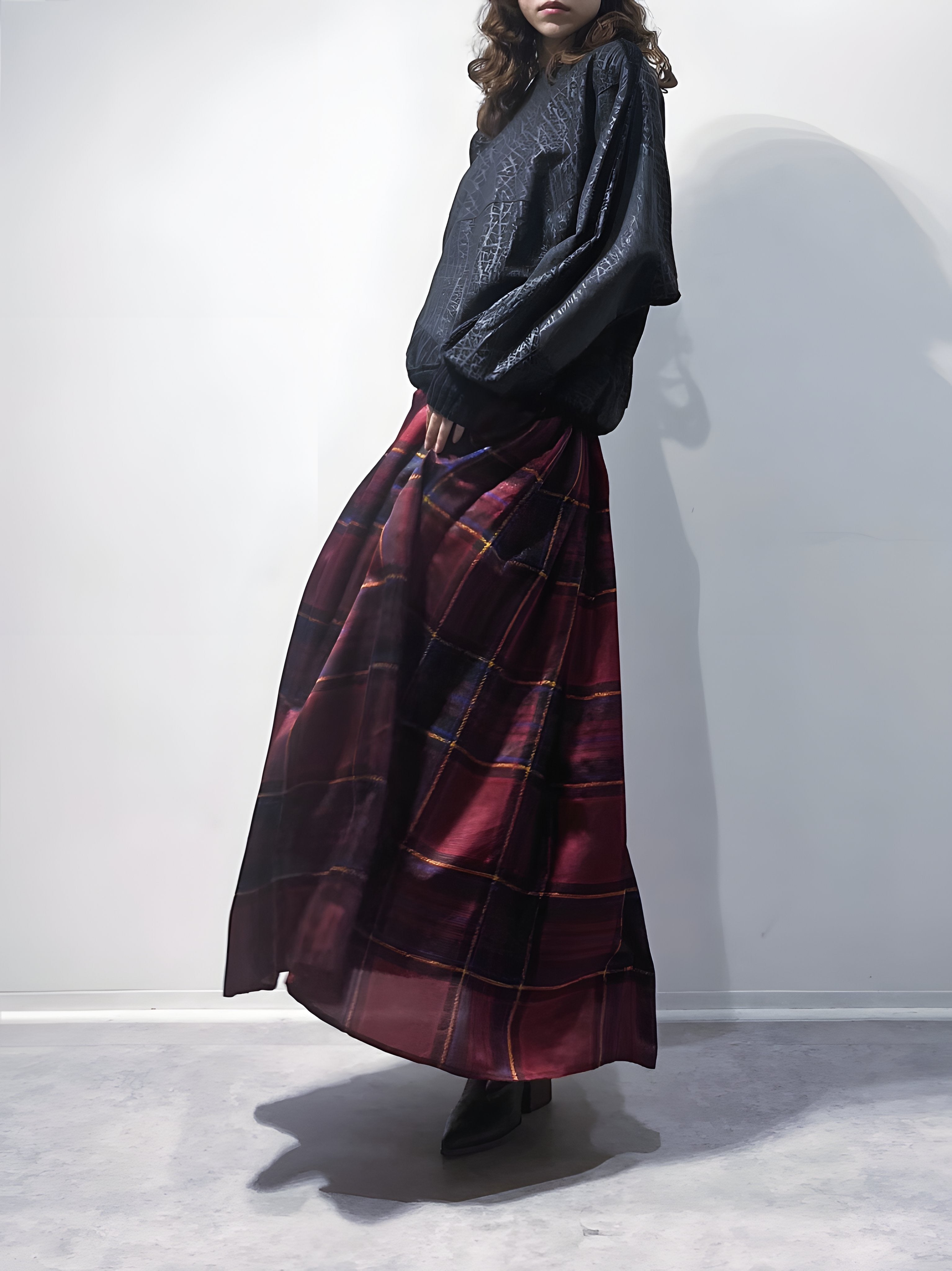 Vintage Burgundy Nylon Blend Glitter Tartan Pleated Skirt with Volume (1990s–Early 2000s)