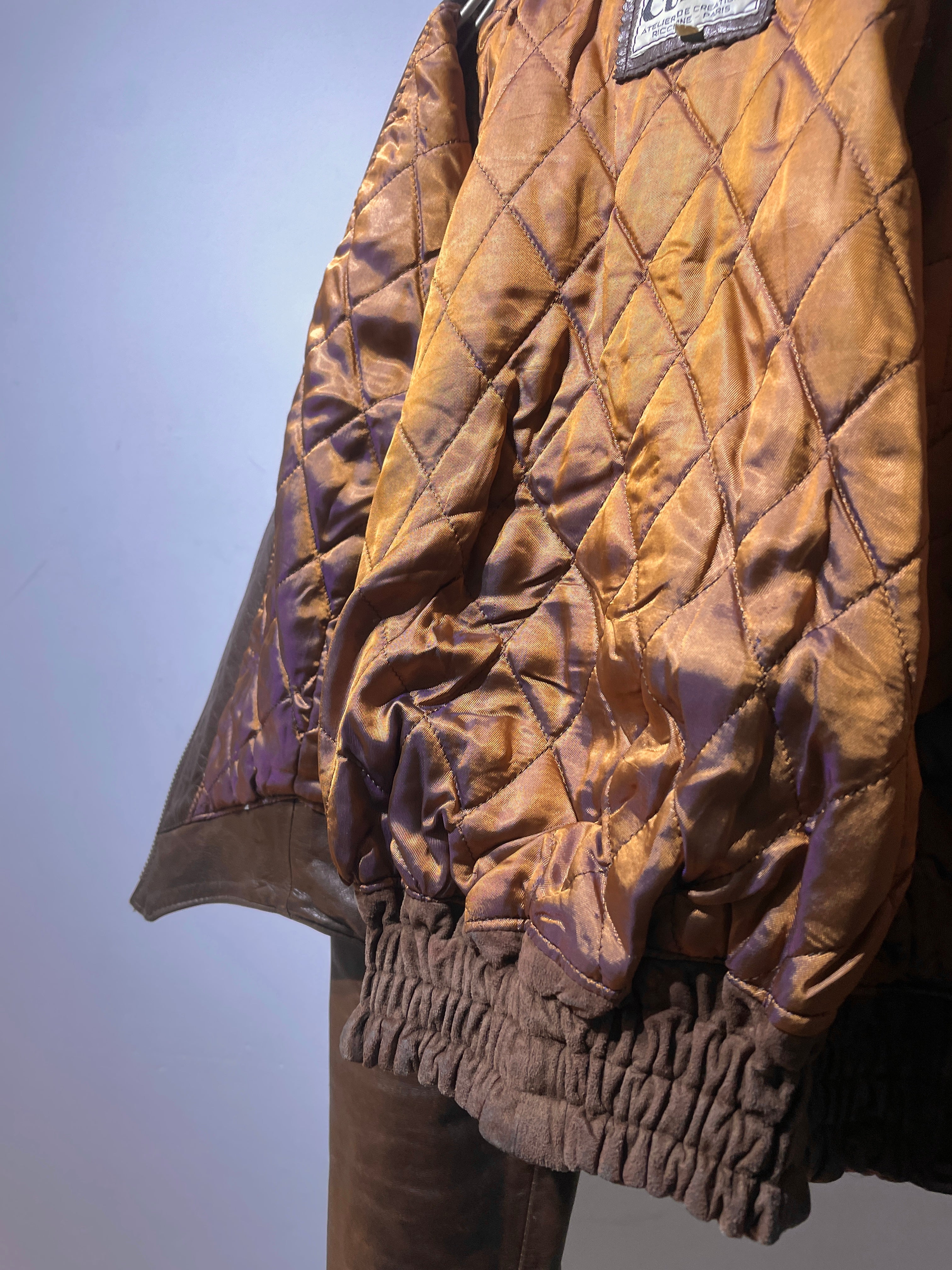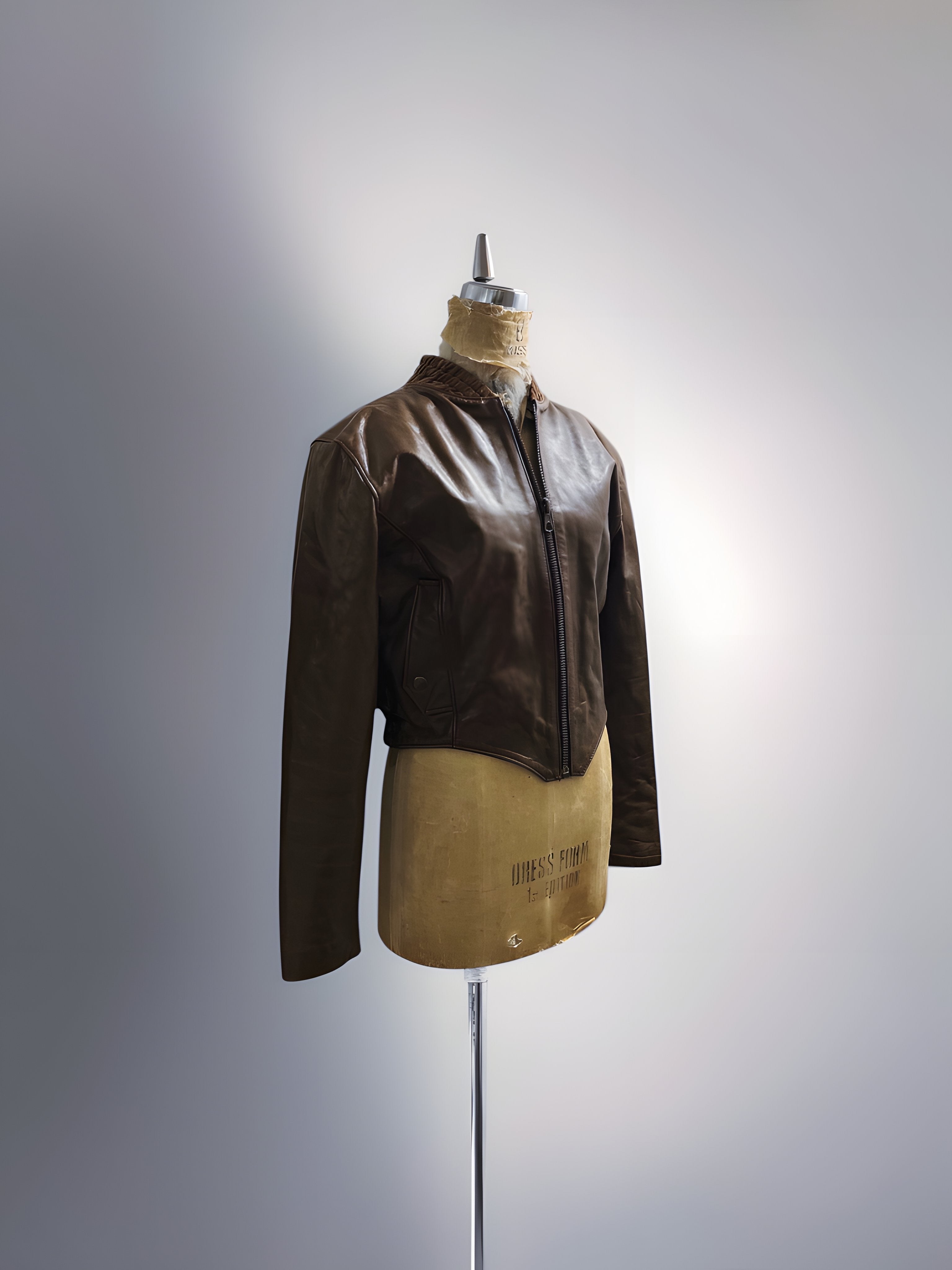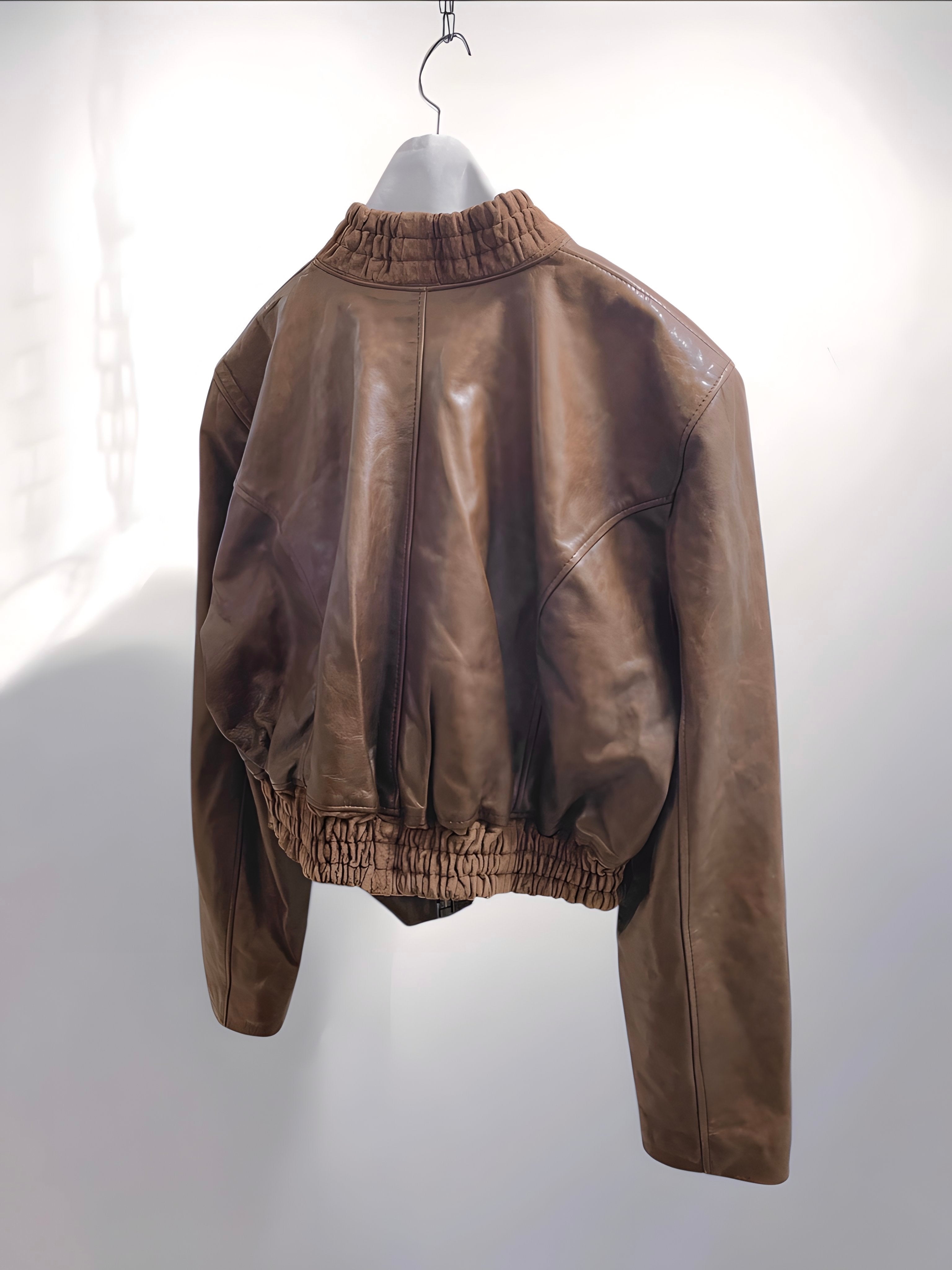 Vintage Brown Bomber Leather Jacket with Ruched Collar and Sculpted Pointed Hem (80s) – Dramatic Silhouette