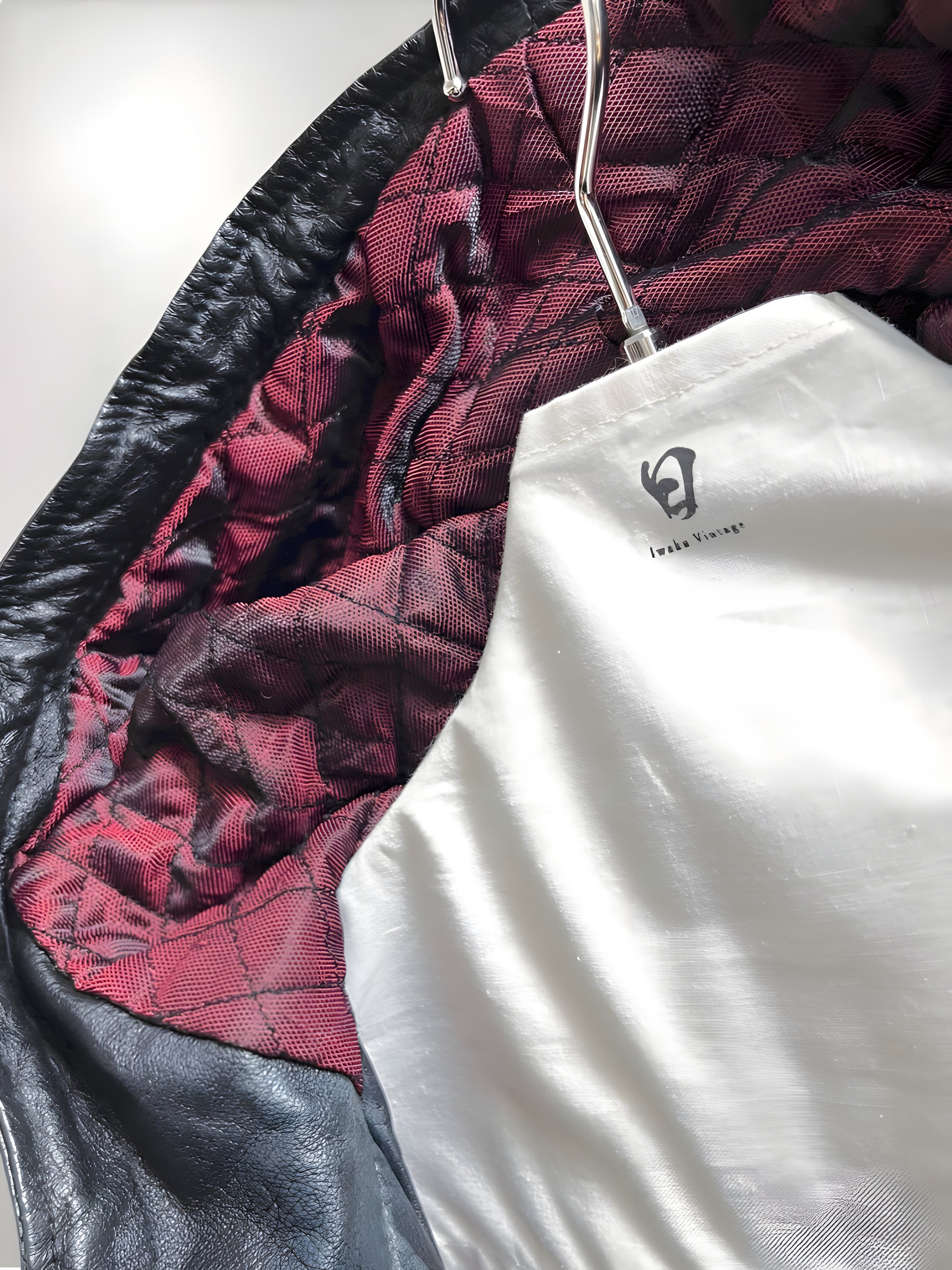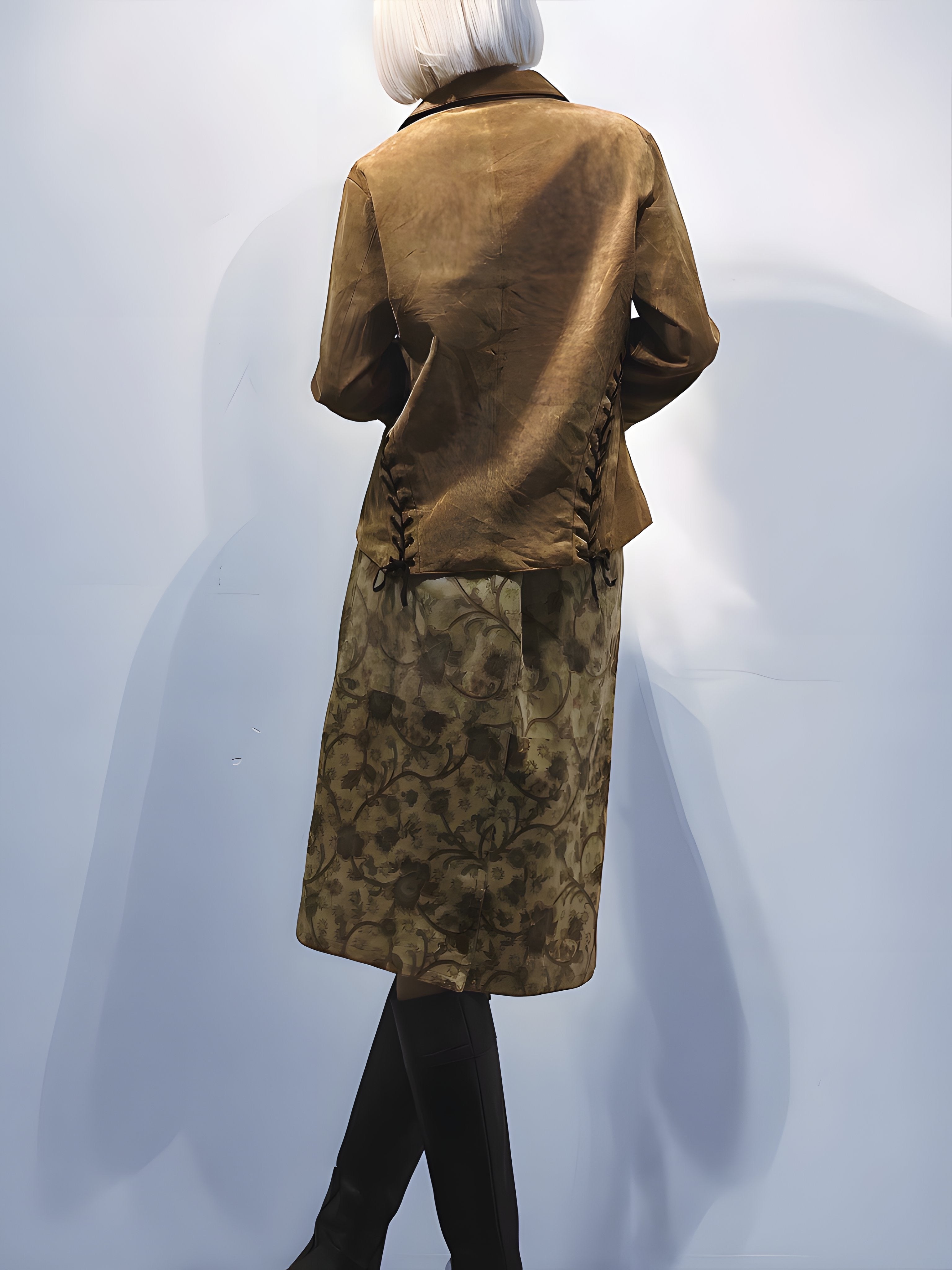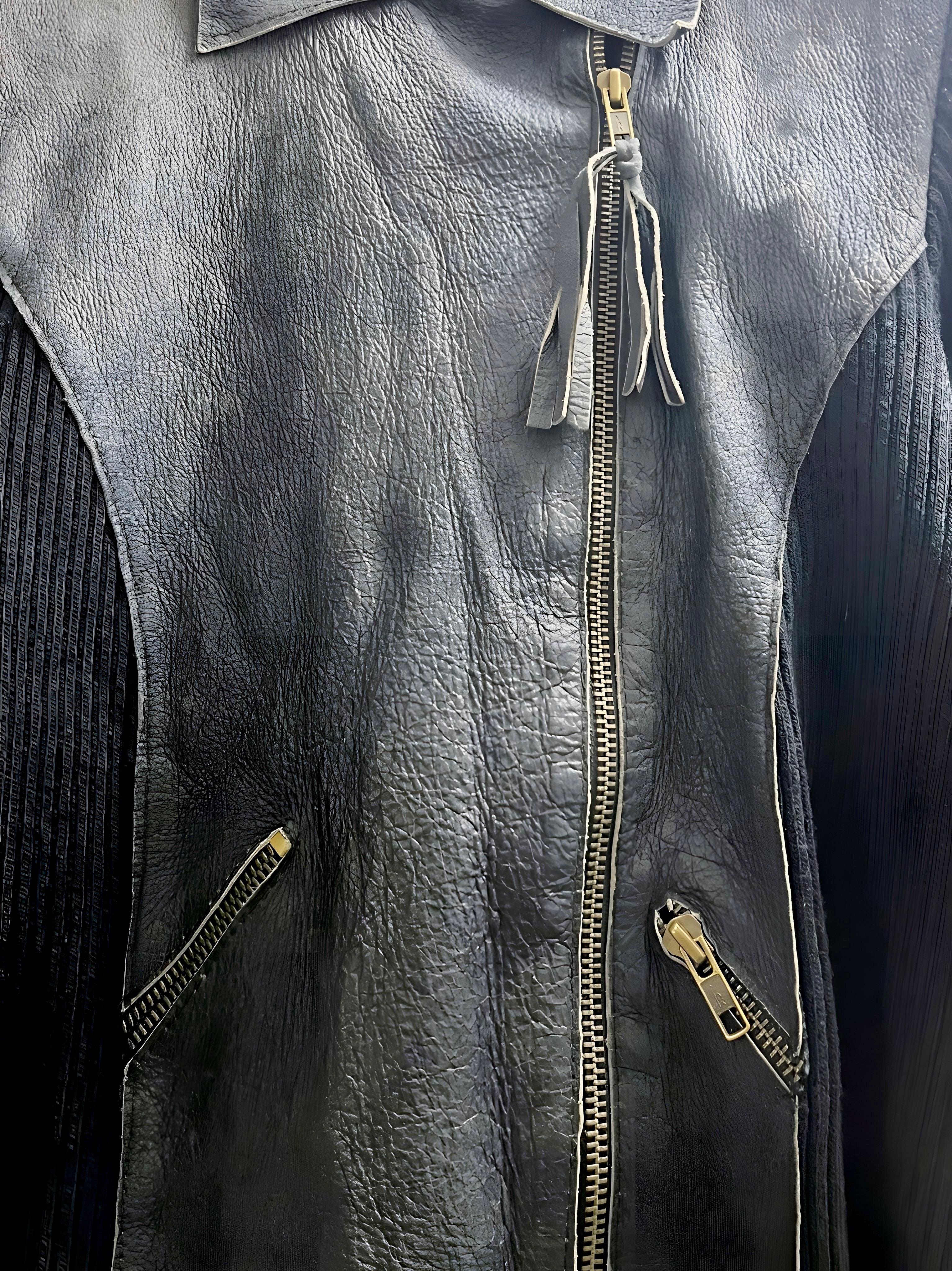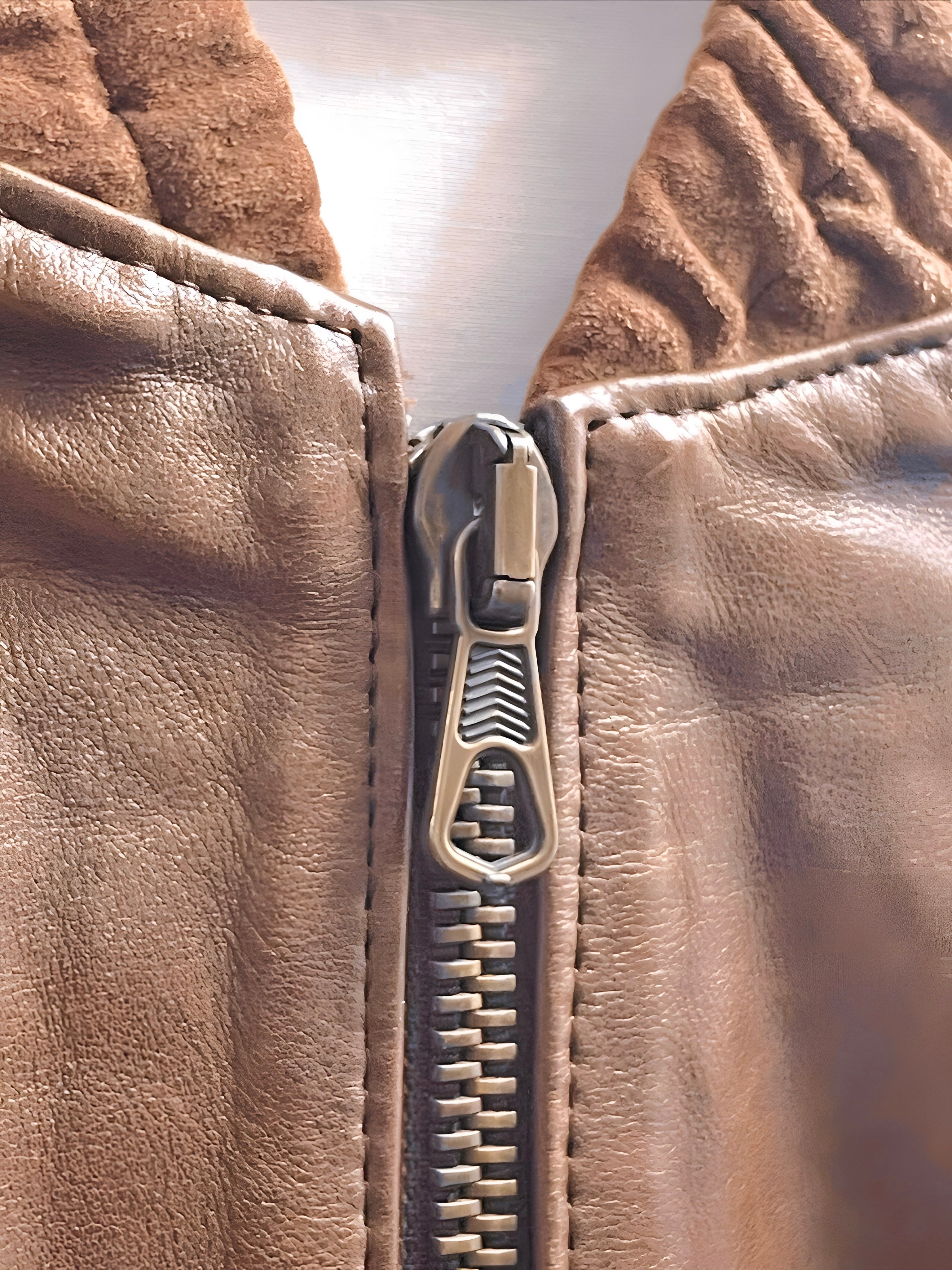 Vintage Brown Bomber Leather Jacket with Ruched Collar and Sculpted Pointed Hem (80s) – Dramatic Silhouette