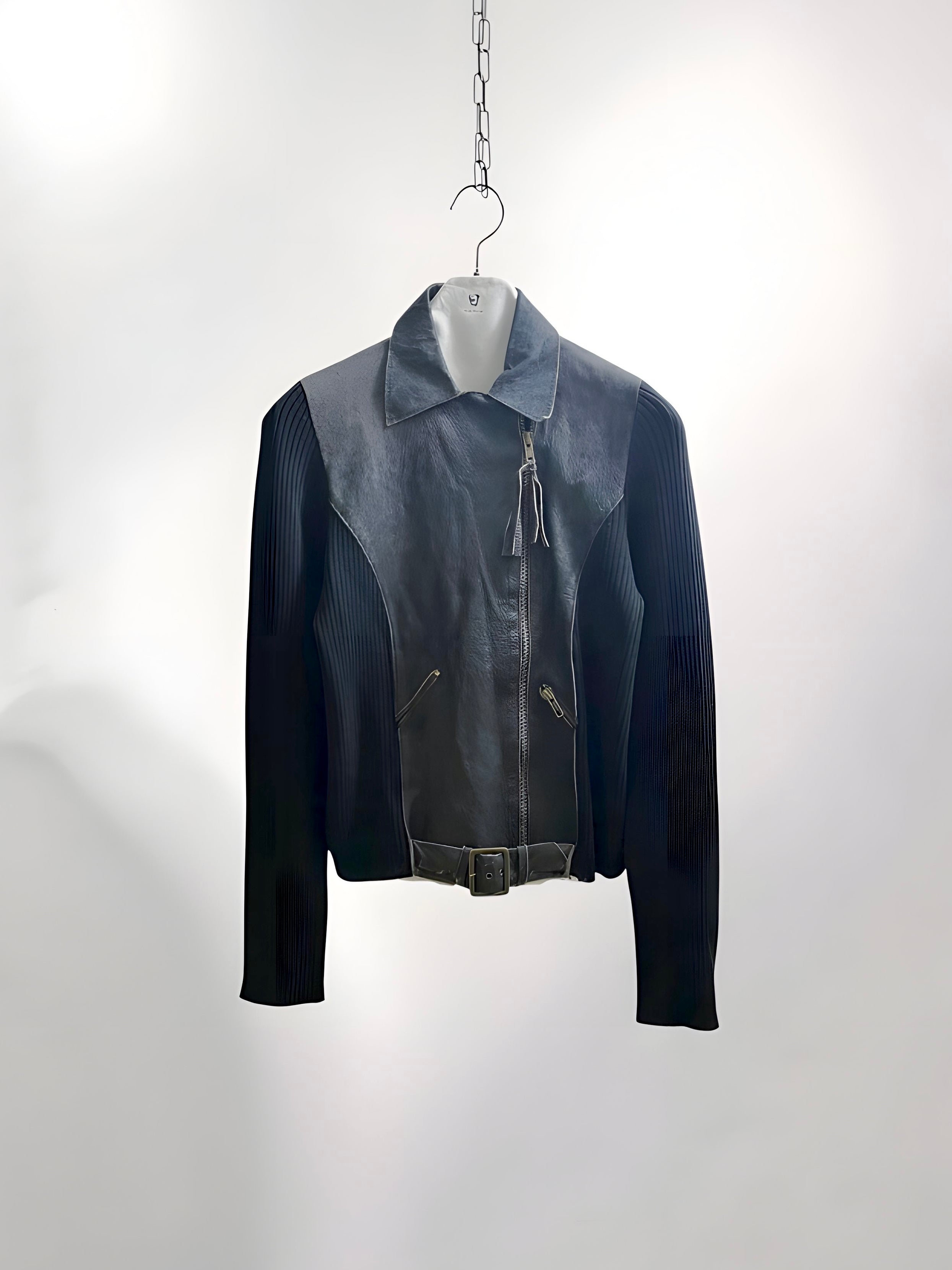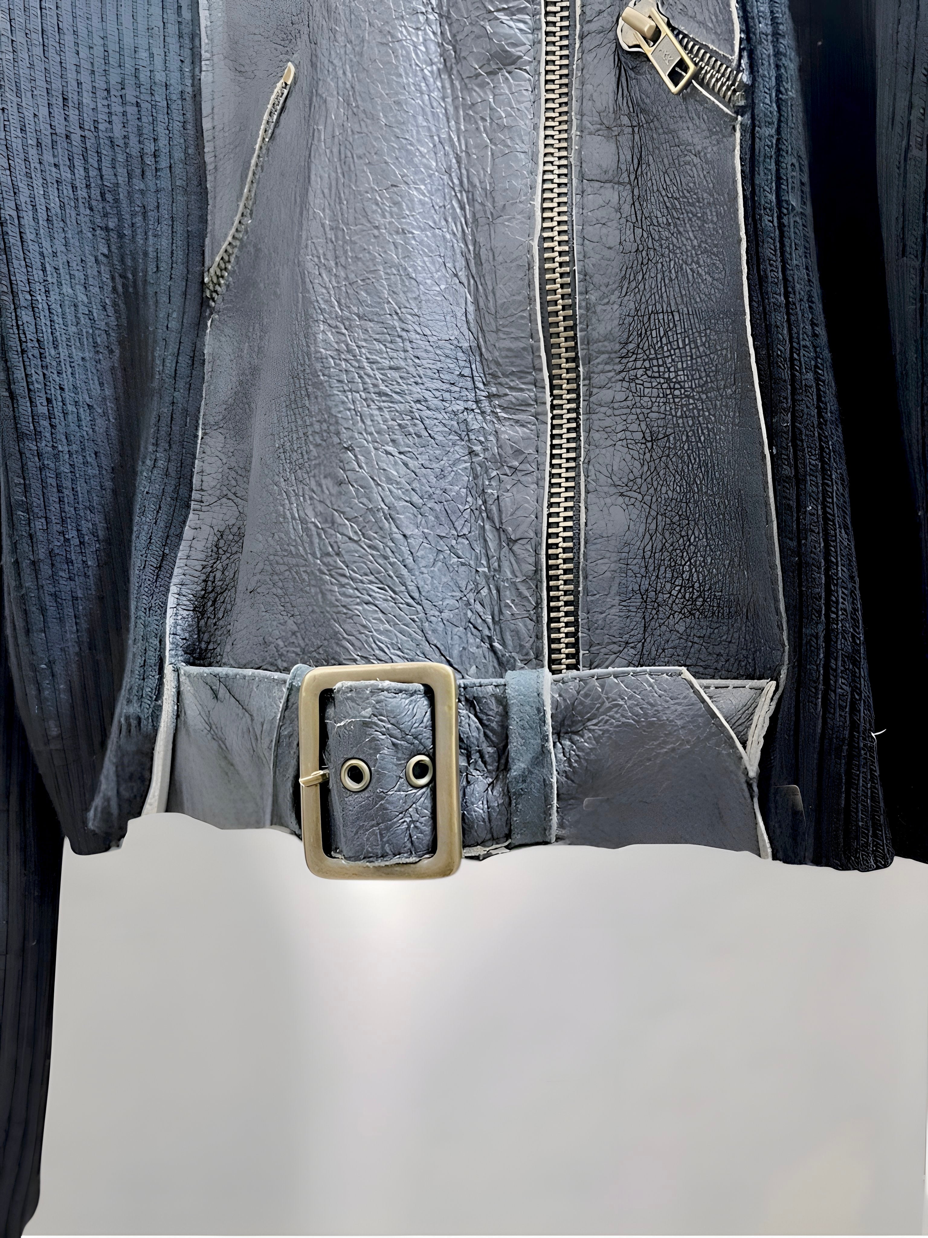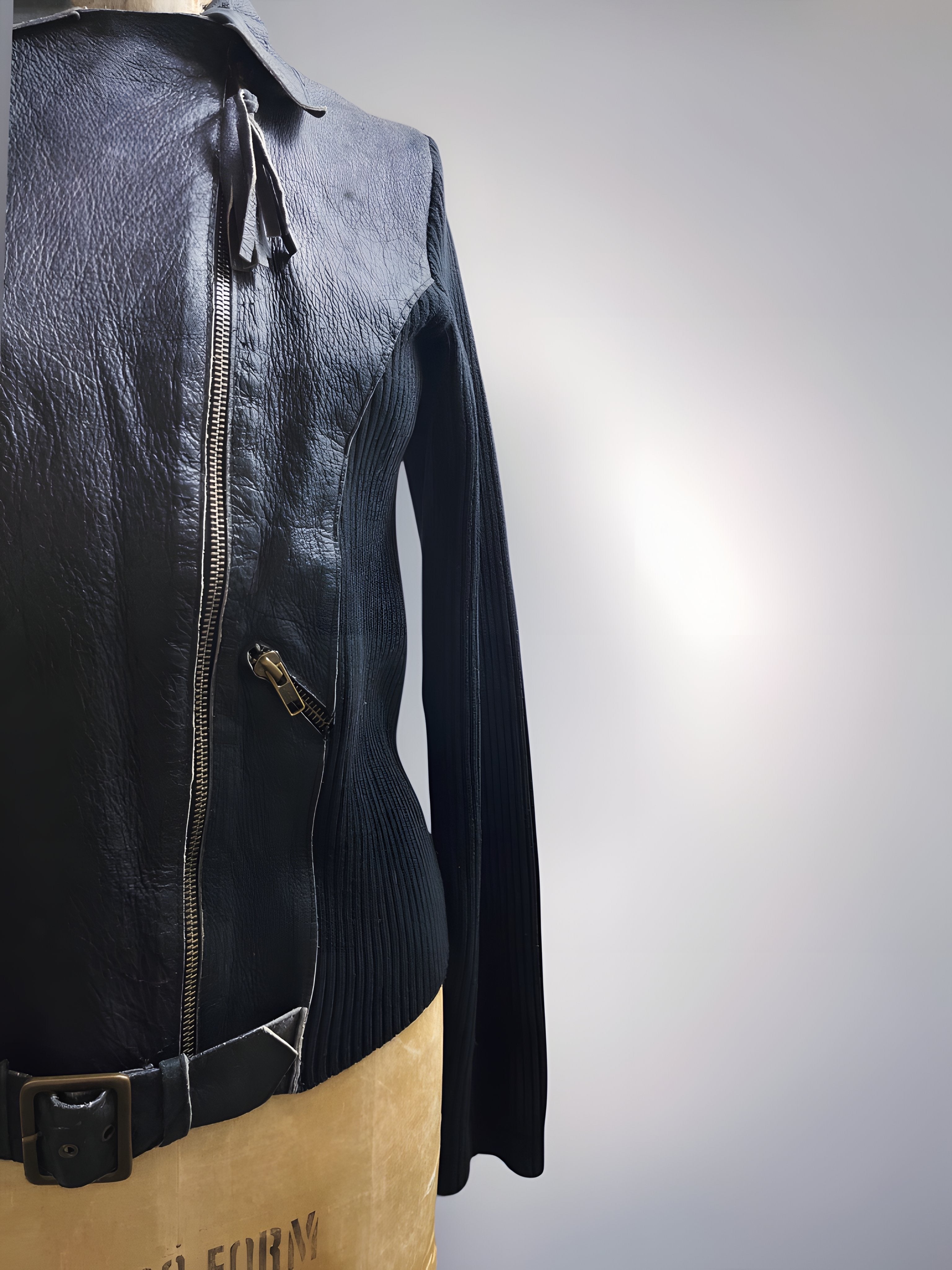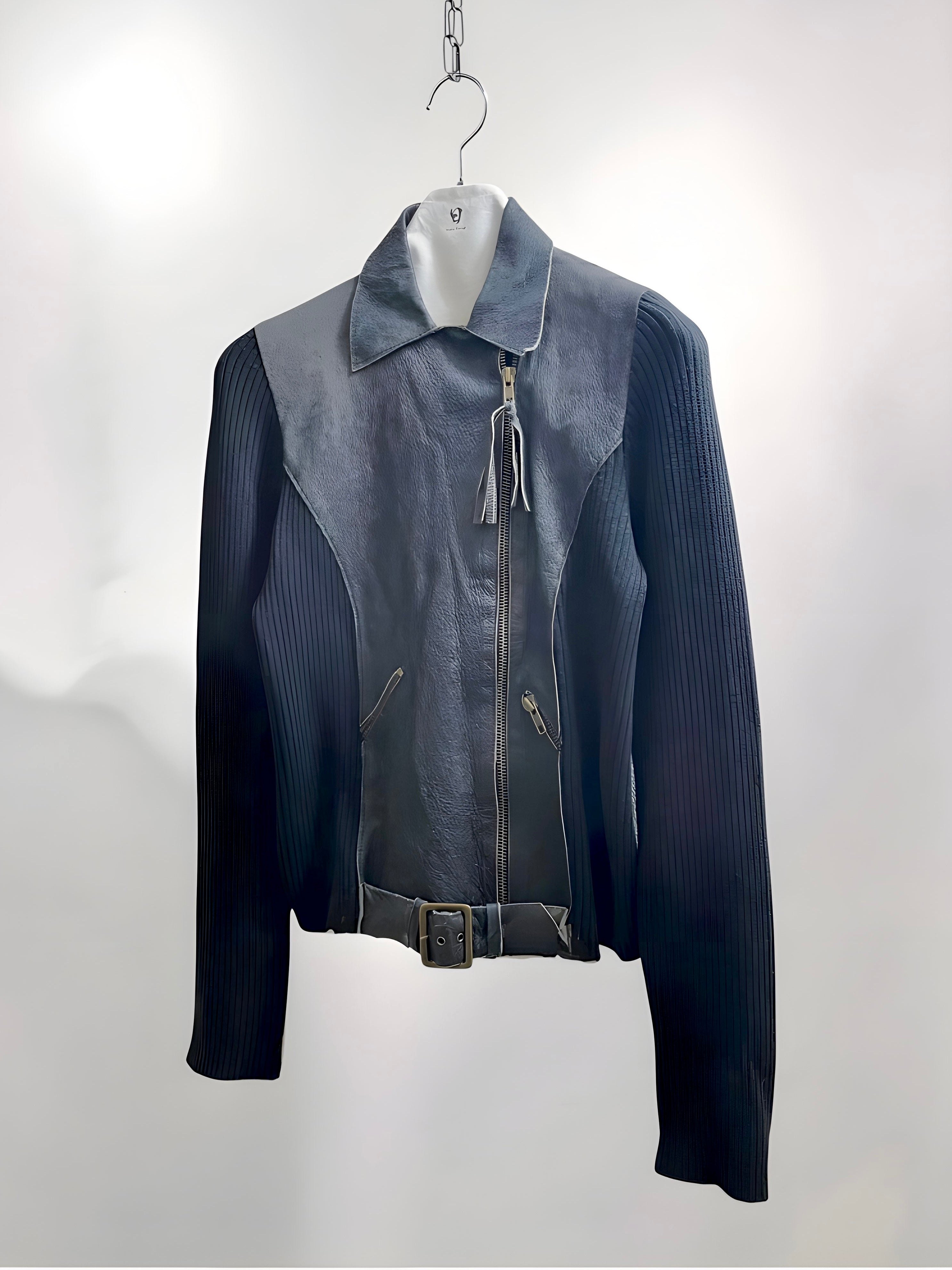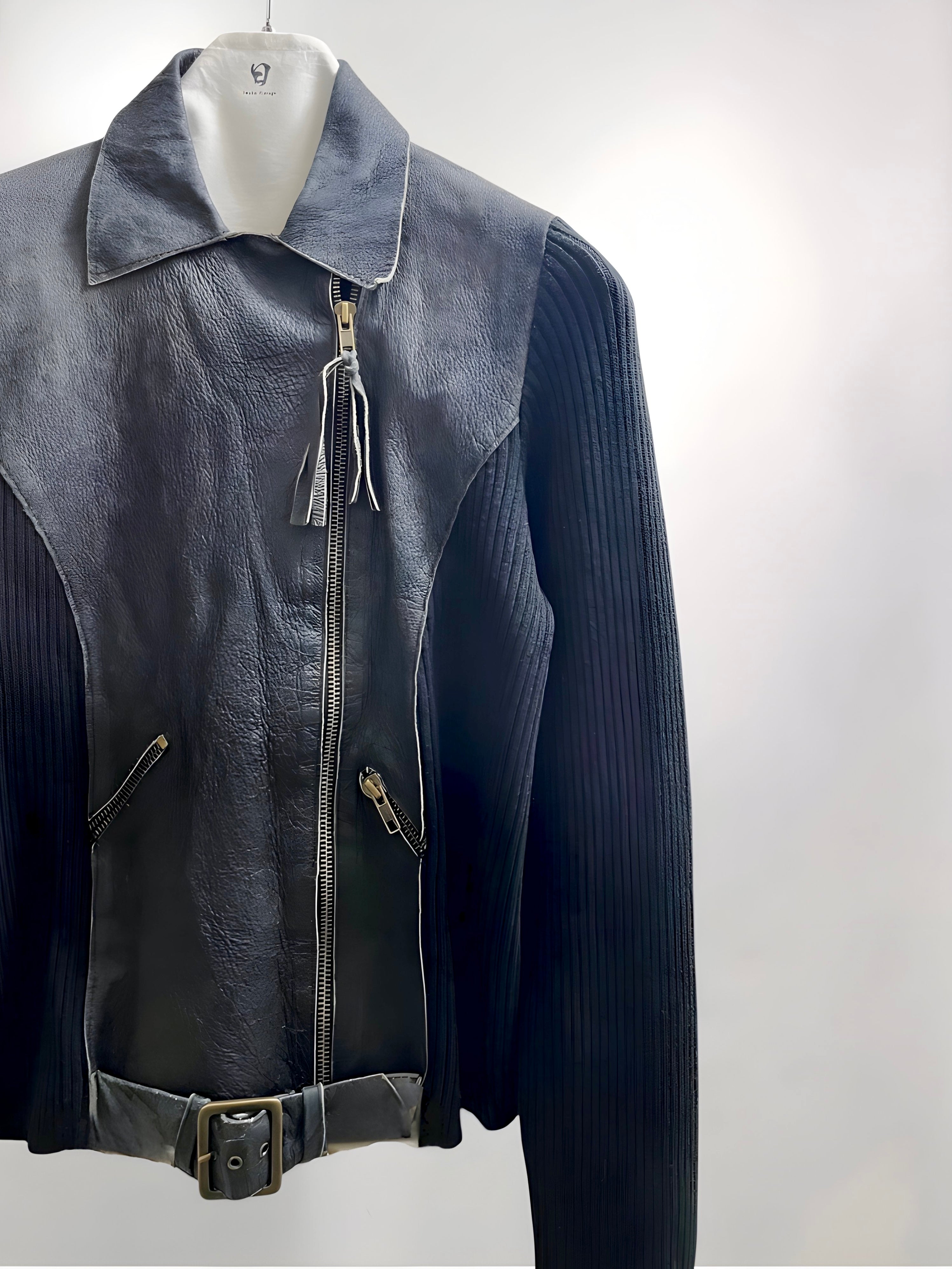 Charcoal Leather Jacket with Asymmetric Zip and Ribbed Sleeves (Late 90s–Early 2000s) – Belted Hem