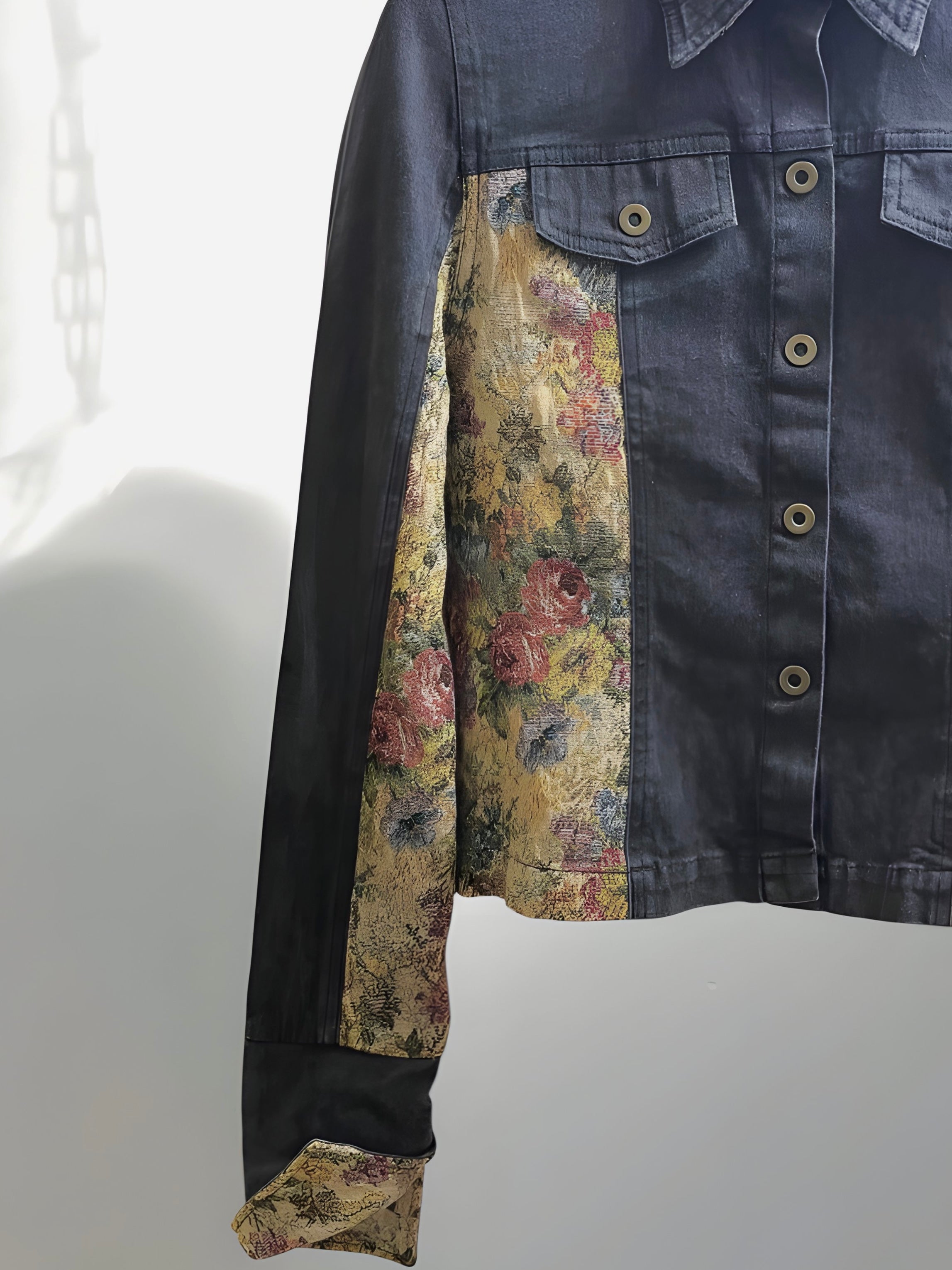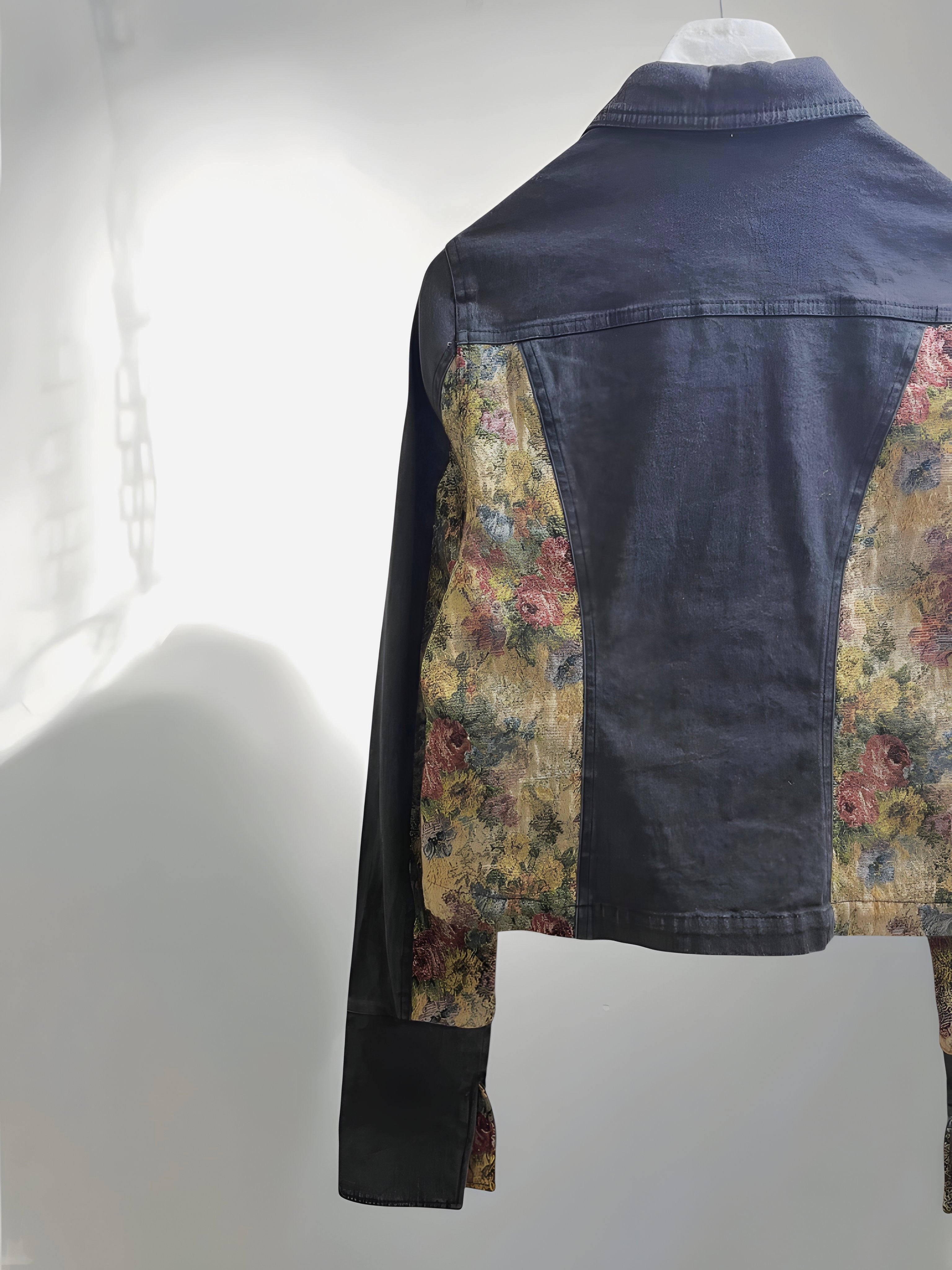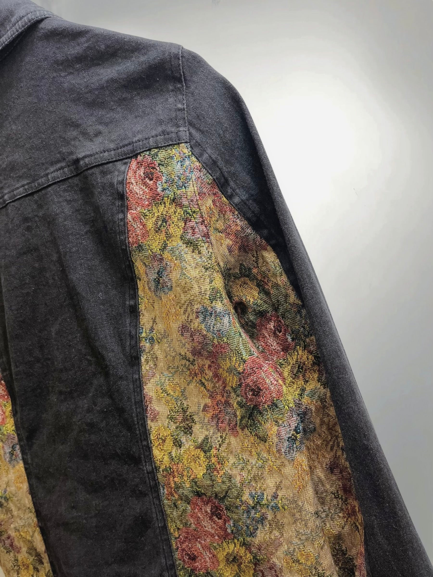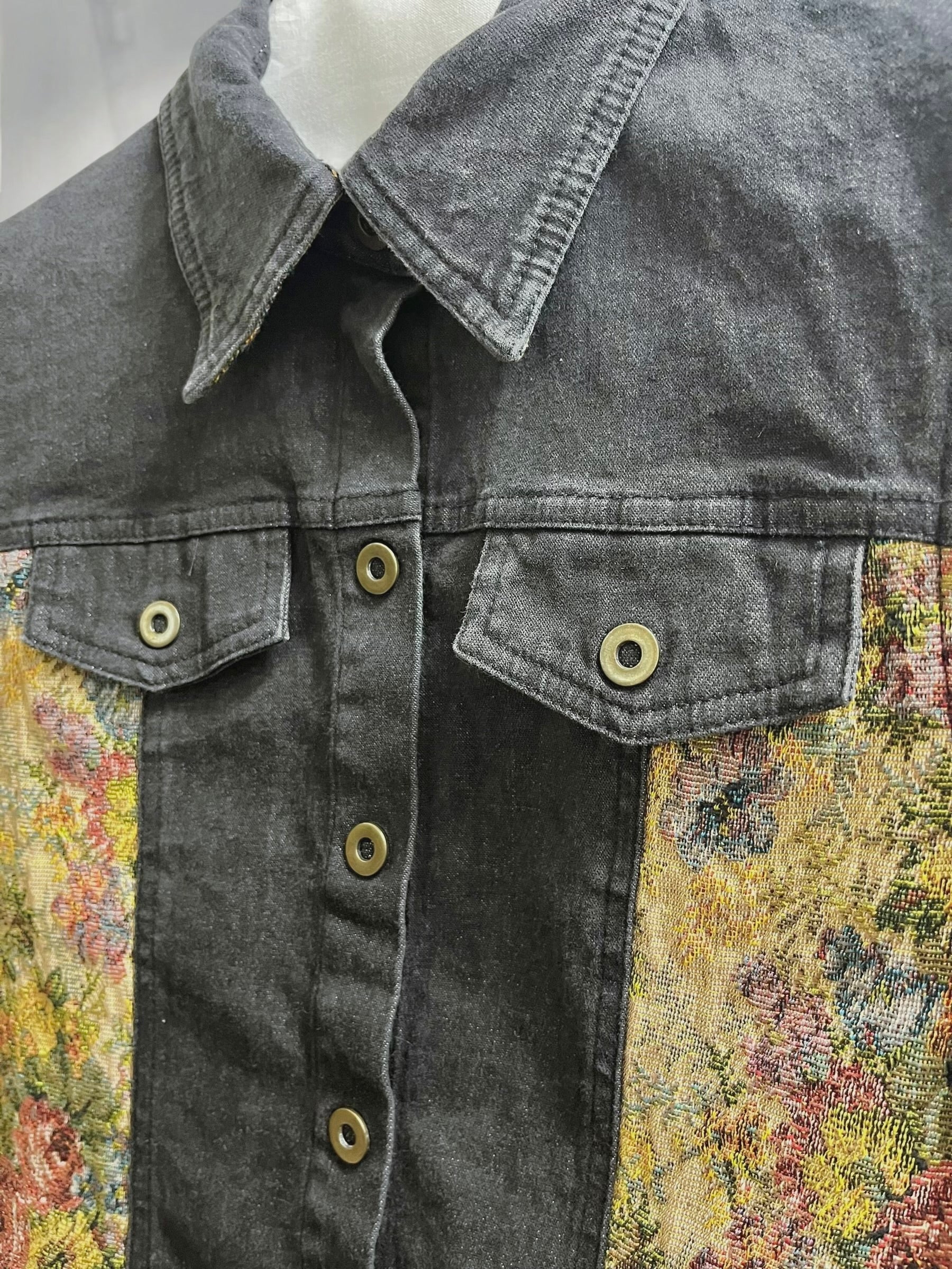 Black Denim Jacket with Tapestry Floral Panels (Late 90s–Early 2000s) – Statement Botanical Motif