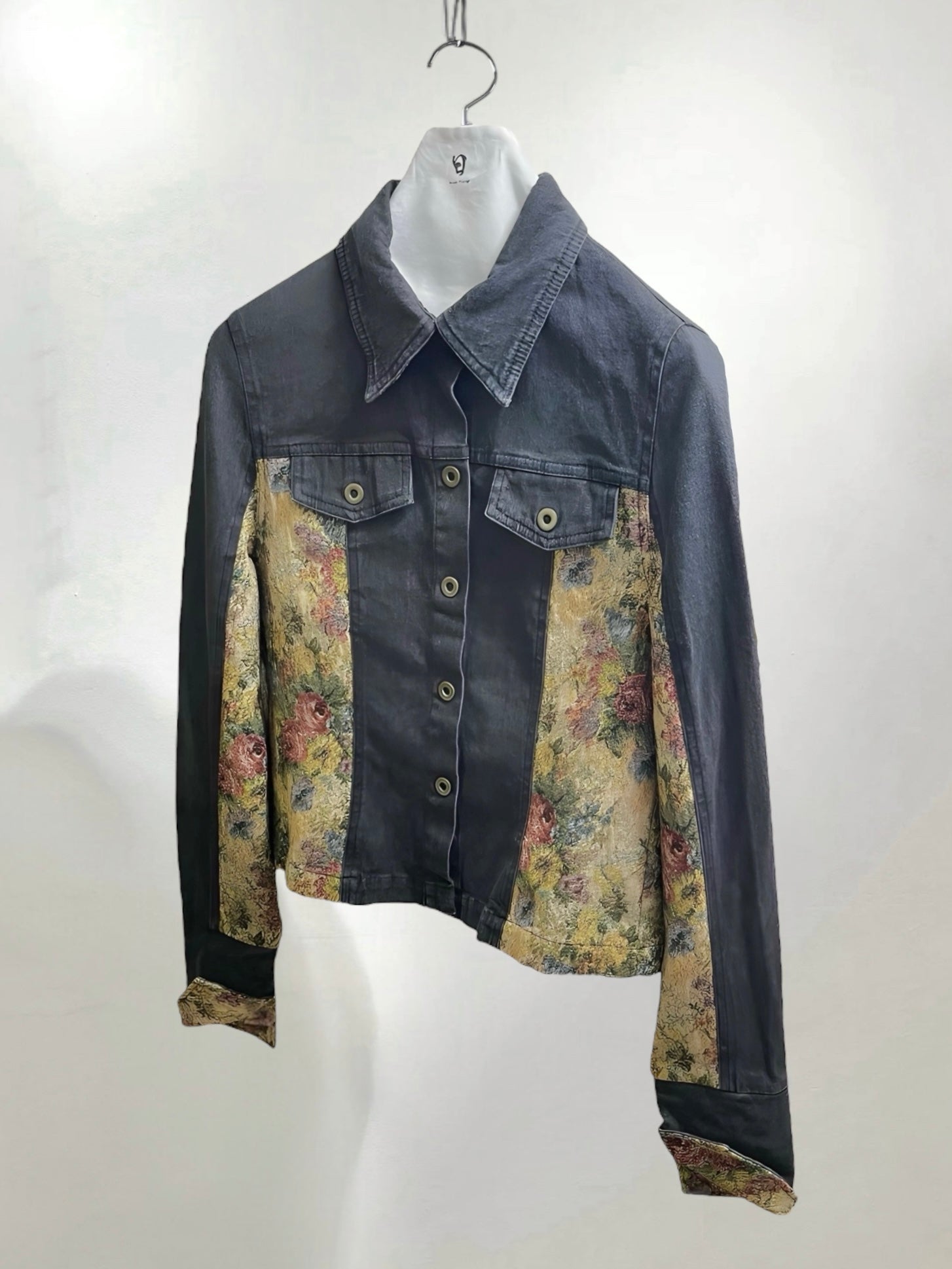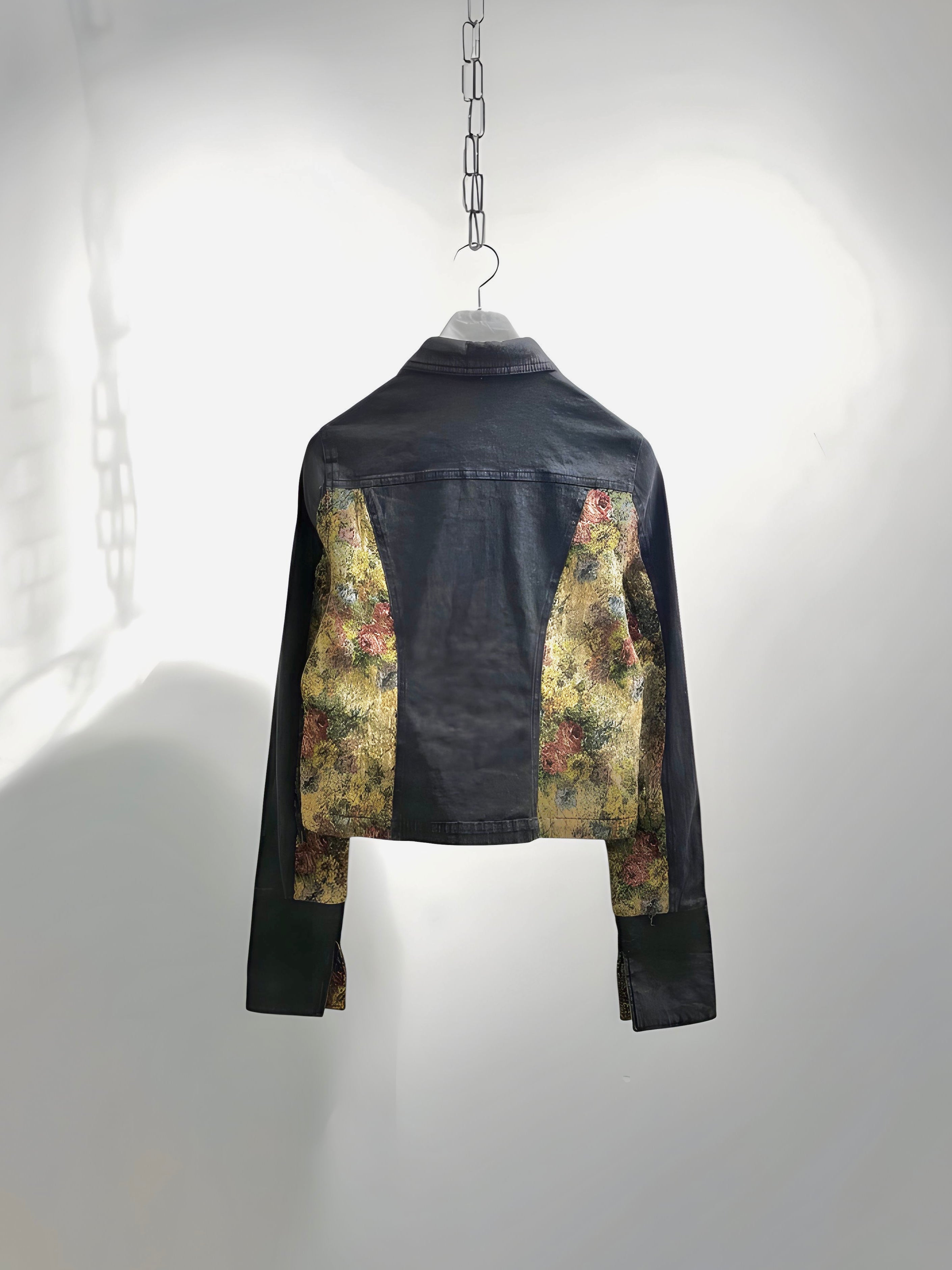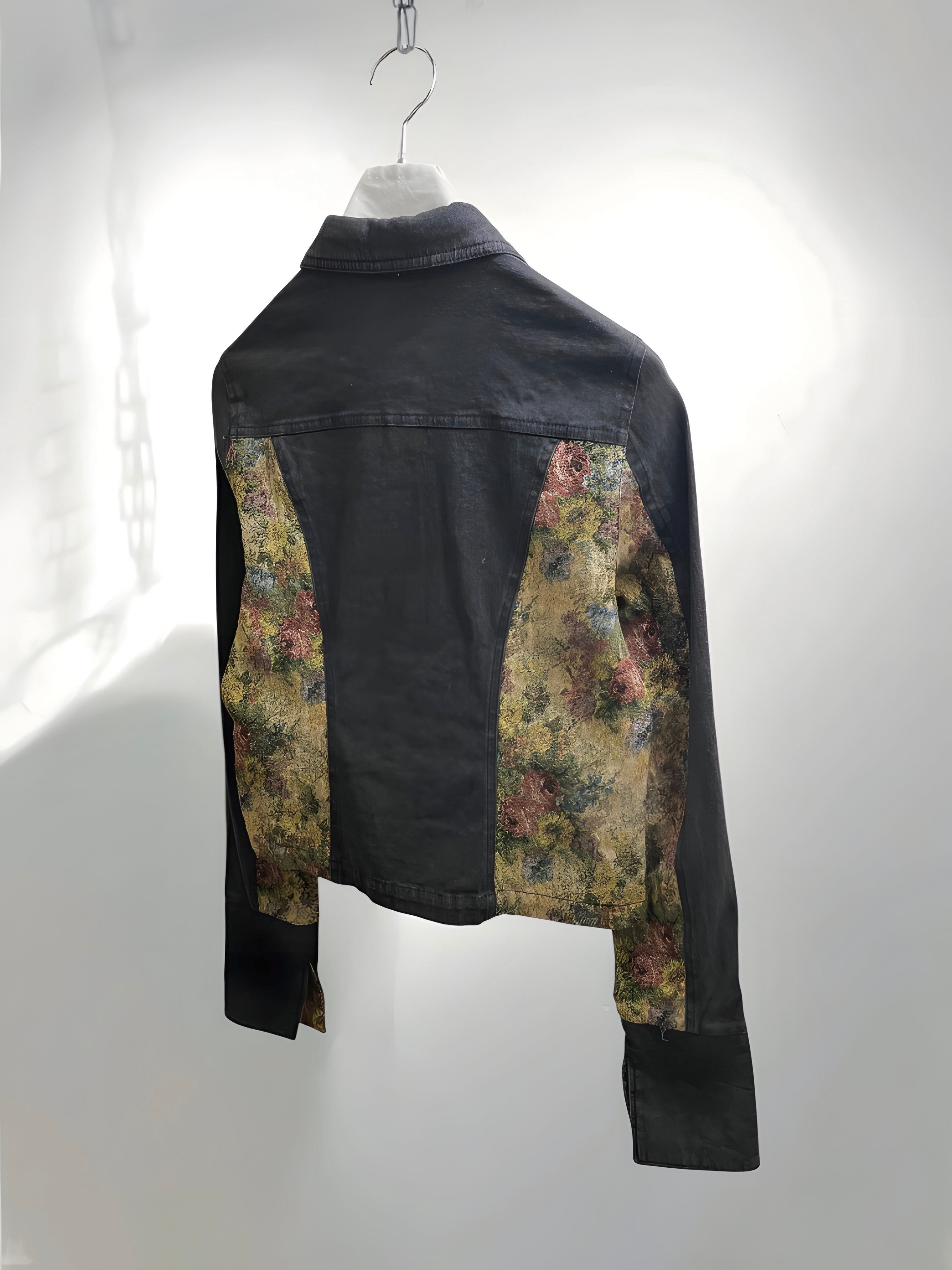 Black Denim Jacket with Tapestry Floral Panels (Late 90s–Early 2000s) – Statement Botanical Motif