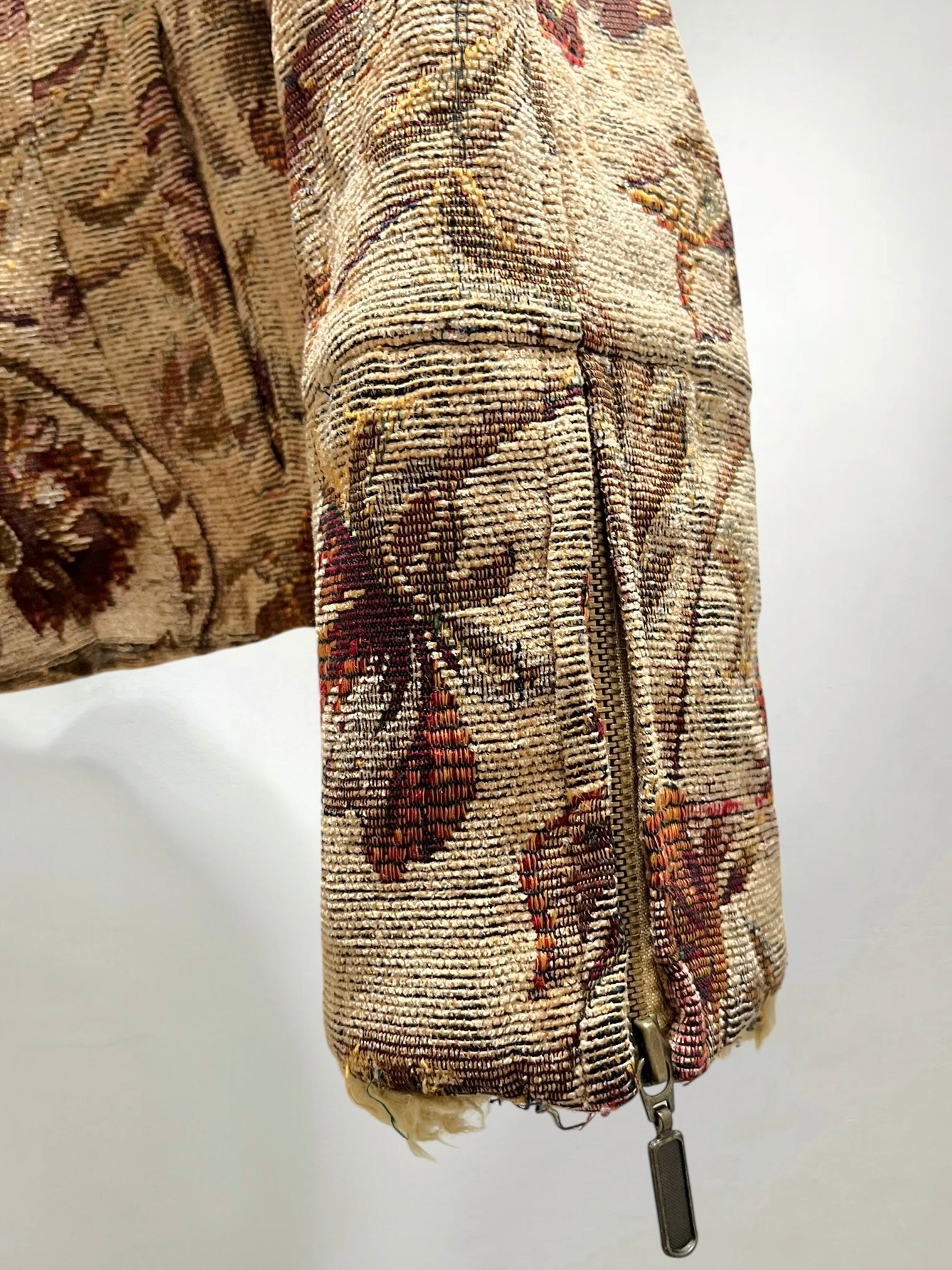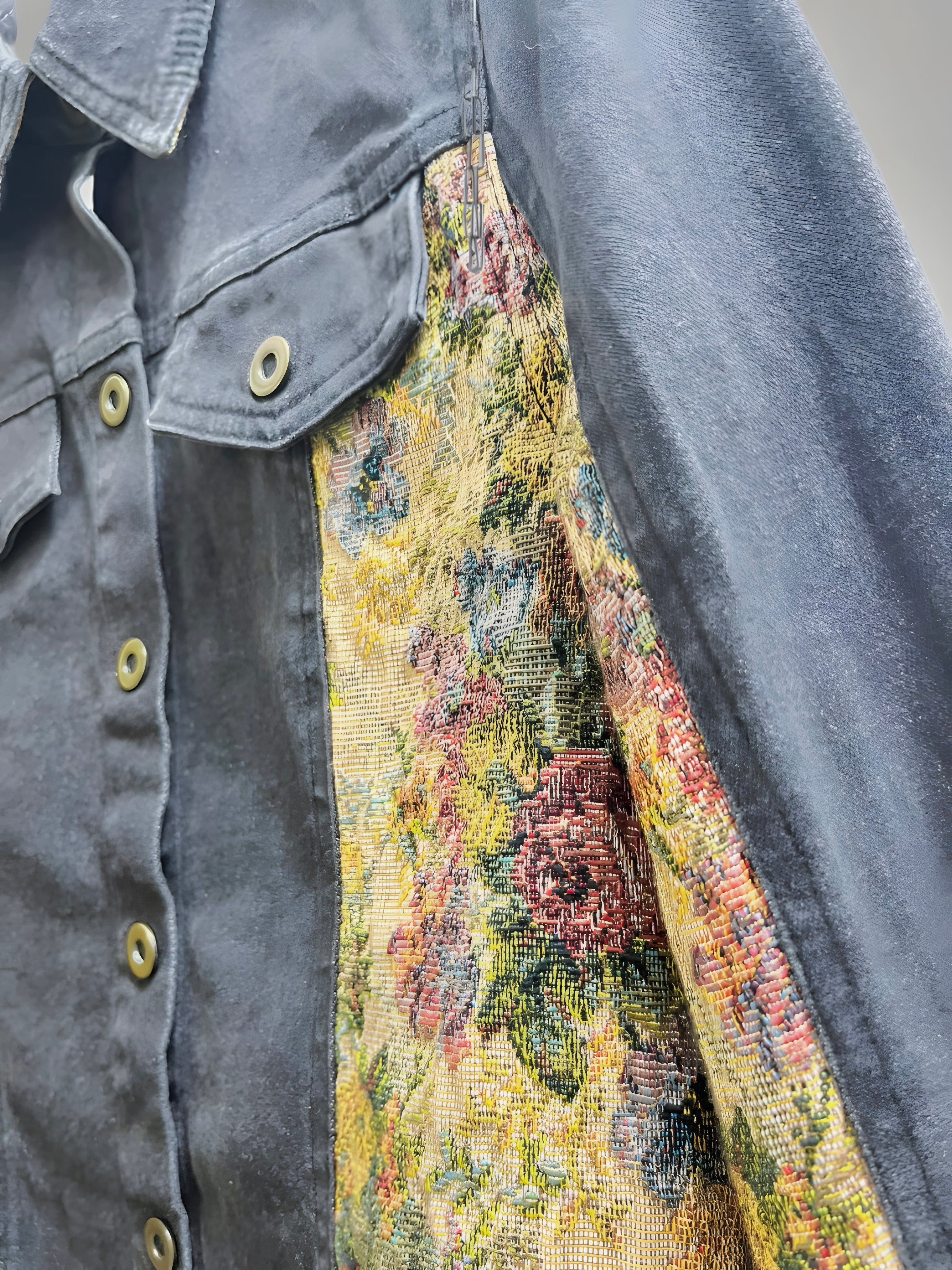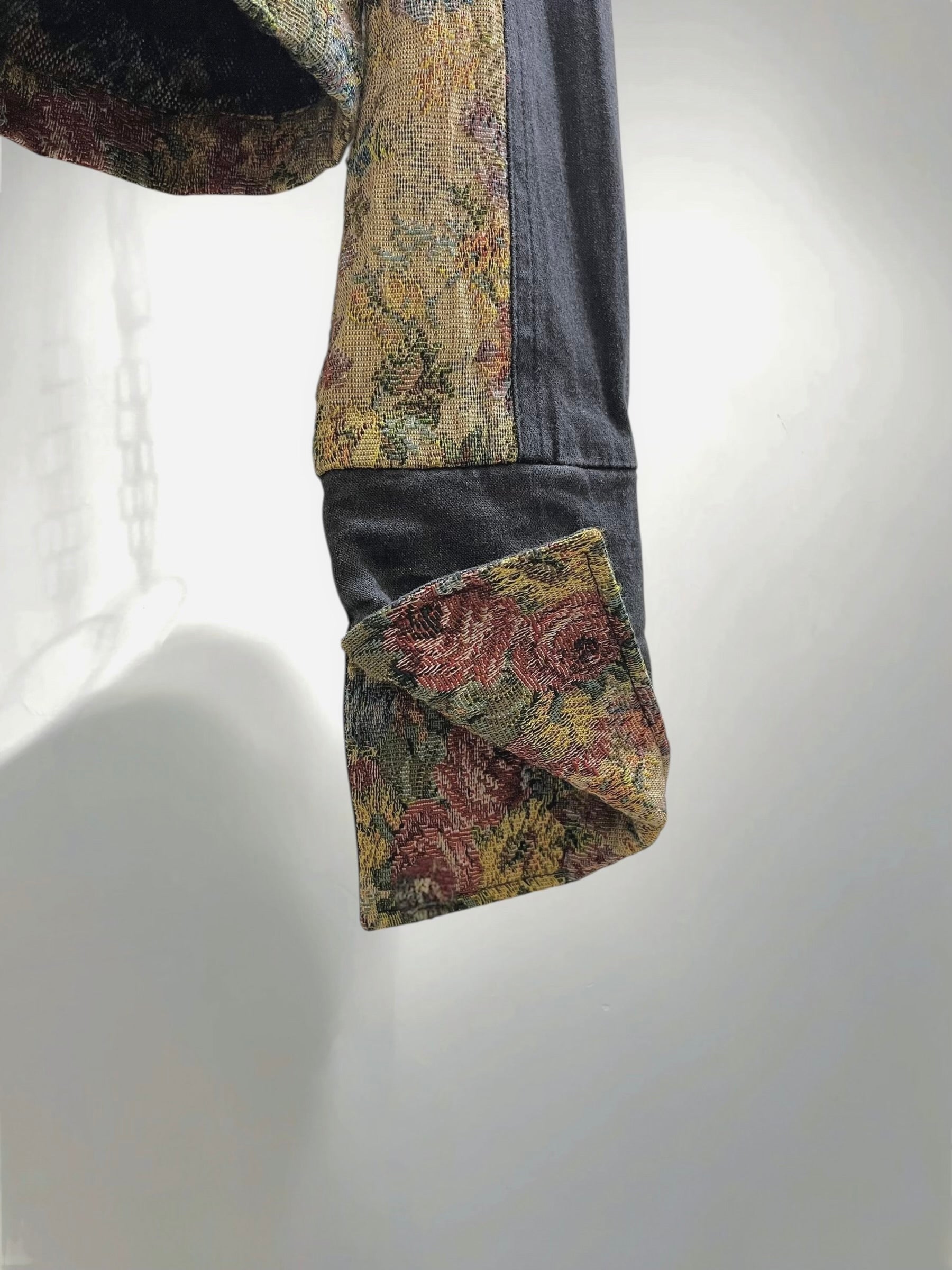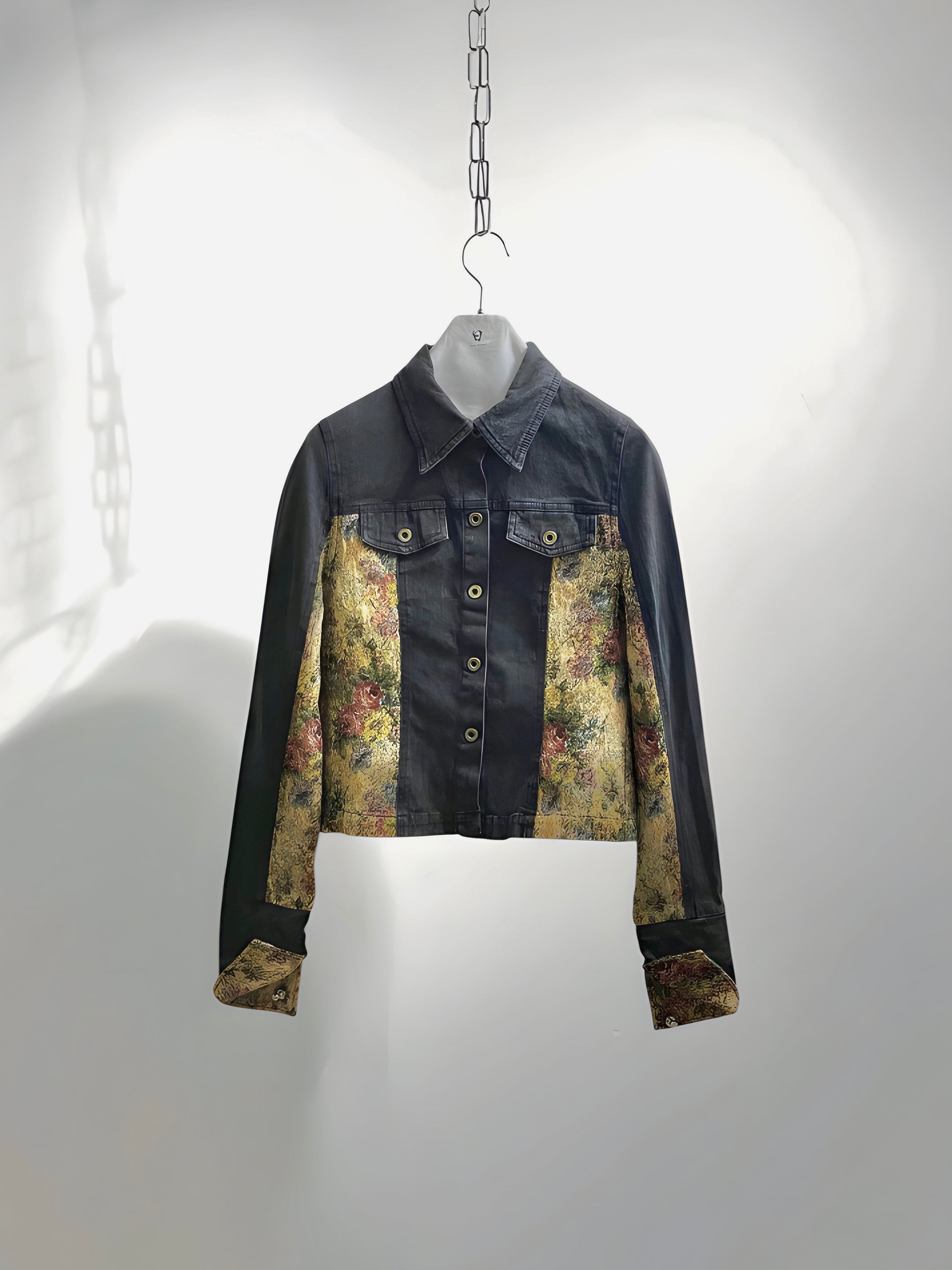 Black Denim Jacket with Tapestry Floral Panels (Late 90s–Early 2000s) – Statement Botanical Motif