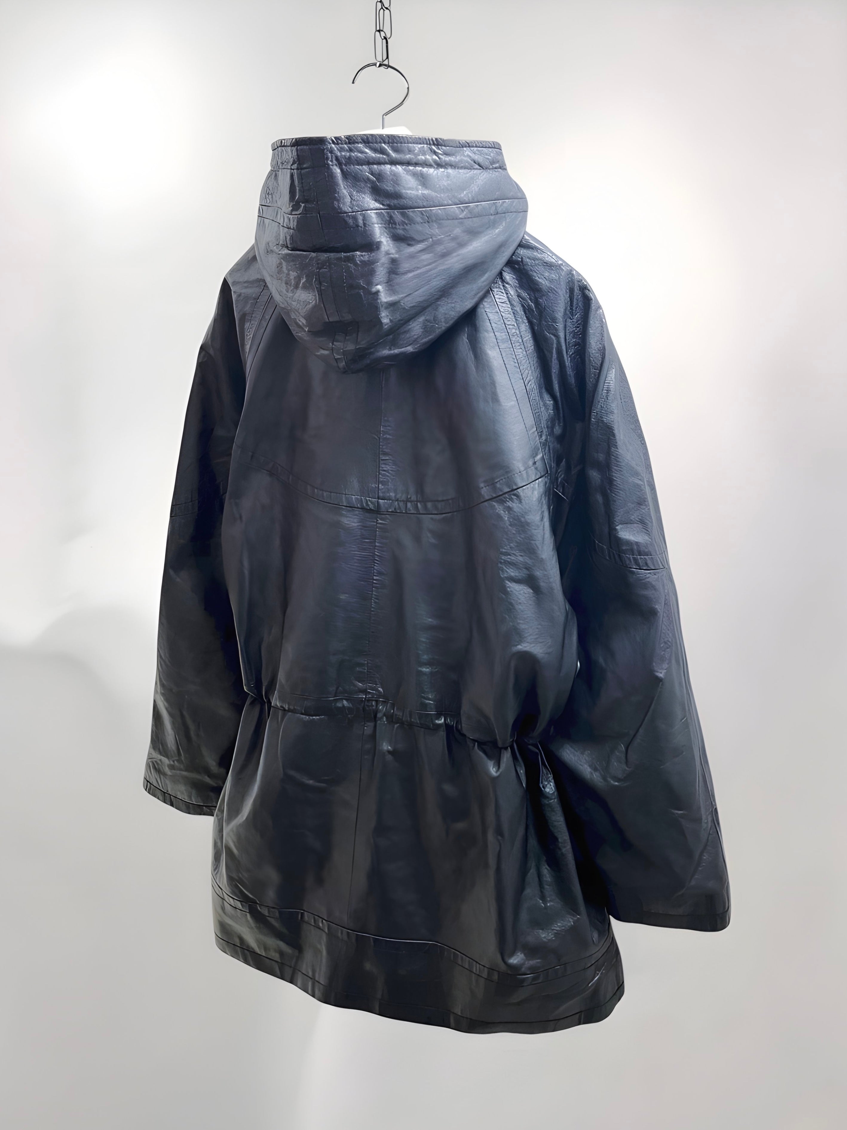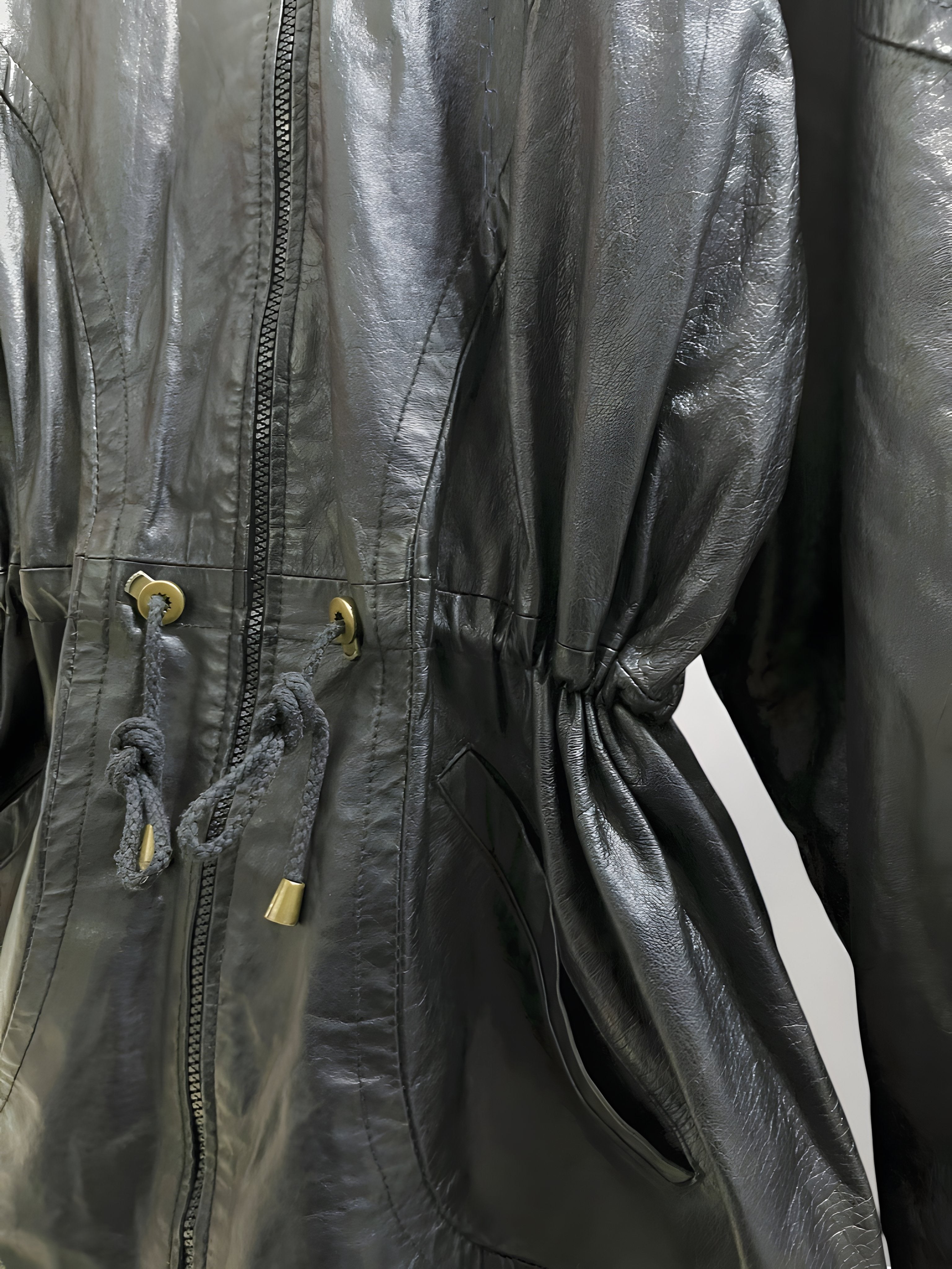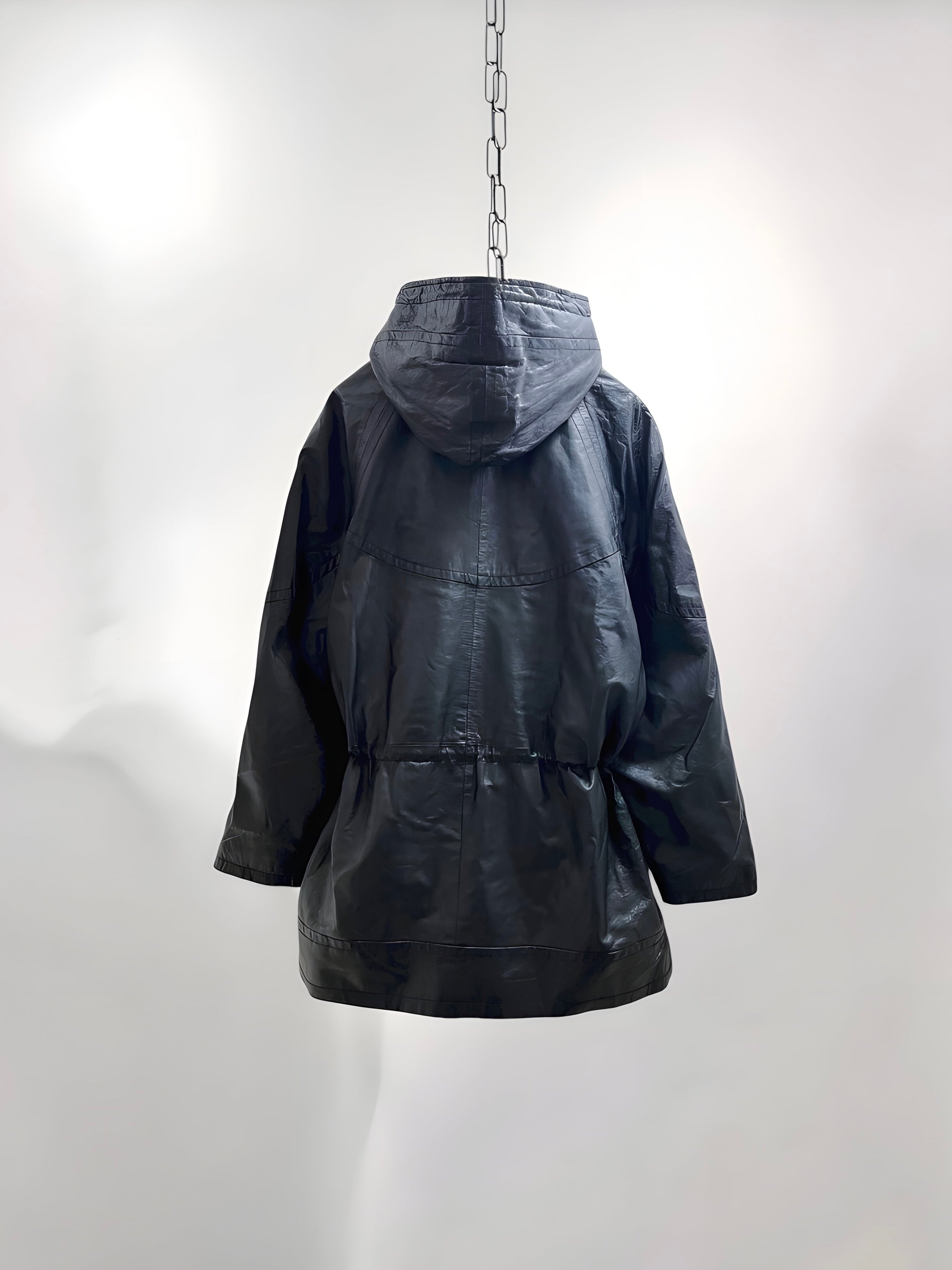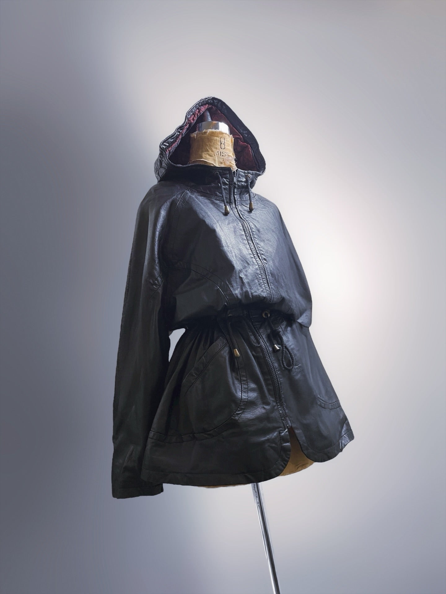 Vintage Black Leather Hooded Parka with Drawcord Waist and Quilted Lining (Late 80s–Early 90s) – Adjustable Silhouette