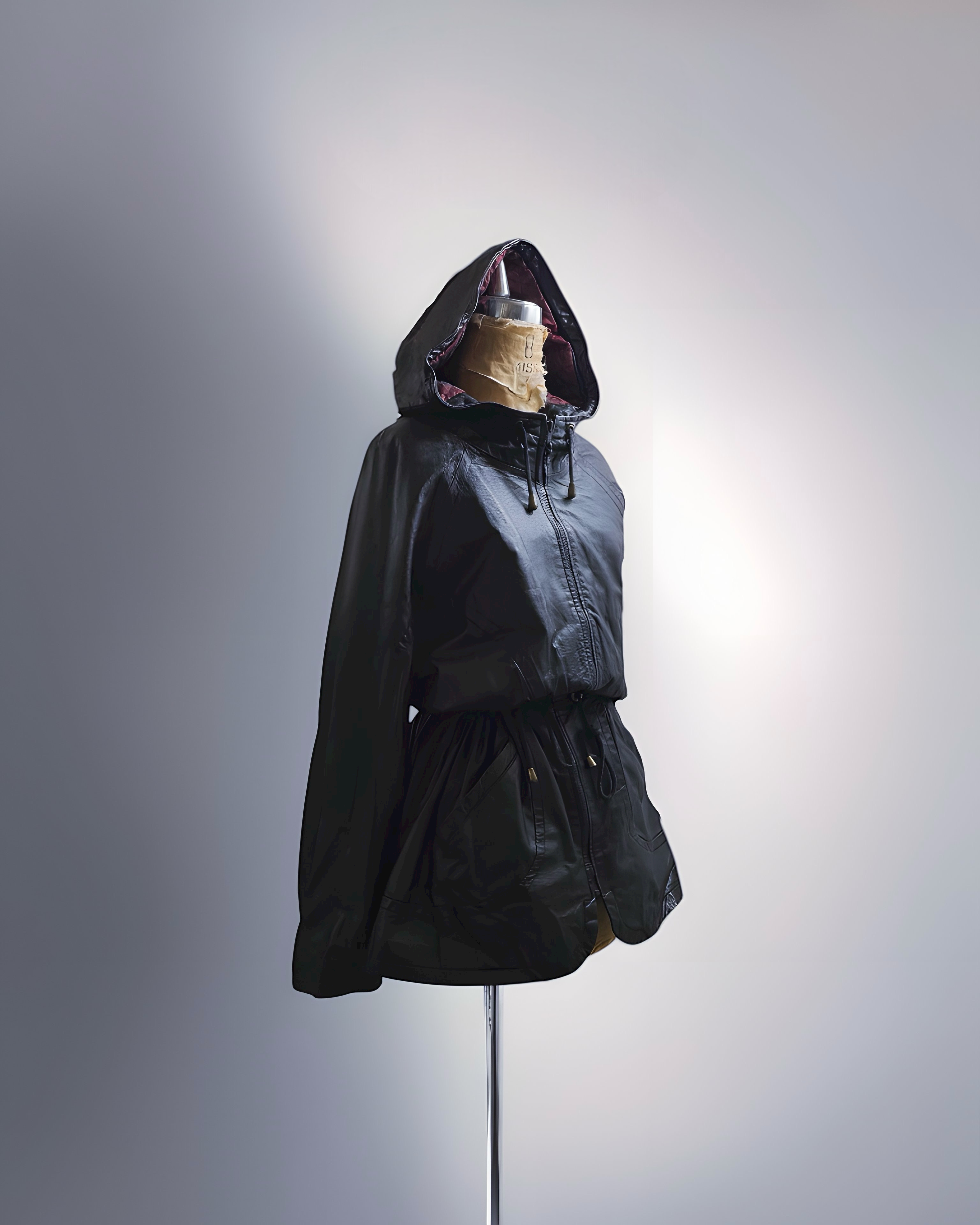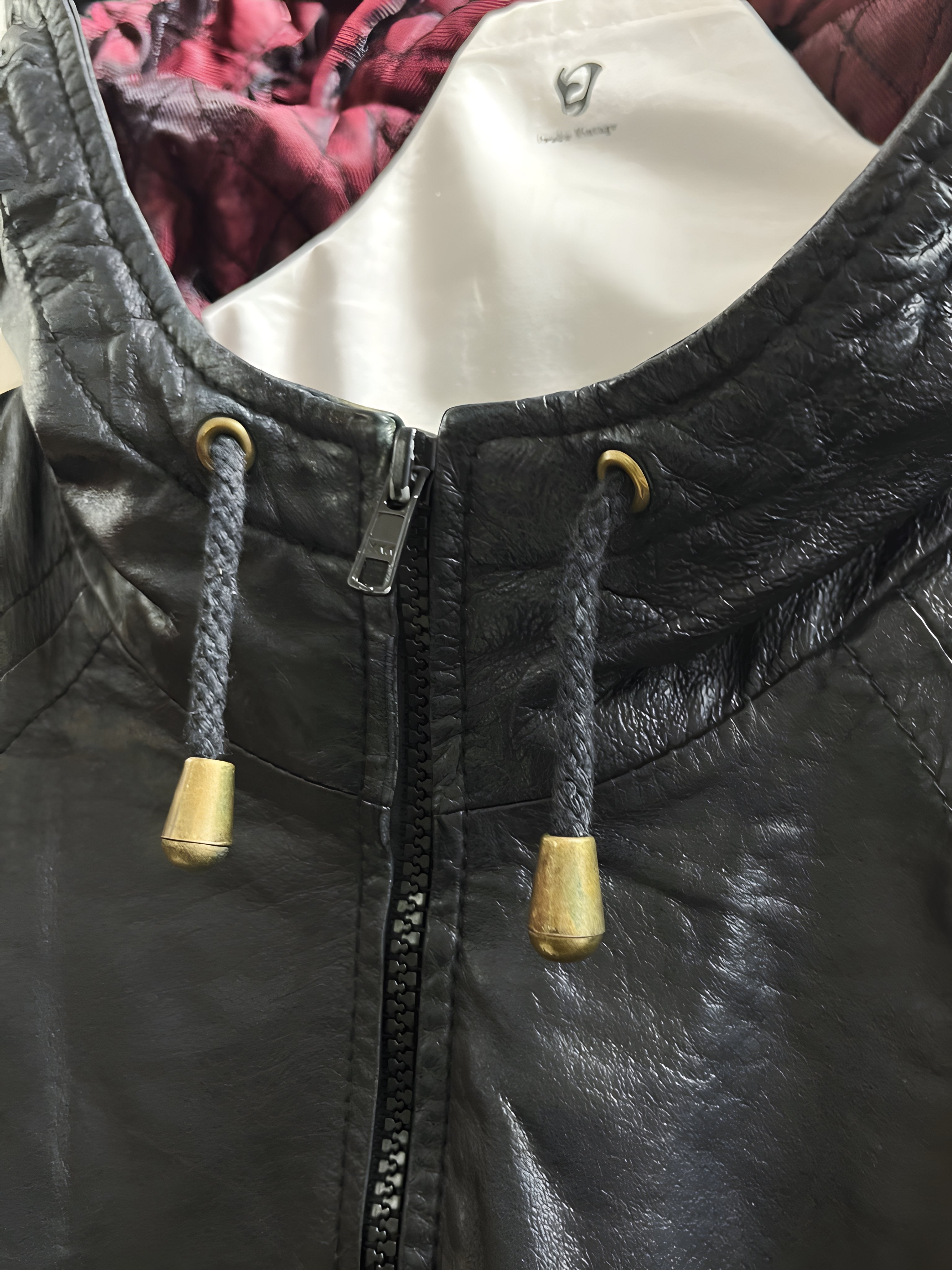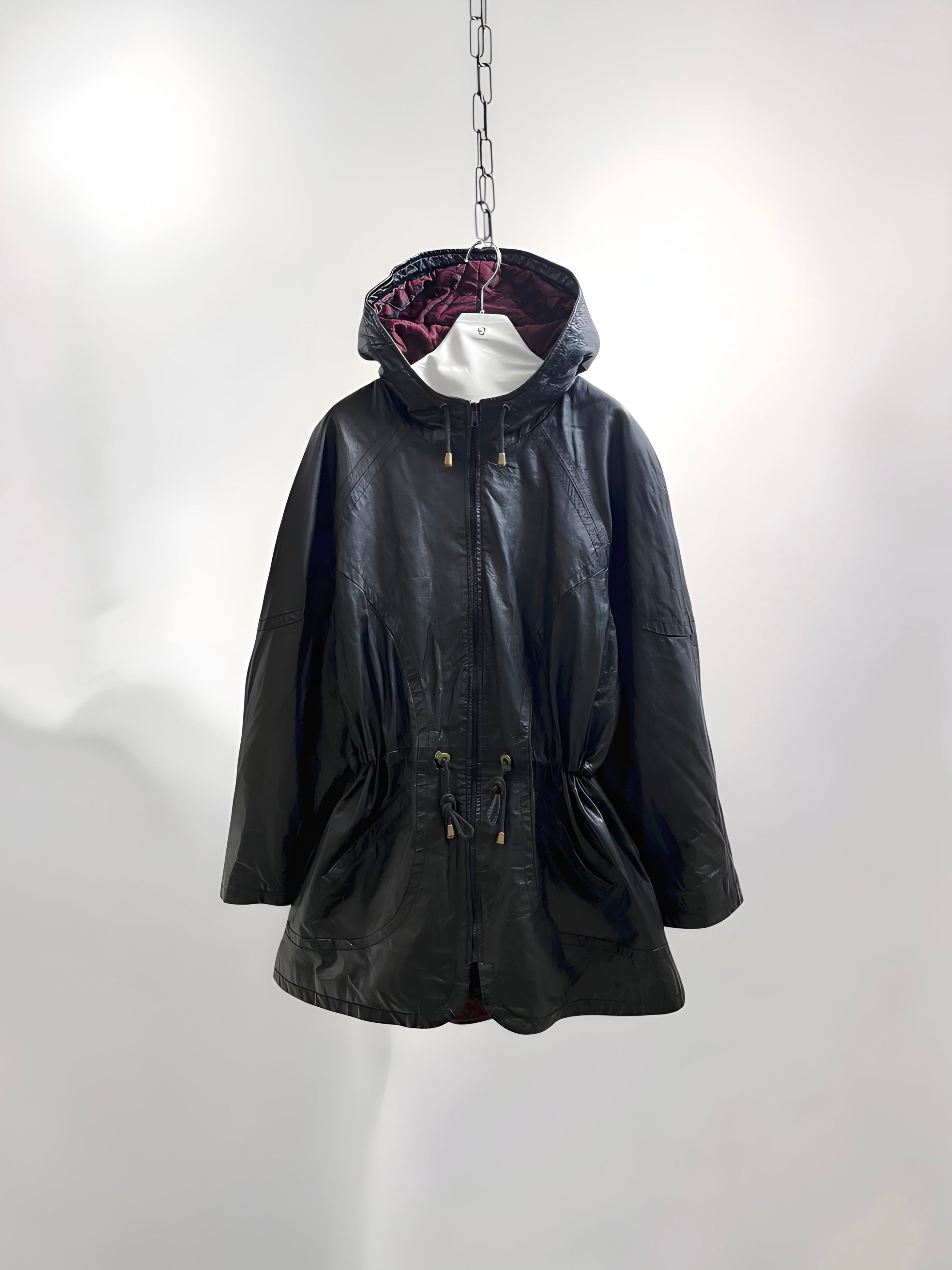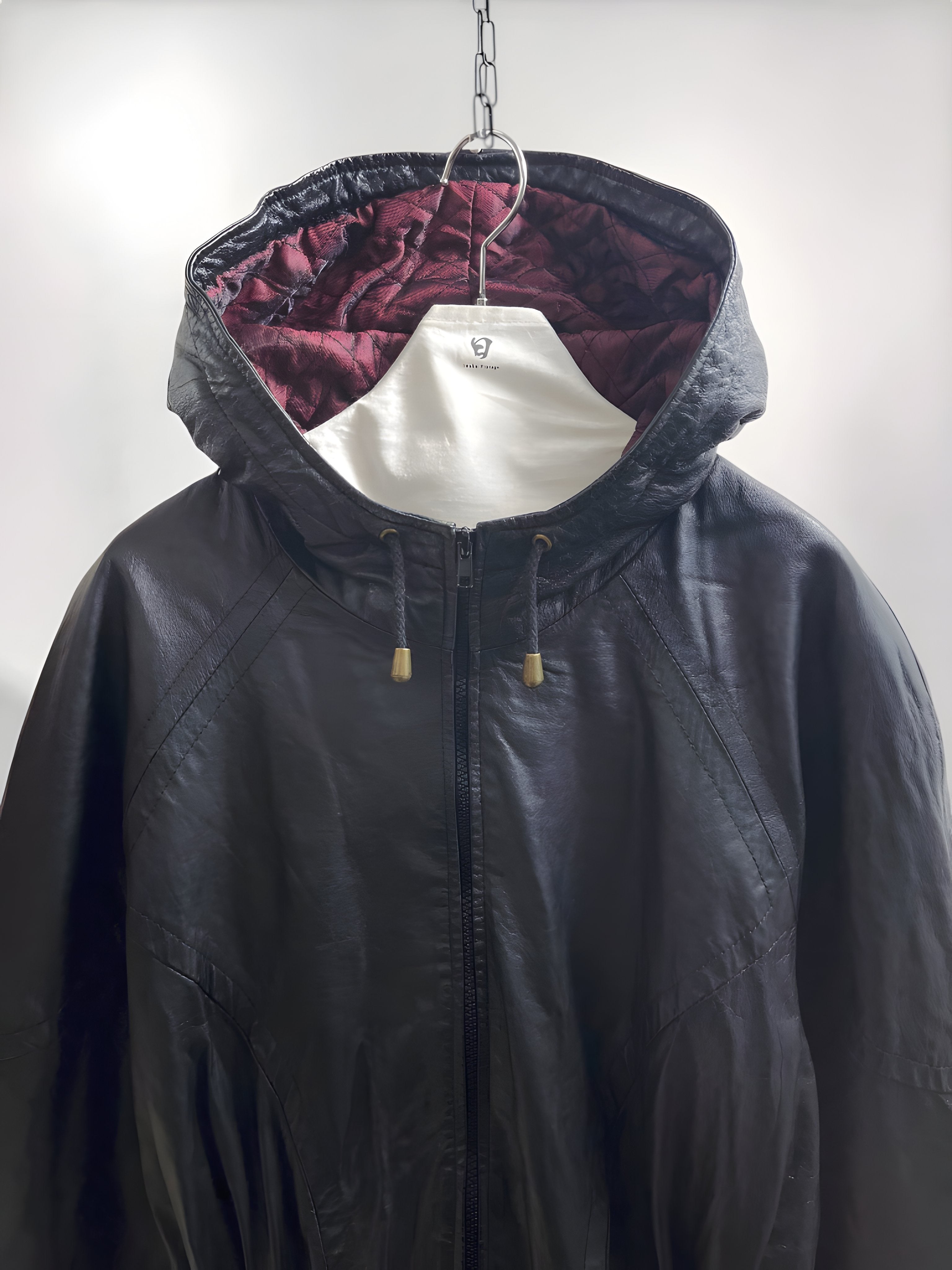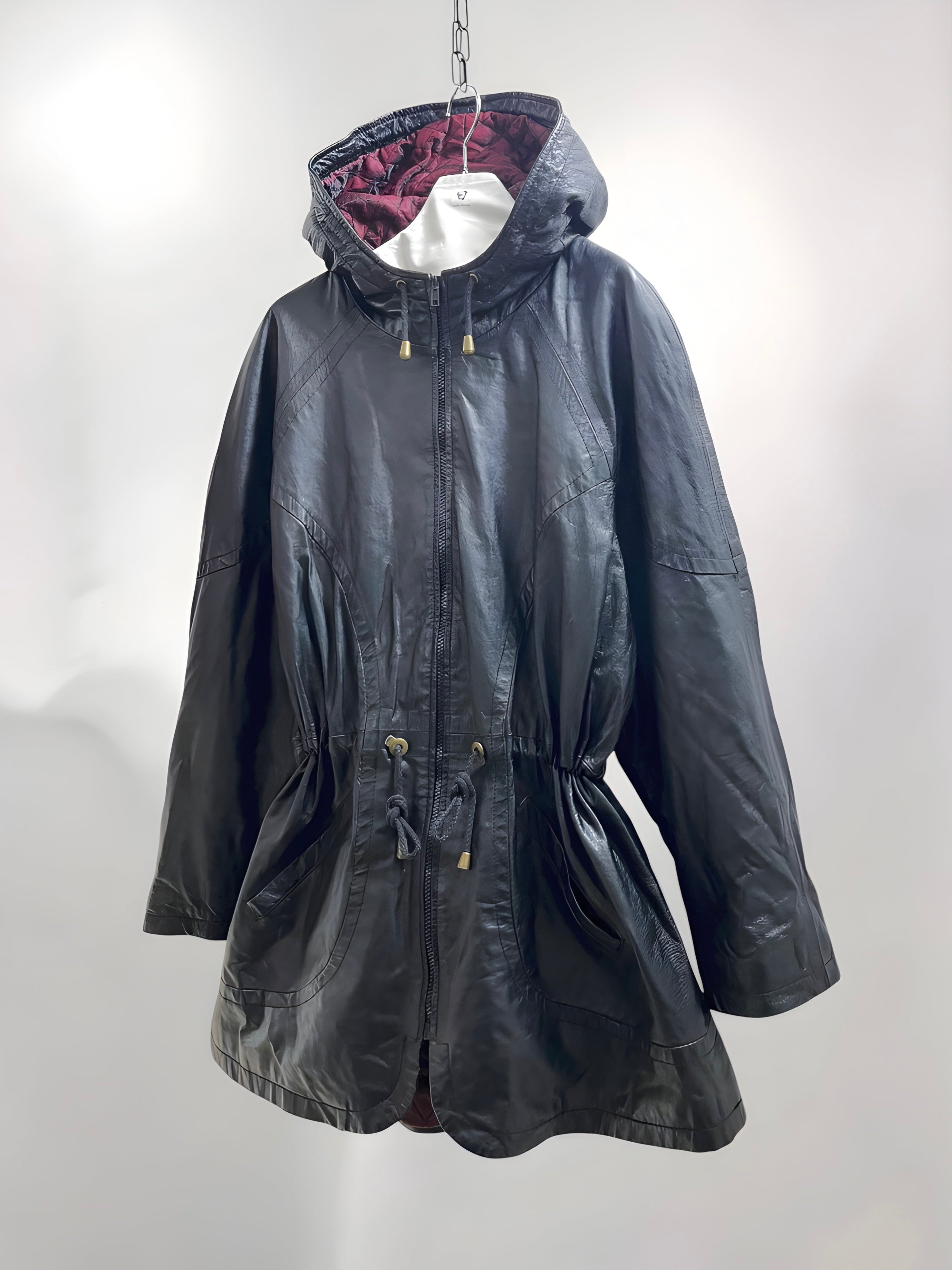 Vintage Black Leather Hooded Parka with Drawcord Waist and Quilted Lining (Late 80s–Early 90s) – Adjustable Silhouette