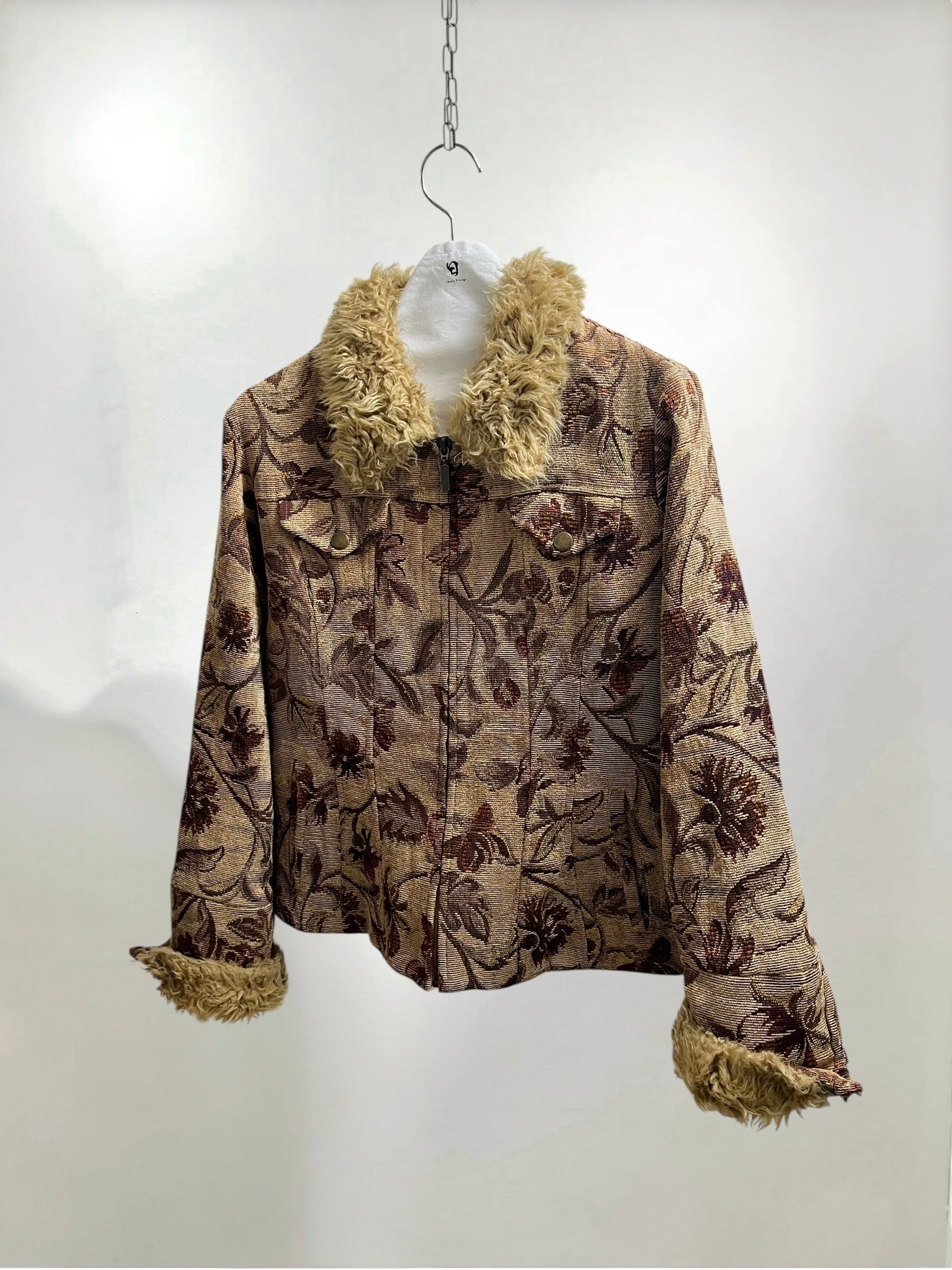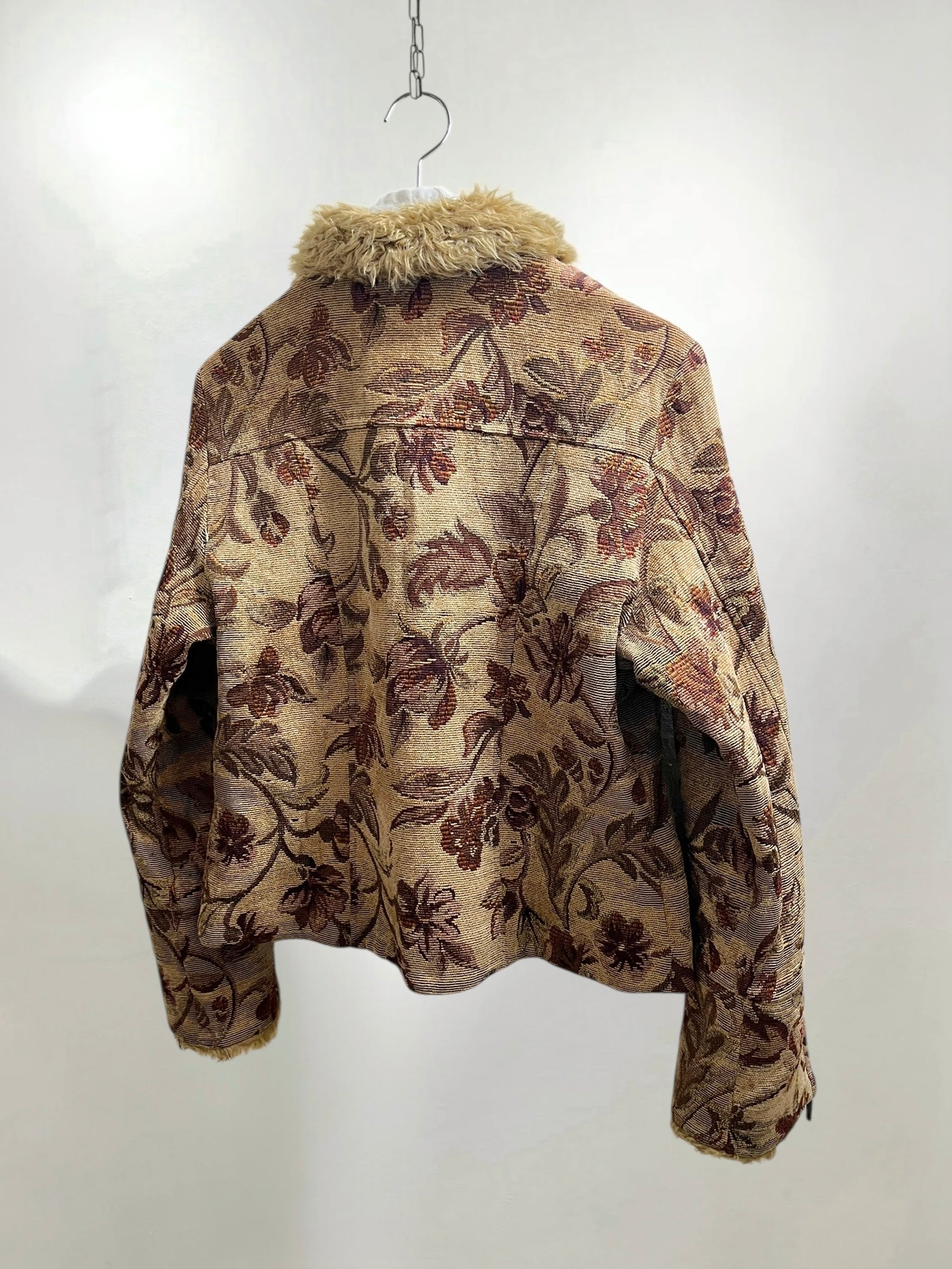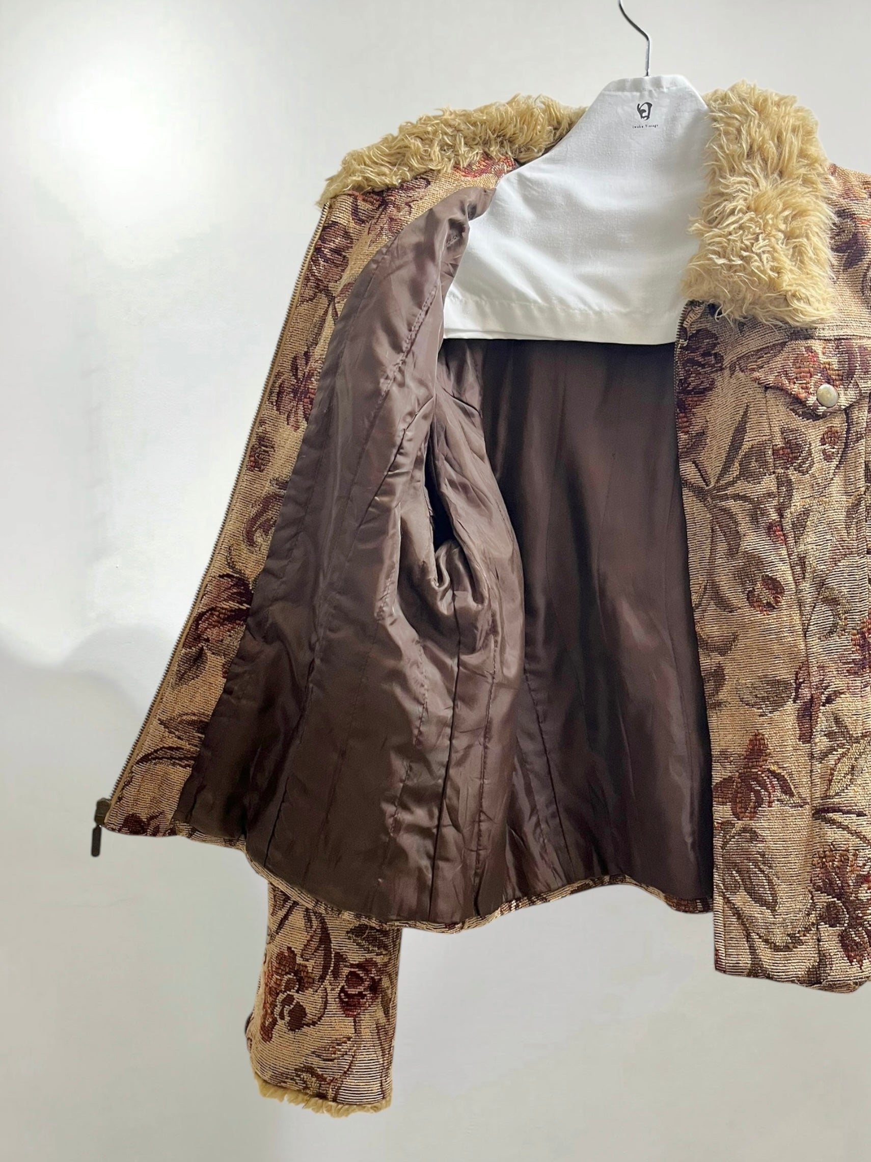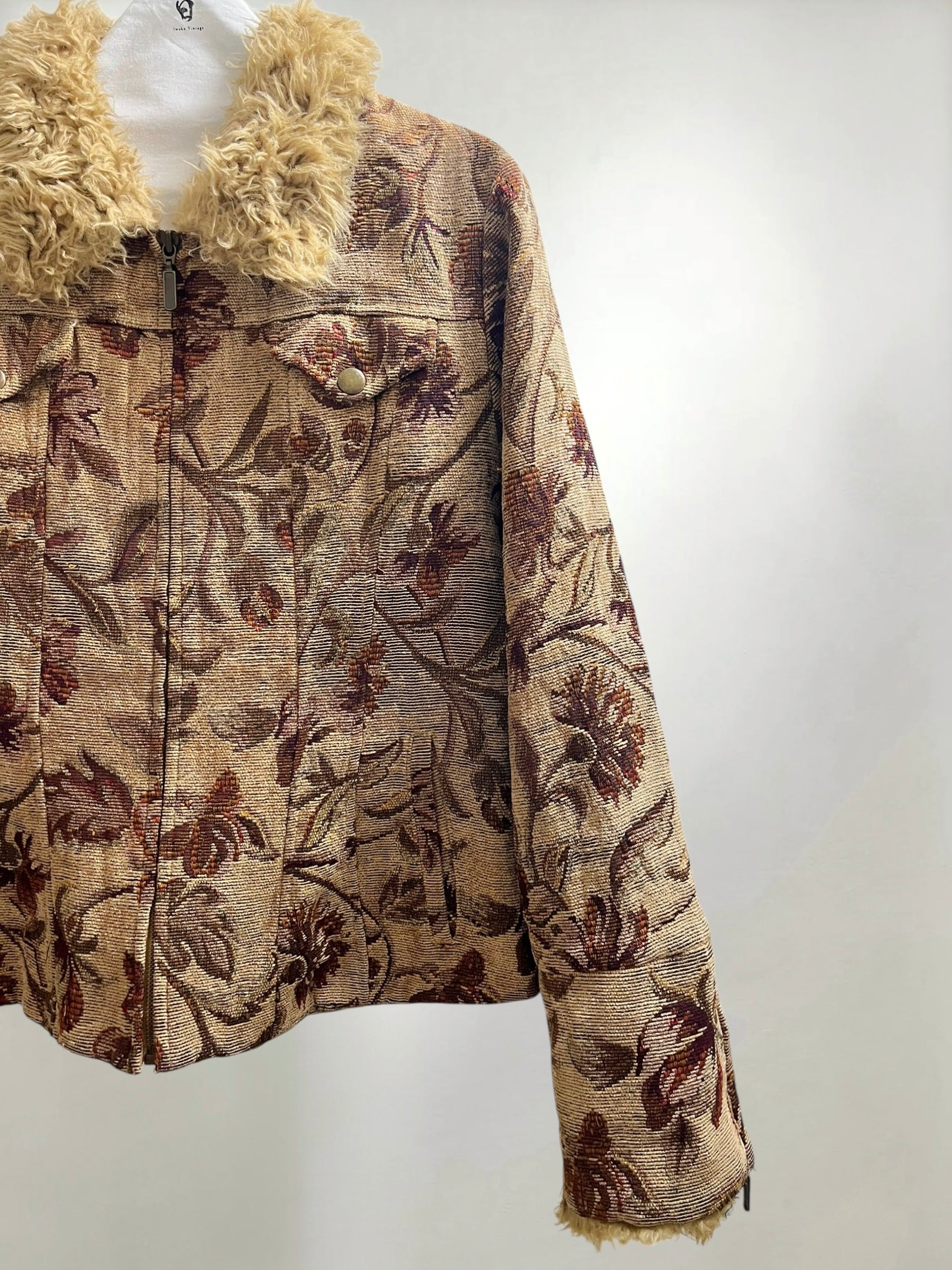 Beige Rayon–Polyester–Cotton Blend Cropped Jacket with Faux-Fur Collar & Cuffs (Early 2000s) – Statement Tapestry Jacquard