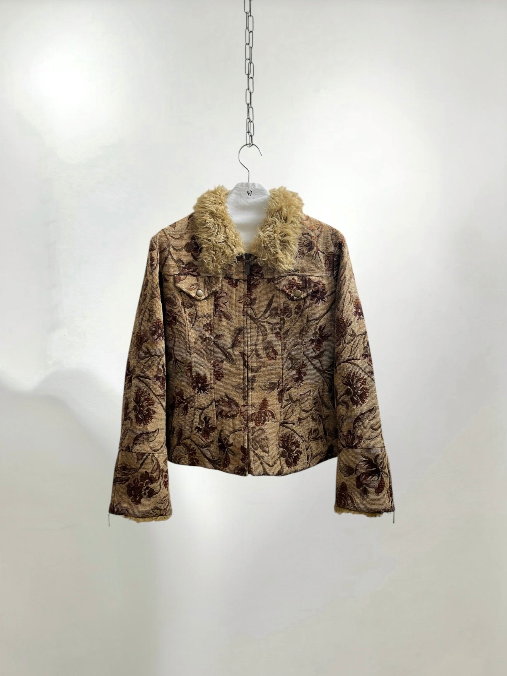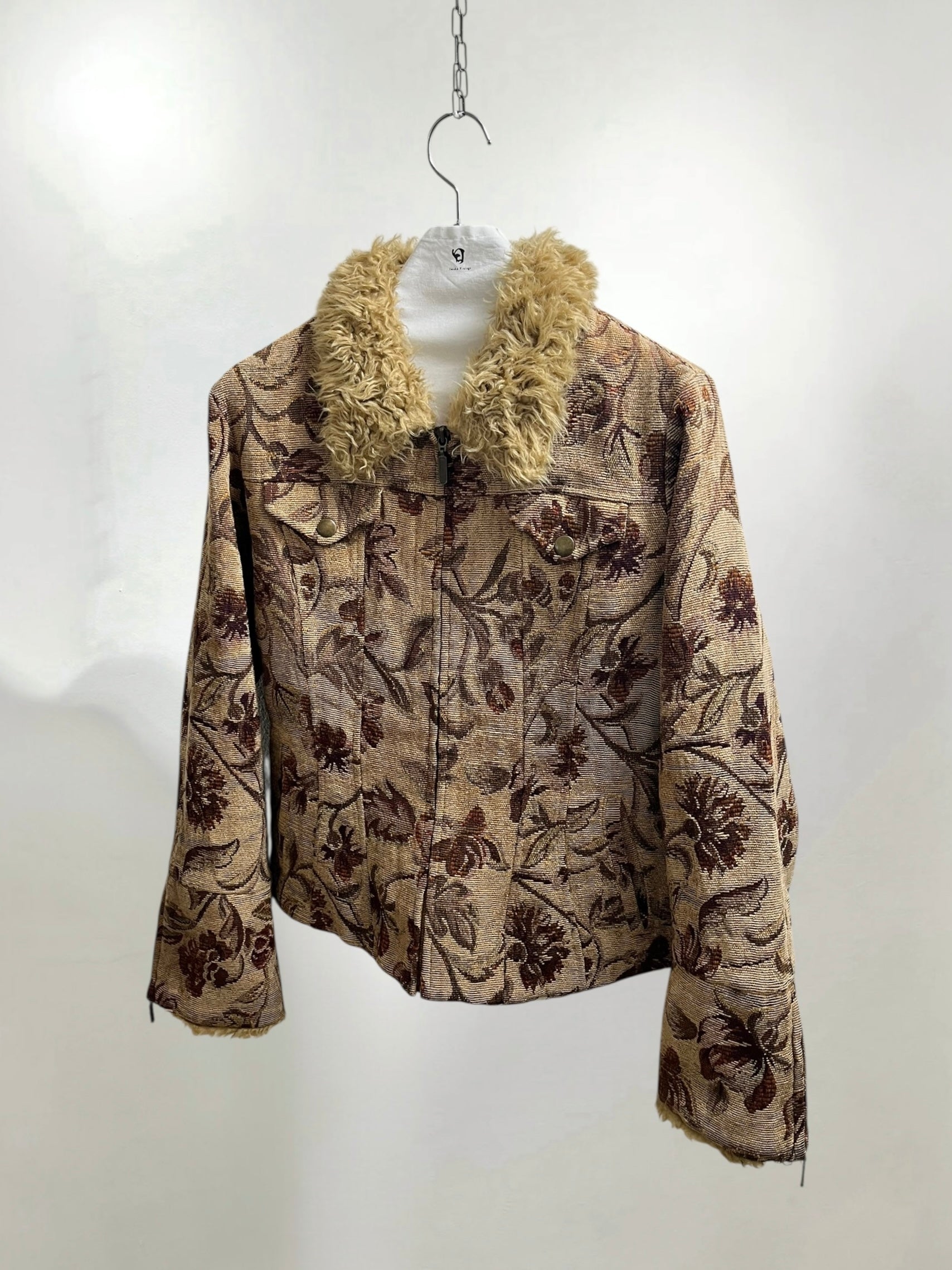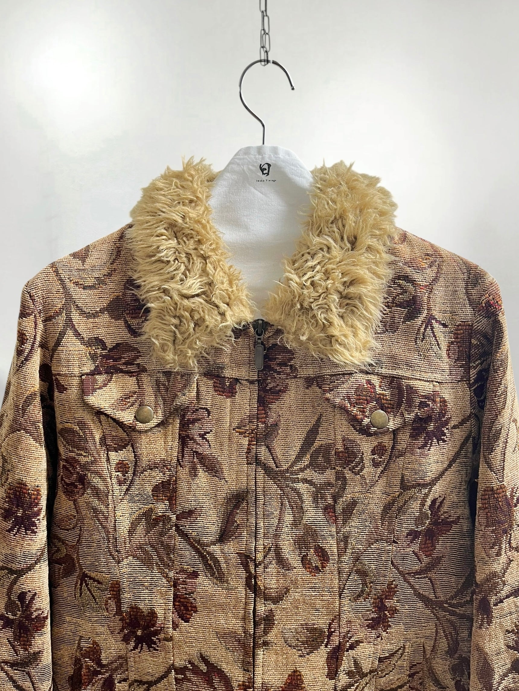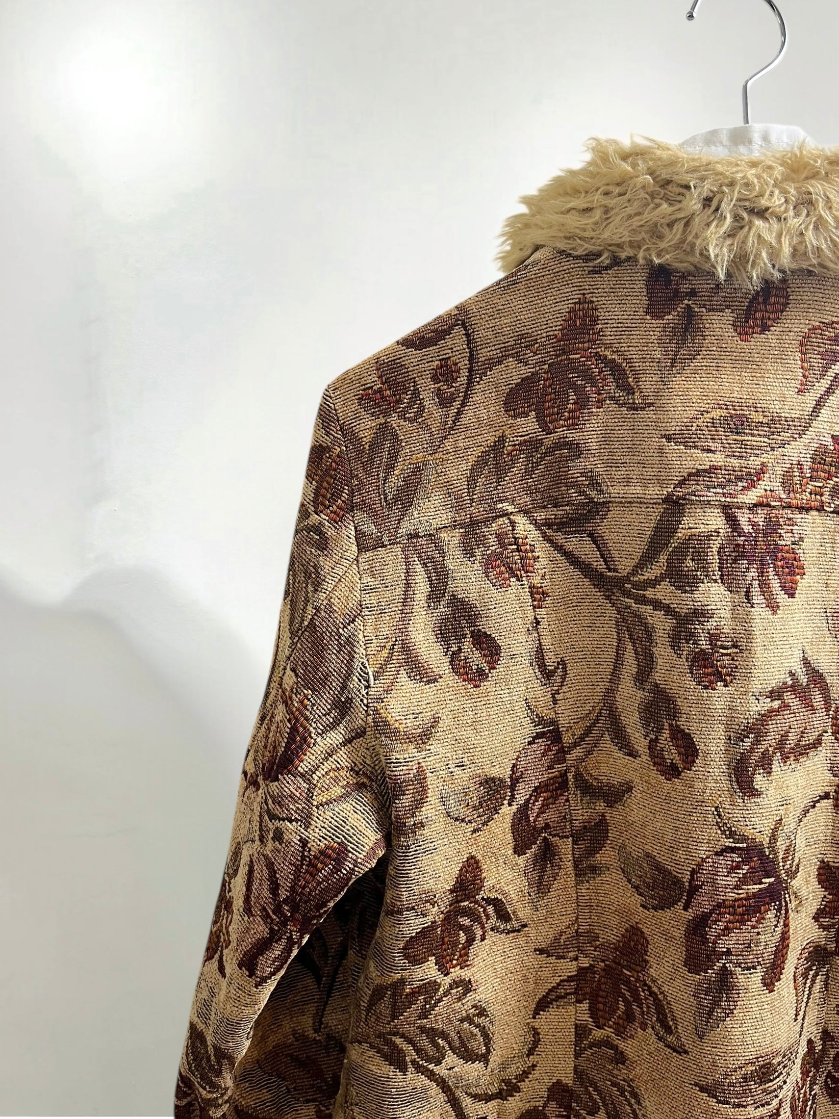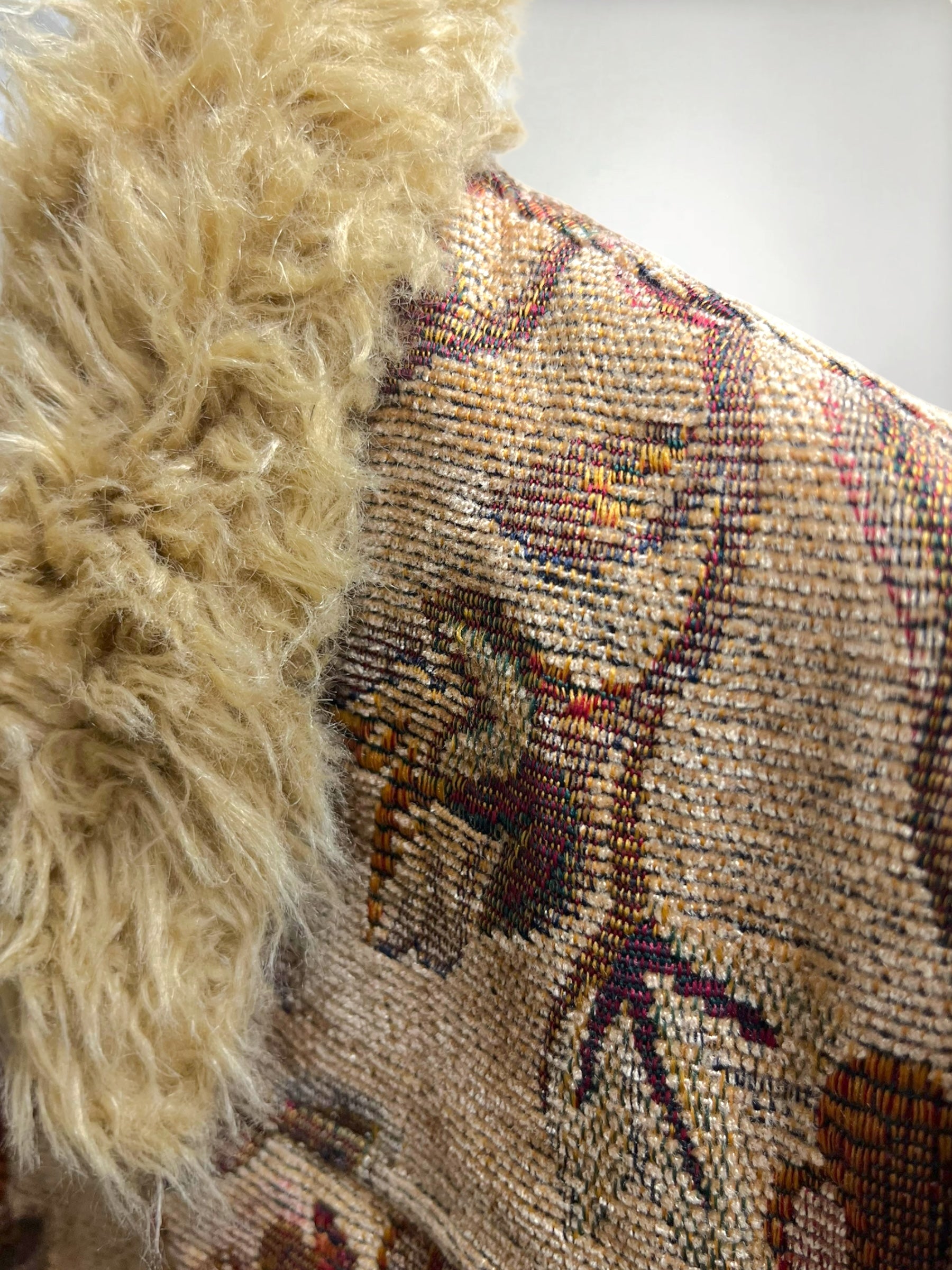 Beige Rayon–Polyester–Cotton Blend Cropped Jacket with Faux-Fur Collar & Cuffs (Early 2000s) – Statement Tapestry Jacquard