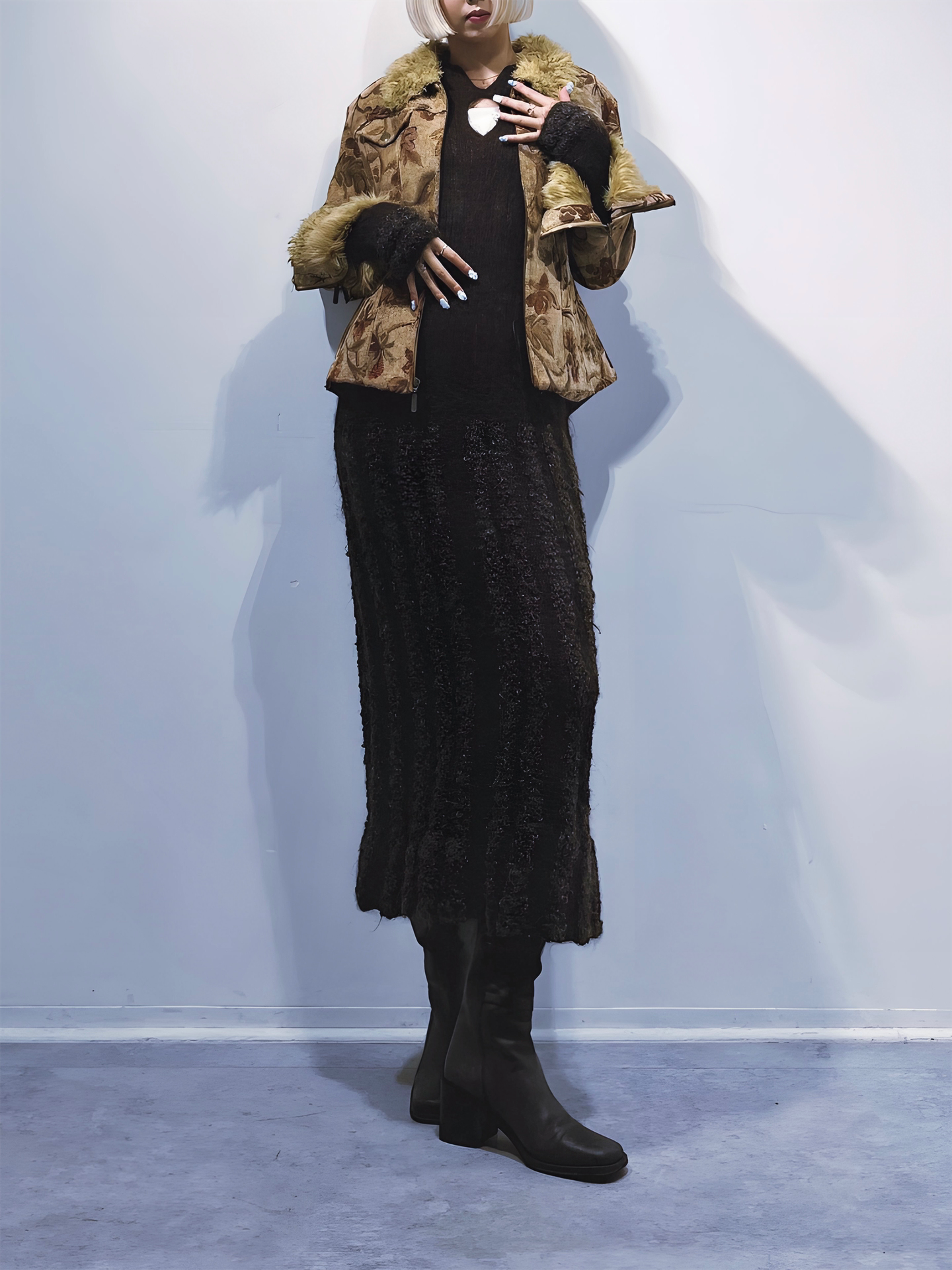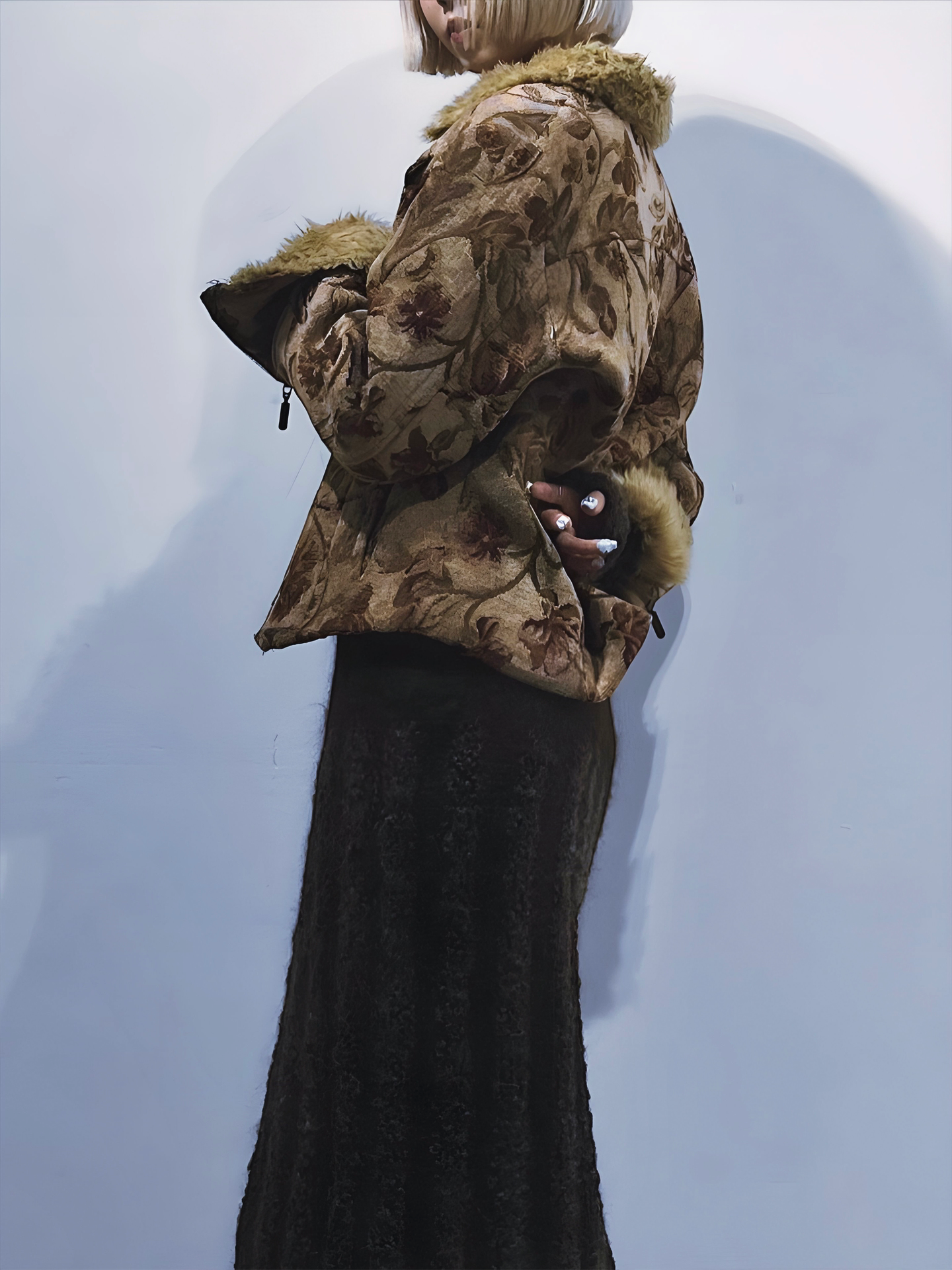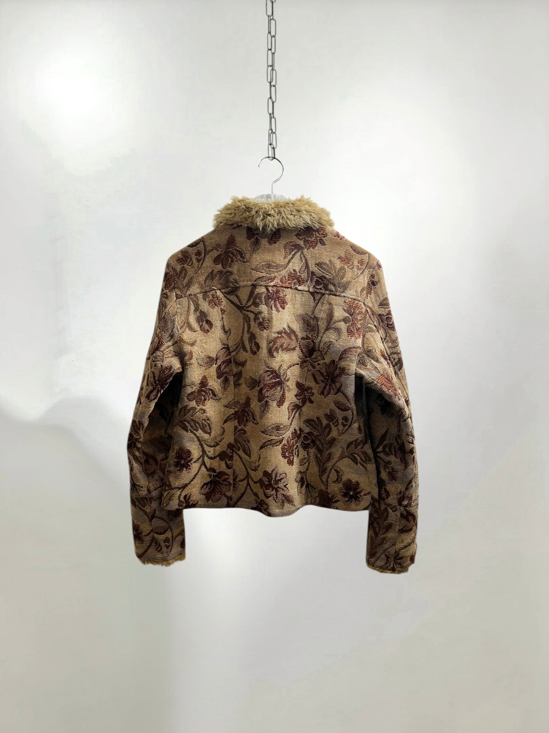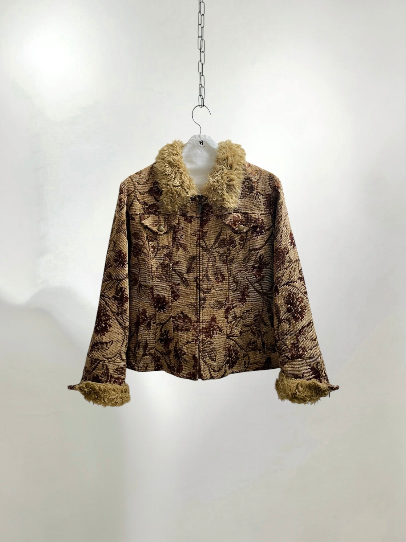 Beige Rayon–Polyester–Cotton Blend Cropped Jacket with Faux-Fur Collar & Cuffs (Early 2000s) – Statement Tapestry Jacquard
