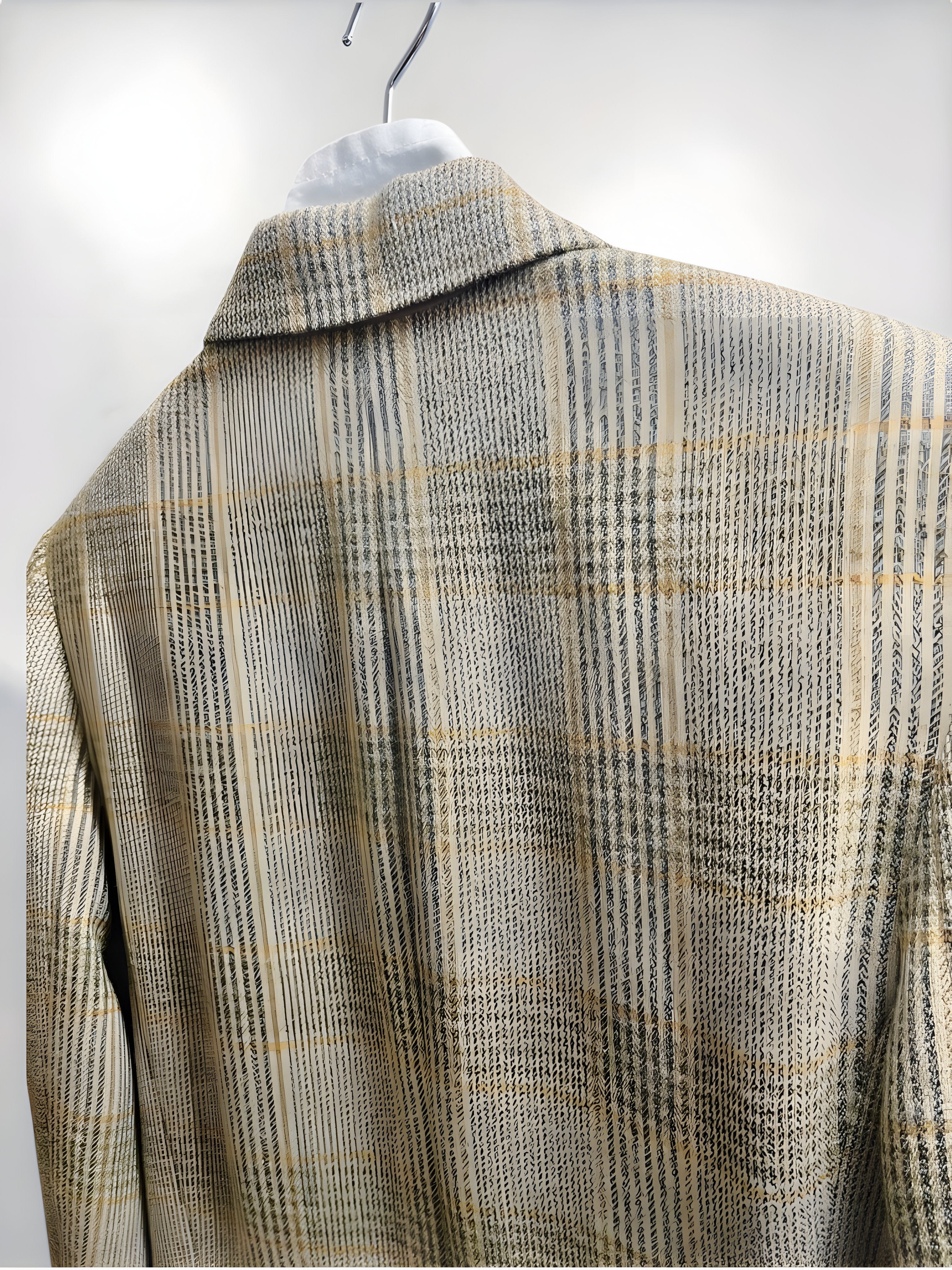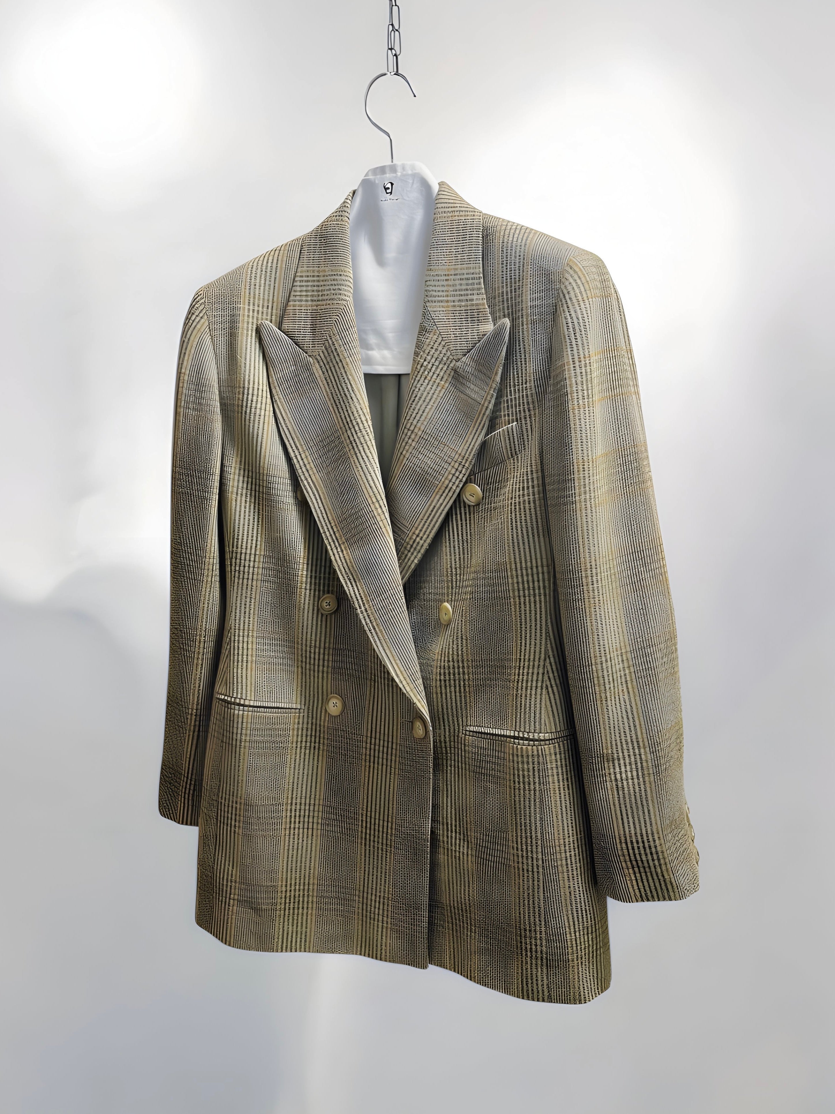 Vintage Beige Wool–Rayon Blend Double-Breasted Blazer with Glen Check and Peaked Lapels (Late 80s–Early 90s) – Tailored Structure