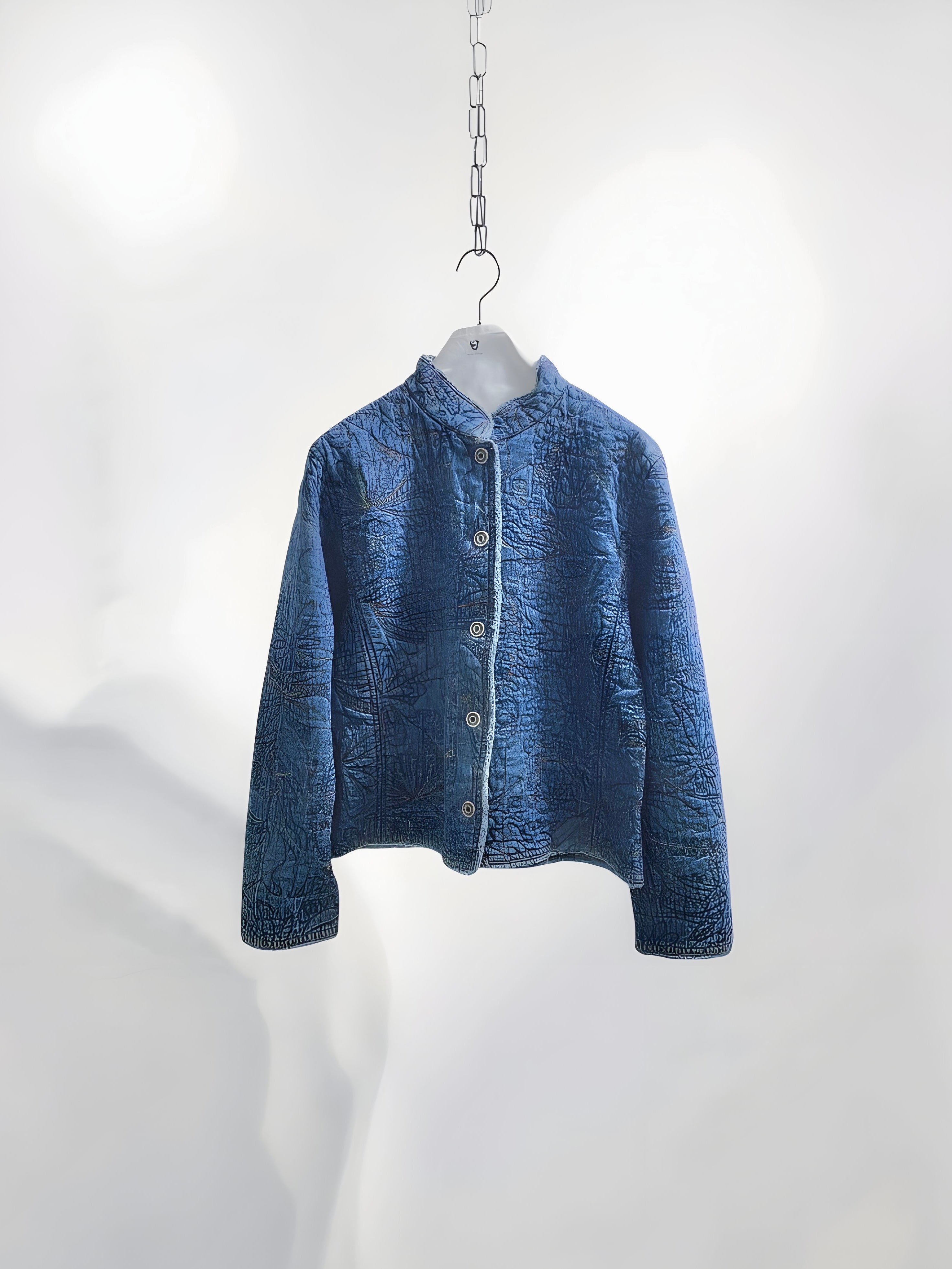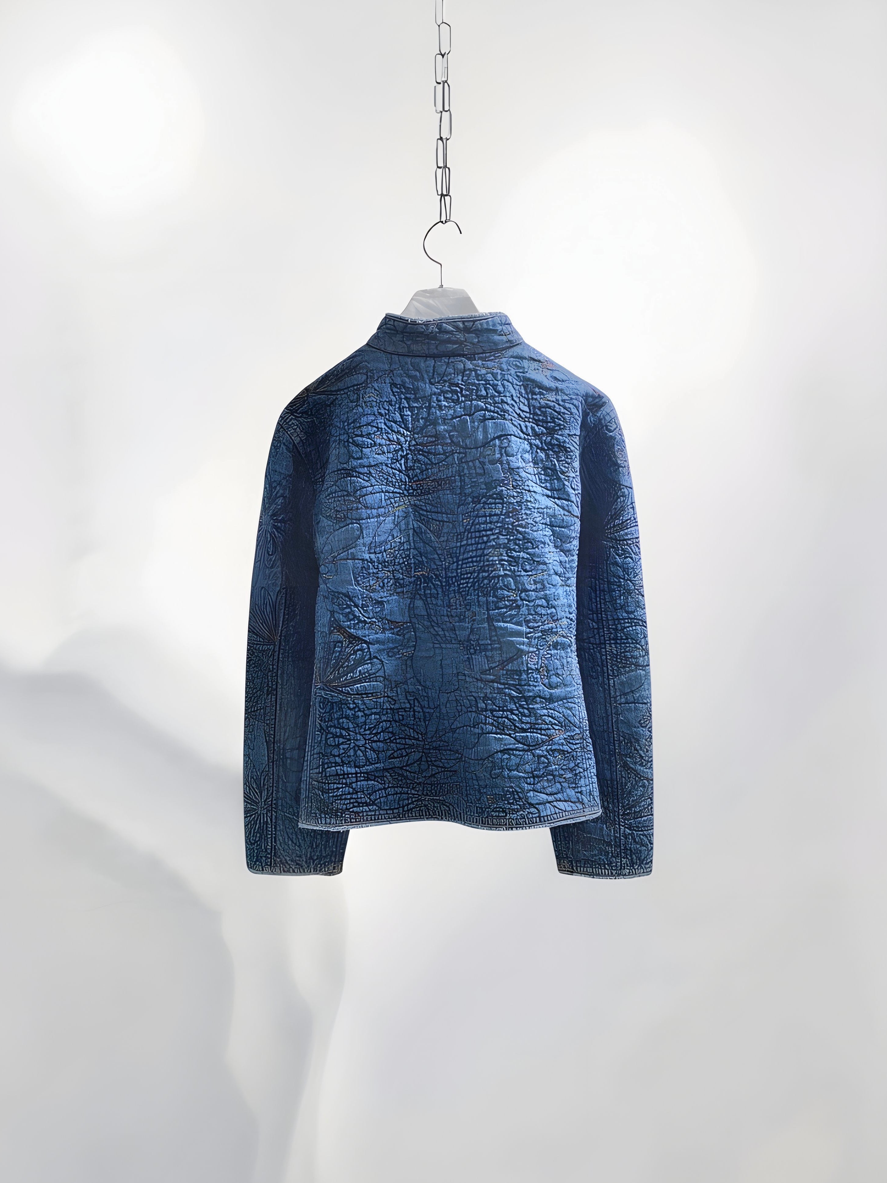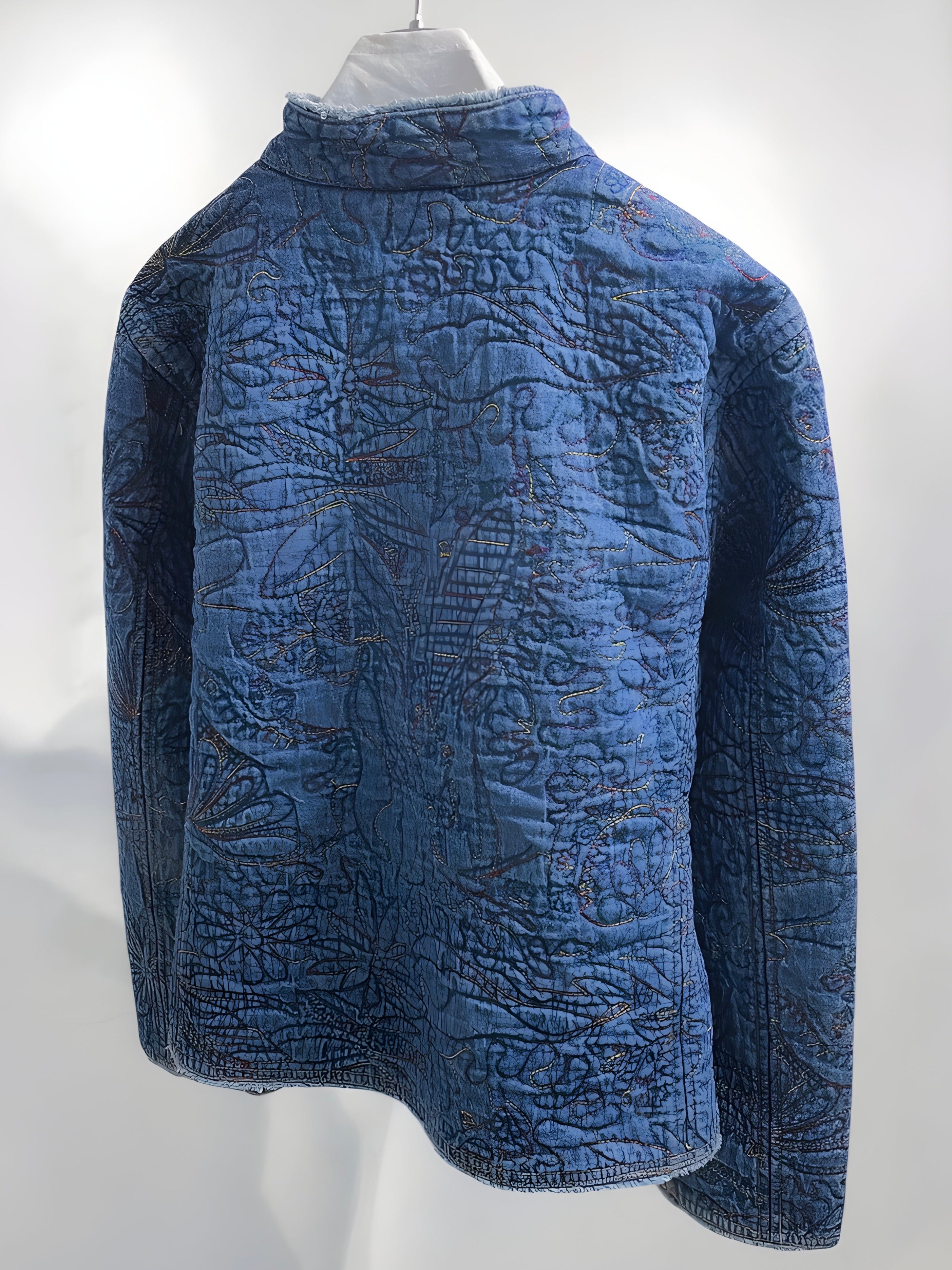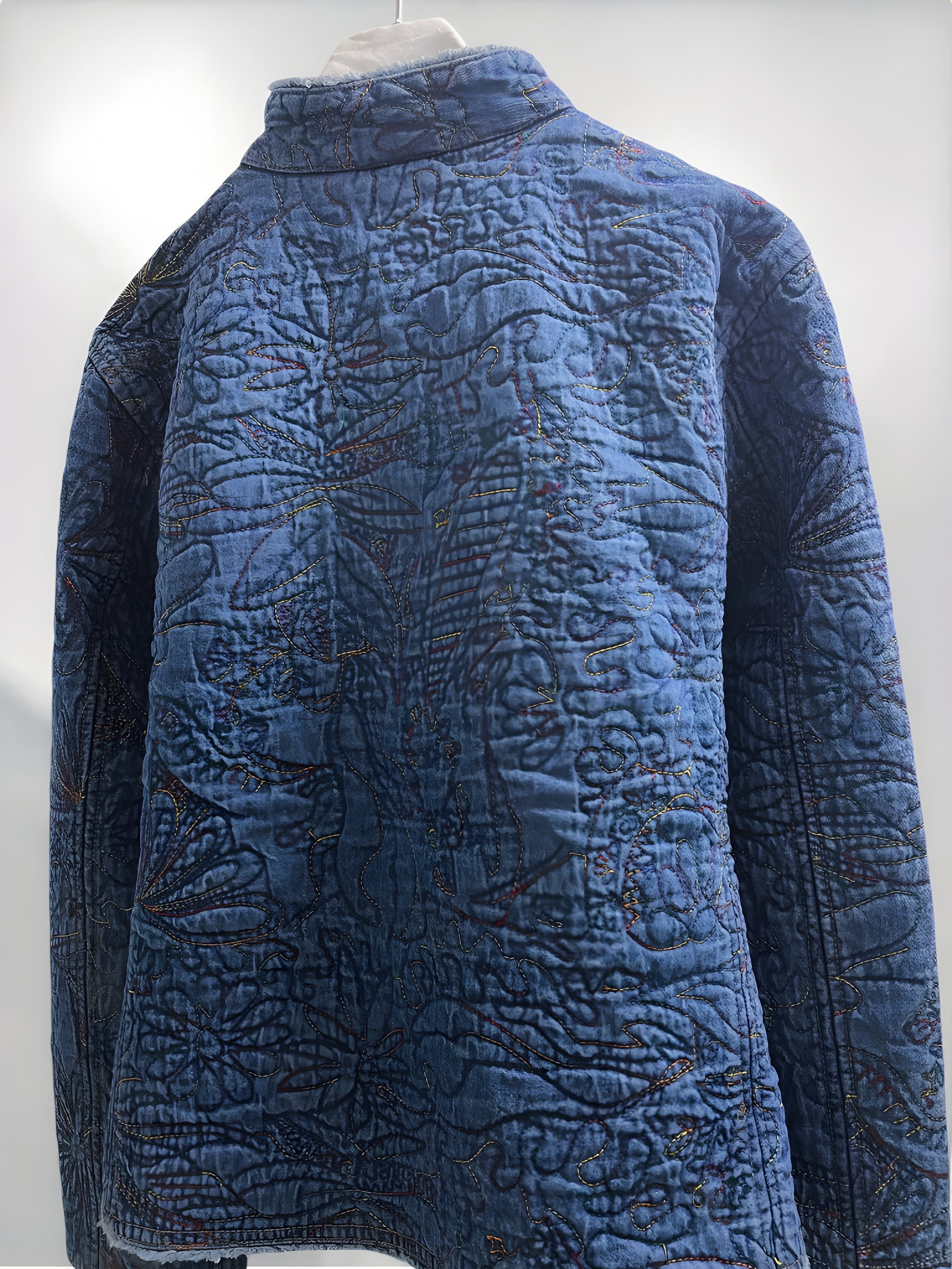 Vintage Blue Quilted Cotton Jacket with Allover Embroidery (90s) – Handcrafted Texture Appeal