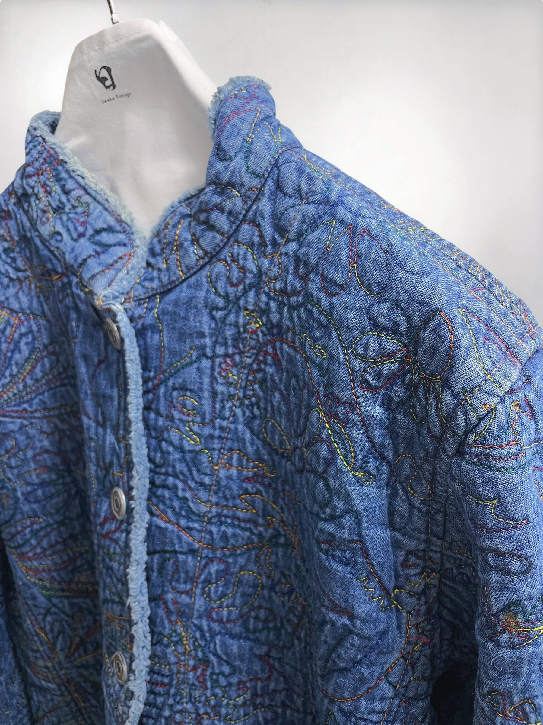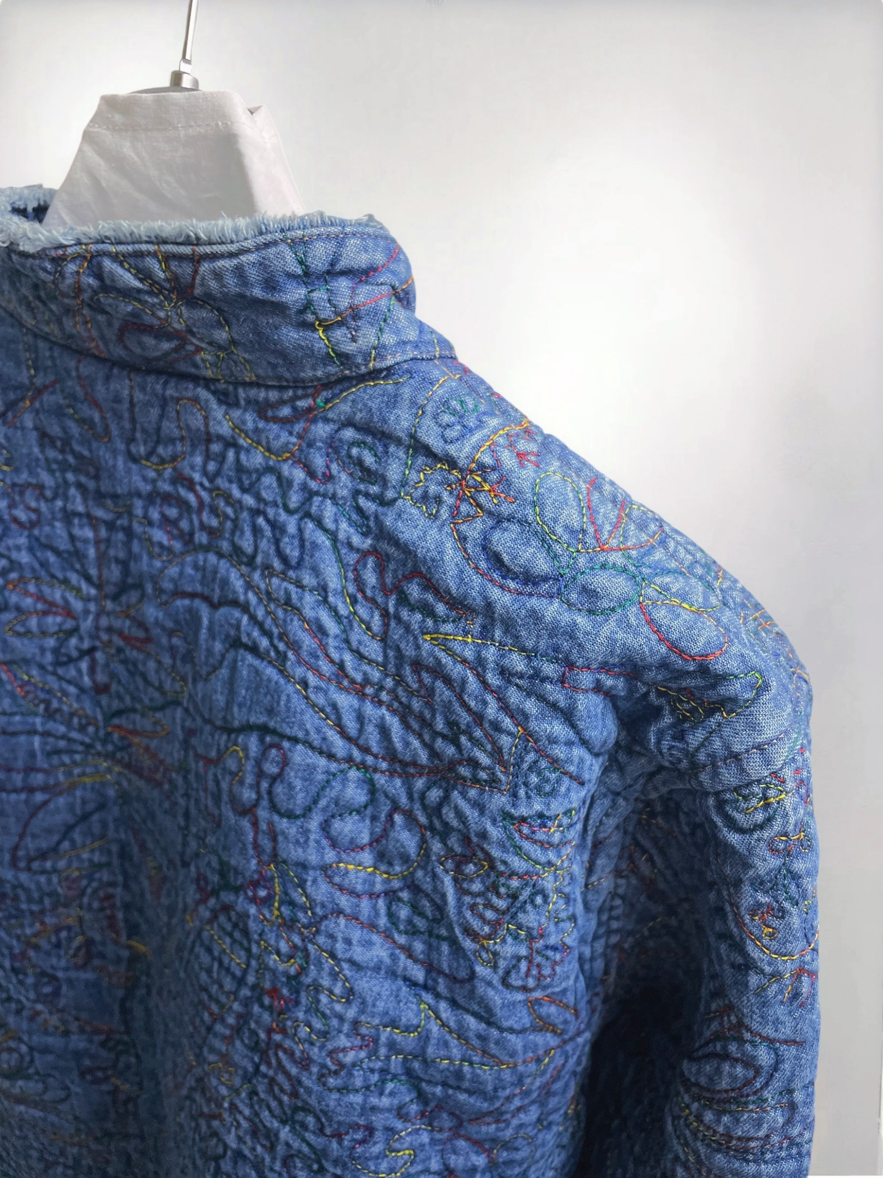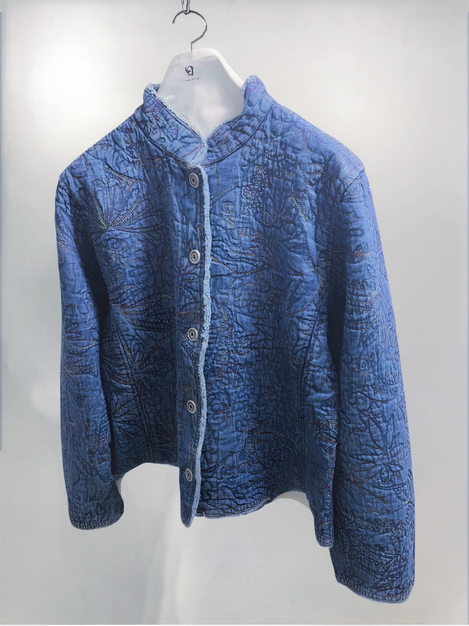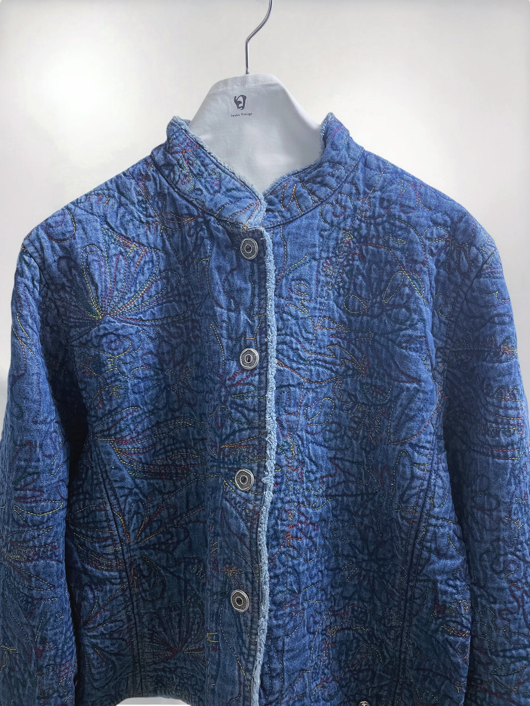 Vintage Blue Quilted Cotton Jacket with Allover Embroidery (90s) – Handcrafted Texture Appeal