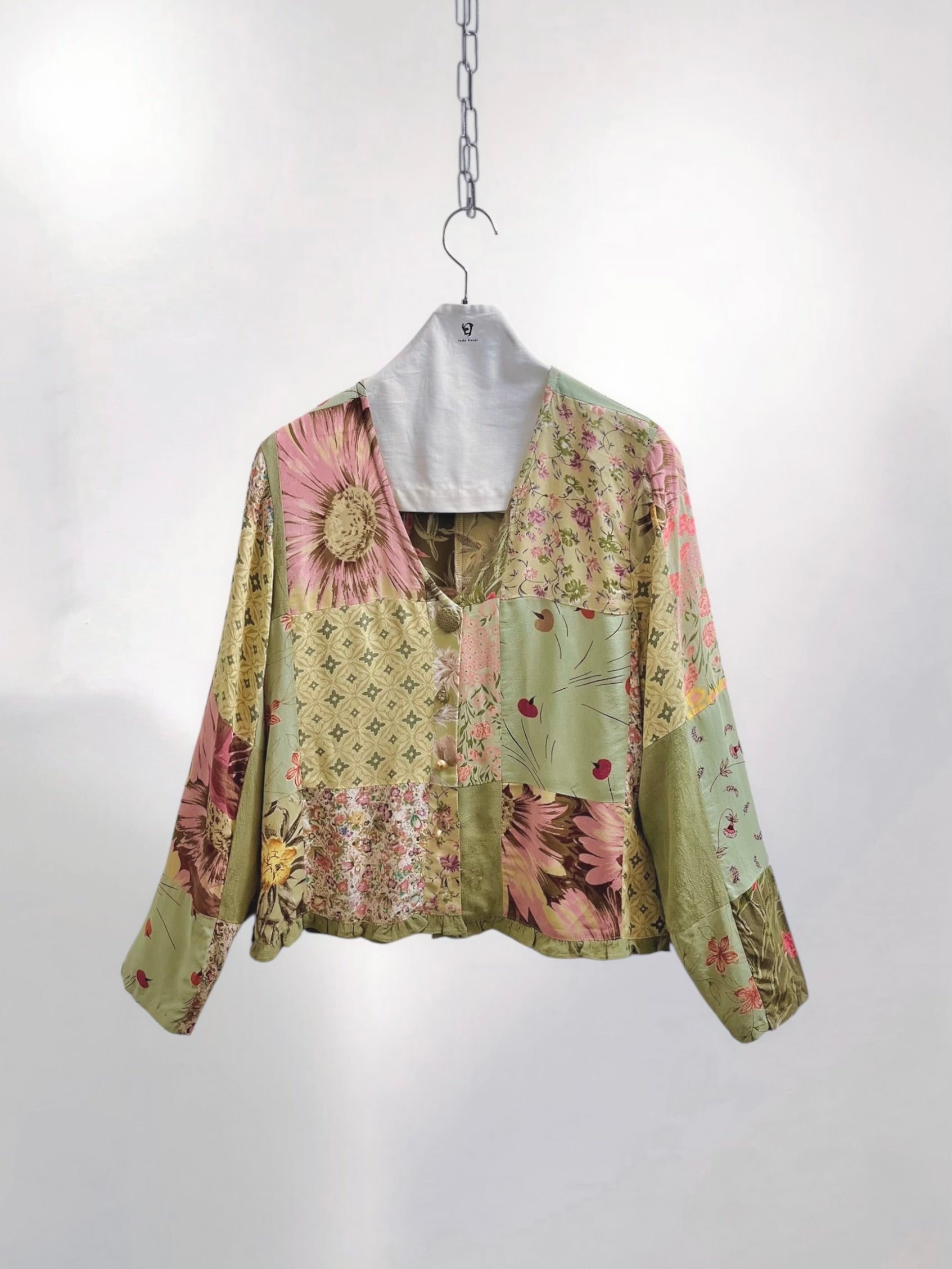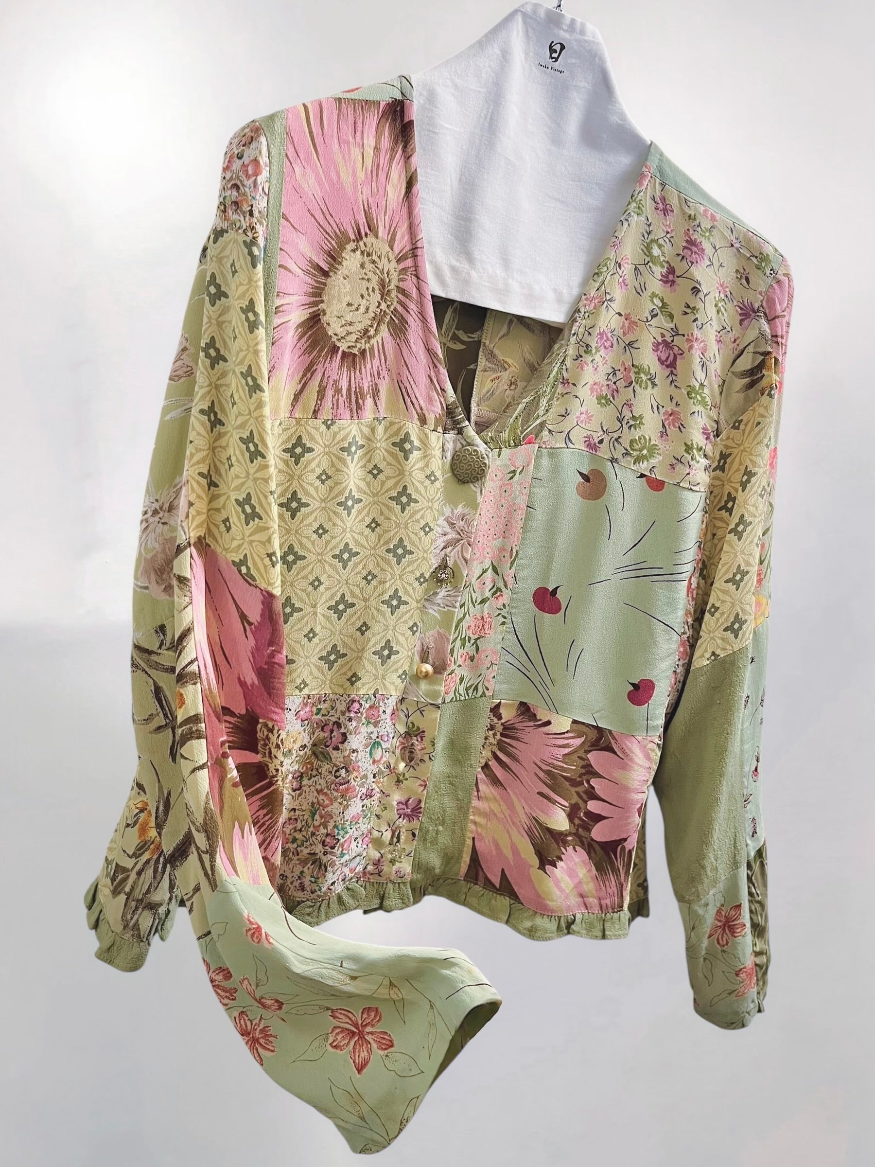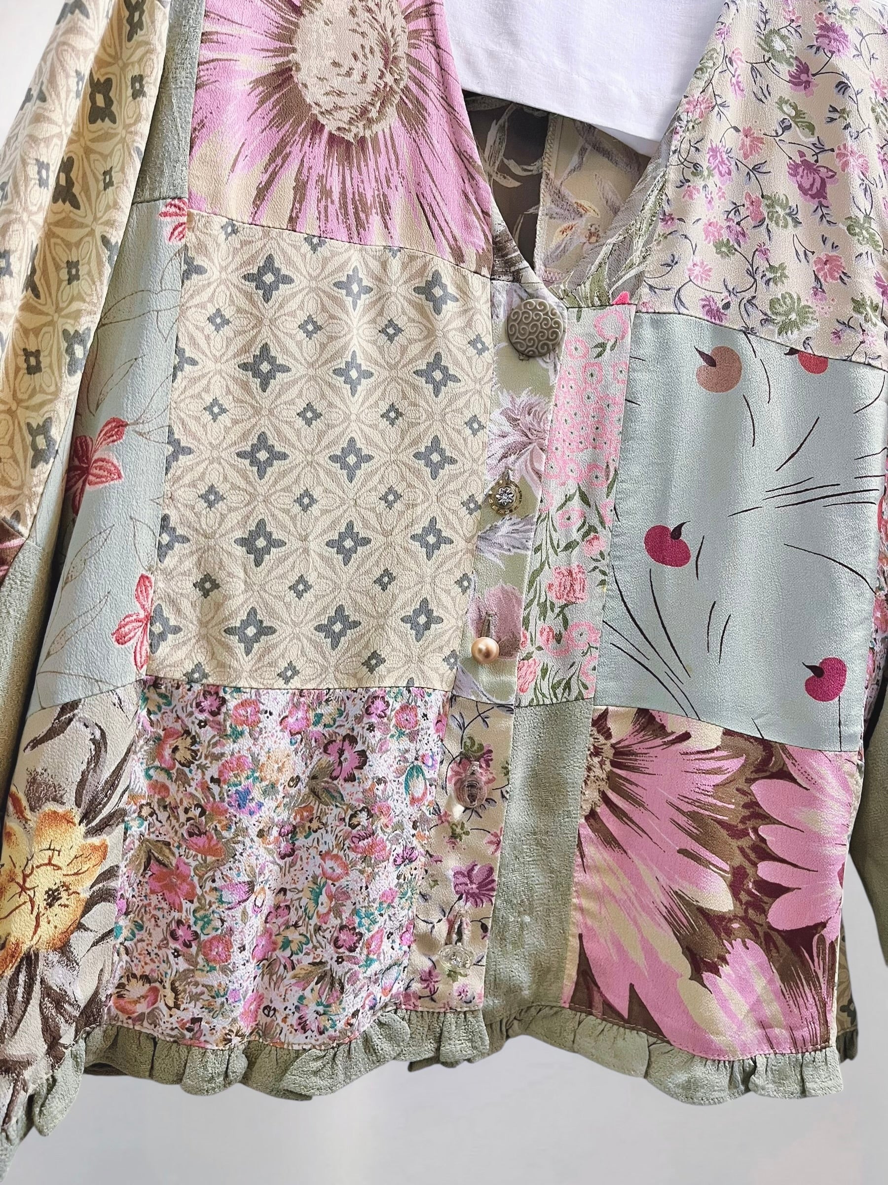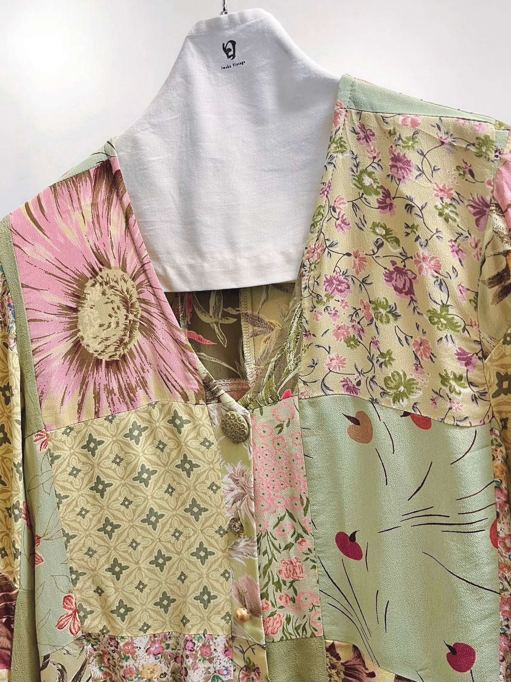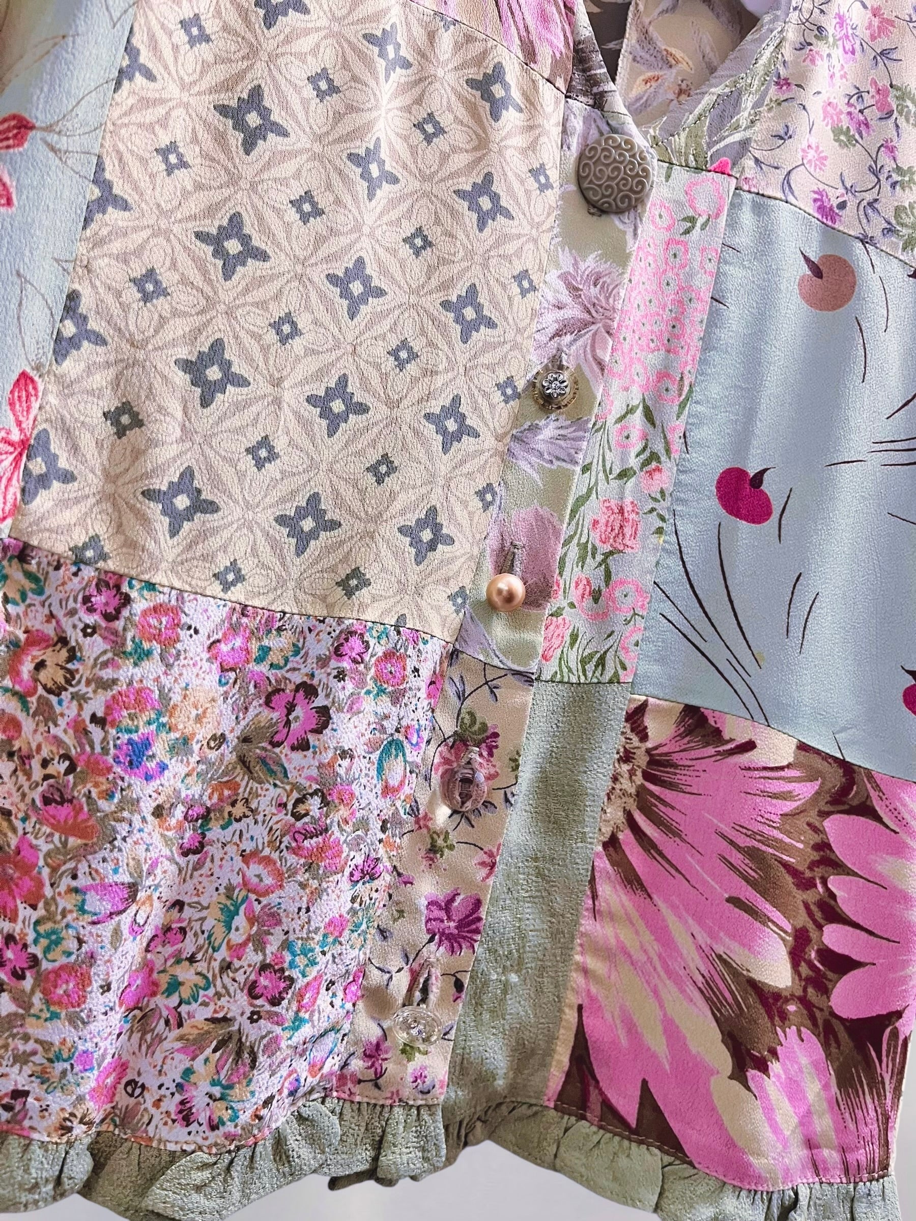 Vintage Sage Green Rayon Patchwork Blouse with Assorted Buttons (90s) – Eclectic Textile Composition