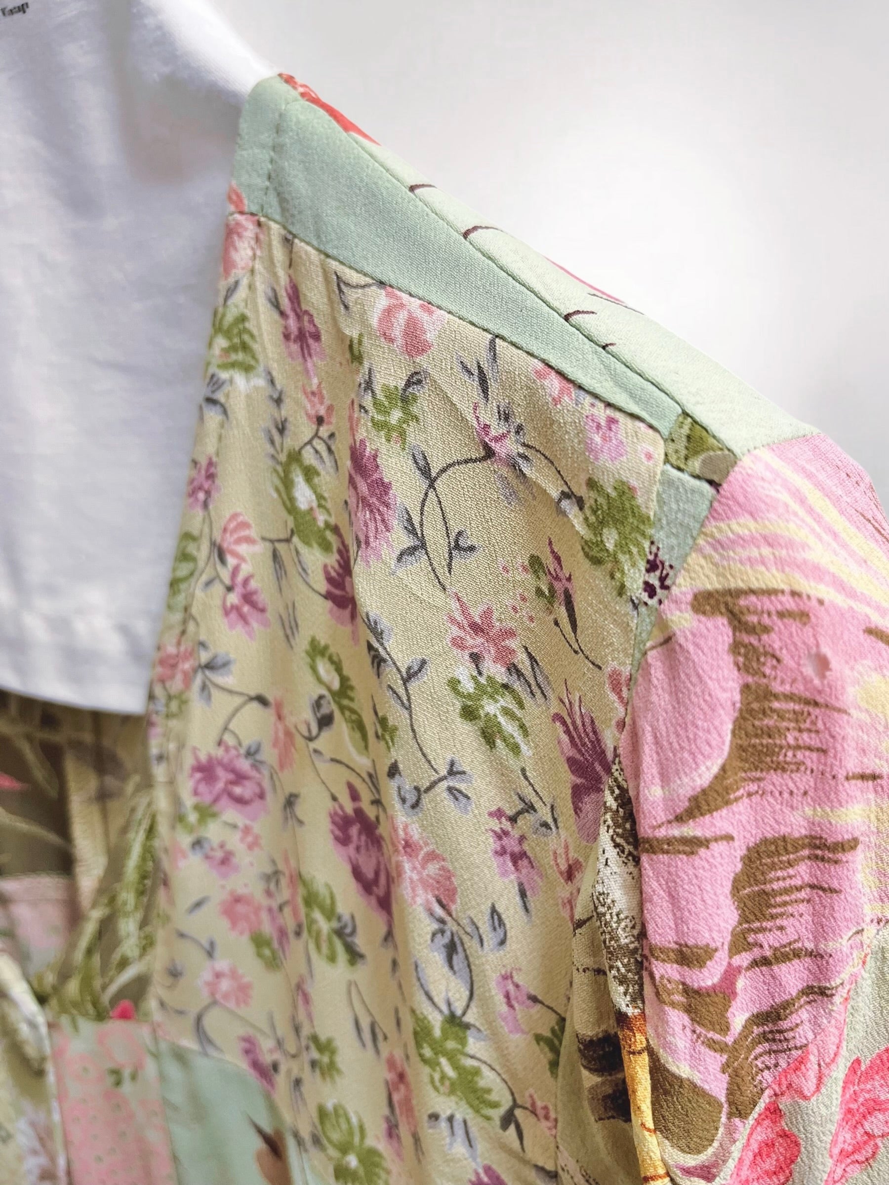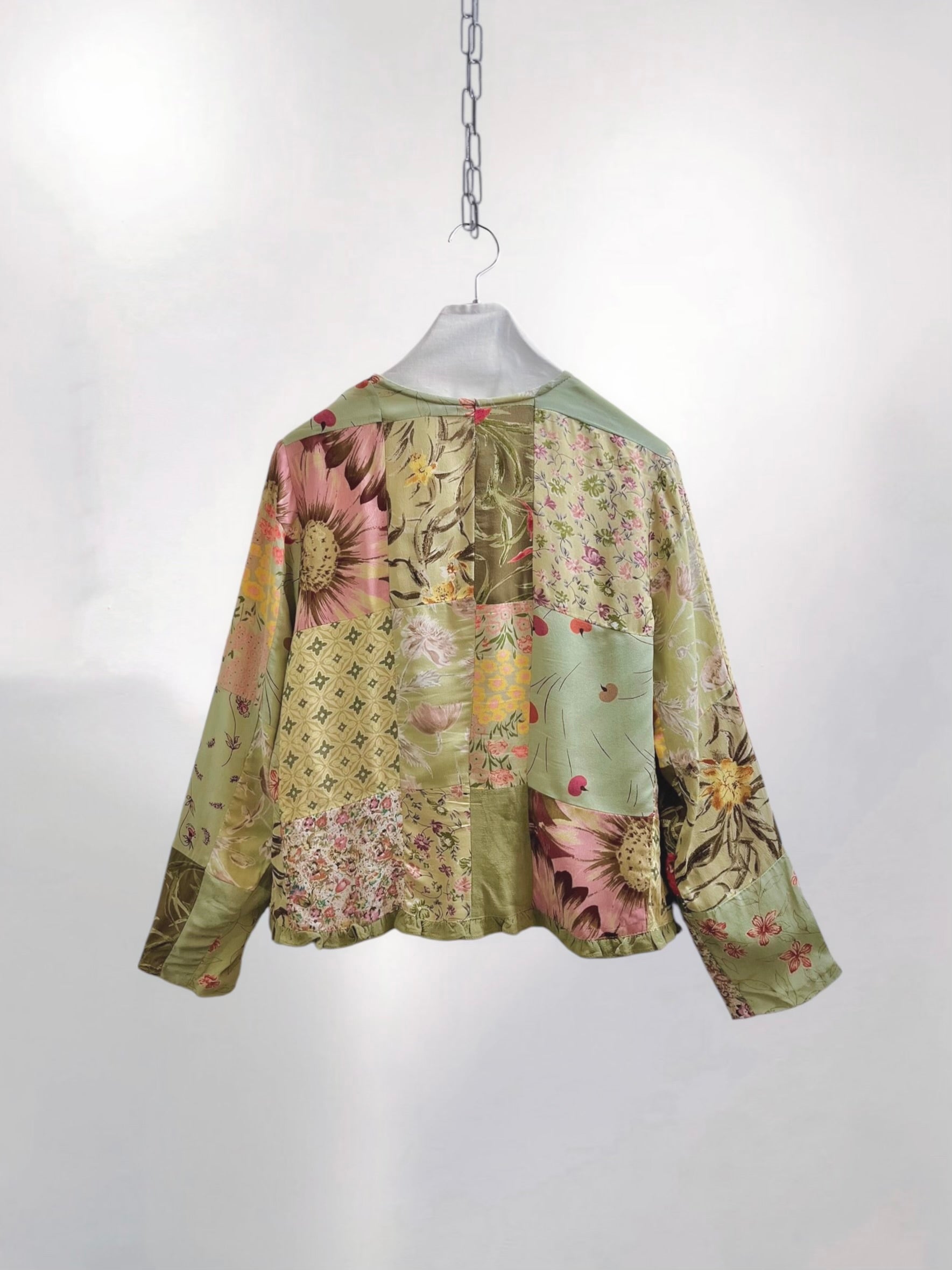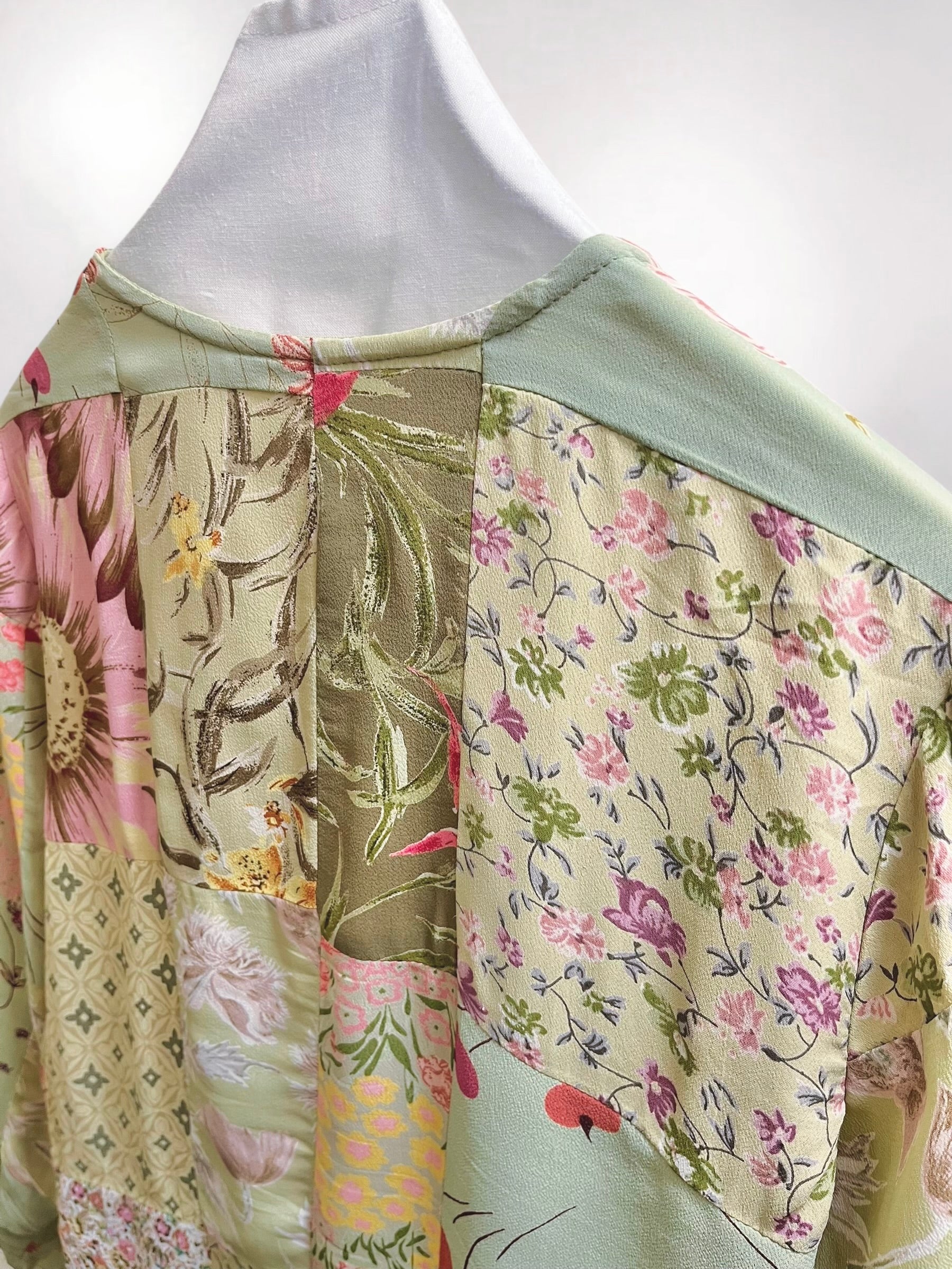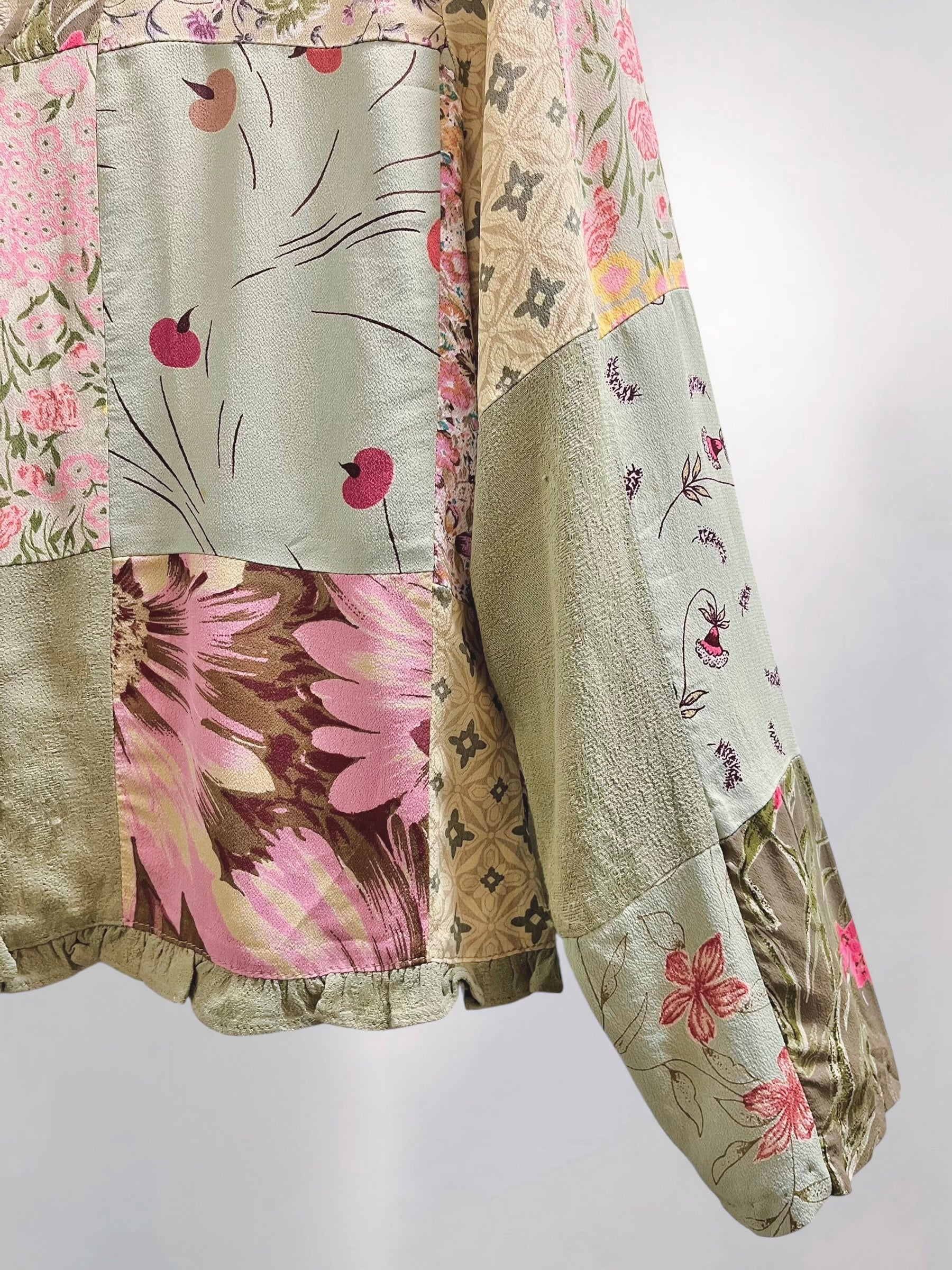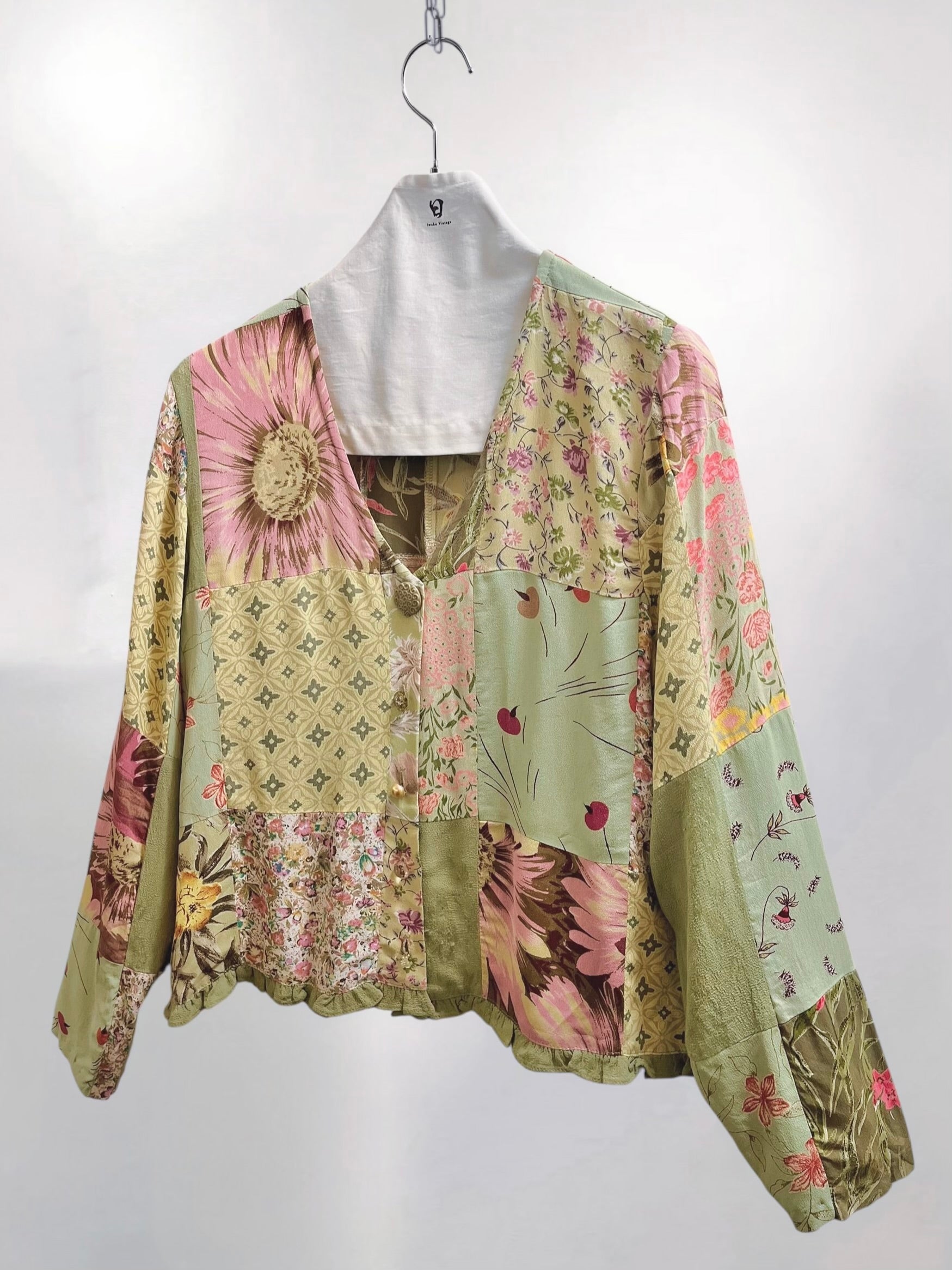 Vintage Sage Green Rayon Patchwork Blouse with Assorted Buttons (90s) – Eclectic Textile Composition