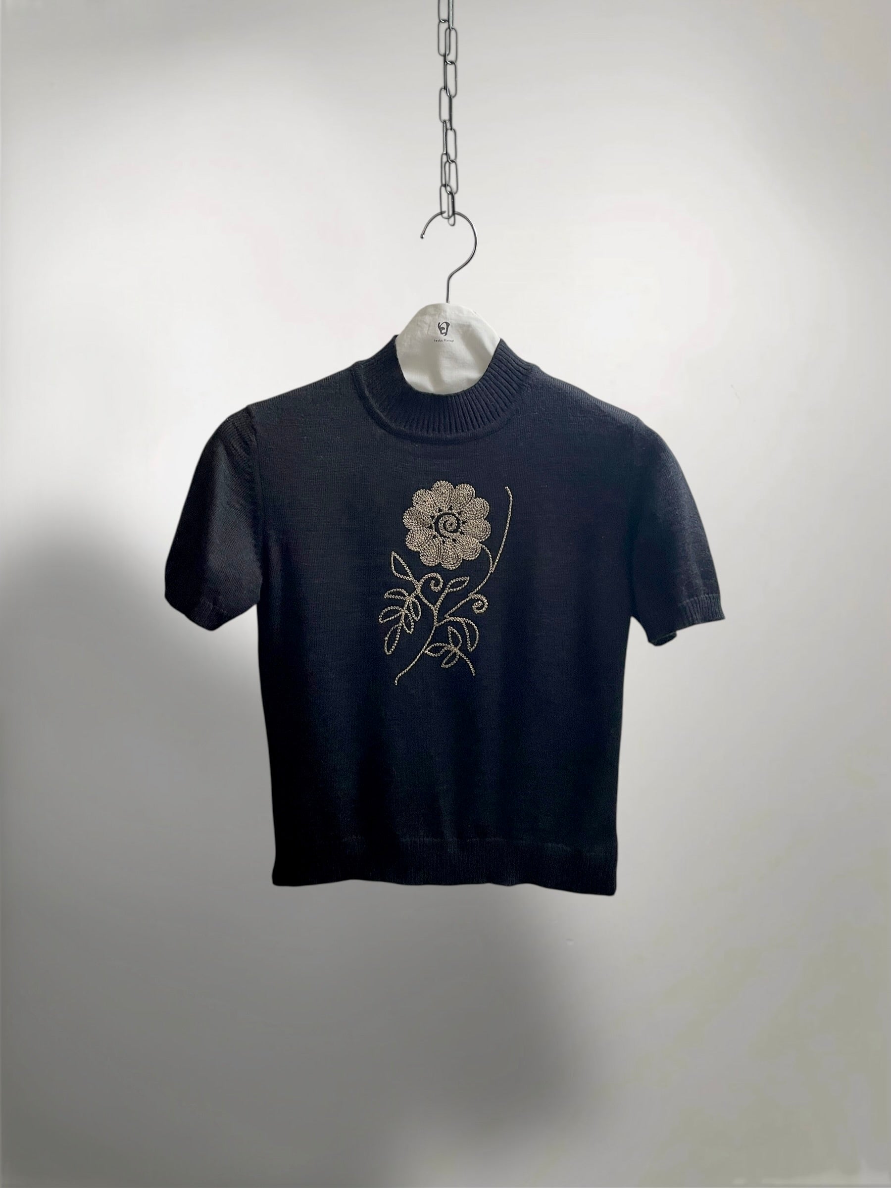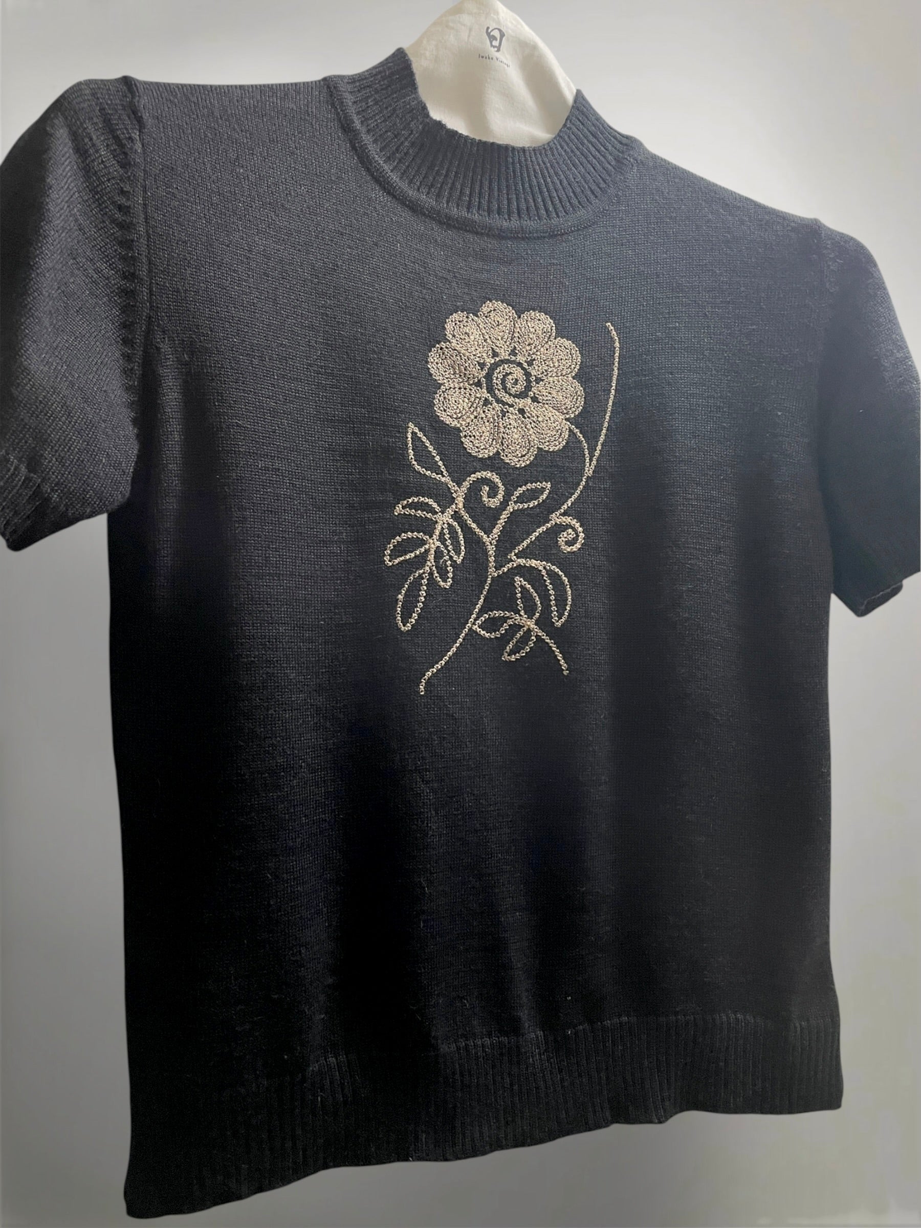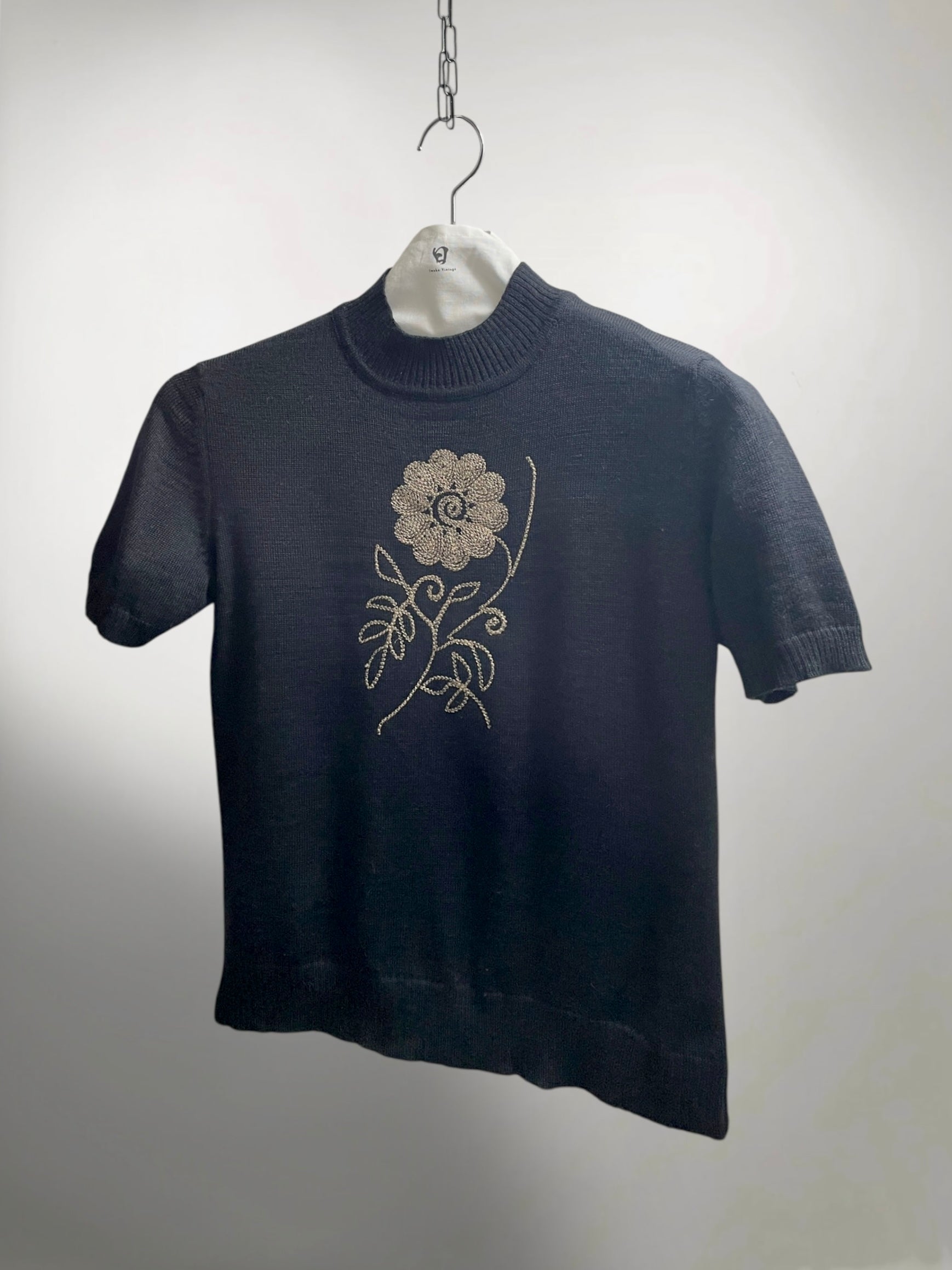 Black Short-Sleeve Knit Top with Floral Embroidery (Early 2000s) – Refined Botanical Accent