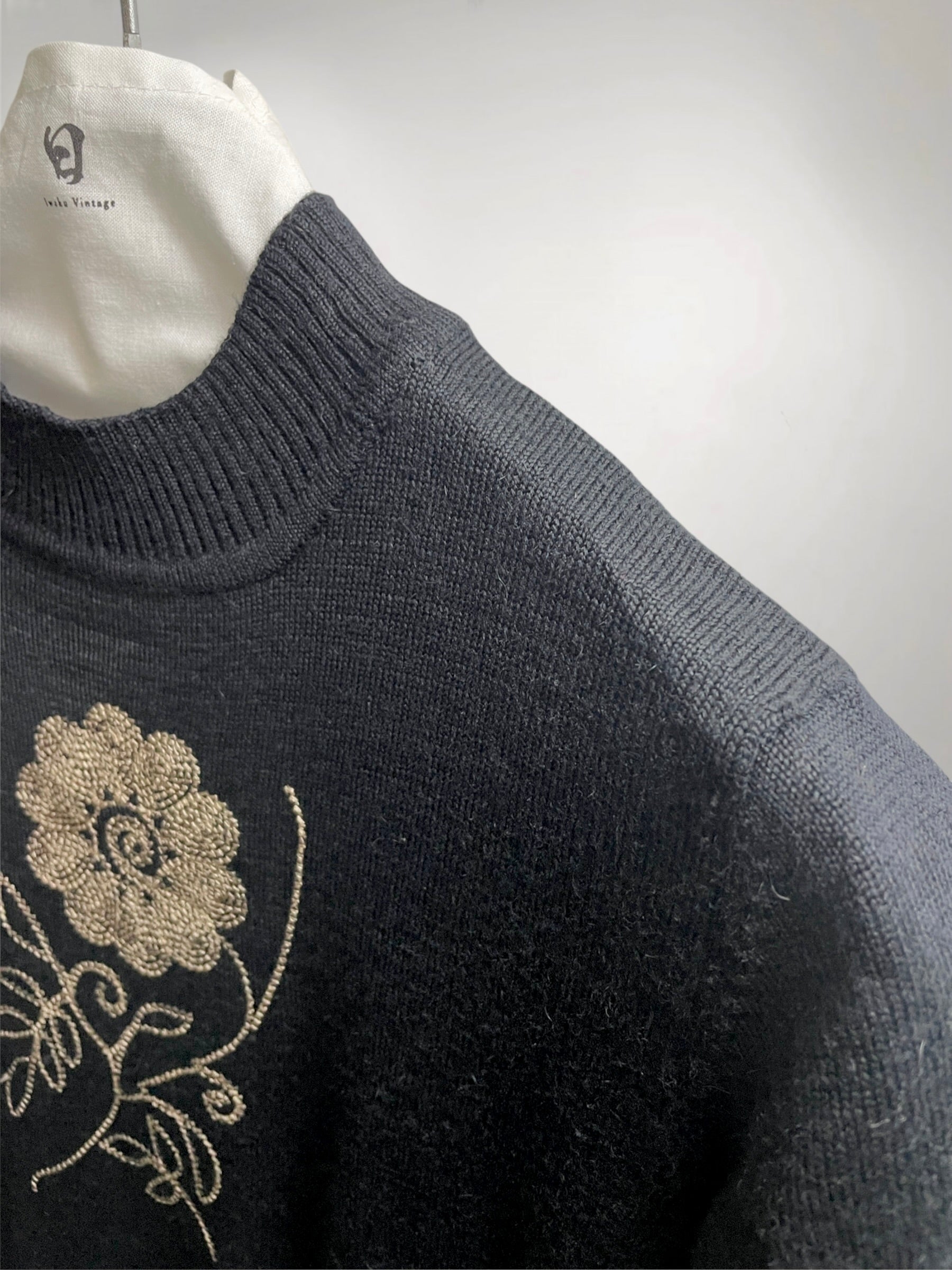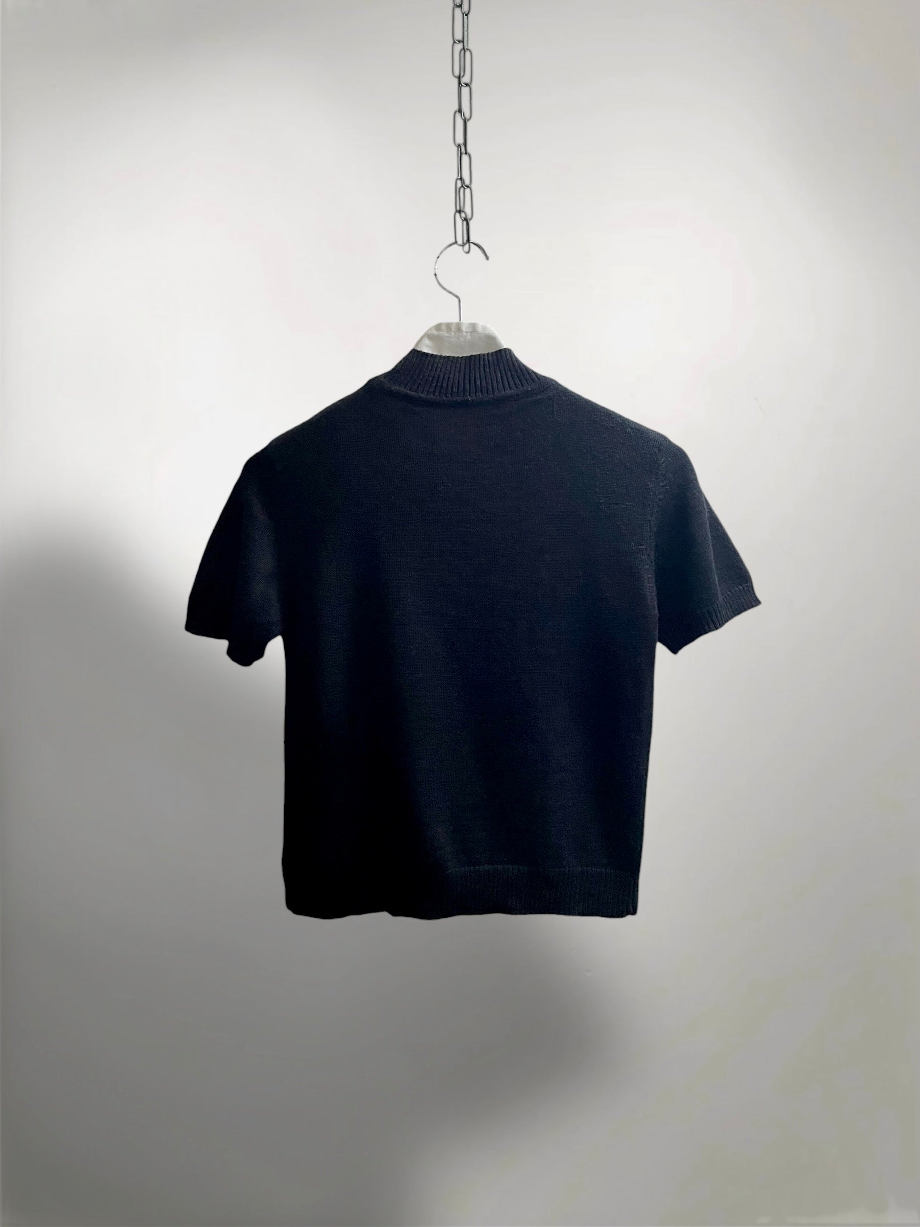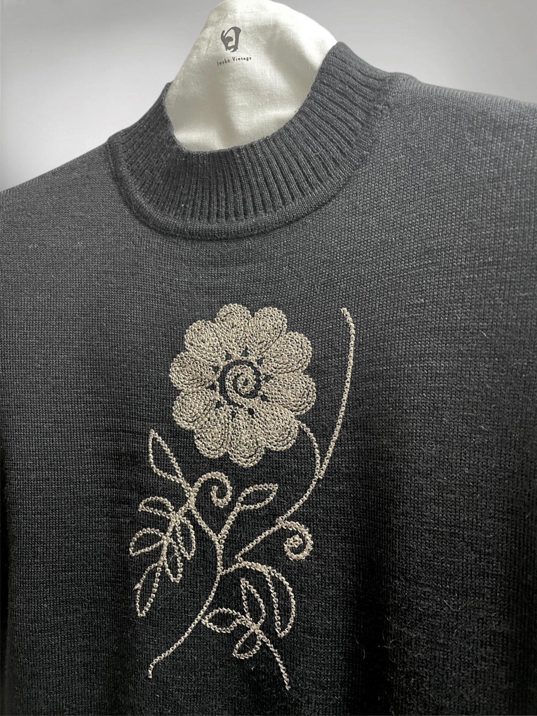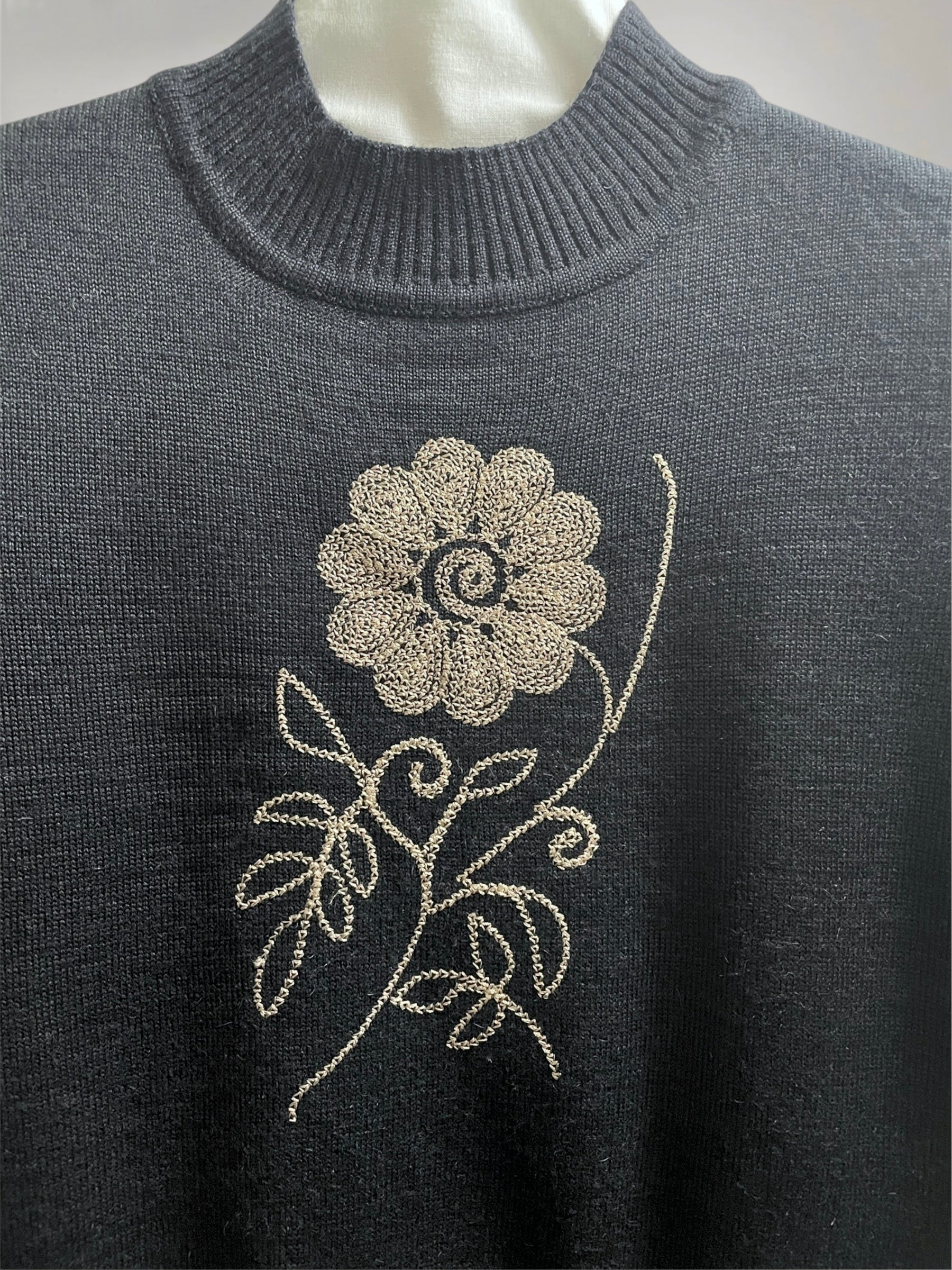 Black Short-Sleeve Knit Top with Floral Embroidery (Early 2000s) – Refined Botanical Accent