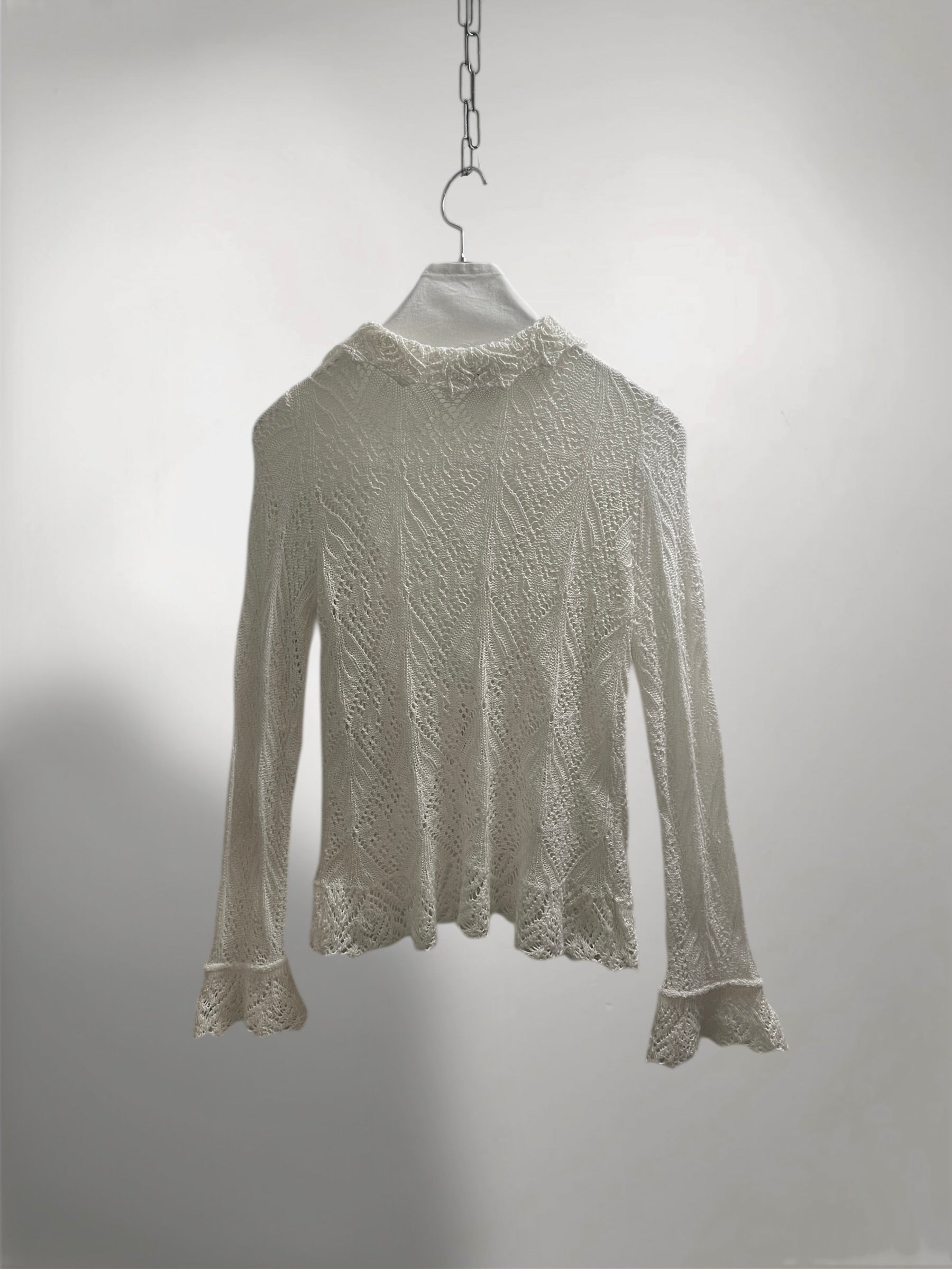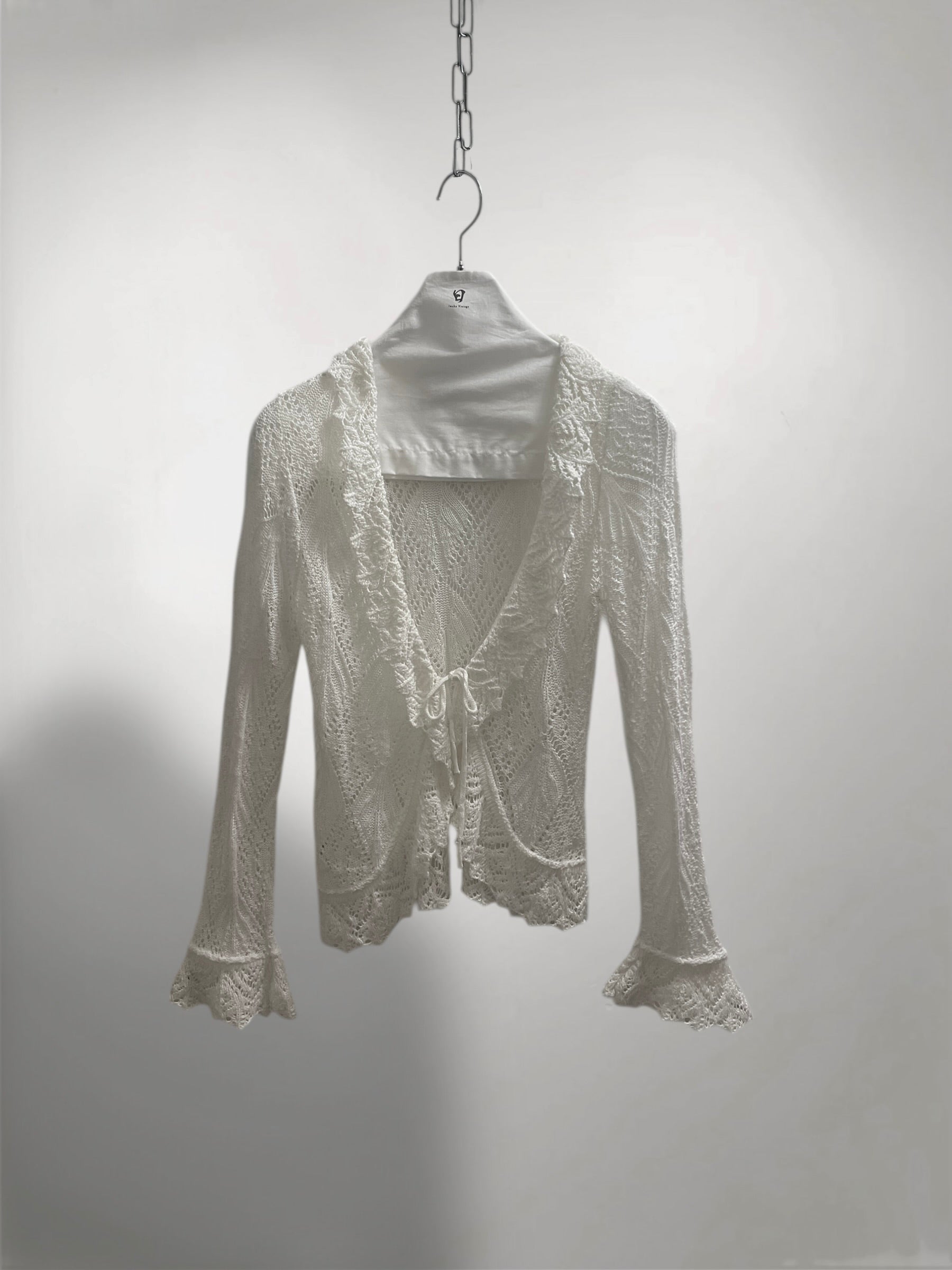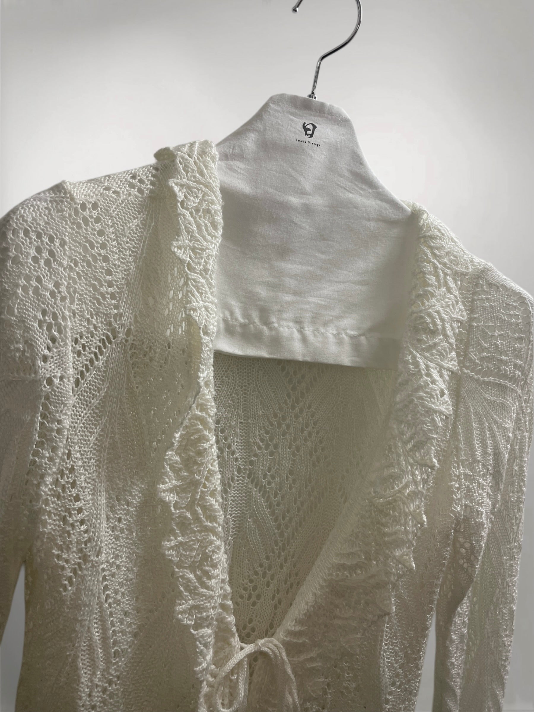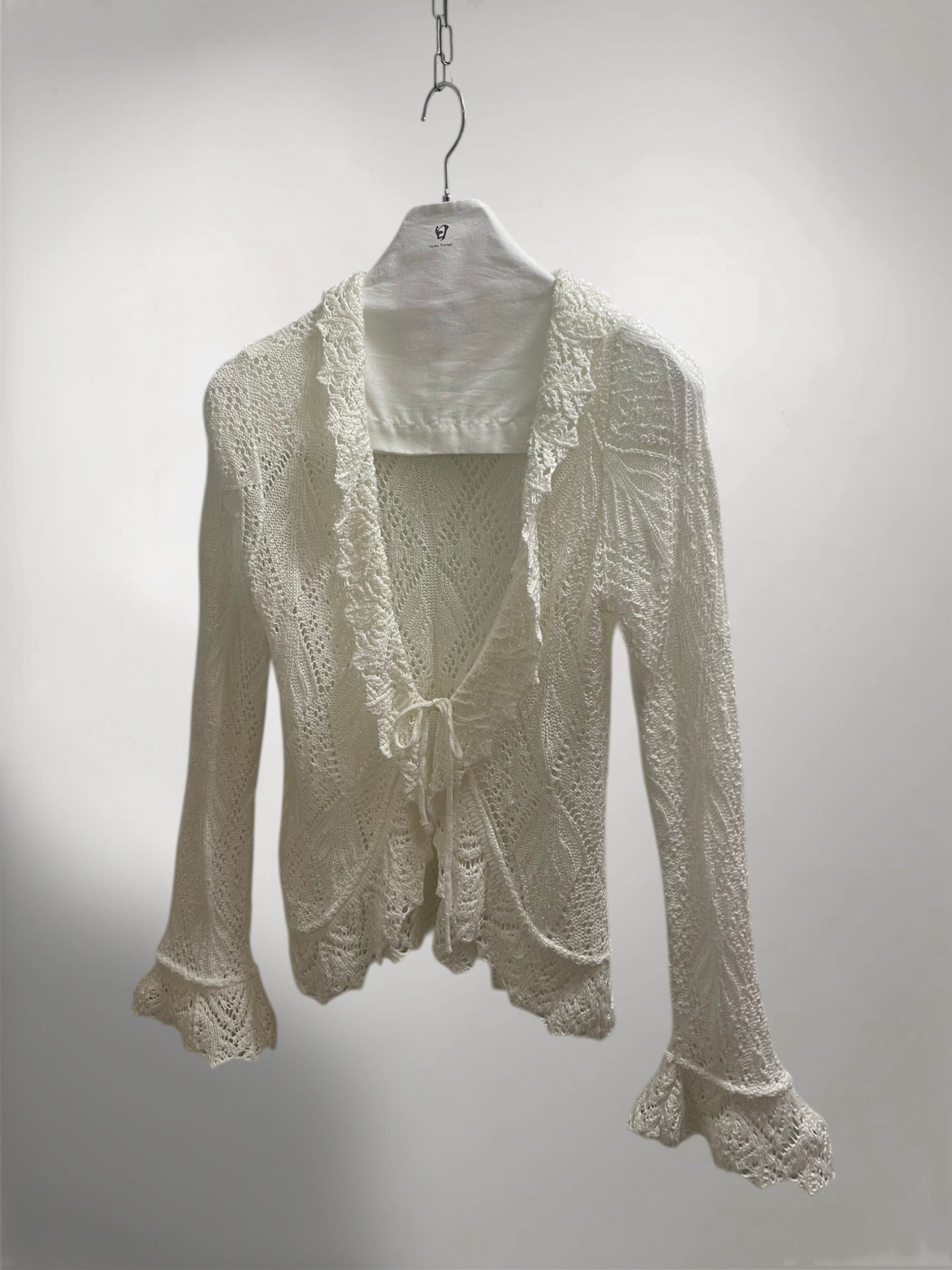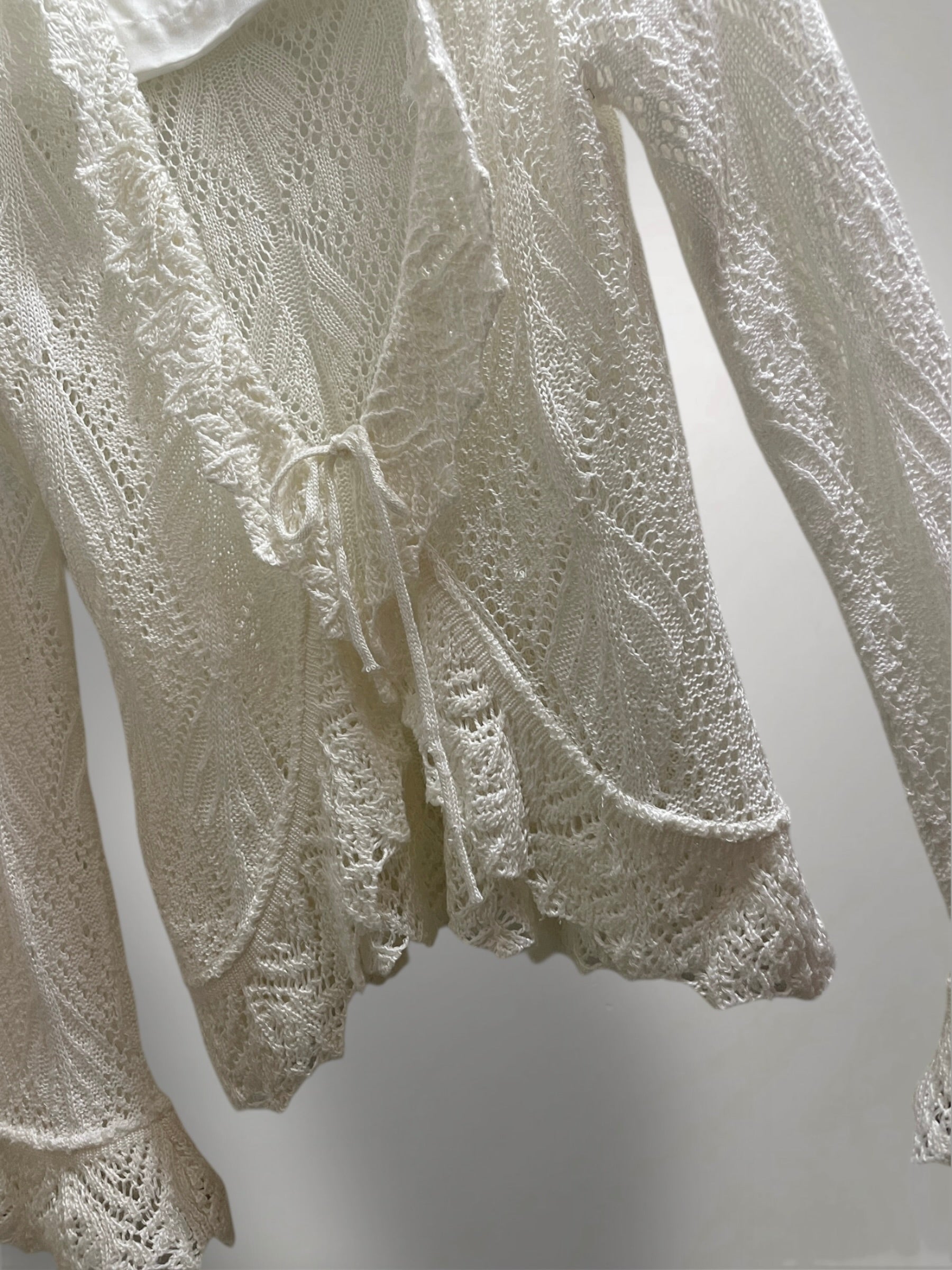 Ivory Open-Knit Cardigan with Ruffled Trim and Lace-Up Front (Early 2000s) – Sheer Texture & Flared Sleeve Silhouette