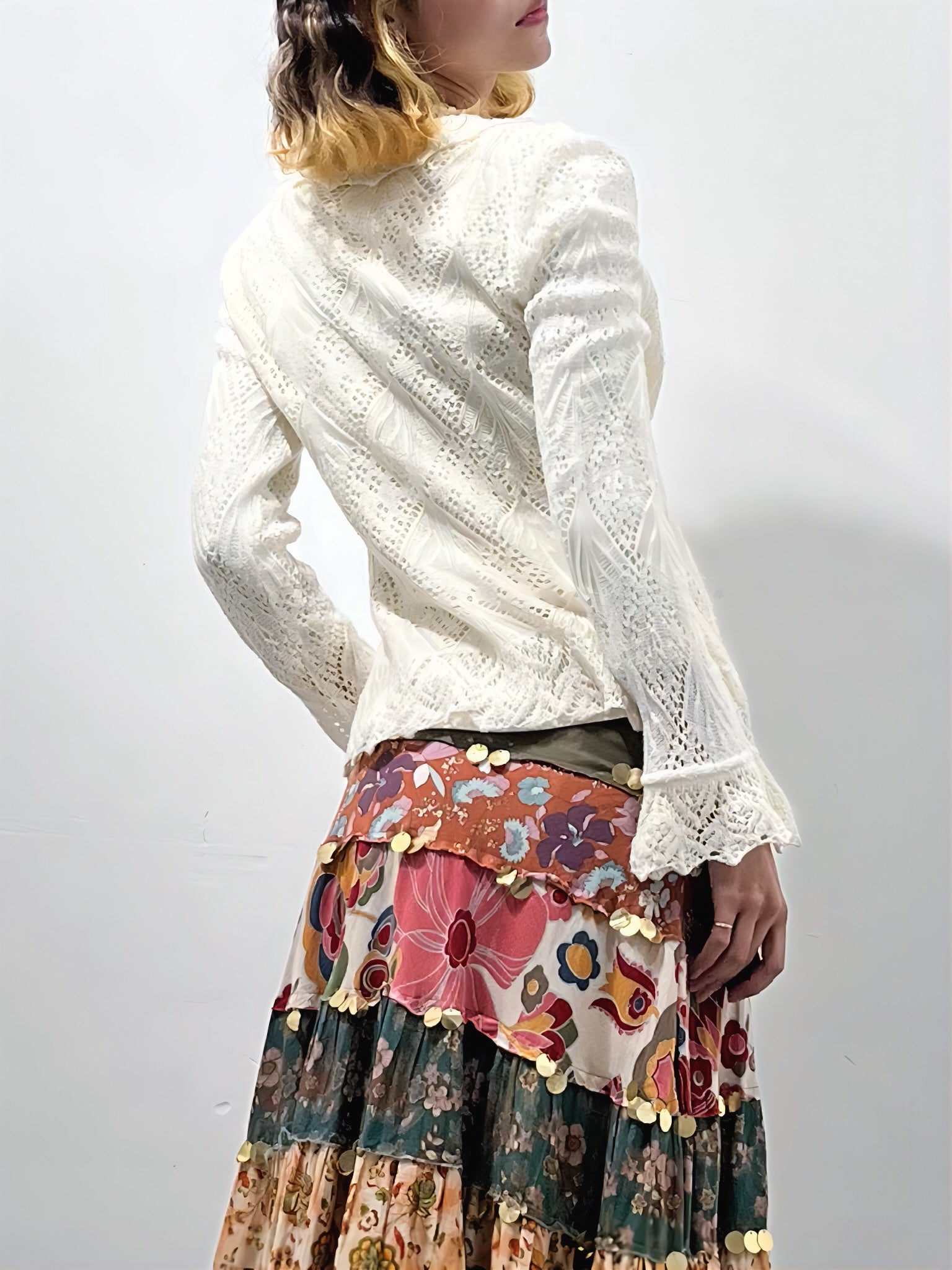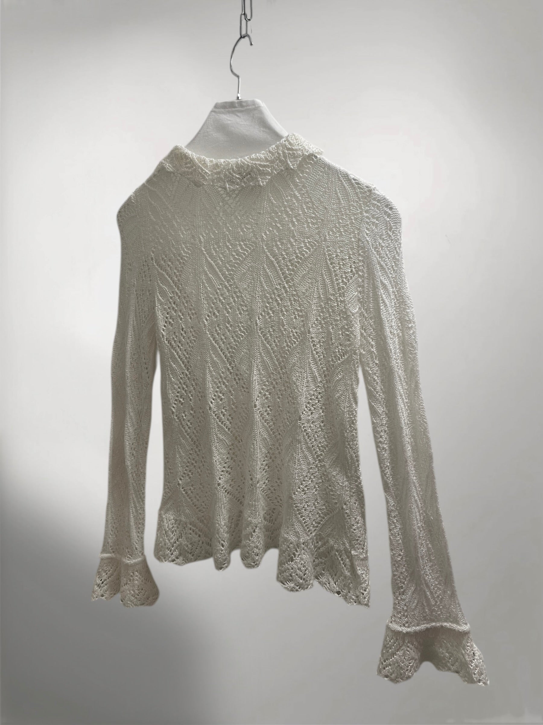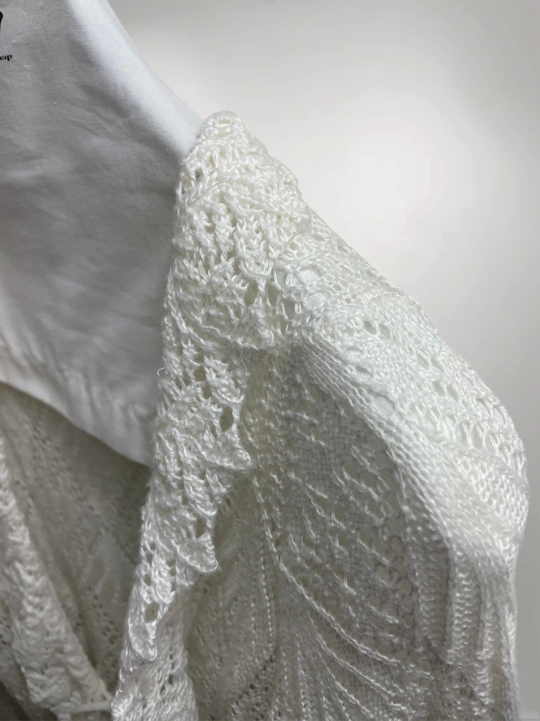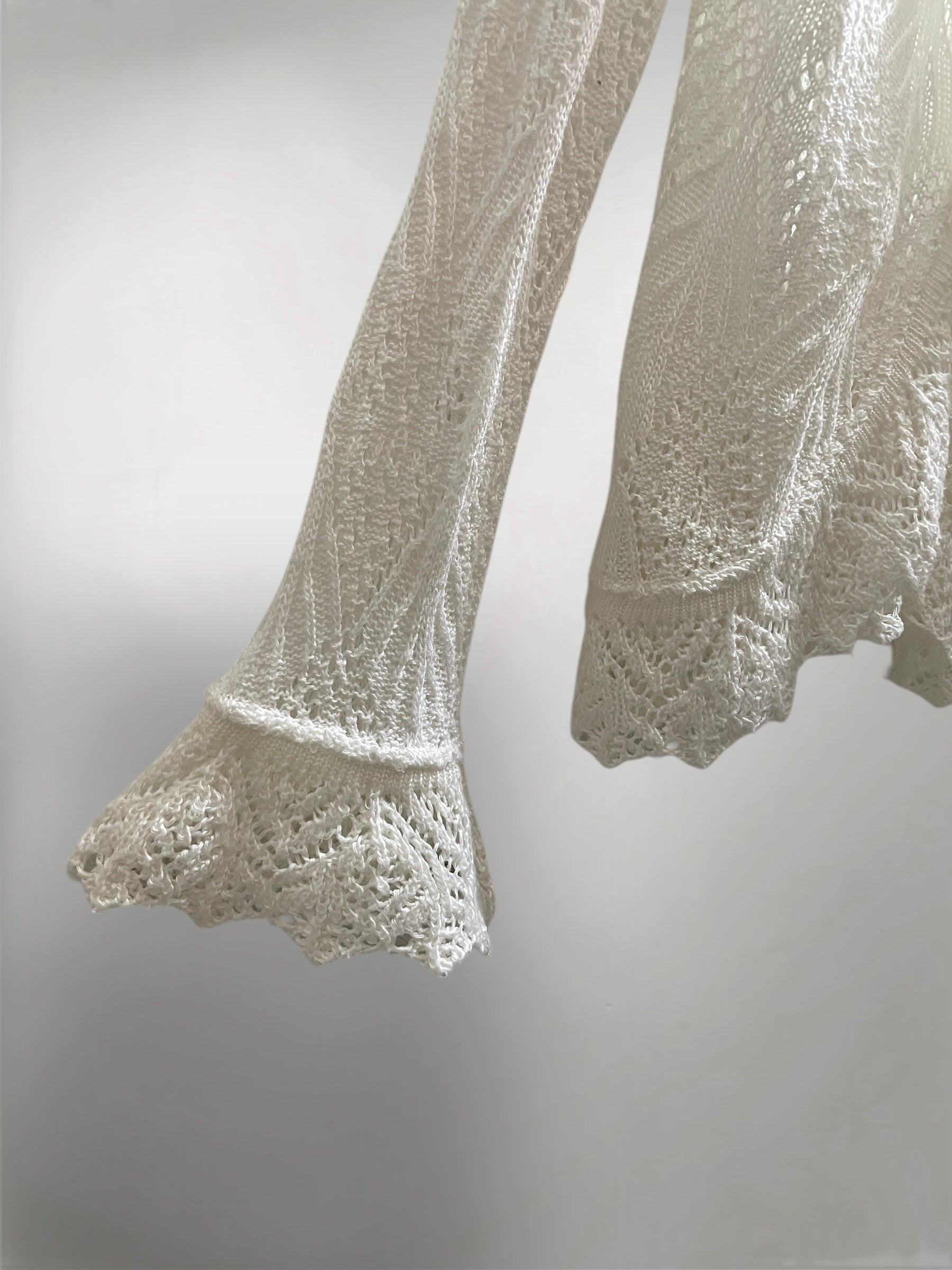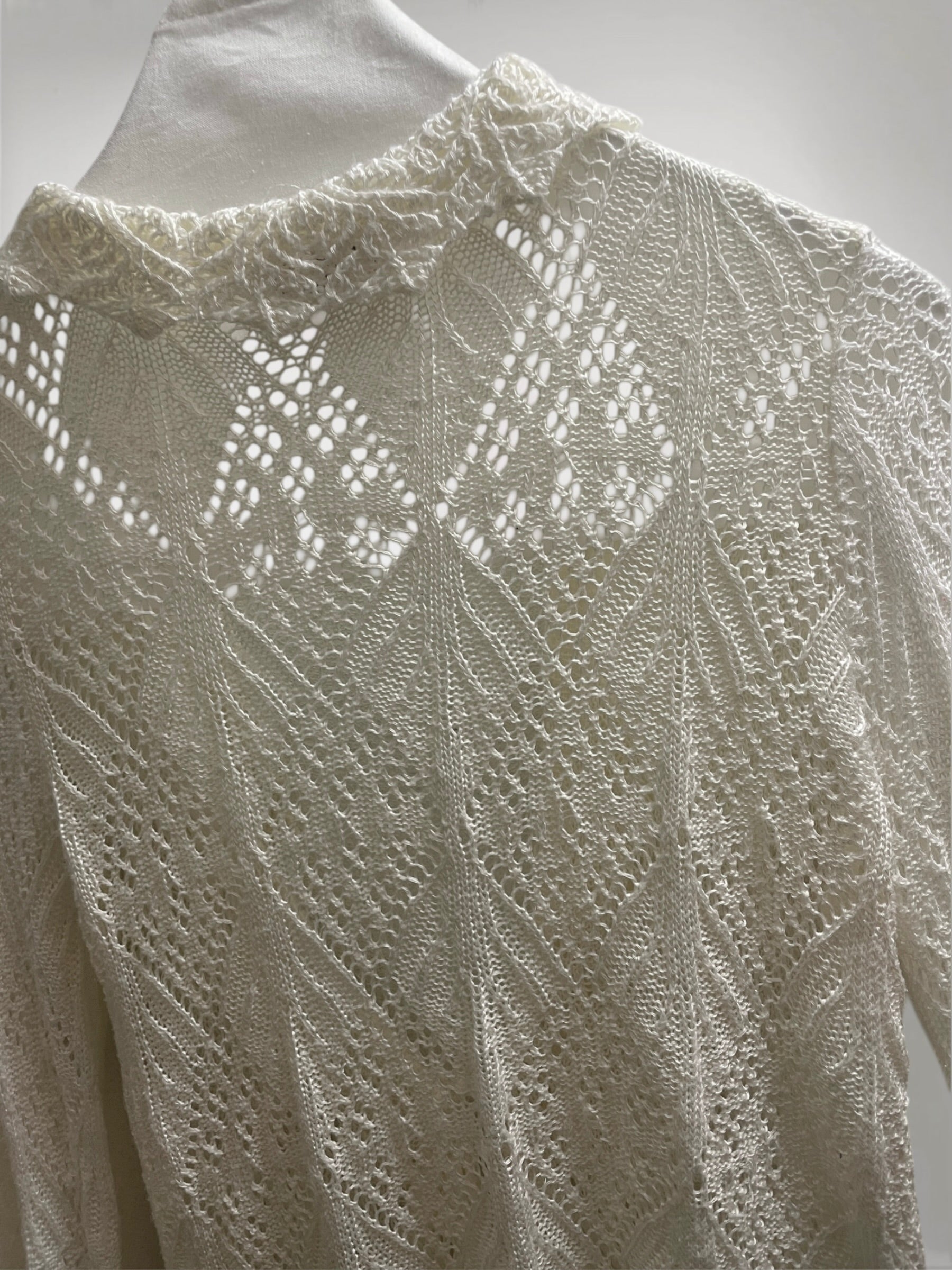 Ivory Open-Knit Cardigan with Ruffled Trim and Lace-Up Front (Early 2000s) – Sheer Texture & Flared Sleeve Silhouette
