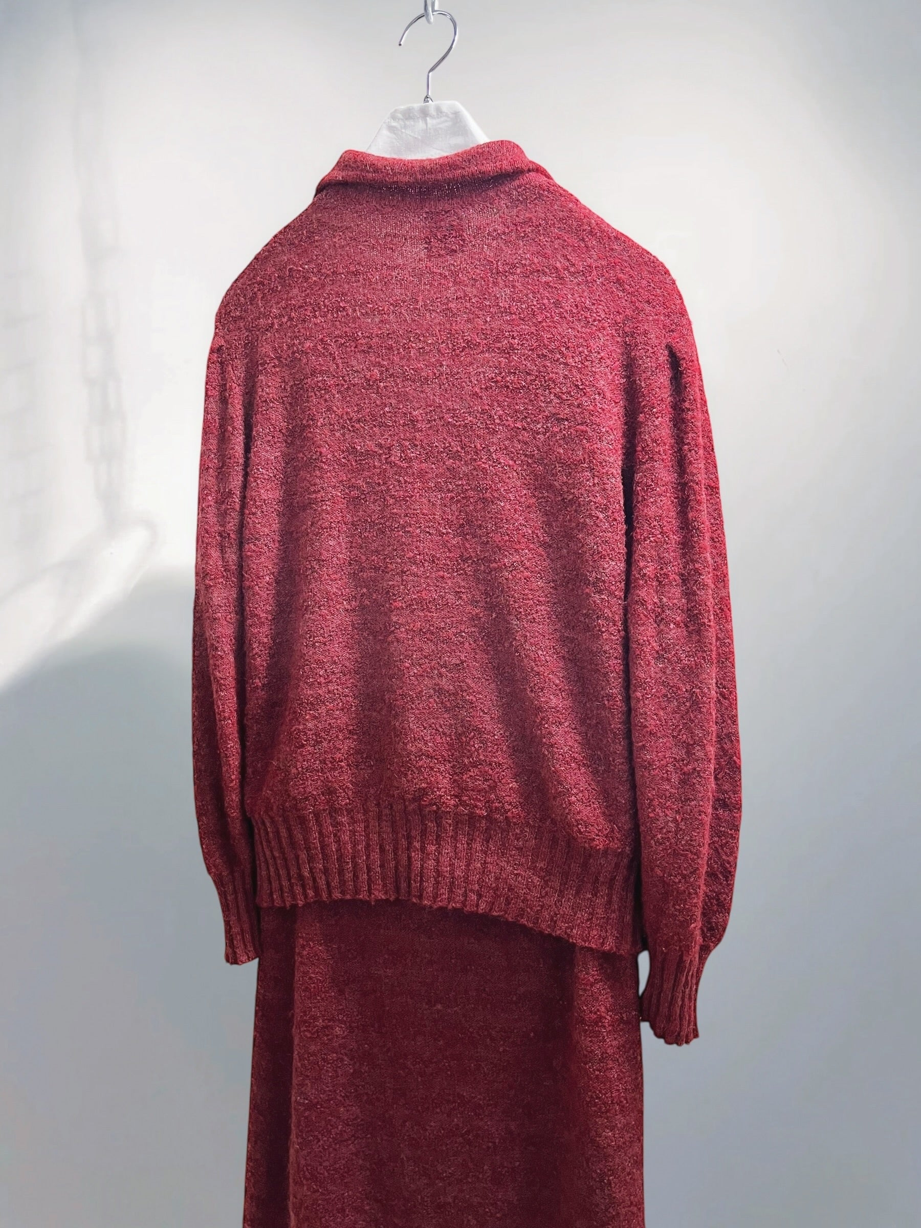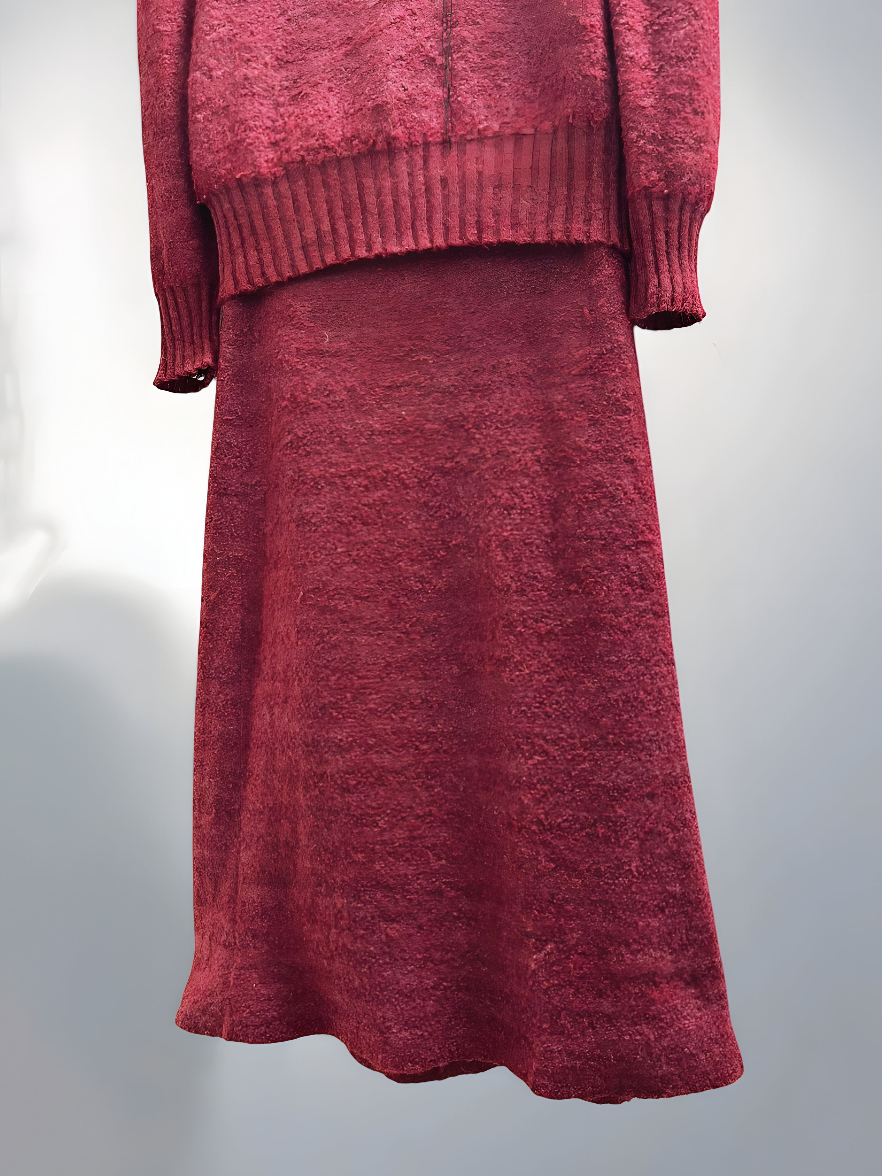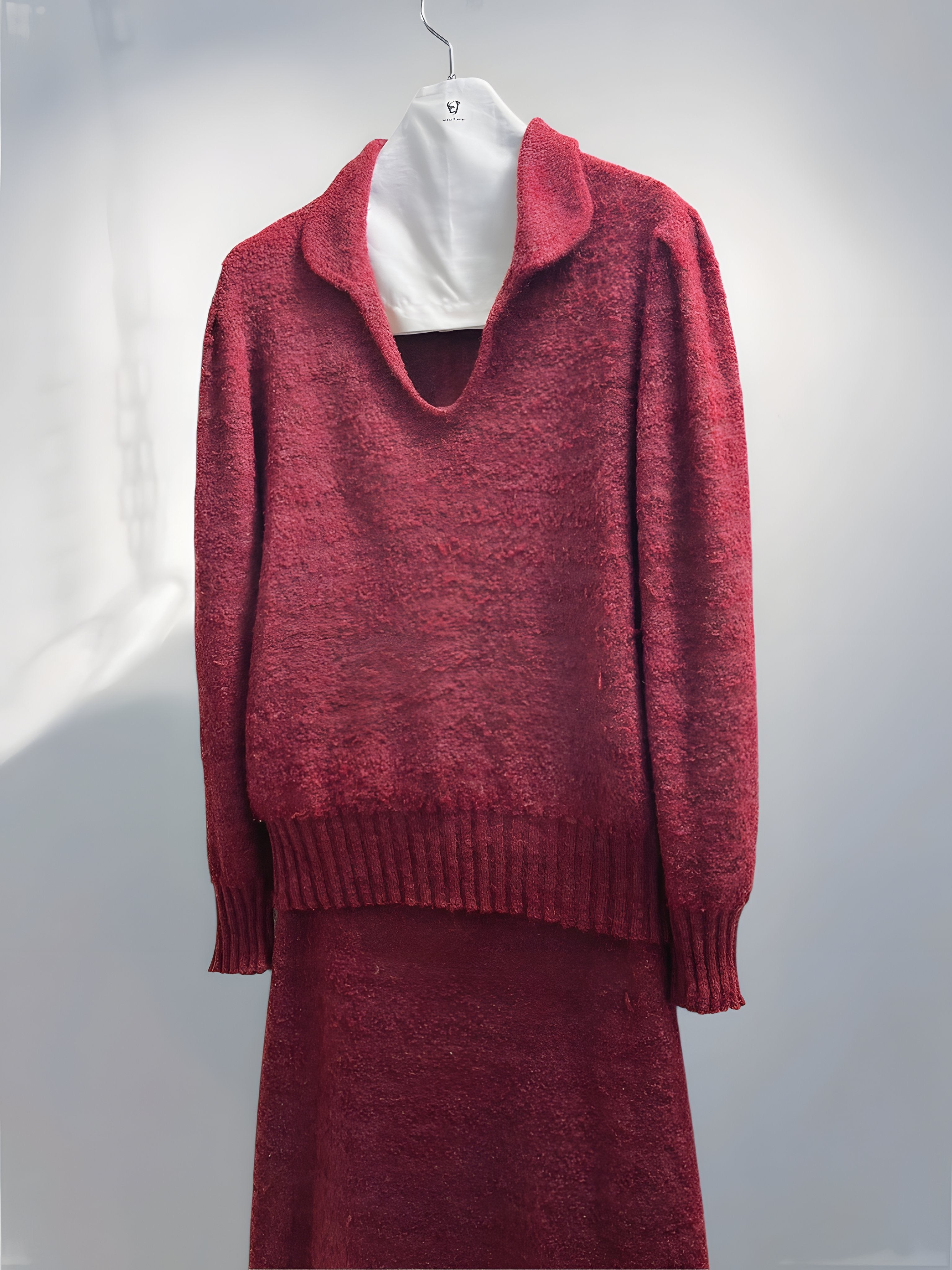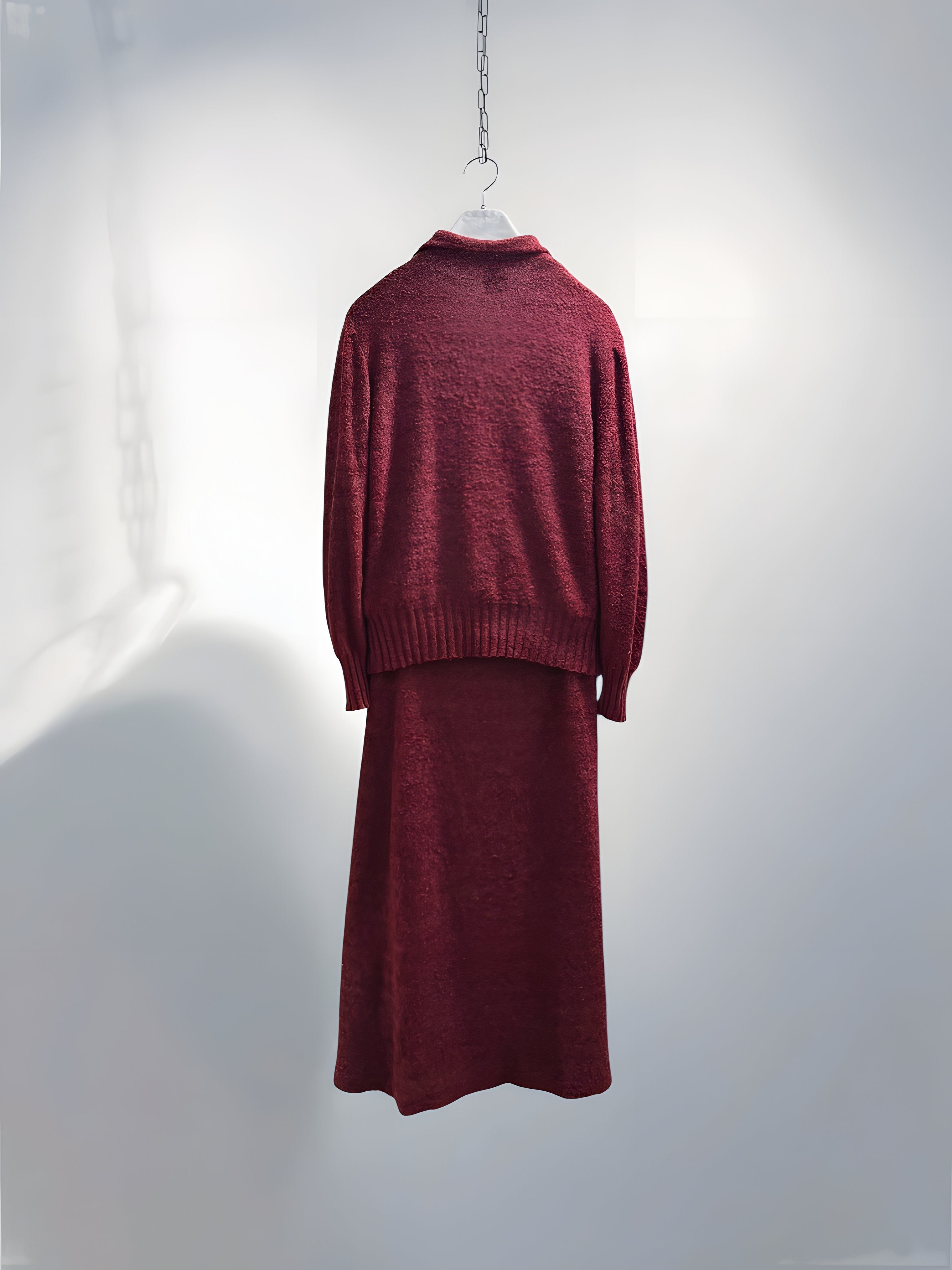 Vintage Bordeaux Wool Blend Knit Set with Open Collar (70s) – Textured Bouclé Finish