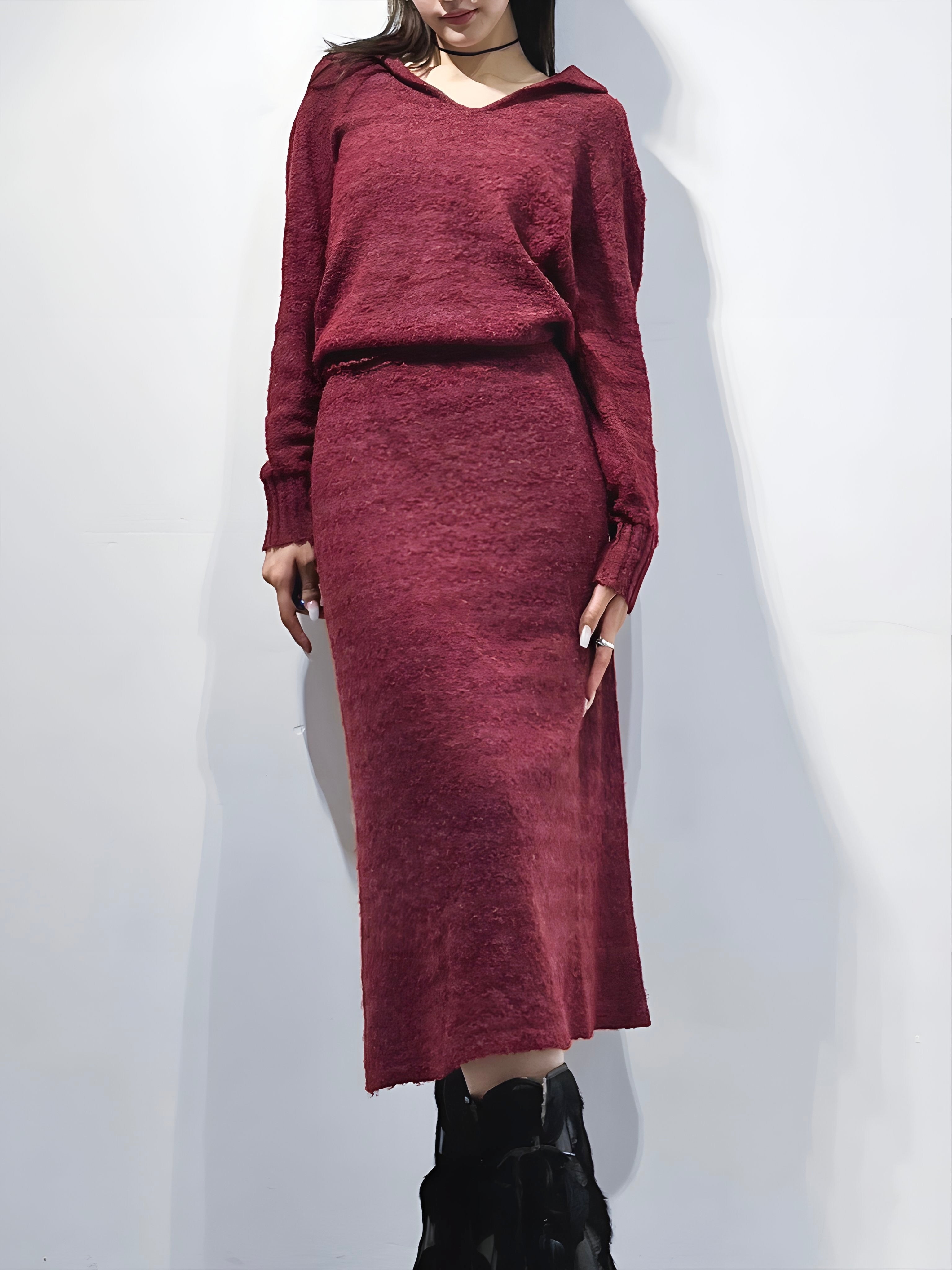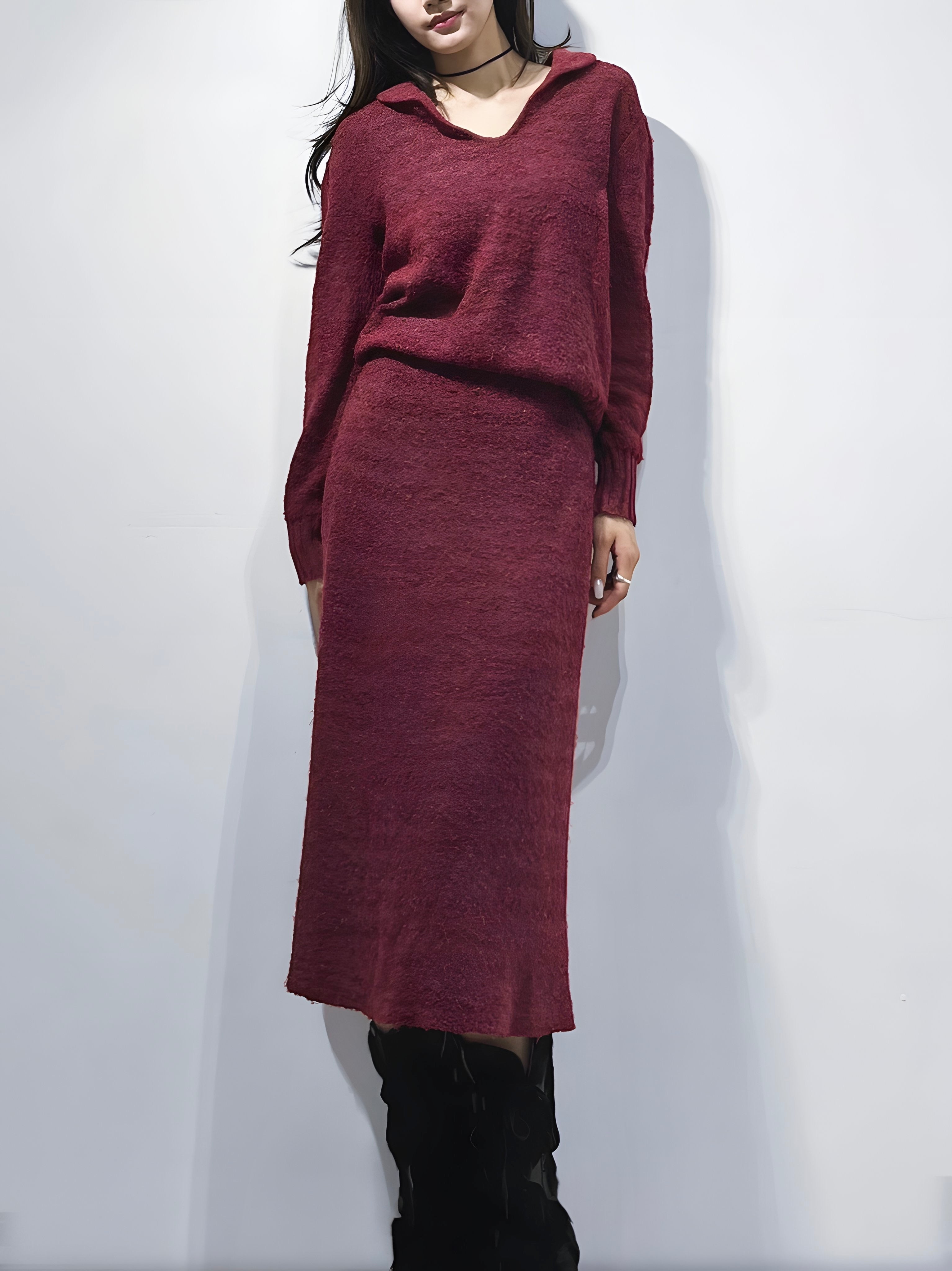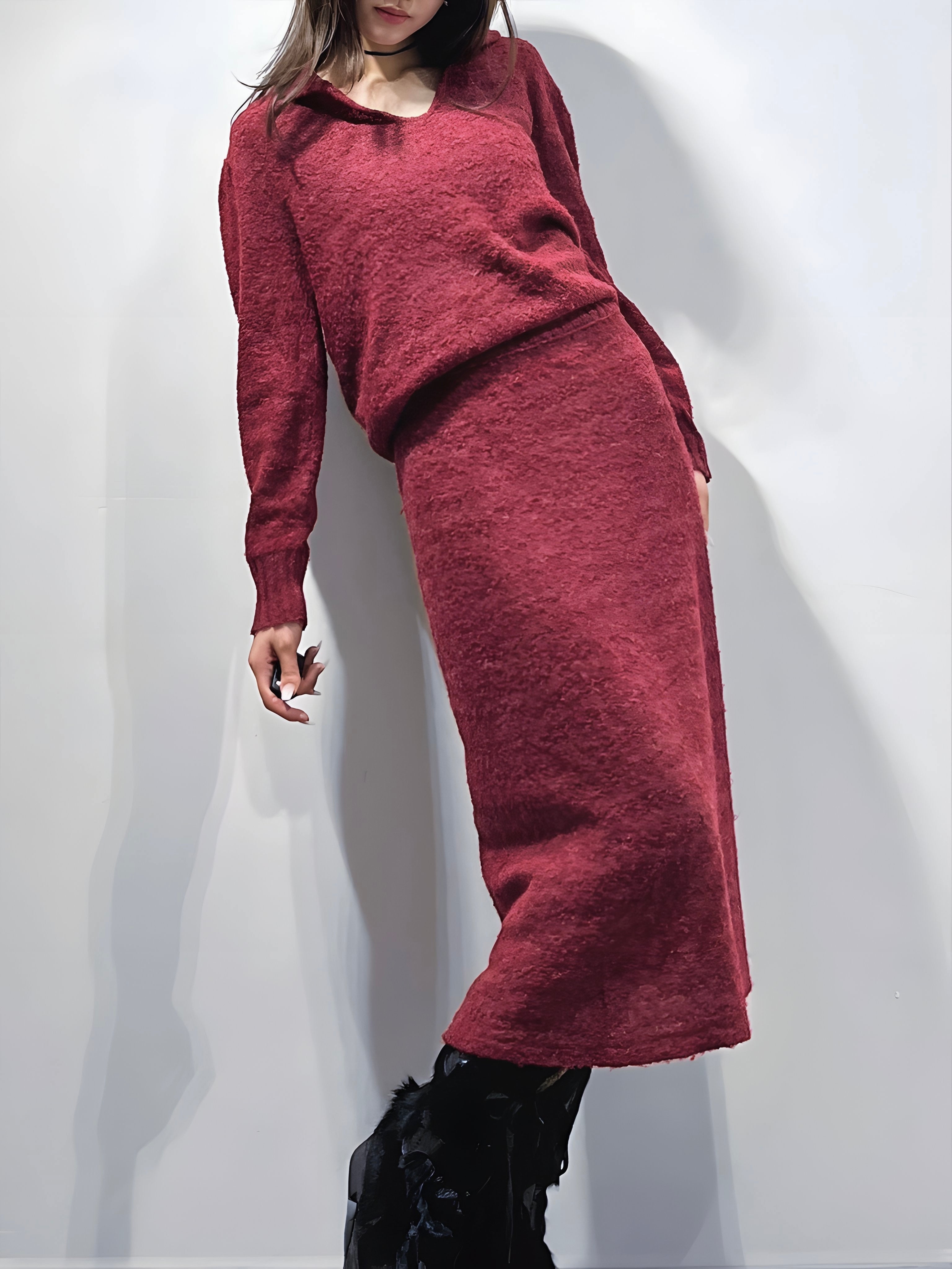 Vintage Bordeaux Wool Blend Knit Set with Open Collar (70s) – Textured Bouclé Finish