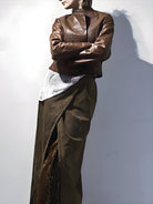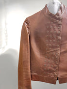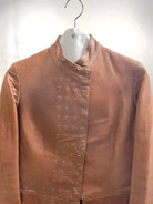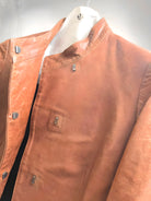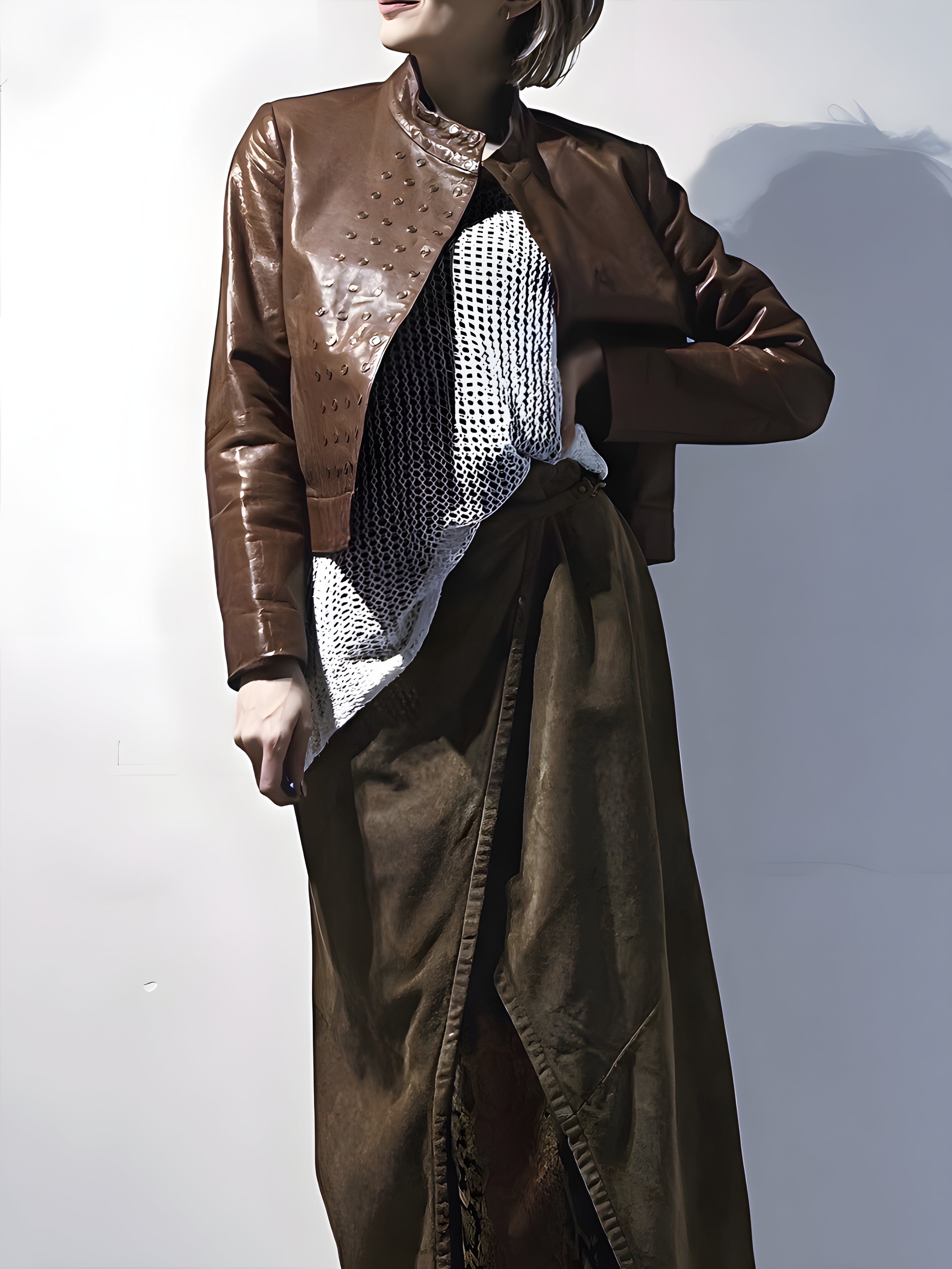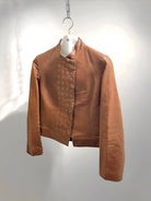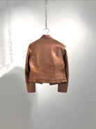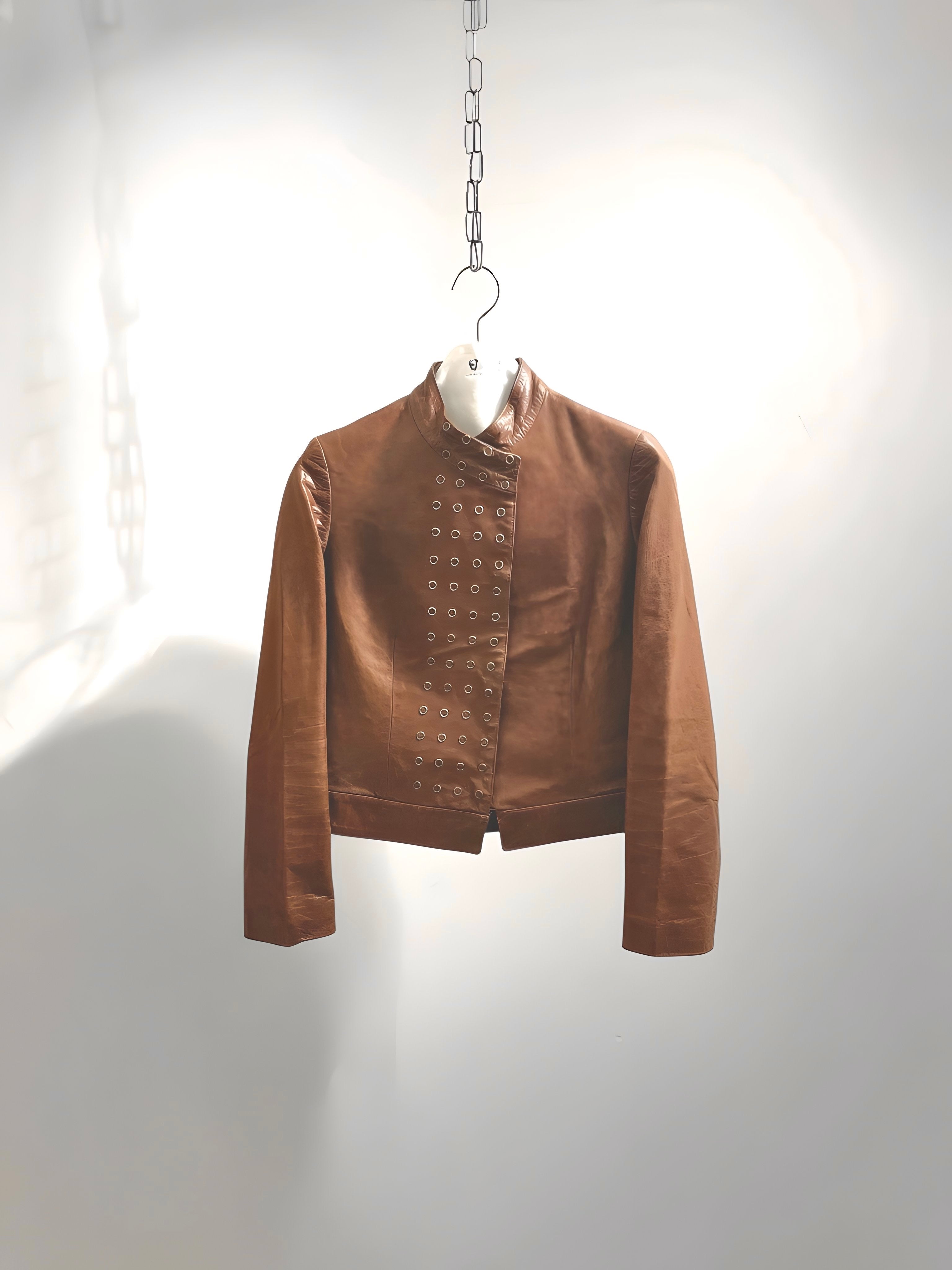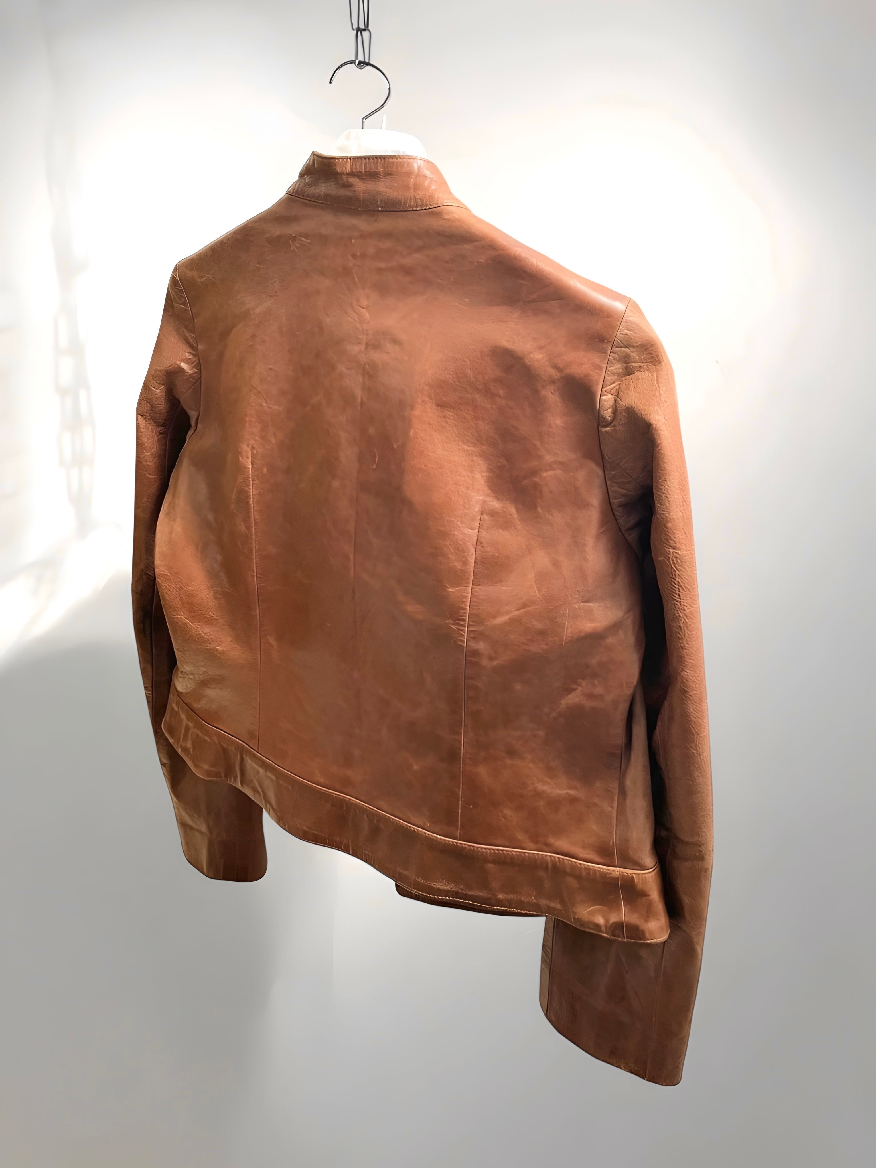 Cognac Brown Leather Jacket with Grommeted Asymmetric Placket and Architectural Collar (Late 90s–Early 2000s) – Refined Structural Detail