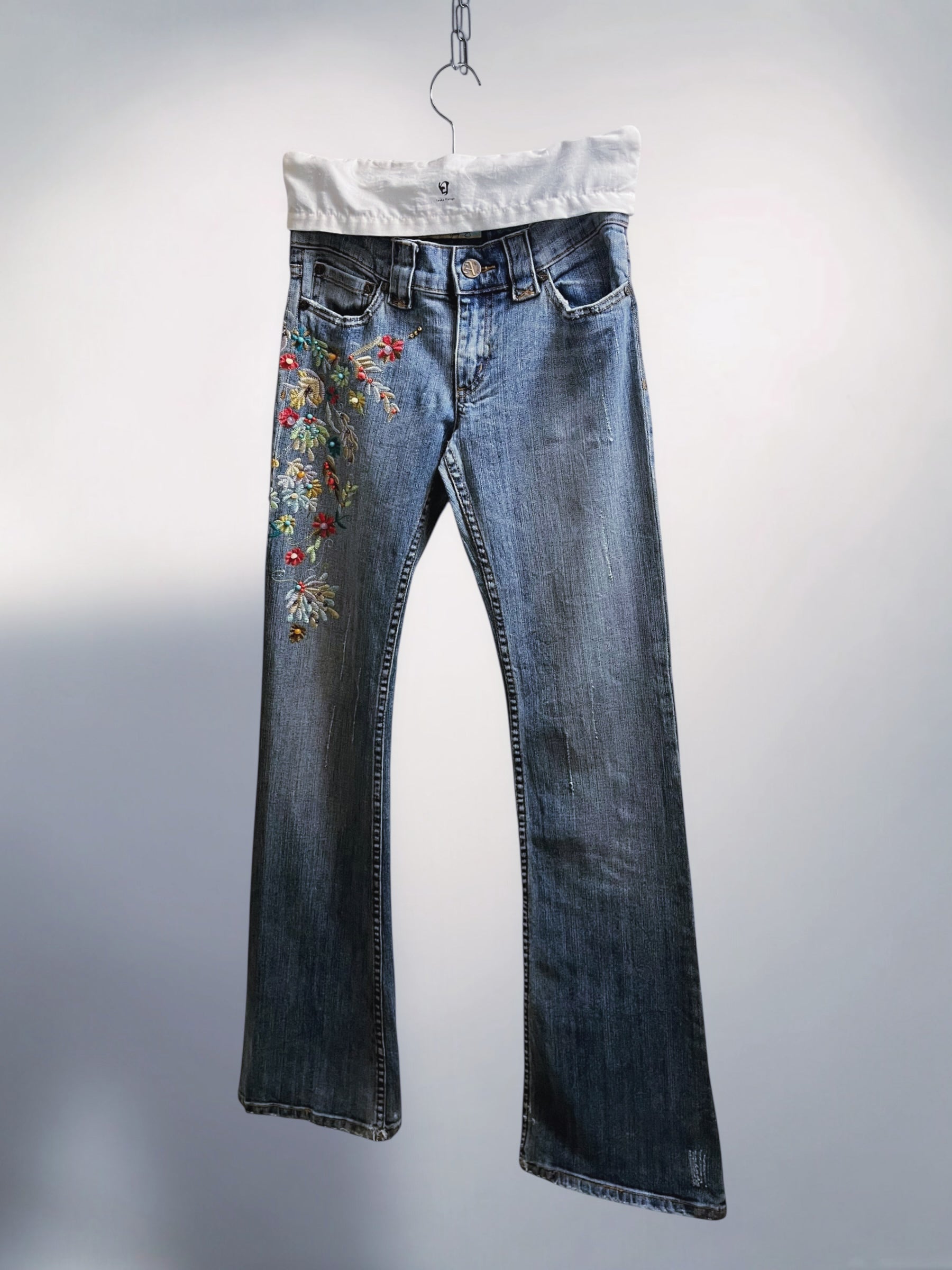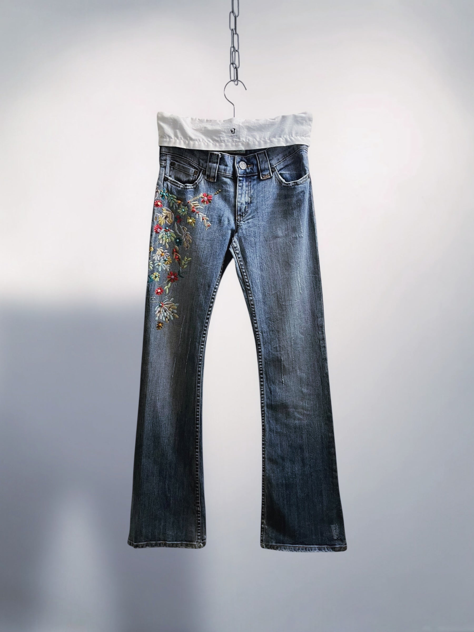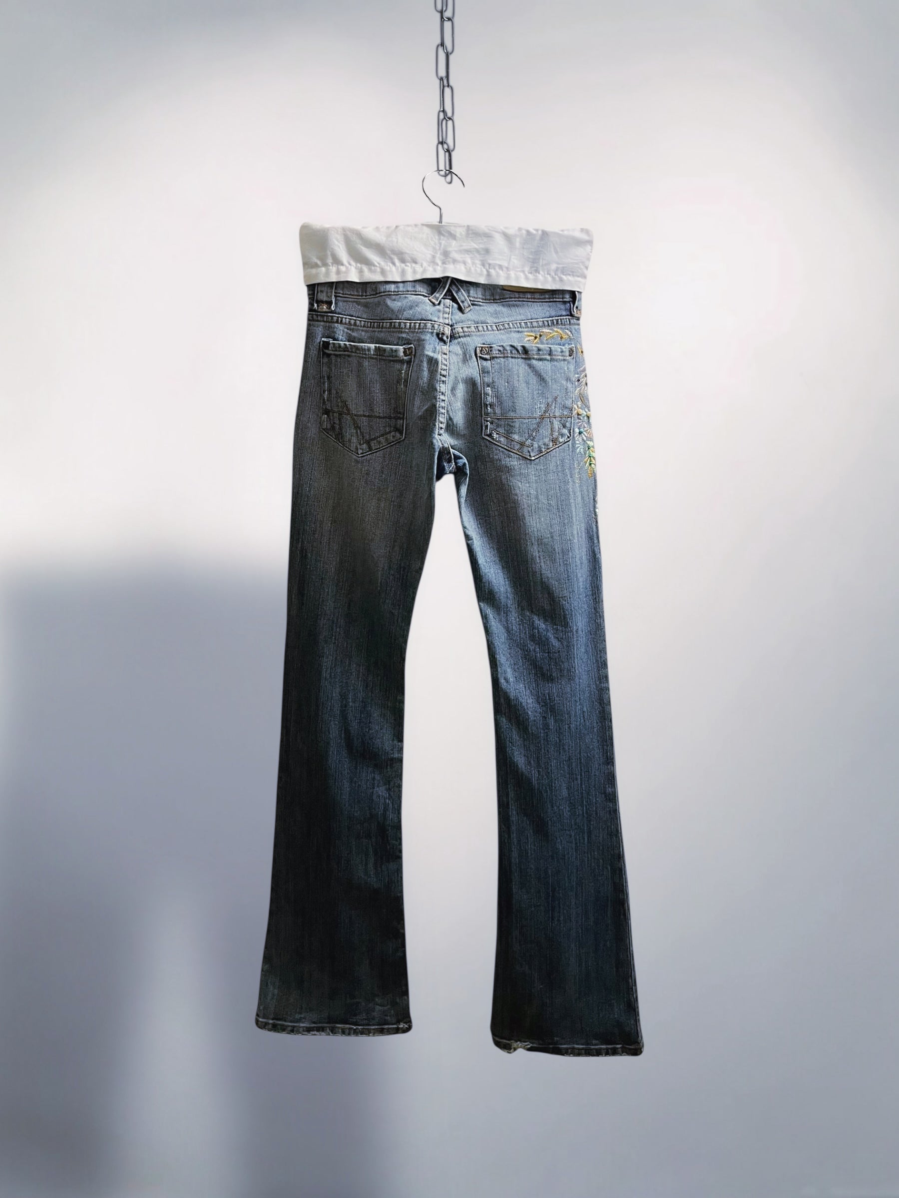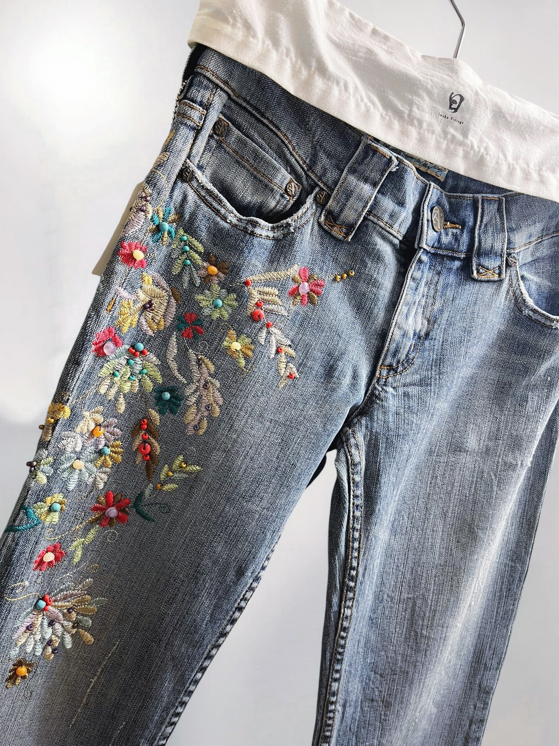 Blue Low-Rise Bootcut Jeans with Floral Embroidery and Beaded Detailing U S A (Early 2000s) – Statement Botanical Embellishment