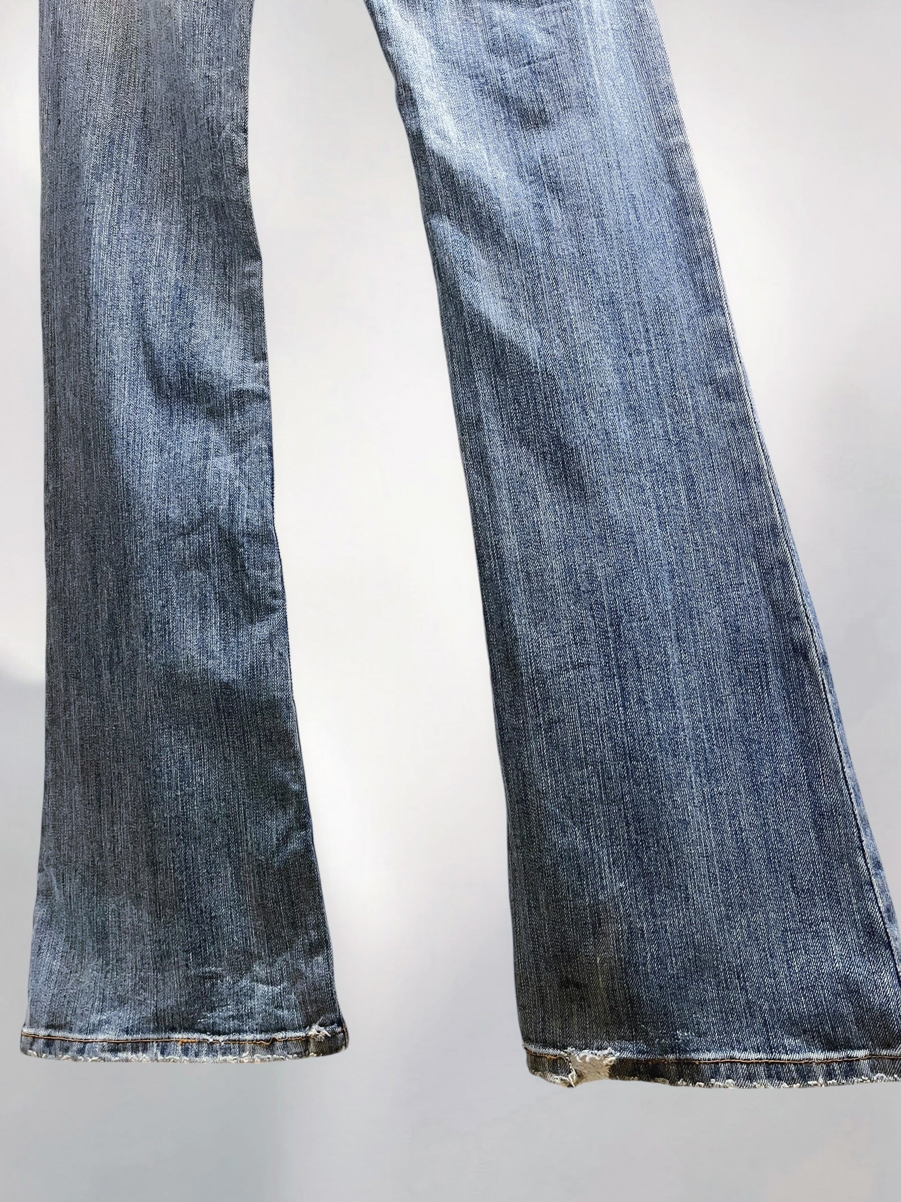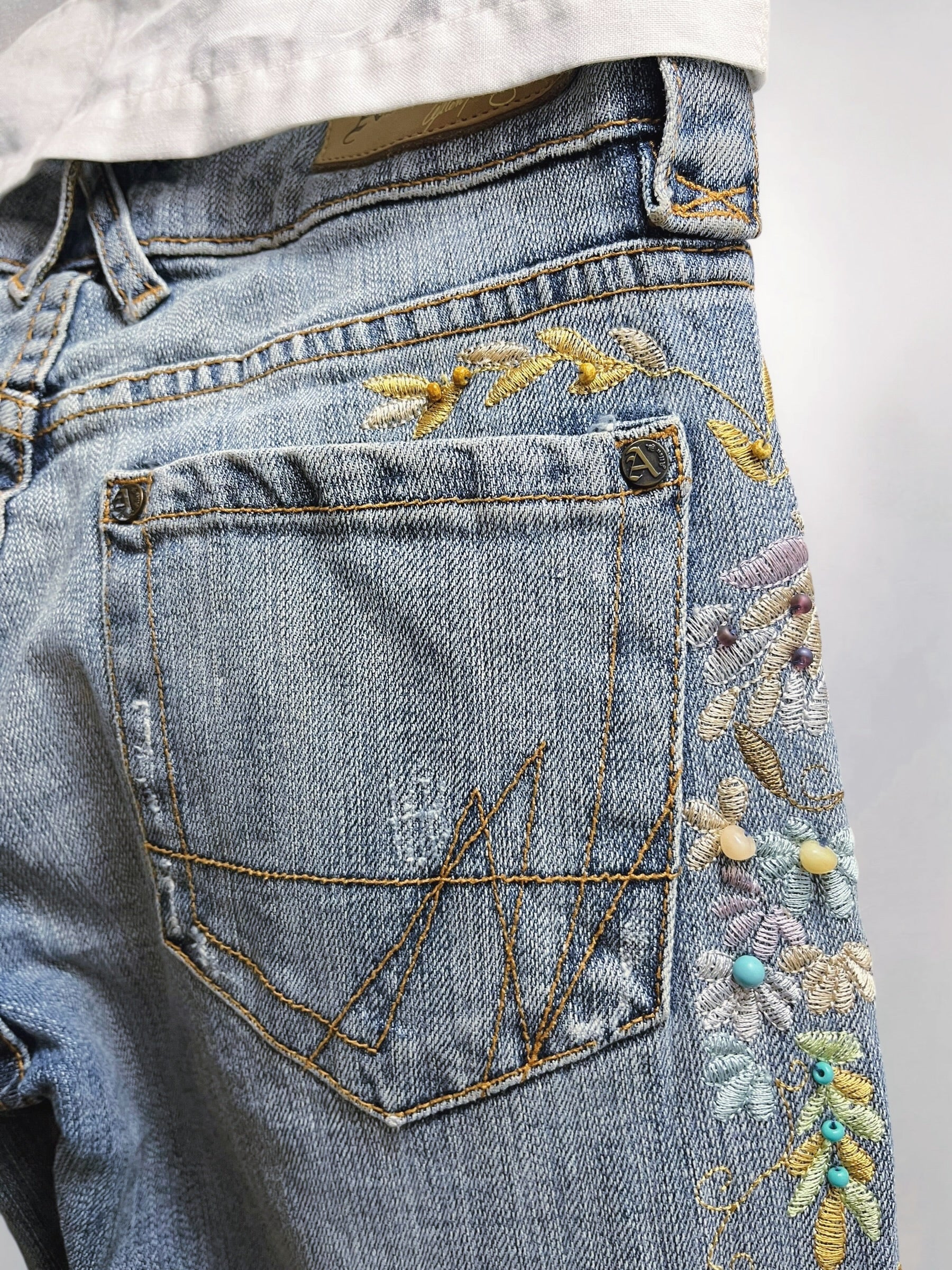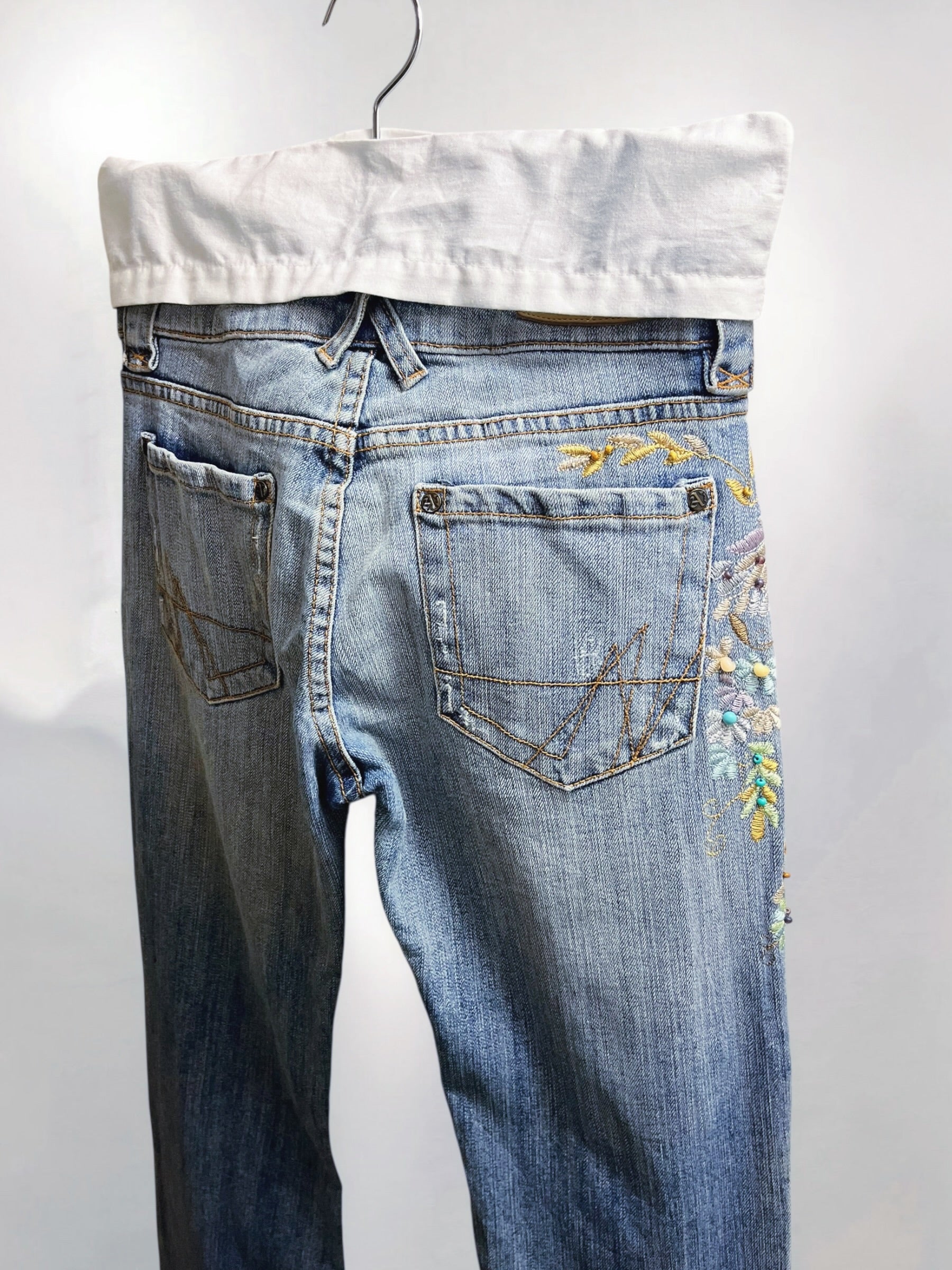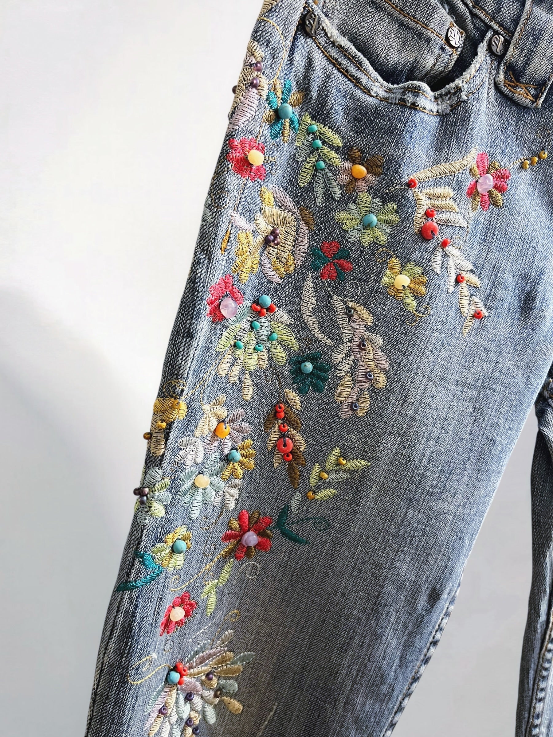 Blue Low-Rise Bootcut Jeans with Floral Embroidery and Beaded Detailing U S A (Early 2000s) – Statement Botanical Embellishment